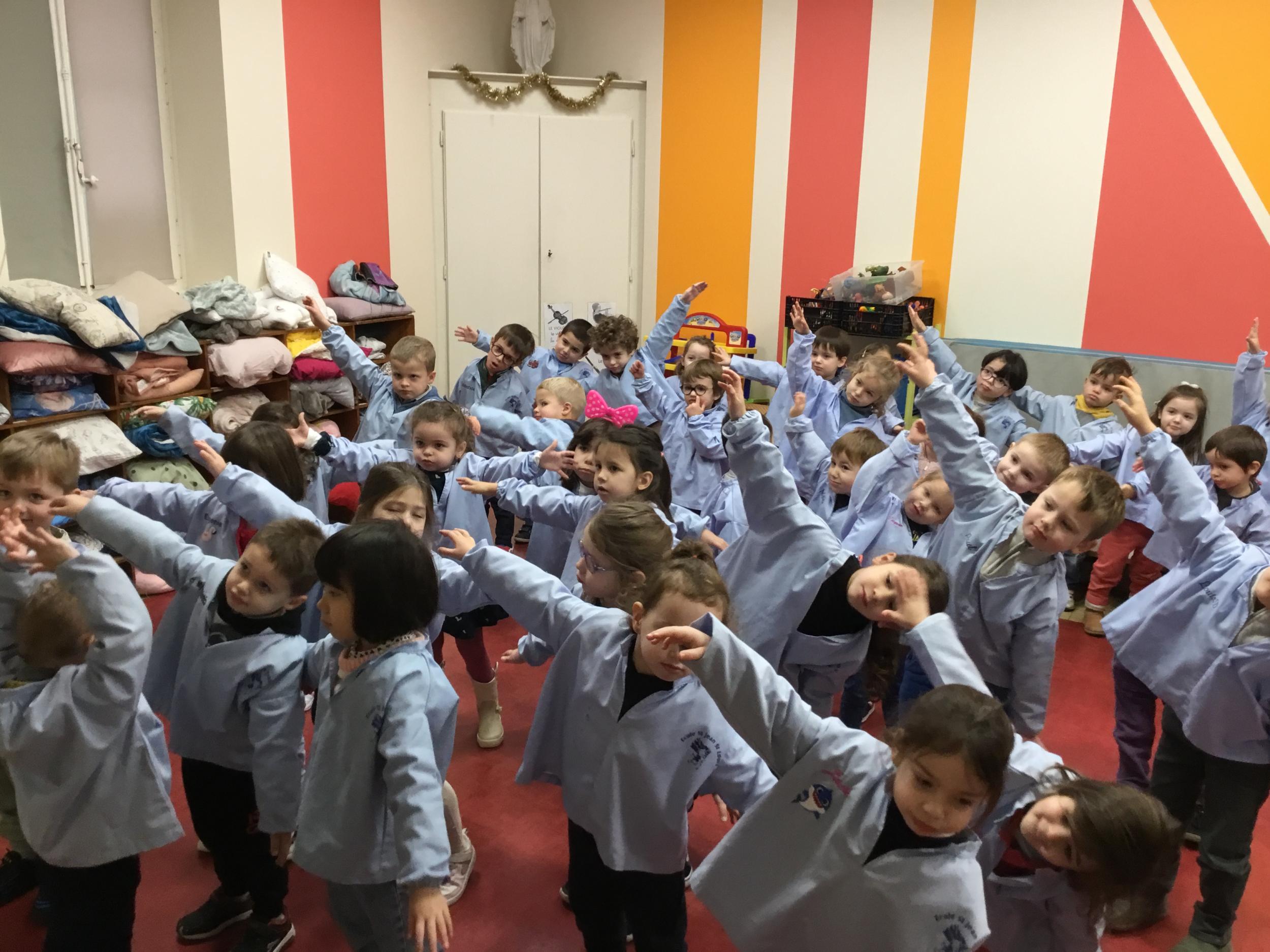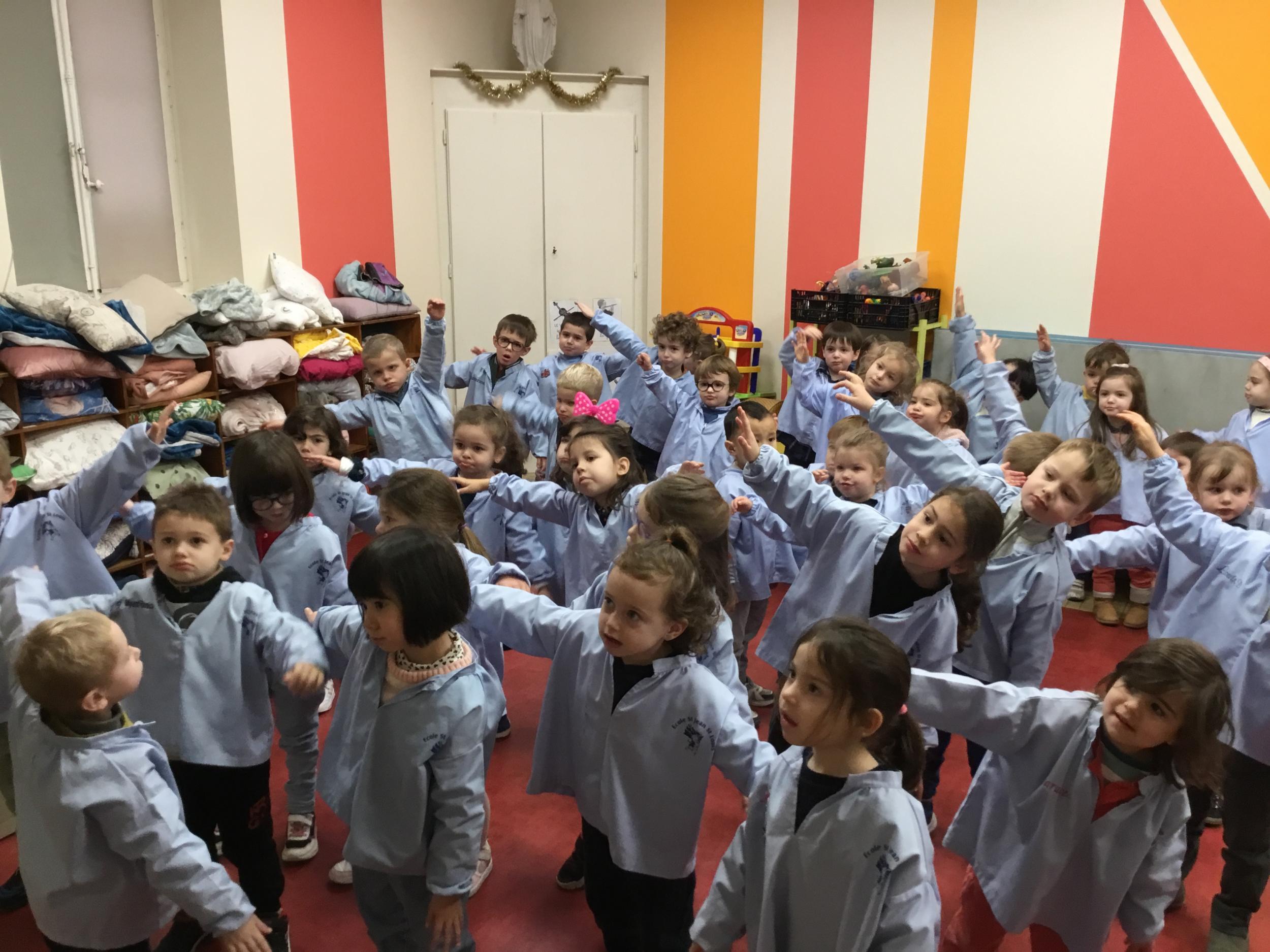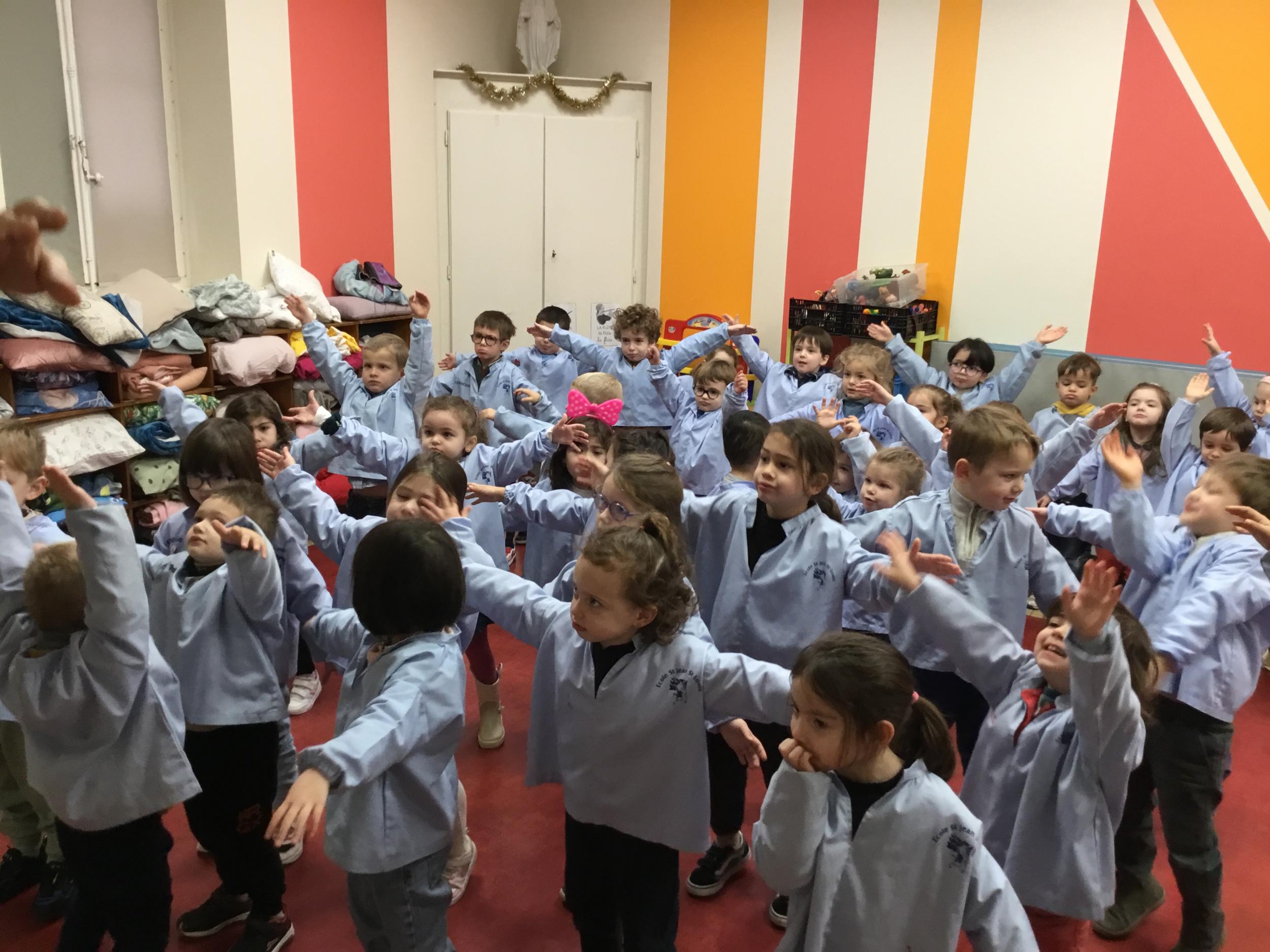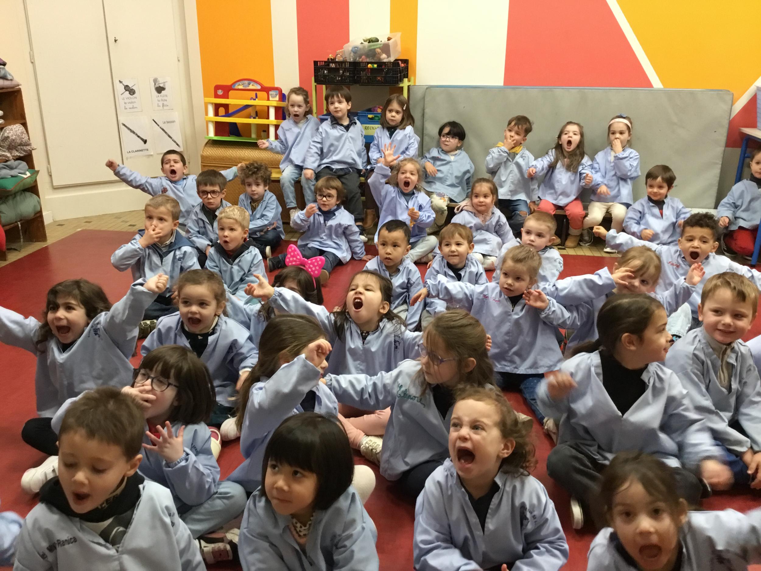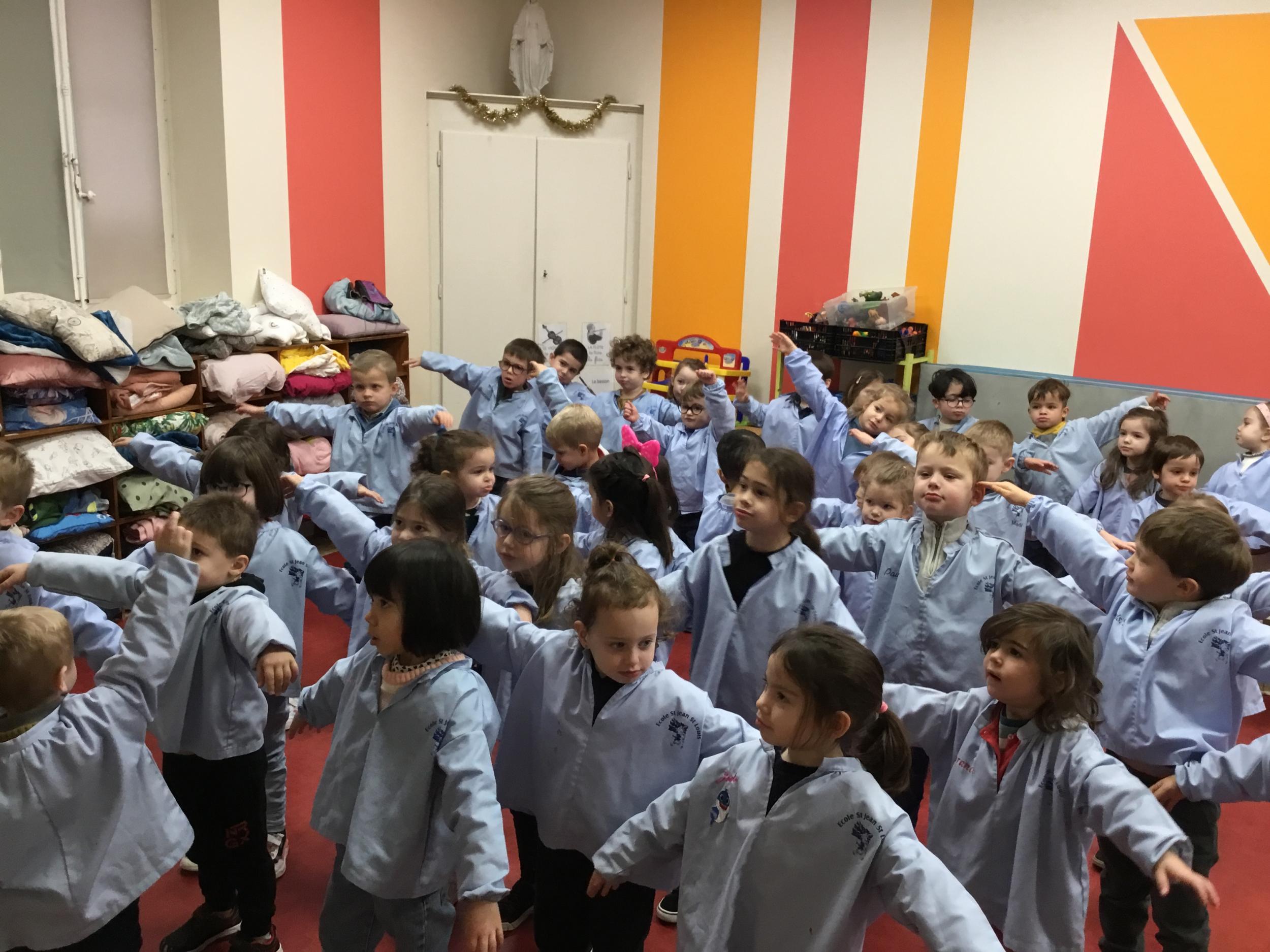 Tous les vendredis les PS et les MS se regroupent pour la chorale. D’abord nous chauffons notre voix , puis nous passons à des exercices de rythmes et enfin nous chantons en français et en anglais accompagnés de maître Chappuis à la guitare.