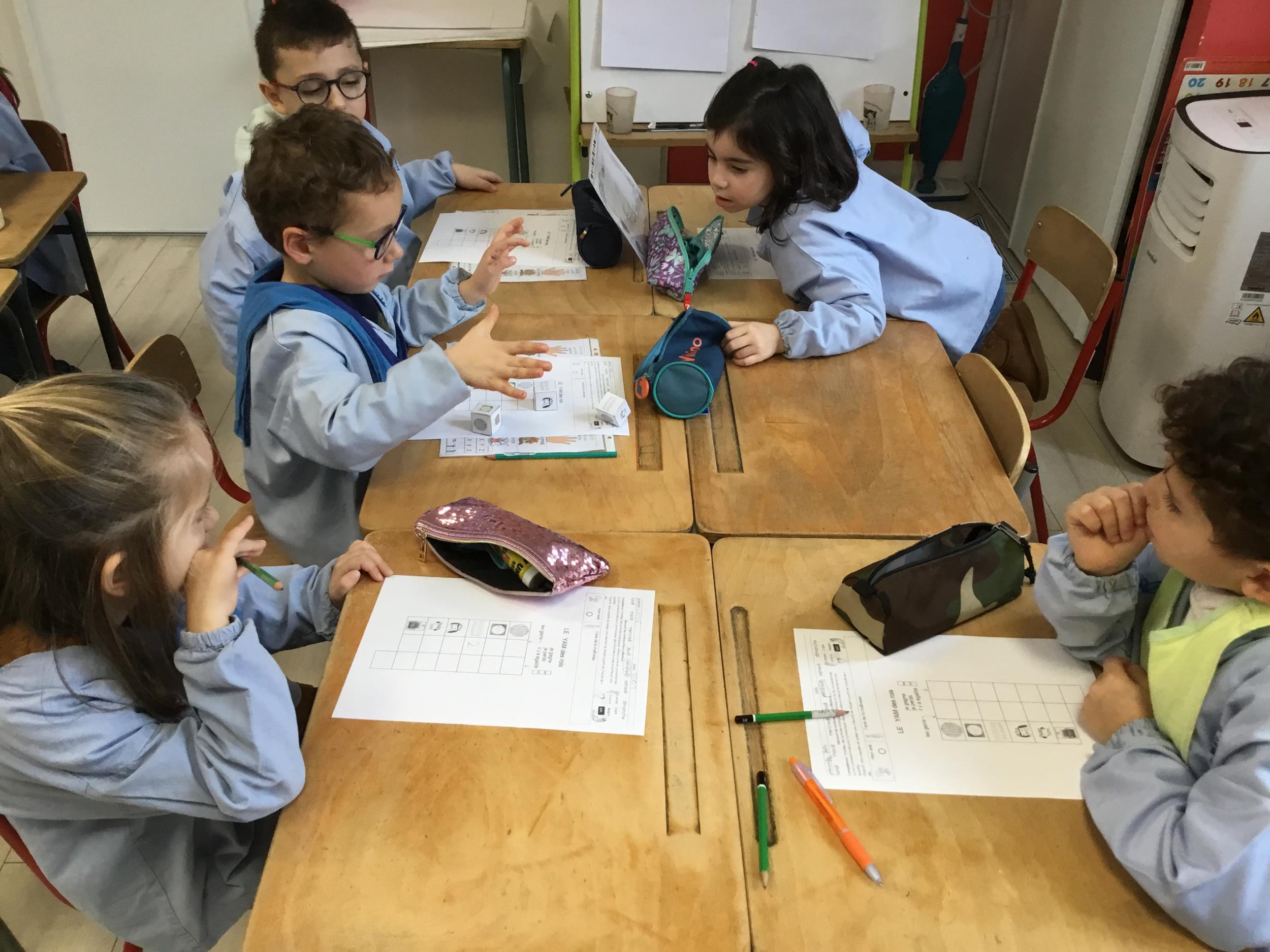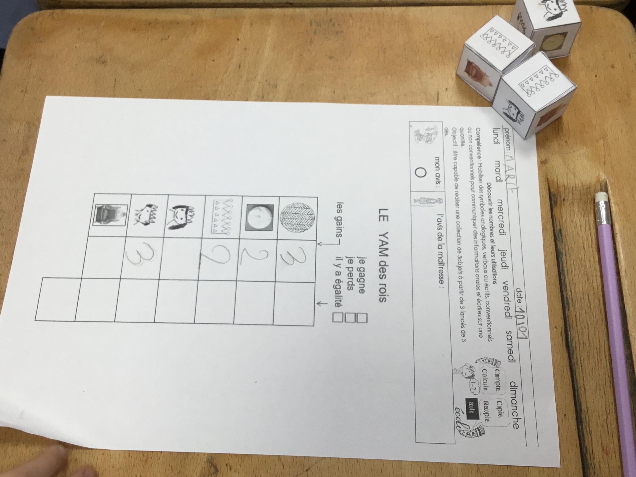 Le troisième jeu est "le Yam de la galette". Les élèves disposent d'une fiche de route à remplir, de 3 dés avec 6 dessins différents, mais semblables entre les dés. Avec 3 lancés par tours, ils doivent obtenir le plus de couronnes, de galettes, de rois, de reines..Une fois une case remplie, ils ne peuvent pas en modifier le résultat.