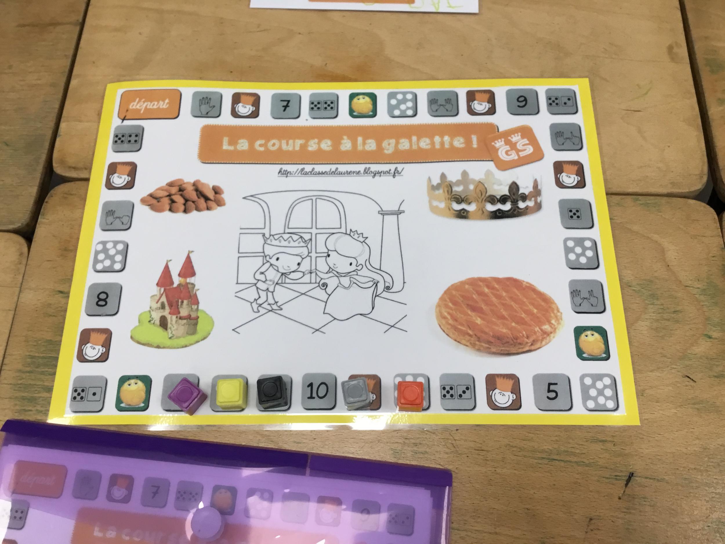 Nous avons eu un jeu de plateau : "la course à la galette". Chacun se déplace avec un dé classique. Chaque joueur dispose d'une carte chiffrée. A tour de rôle, les élèves doivent cocher sur leur carte le nombre identique à la quantité représentée sur le grand plateau, chiffres compris entre 5 et 10 et représentés sous diverses formes.