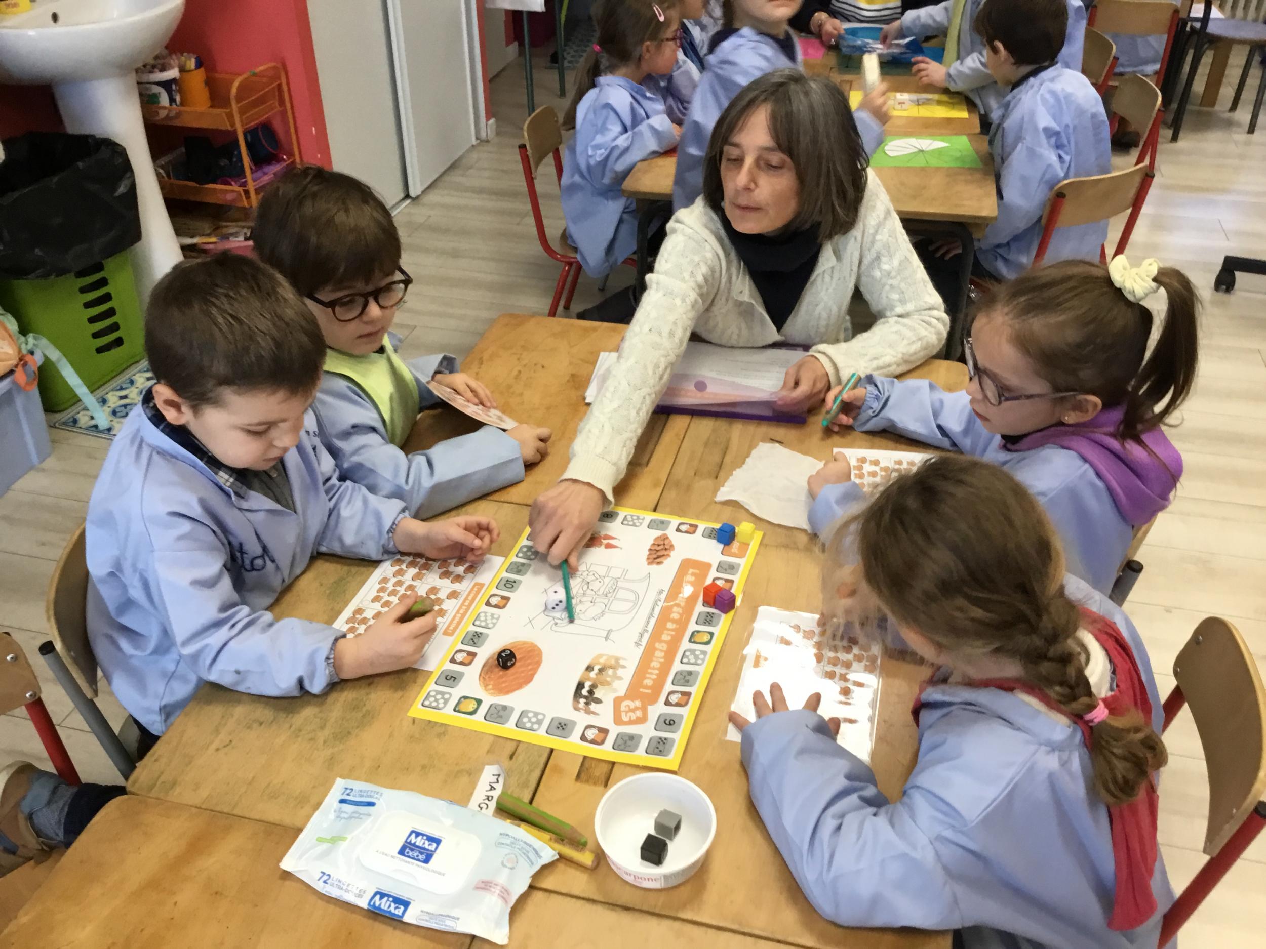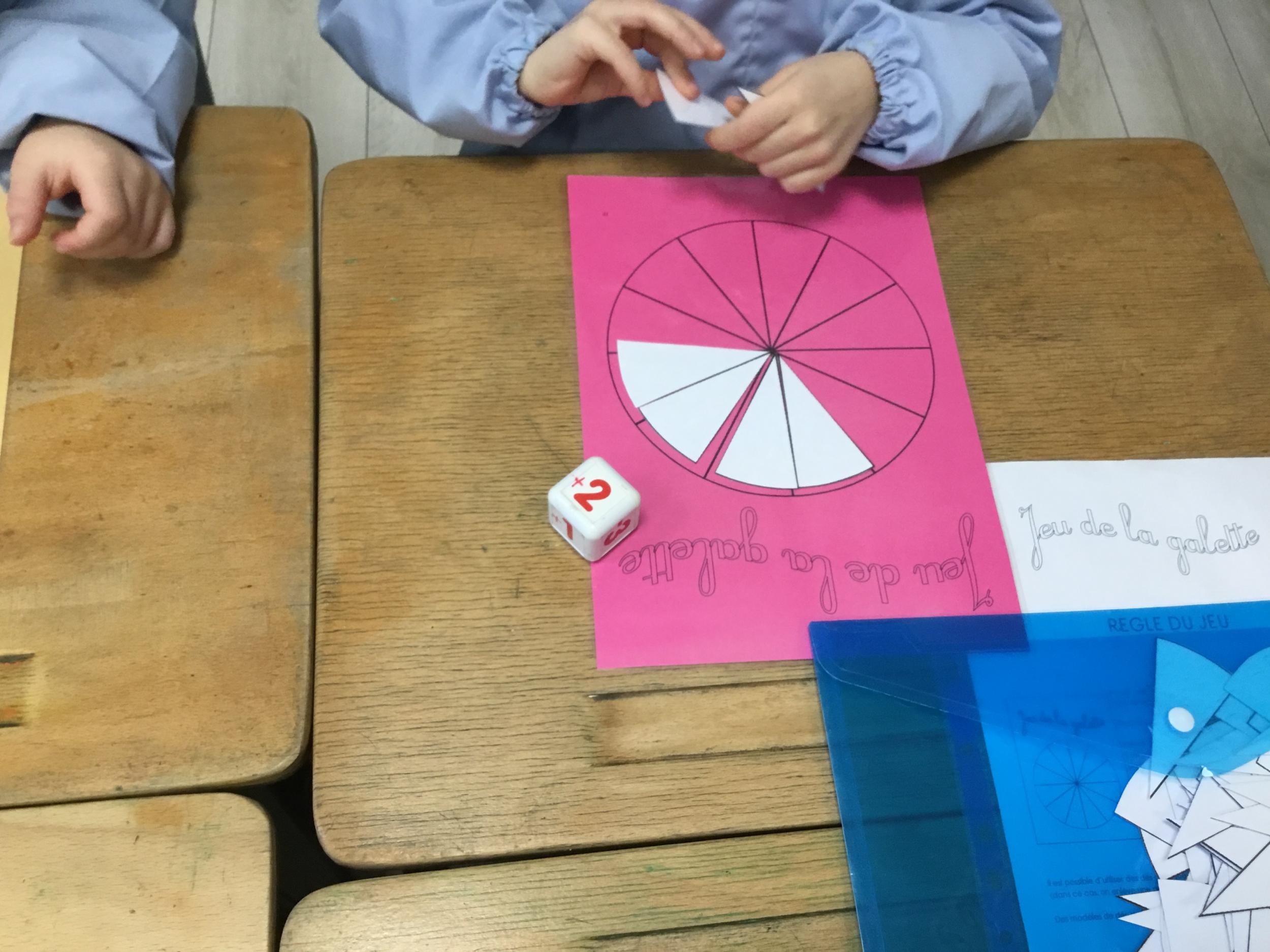 Le "jeu de la galette" se joue avec un dé de 1 à 3, mais en introduisant l'addition et la soustraction. Chaque élève dispose d'une galette où les parts sont représentées. Selon le lancé du dé, -1, -2, -3 ou +1,+2,+3, ils rajoutent ou enlèvent 1 à 3 parts sur leur galette, jusqu'à ce que l'un deux arrive à la remplir. Ils comptent leurs galettes pour savoir où ils en sont entre eux, qui en a le plus, le moins...