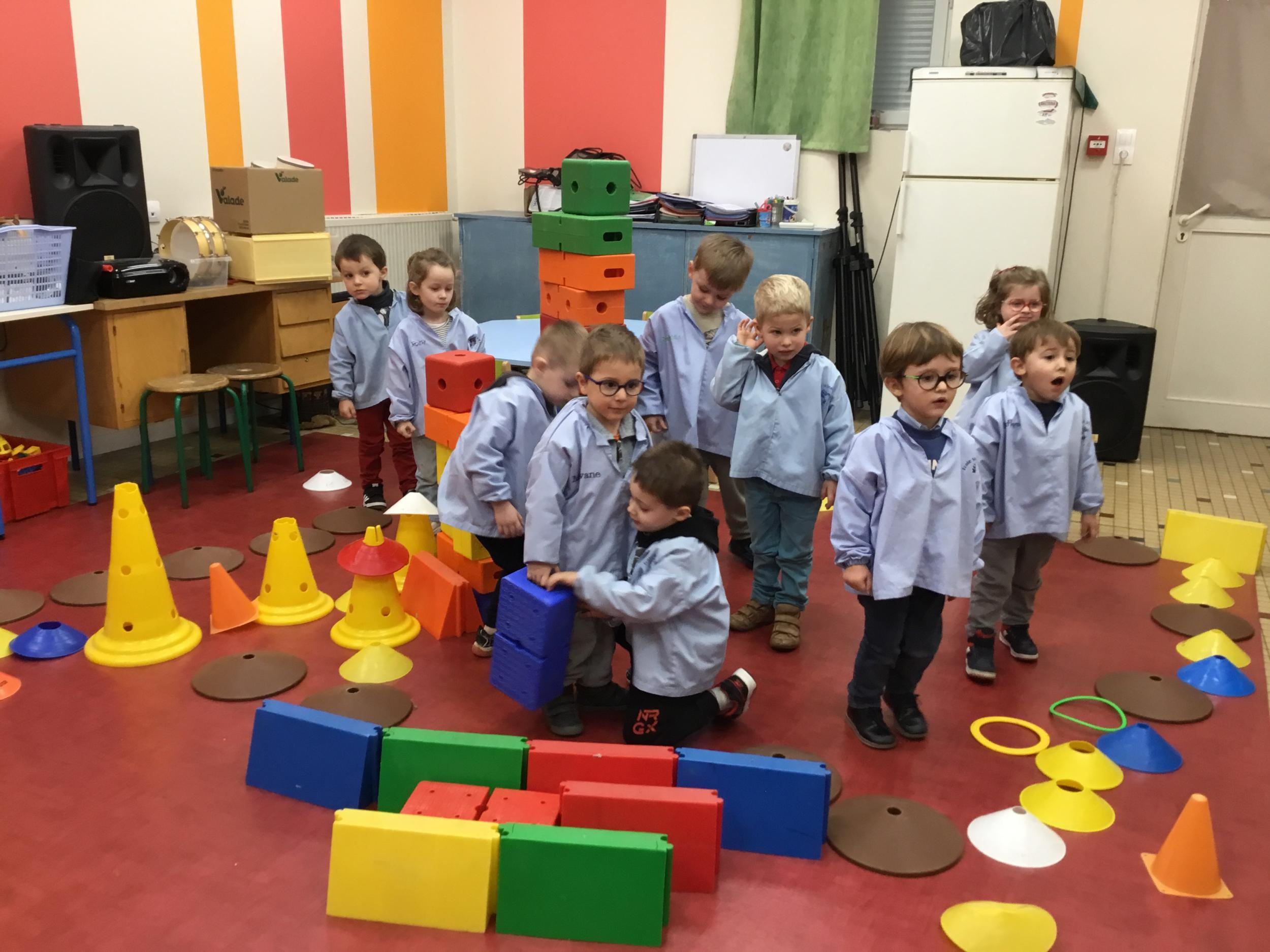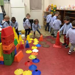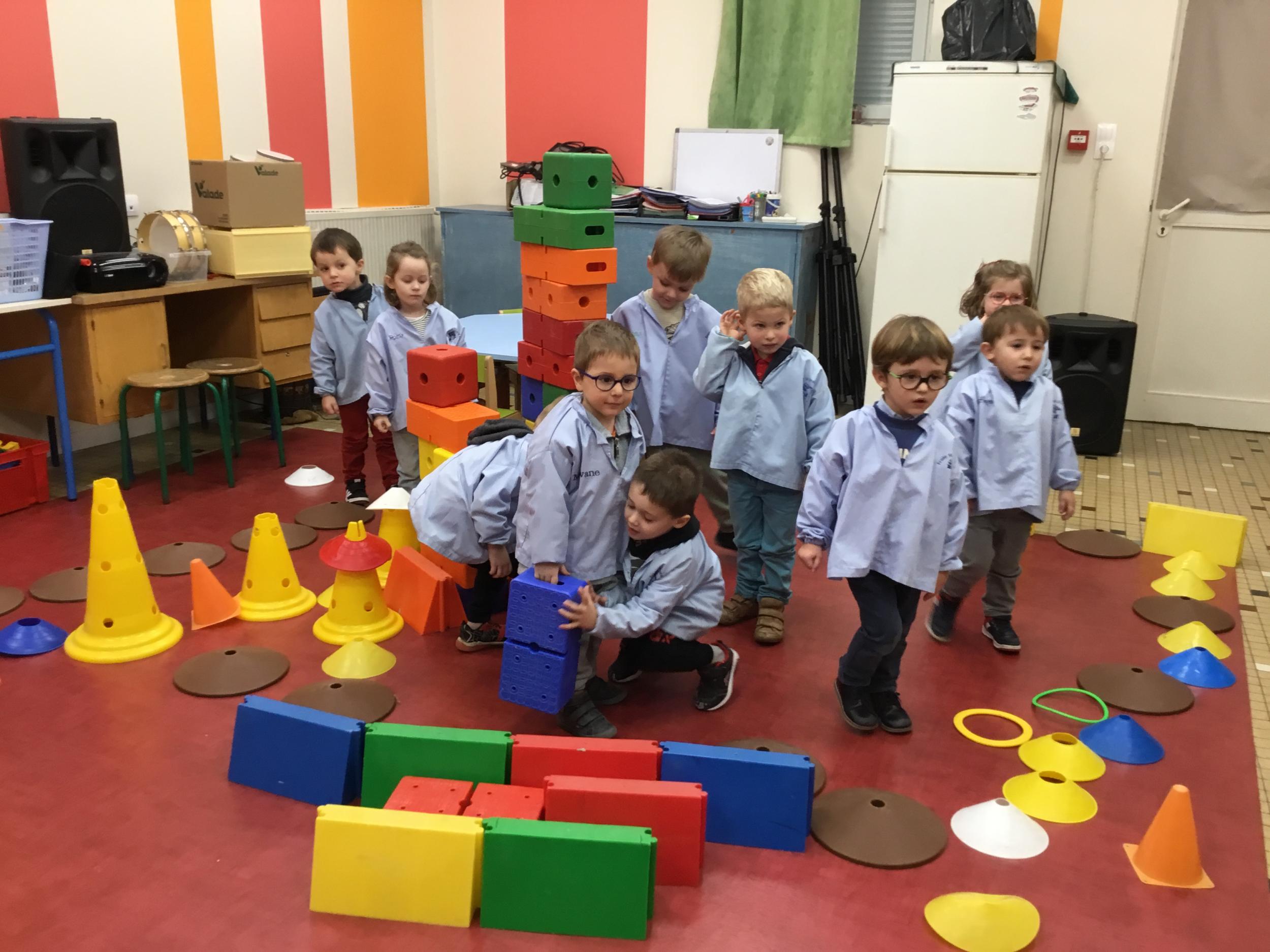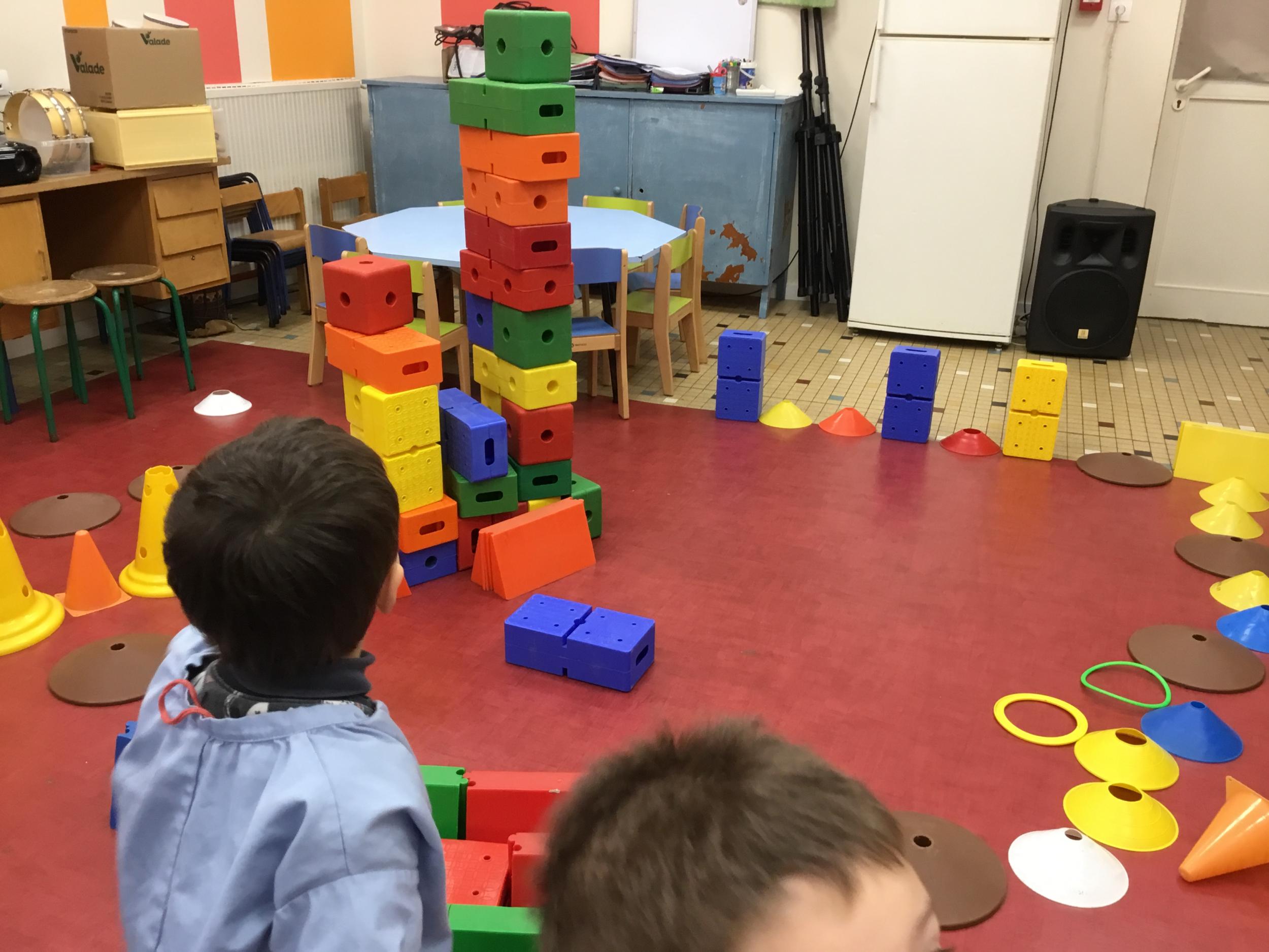 Une nouvelle fois, la maîtresse a proposé de construire collectivement une cabane en utilisant librement le matériel mis à disposition dans la salle de motricité. L’occasion de transporter, déplacer , créer….la maîtresse avait rajouté un critère :