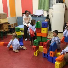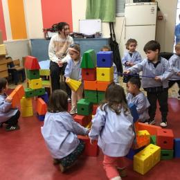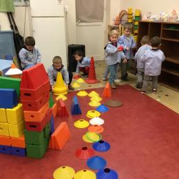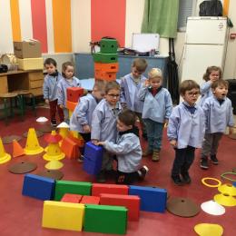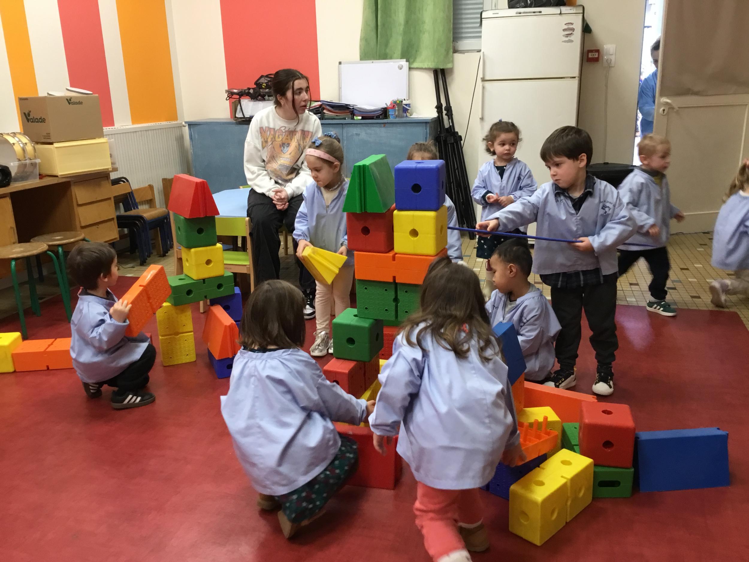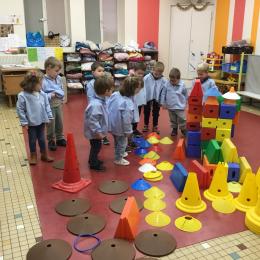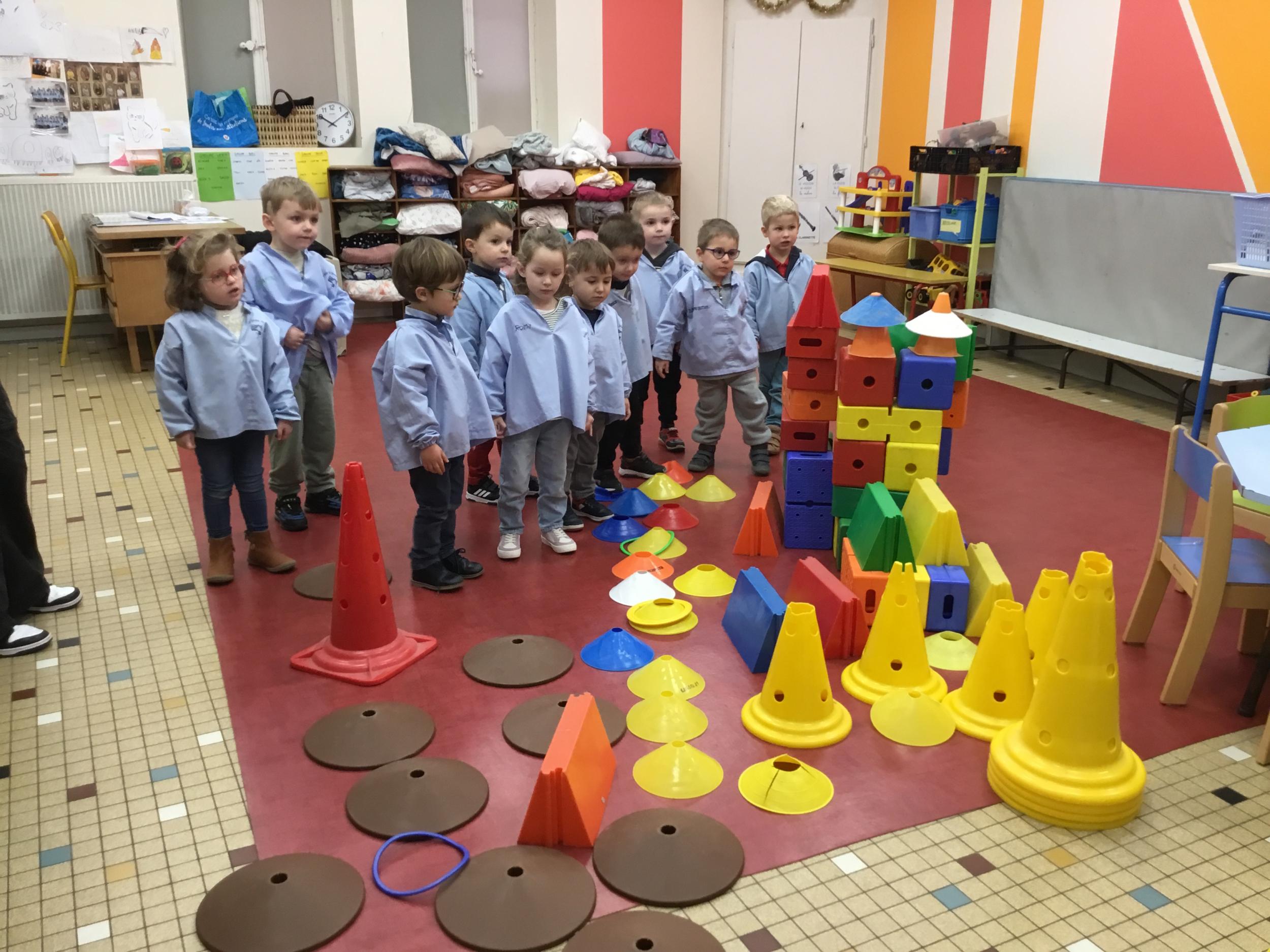 Une nouvelle fois, la maîtresse a proposé de construire collectivement une cabane en utilisant librement le matériel mis à disposition dans la salle de motricité. L’occasion de transporter, déplacer , créer….la maîtresse avait rajouté un critère :