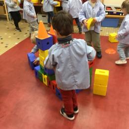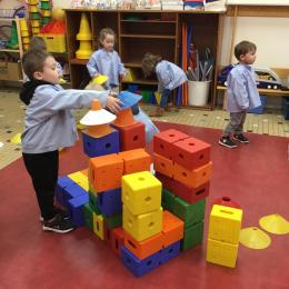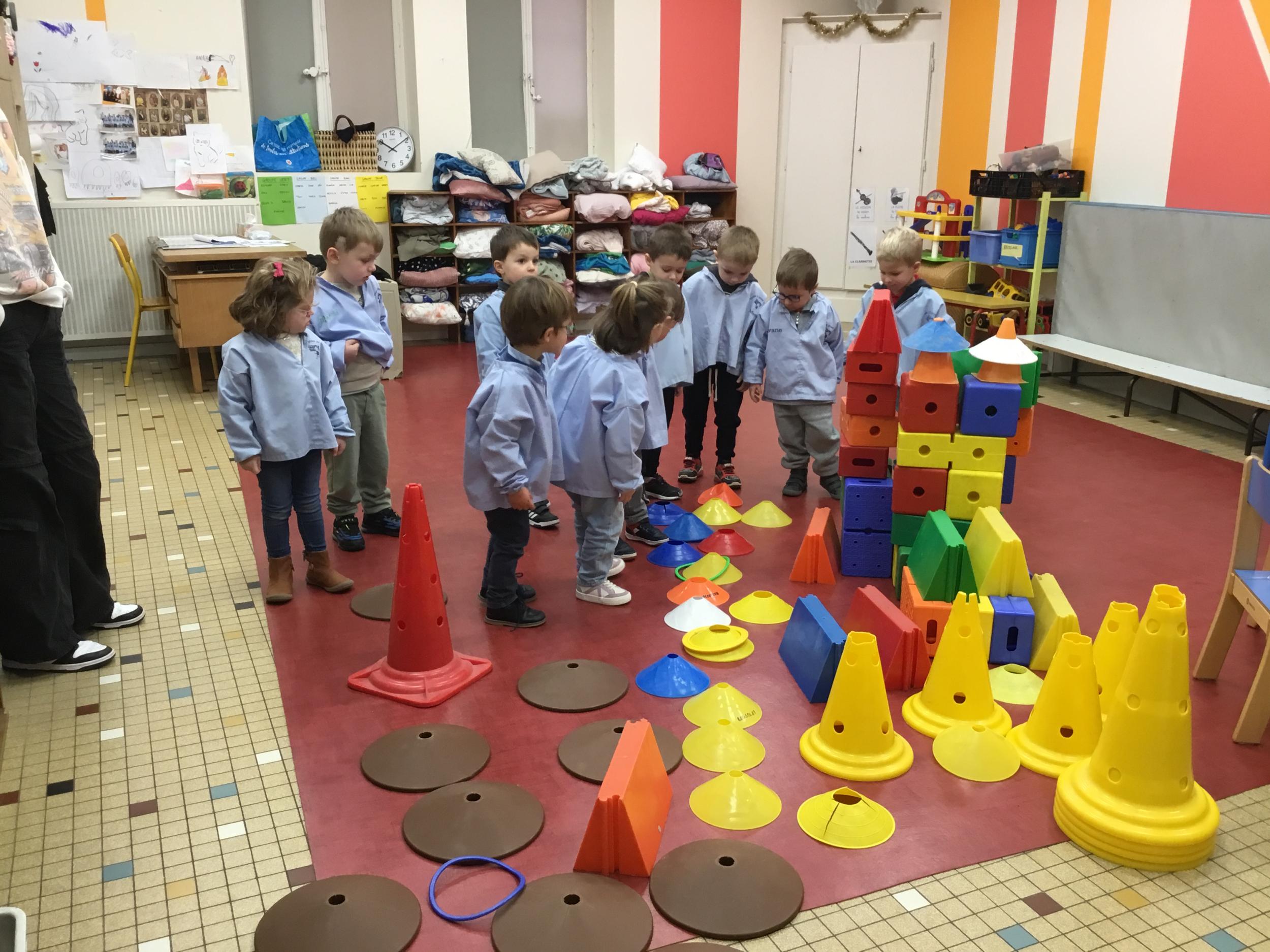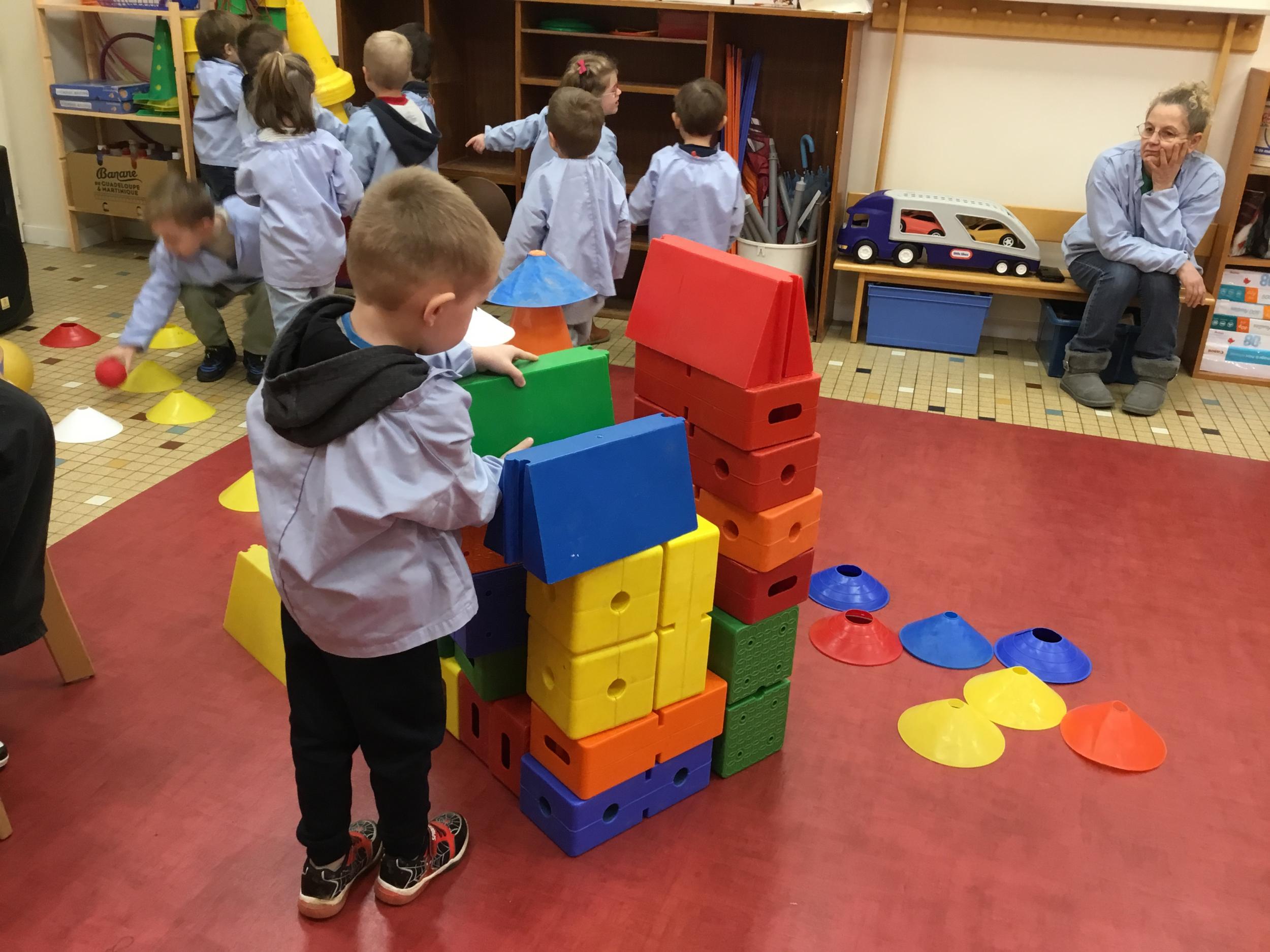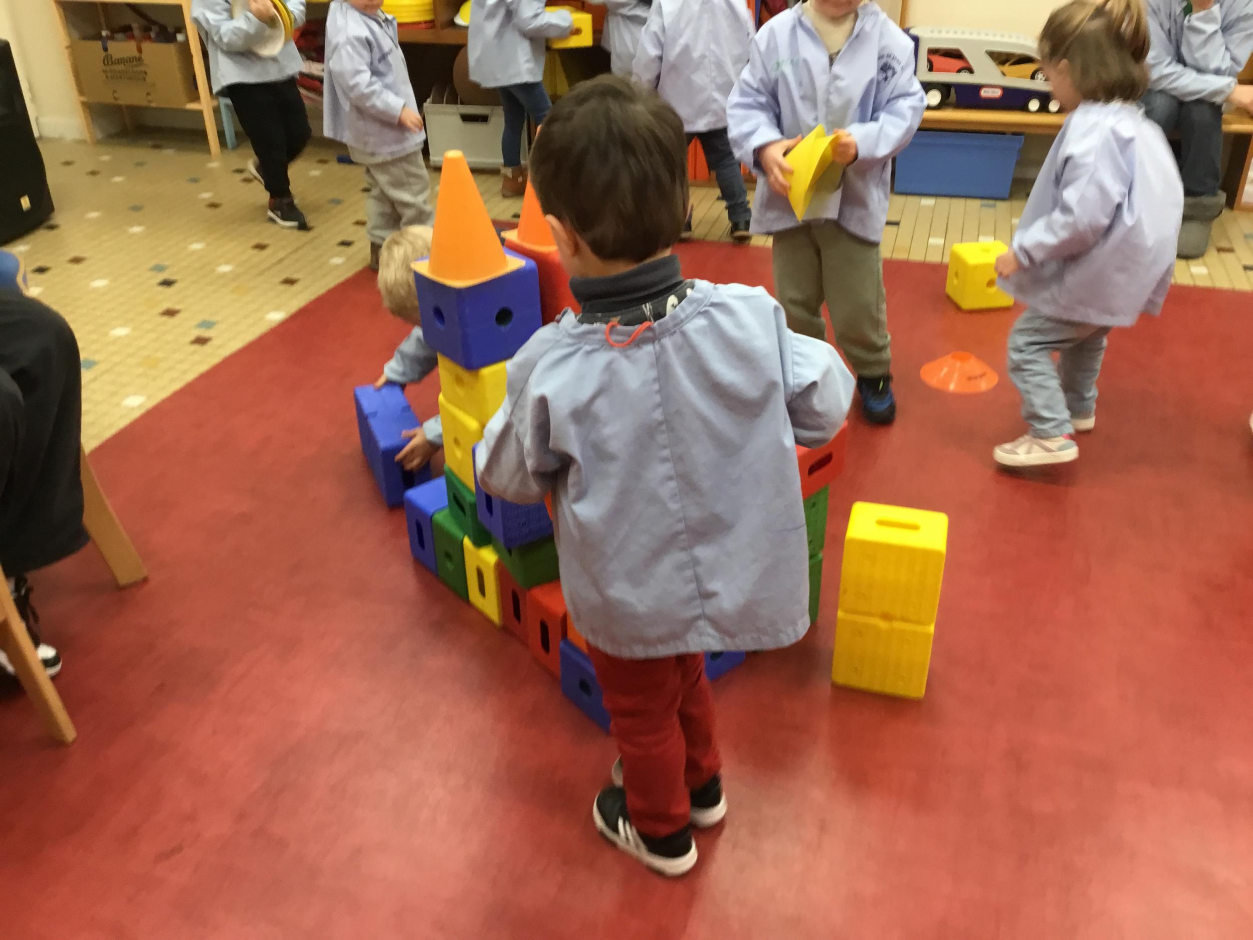 Ce matin, j’ai proposé à mes élèves de construire ensemble une cabane. Une situation pour explorer, découvrir le matériel . Ils ont pu saisir, porter, transporter, attraper, accumuler, empiler, soulever… mais aussi se mettre d’accord, prendre des initiatives et découvrir leur pouvoir d’agir.
