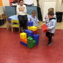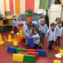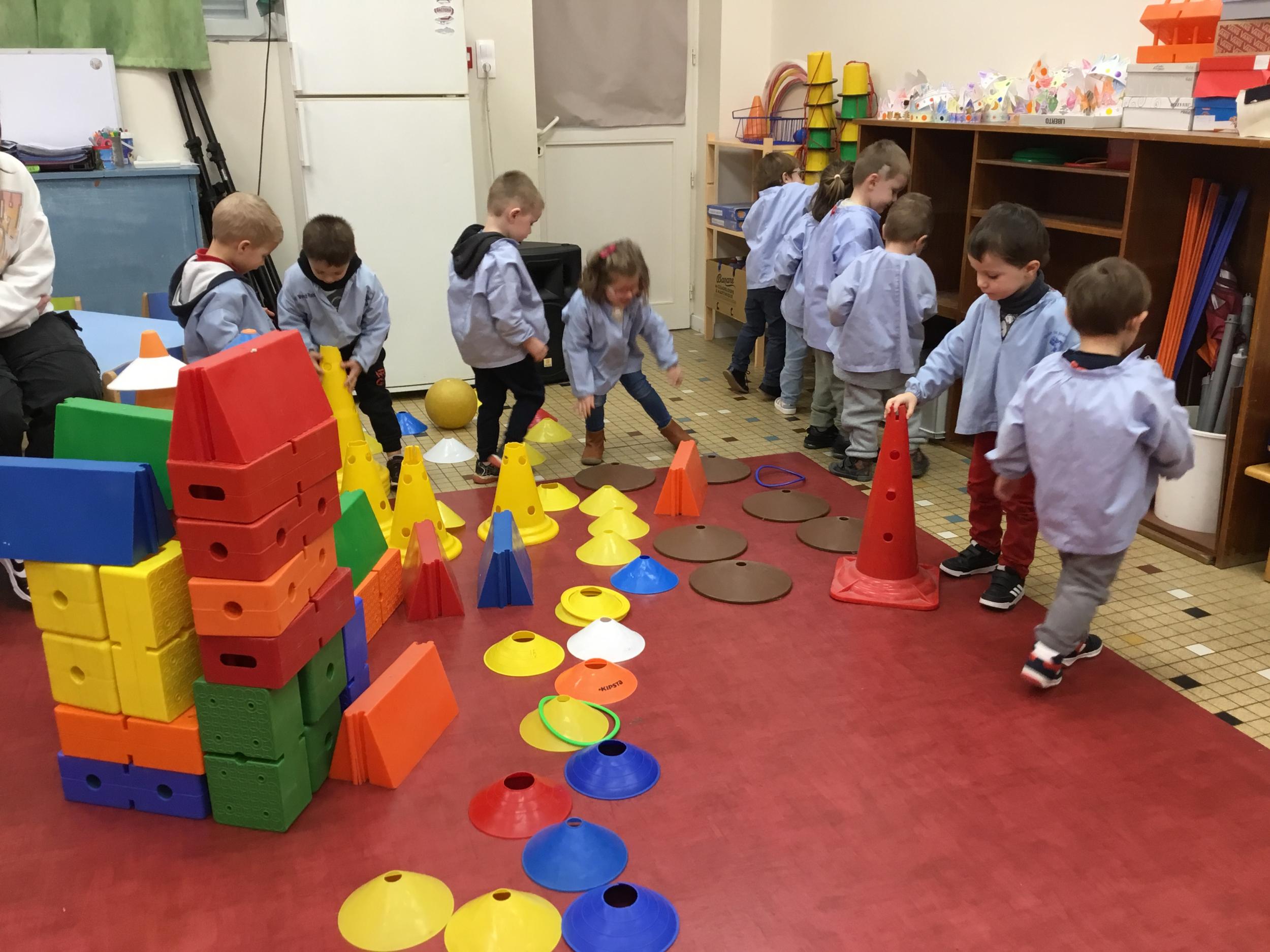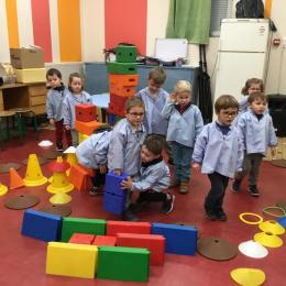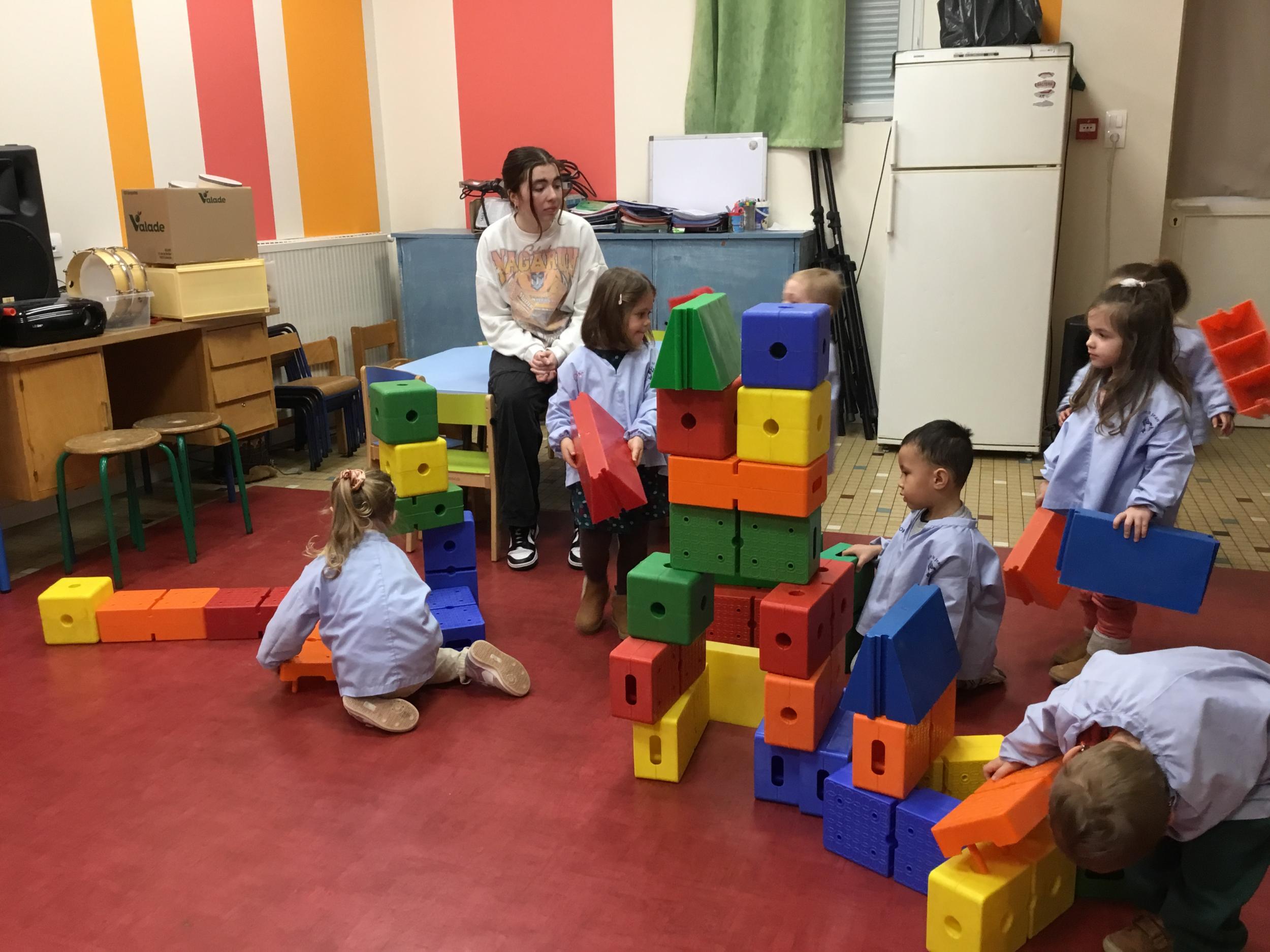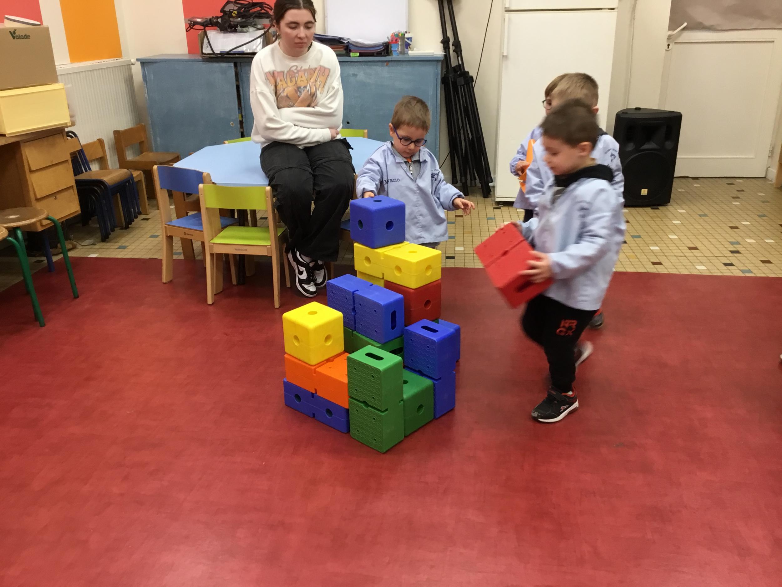 Ce matin, j’ai proposé à mes élèves de construire ensemble une cabane. Une situation pour explorer, découvrir le matériel . Ils ont pu saisir, porter, transporter, attraper, accumuler, empiler, soulever… mais aussi se mettre d’accord, prendre des initiatives et découvrir leur pouvoir d’agir.