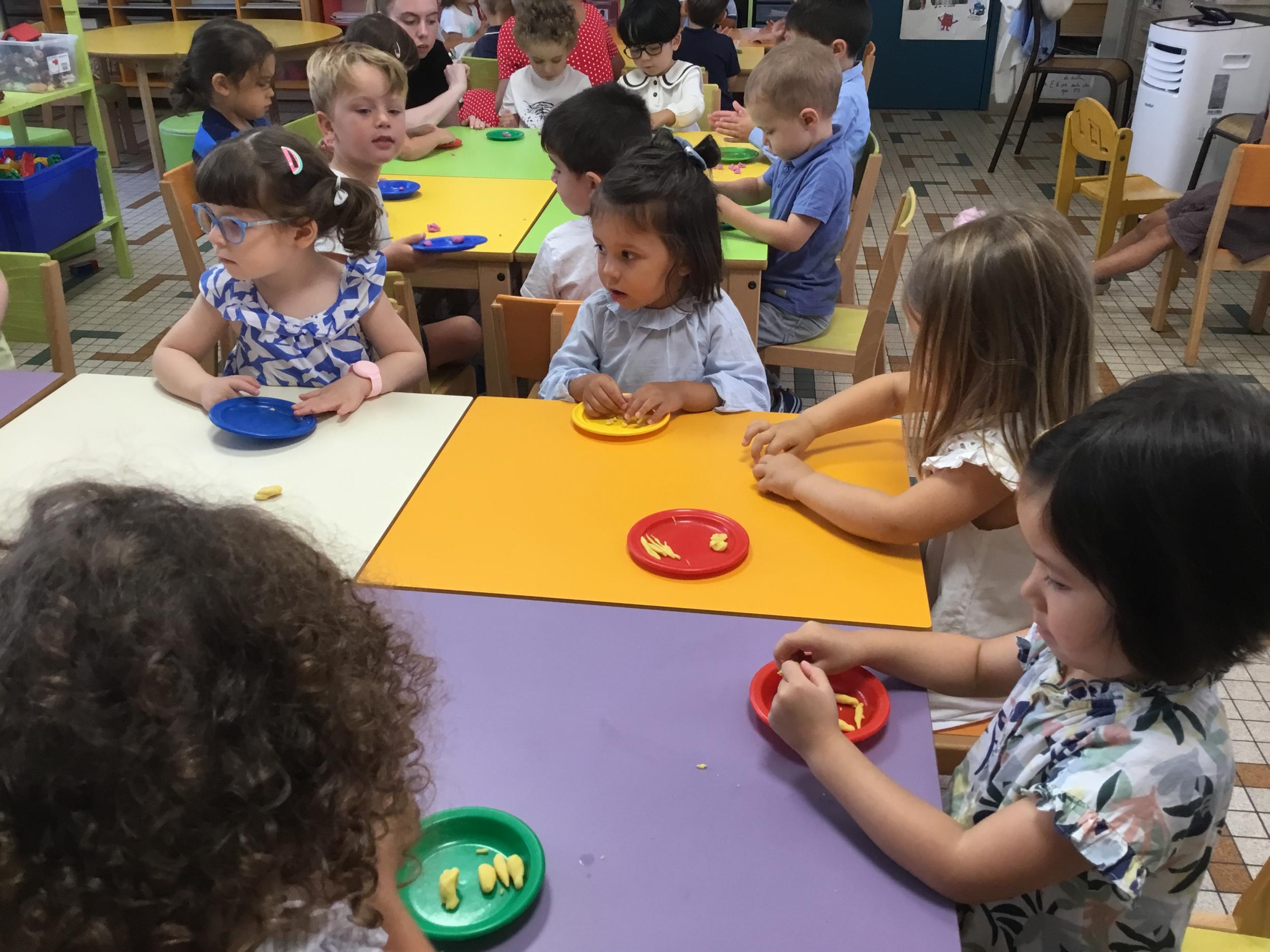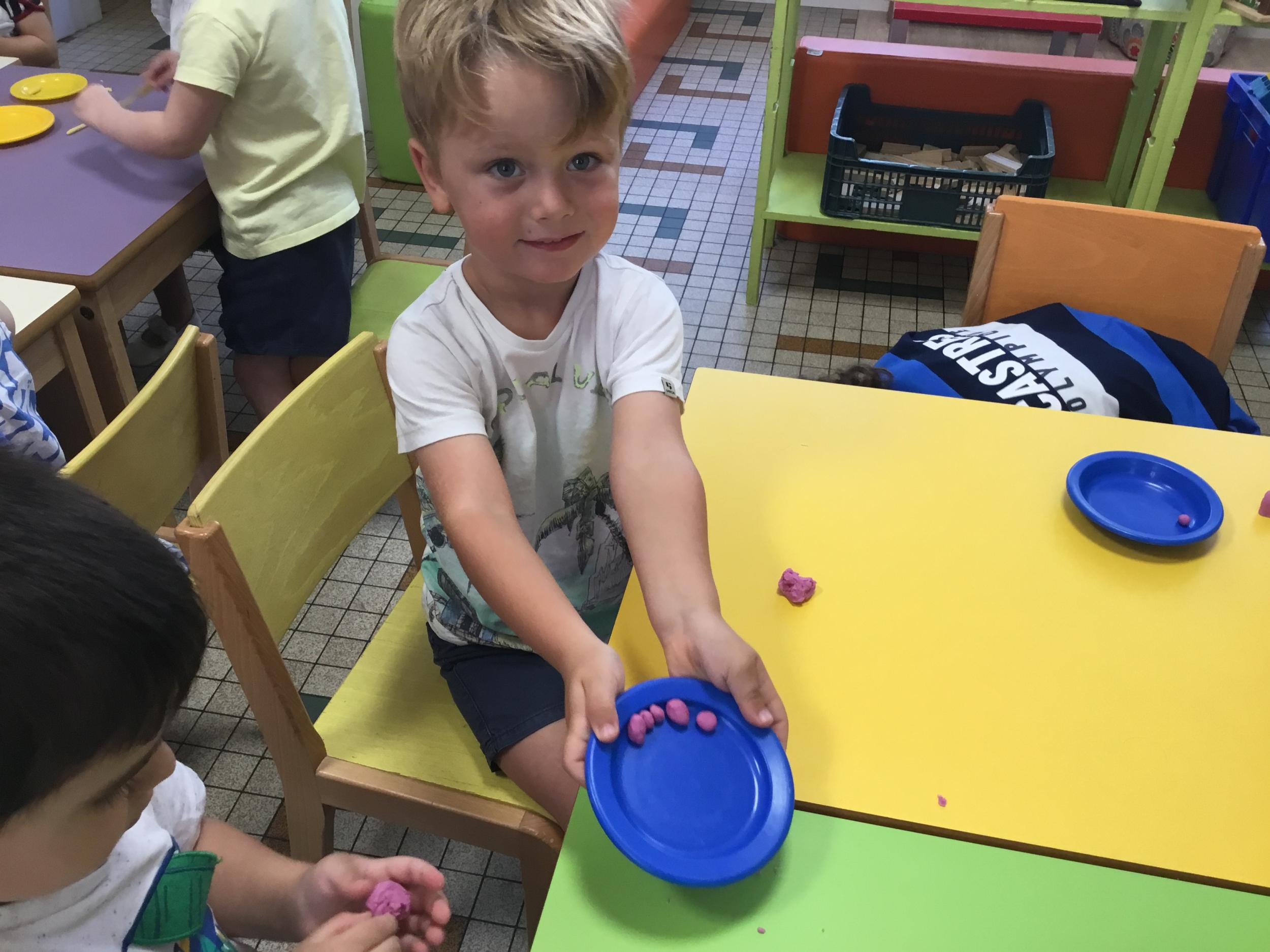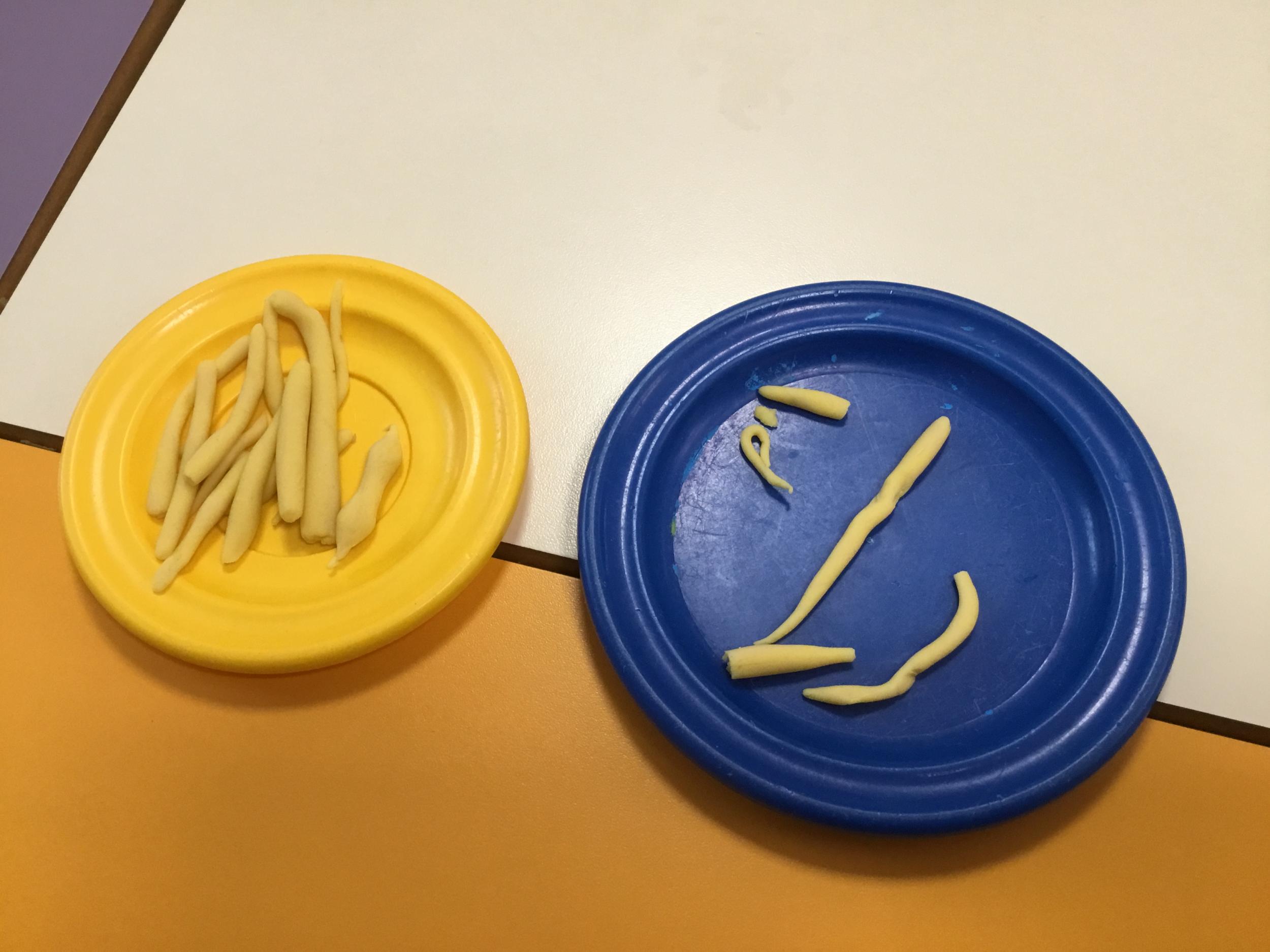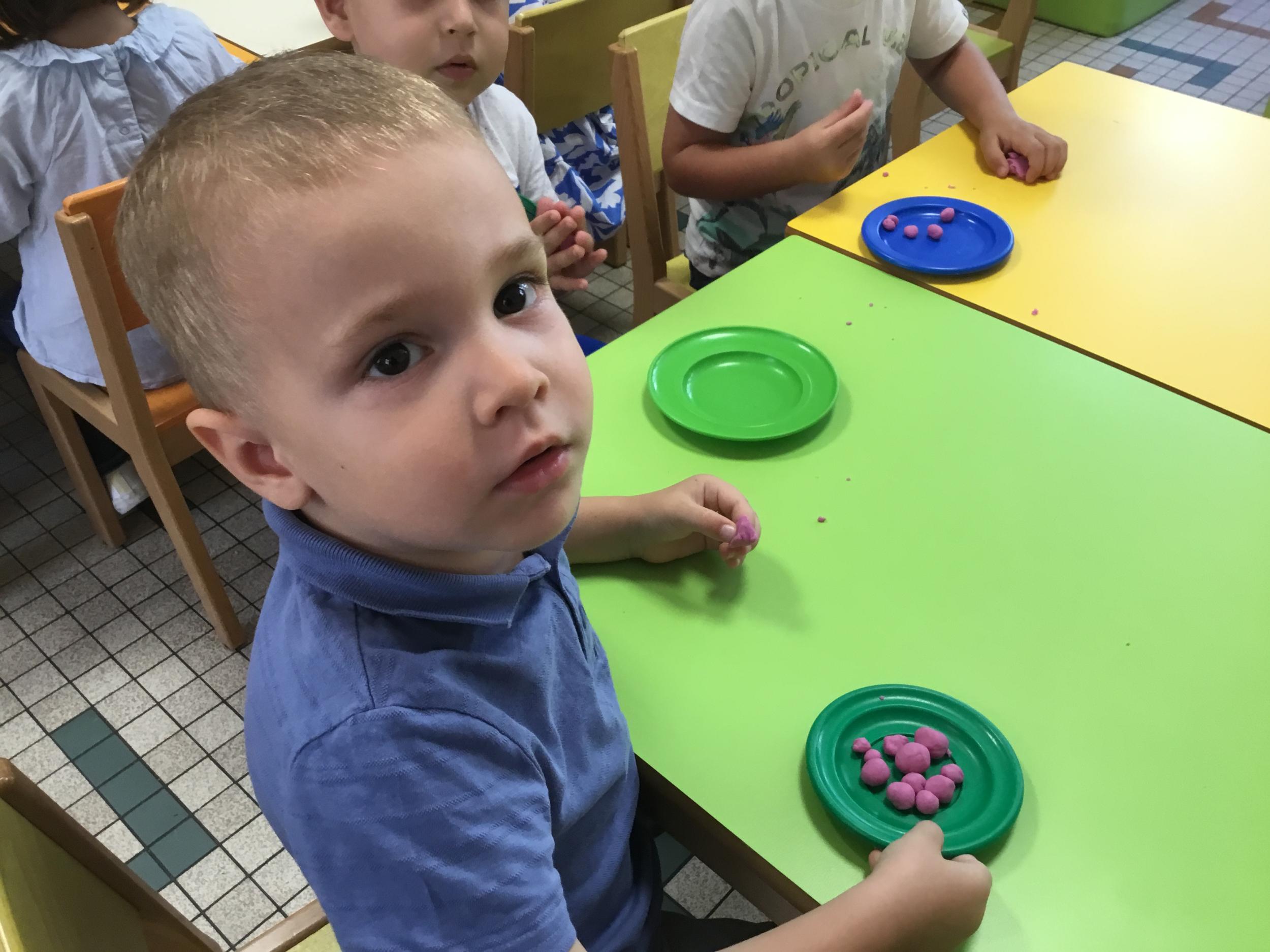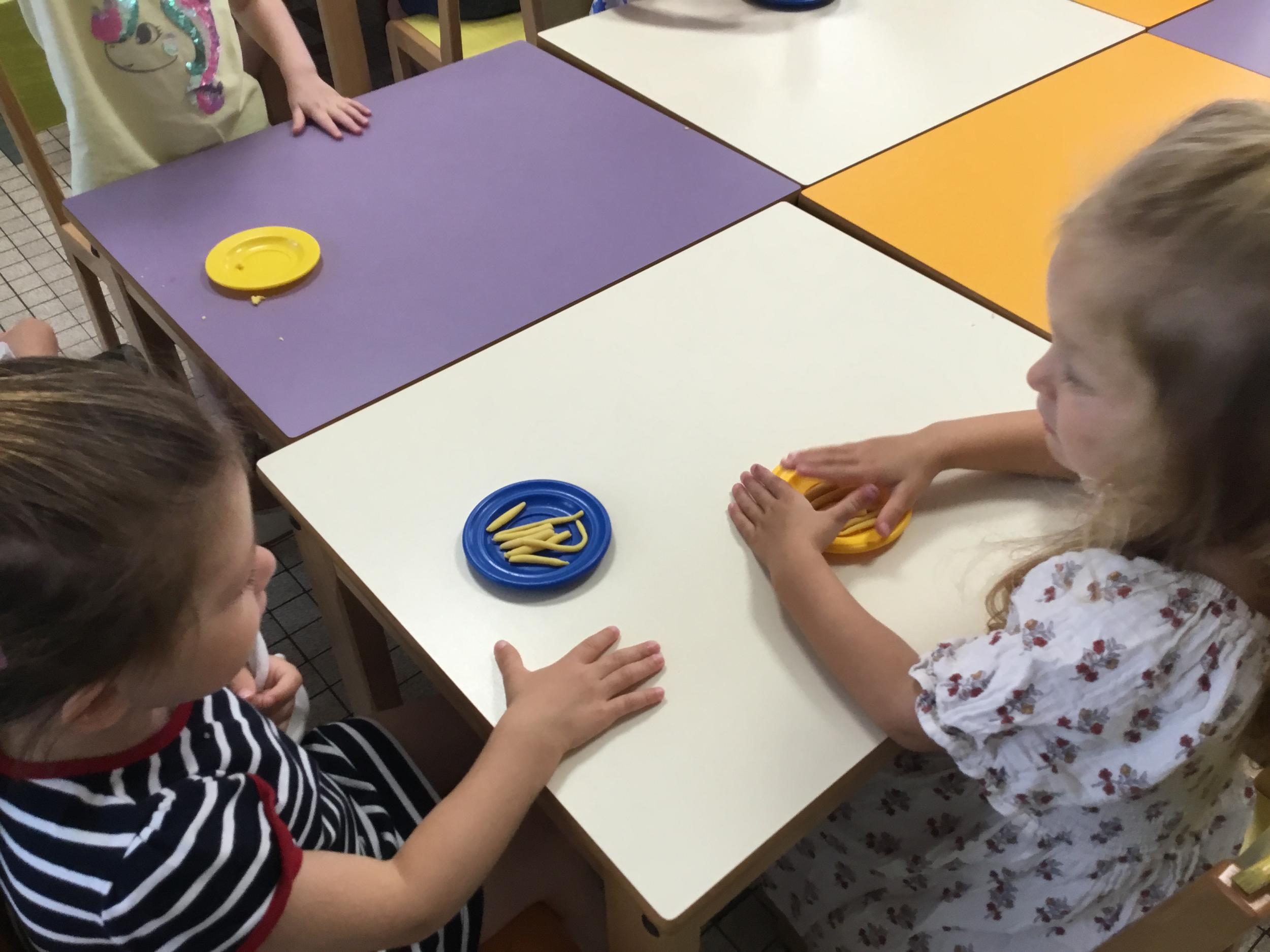 Ce matin nous avons travaillé sur les notions « peu » « beaucoup » « plus que » « moins que ». Pour cela les élèves ont joué au restaurant et ont servi beaucoup ou peu de frites, beaucoup ou peu de boulettes de viandes, beaucoup ou peu de haricots verts.