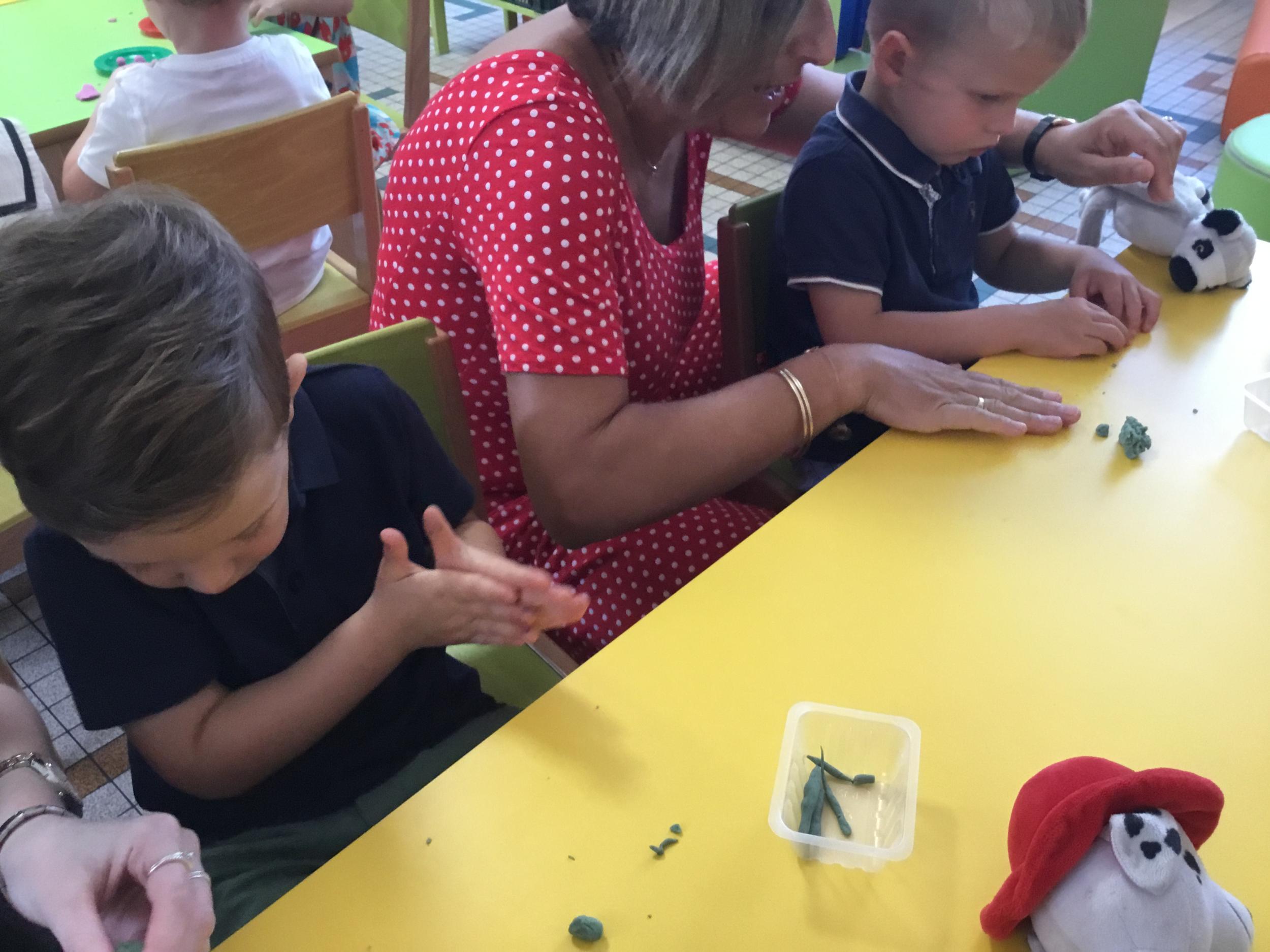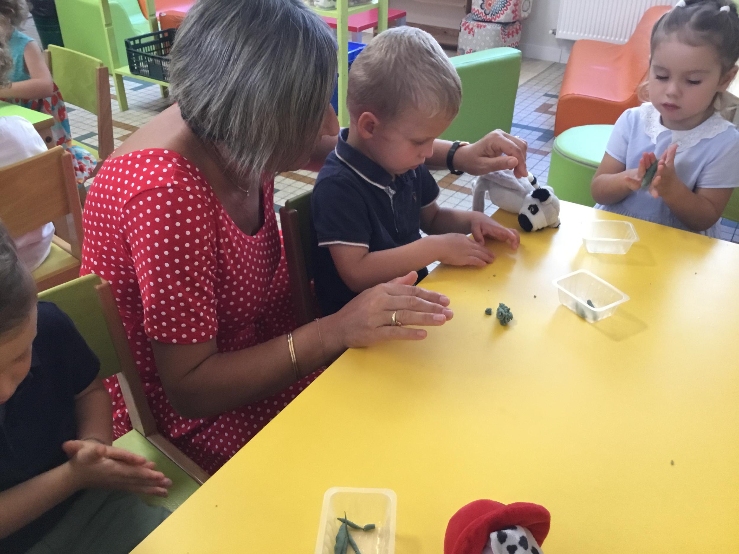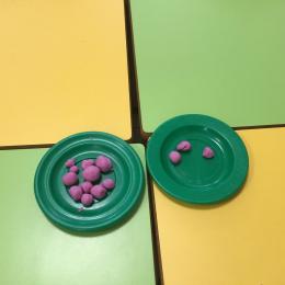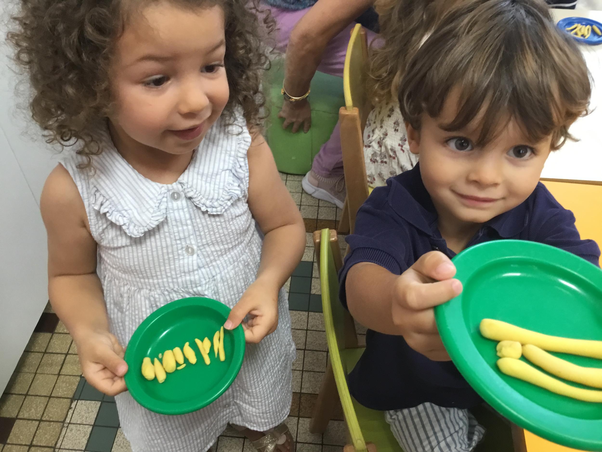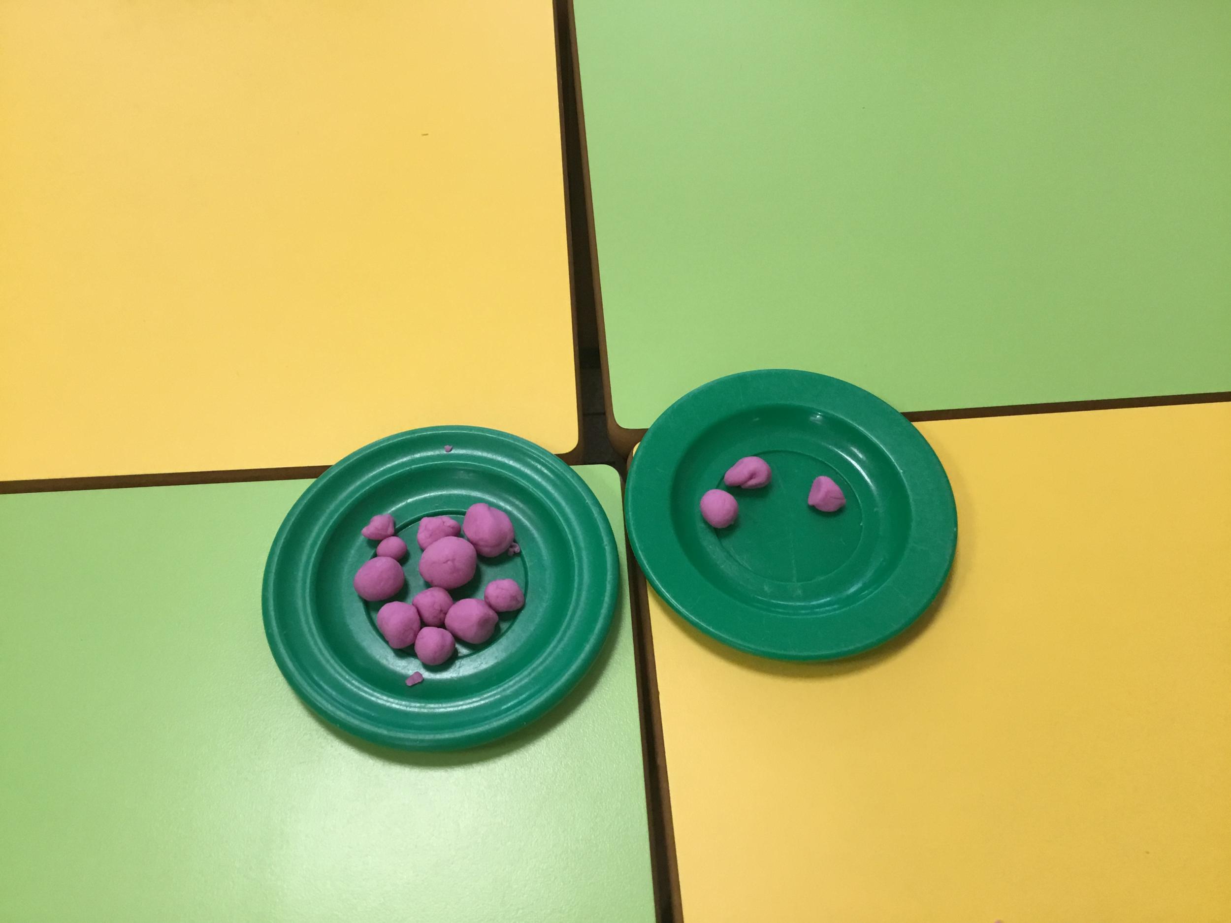 Ce matin nous avons travaillé sur les notions « peu » « beaucoup » « plus que » « moins que ». Pour cela les élèves ont joué au restaurant et ont servi beaucoup ou peu de frites, beaucoup ou peu de boulettes de viandes, beaucoup ou peu de haricots verts.