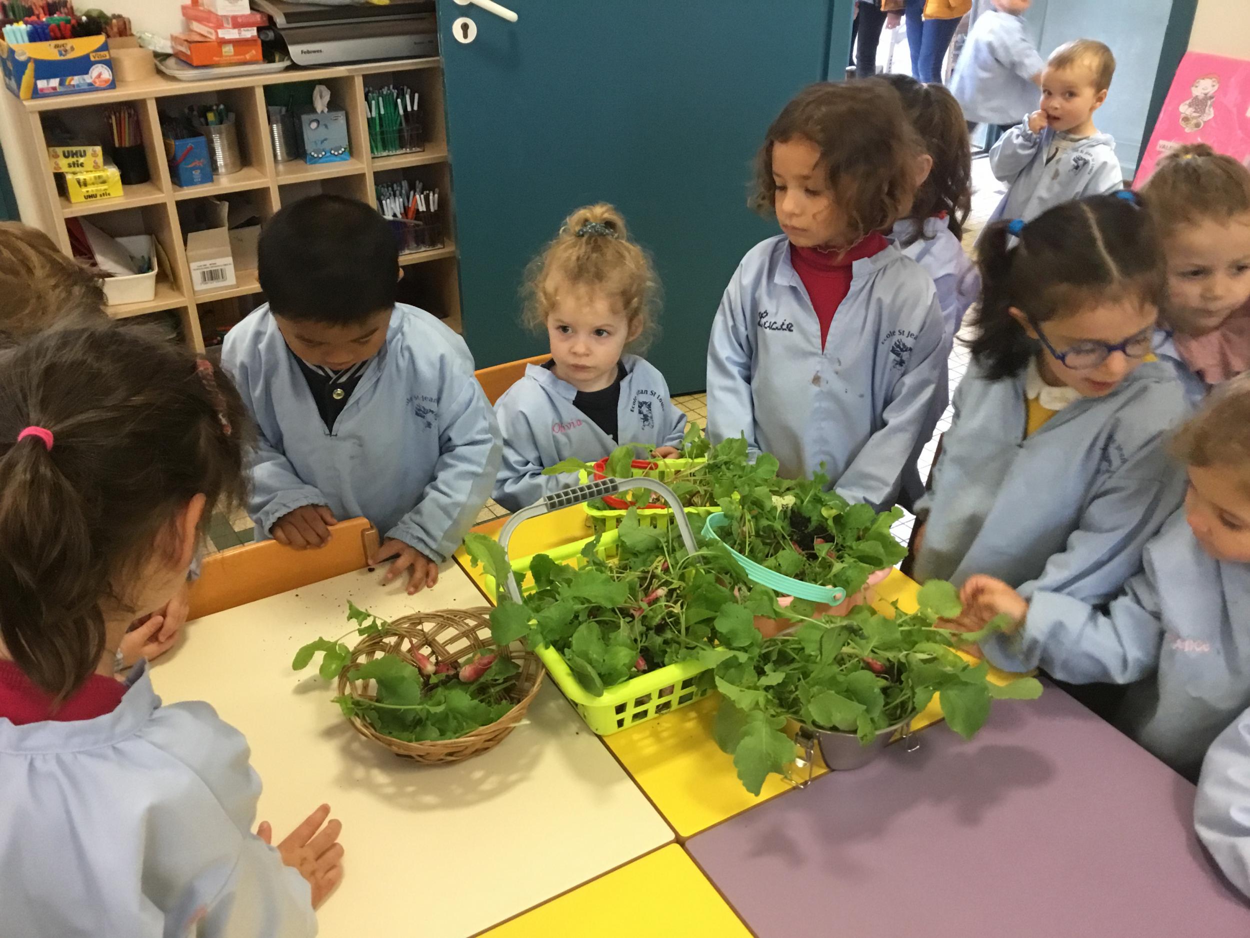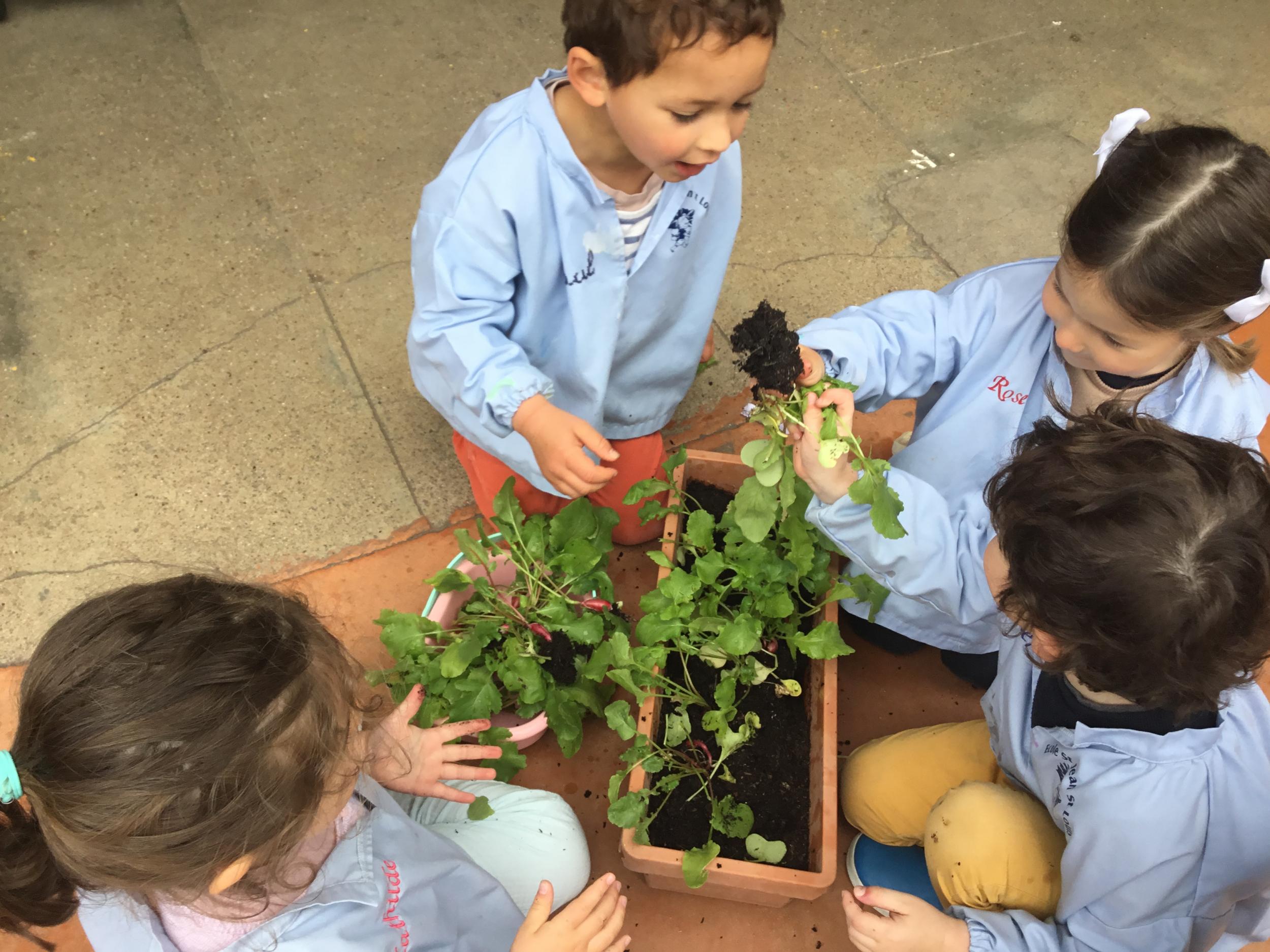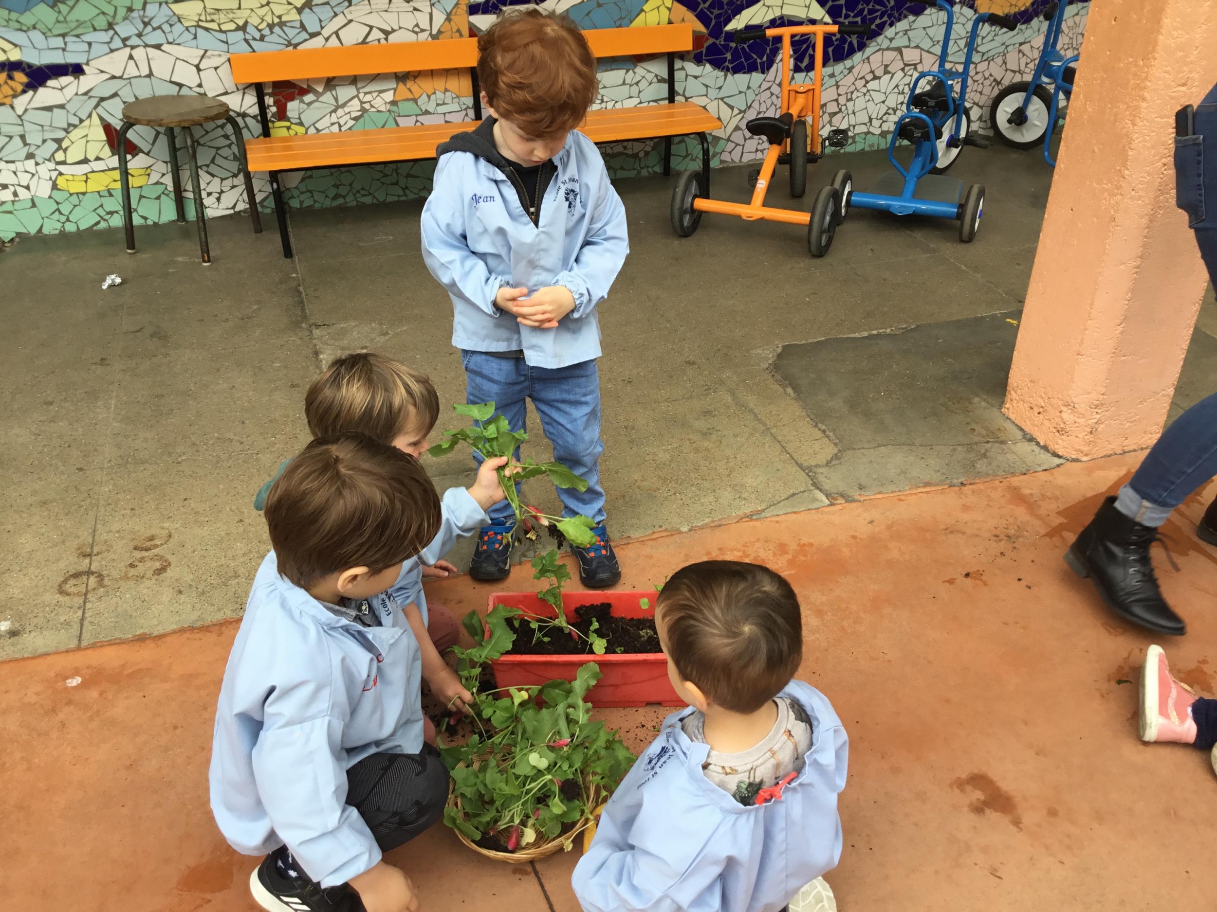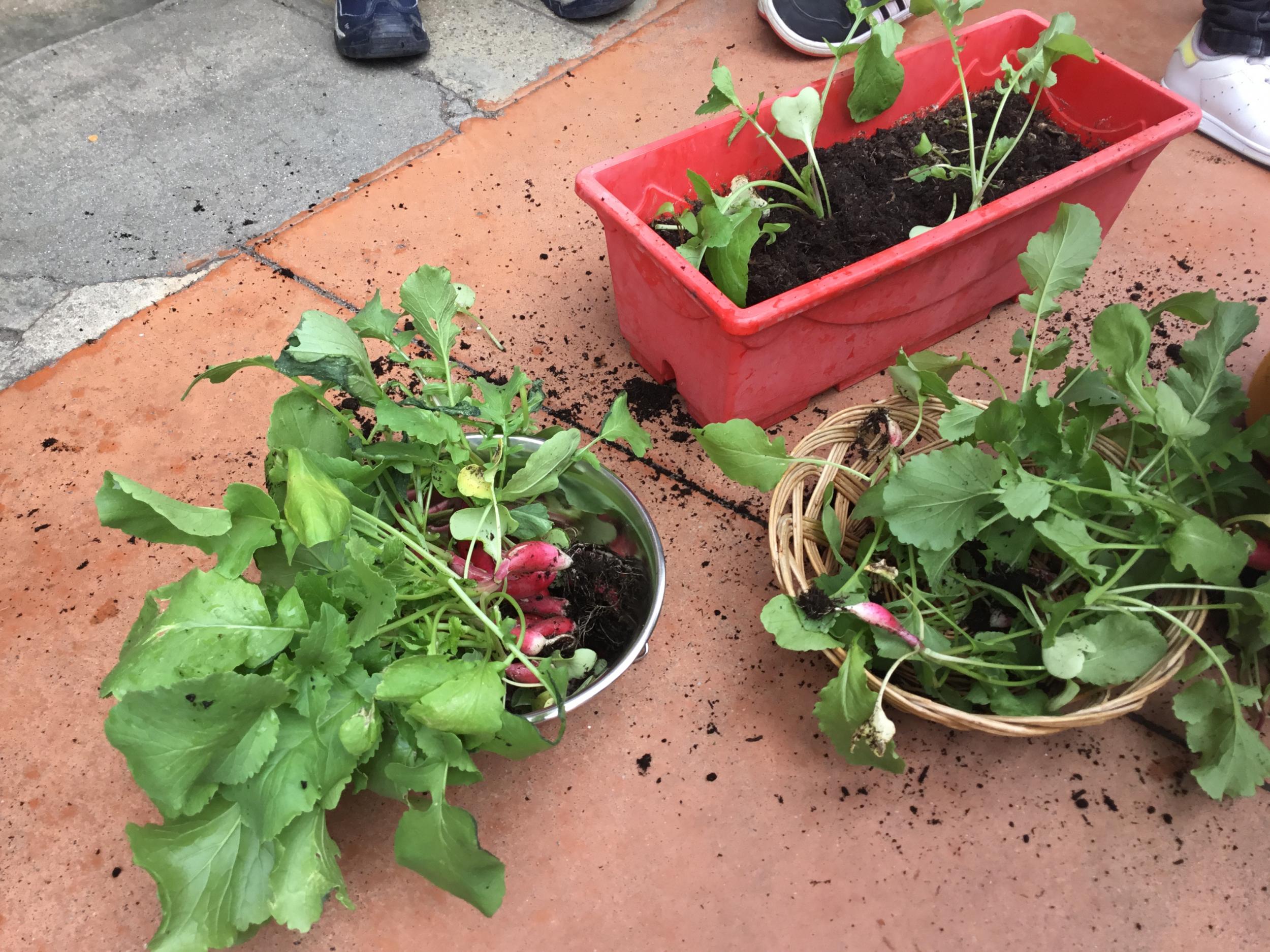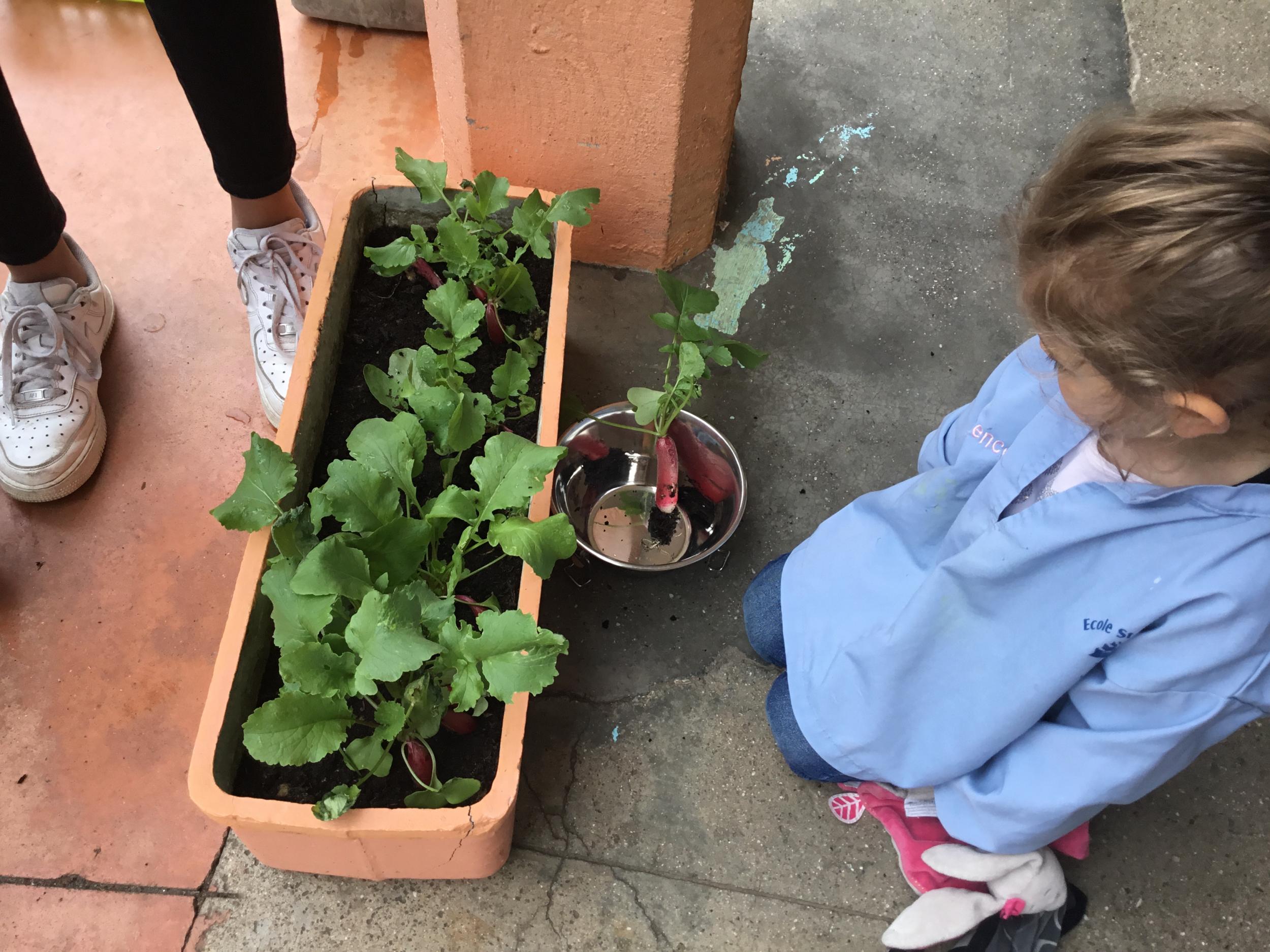Il y a quelques semaines, les élèves de petite section ont semé des radis. Il était grand temps de les récolter.