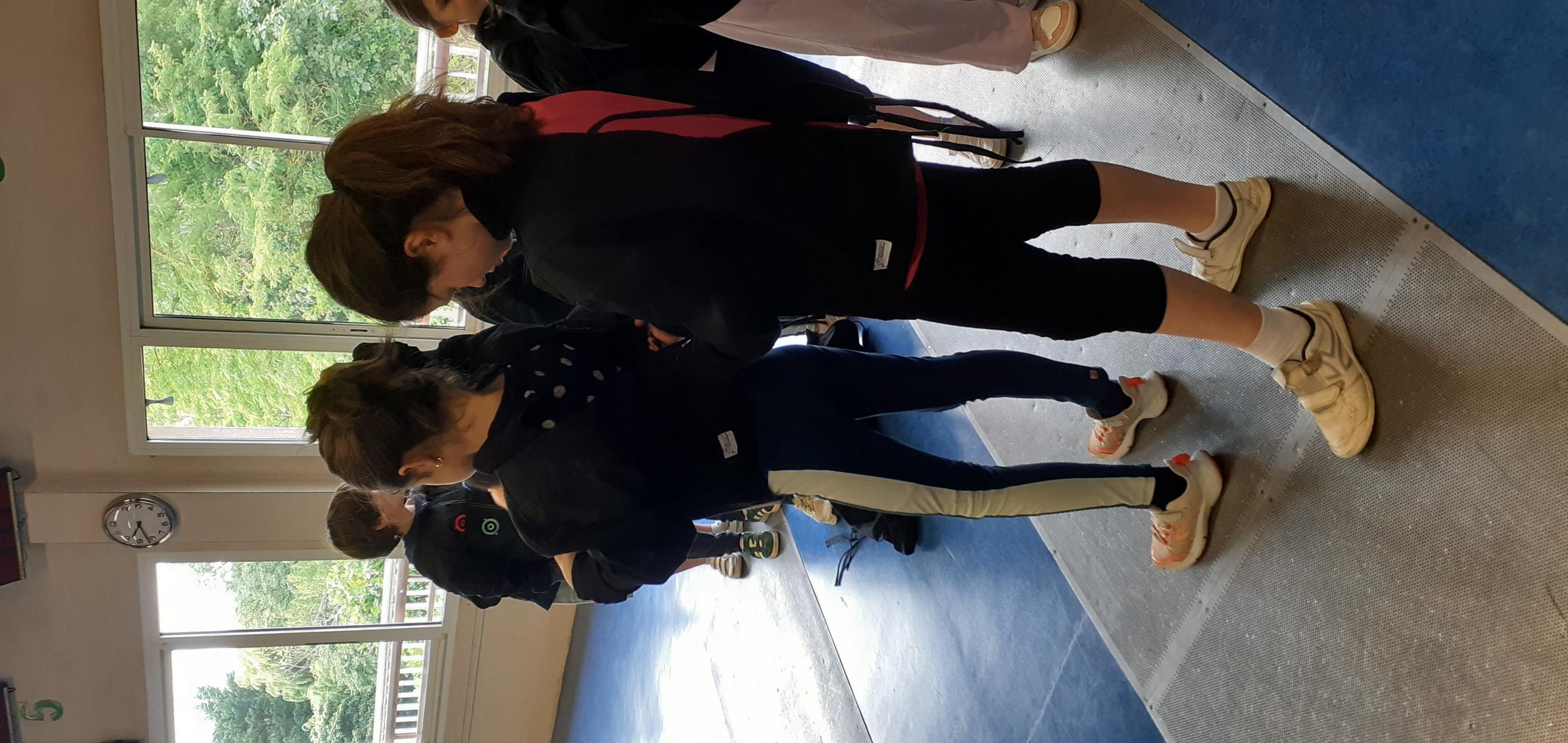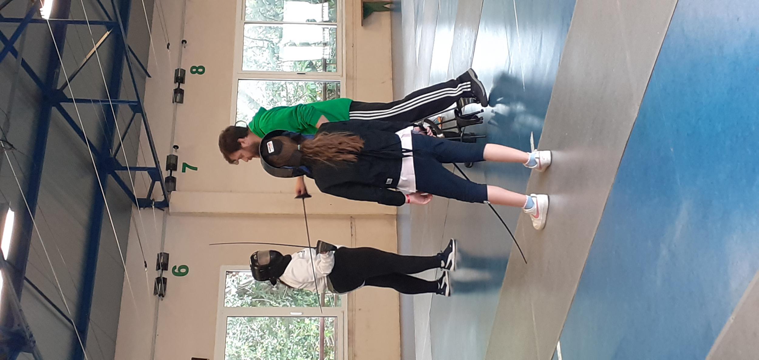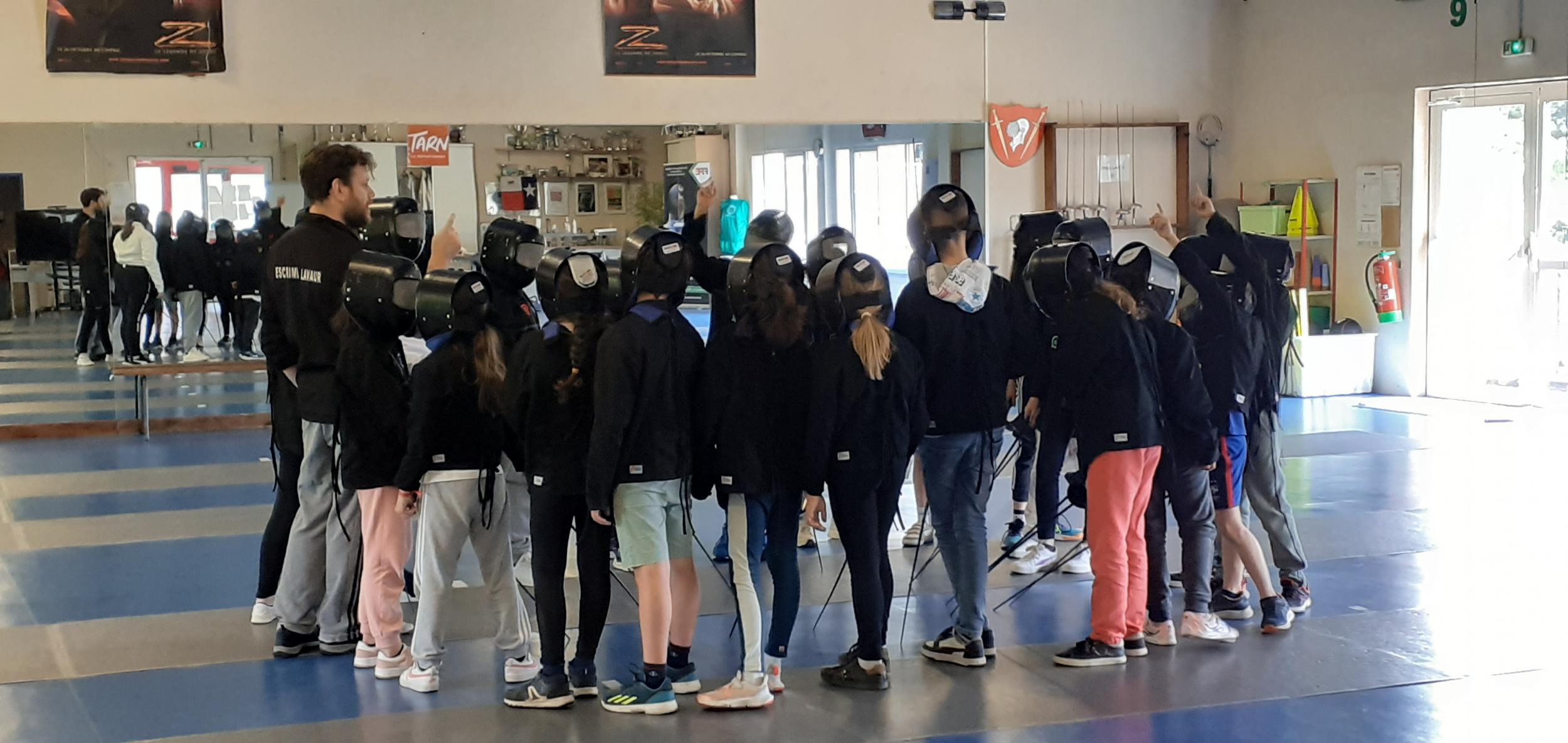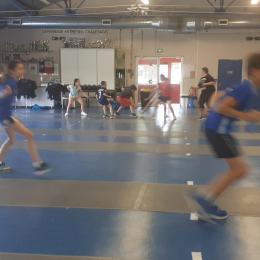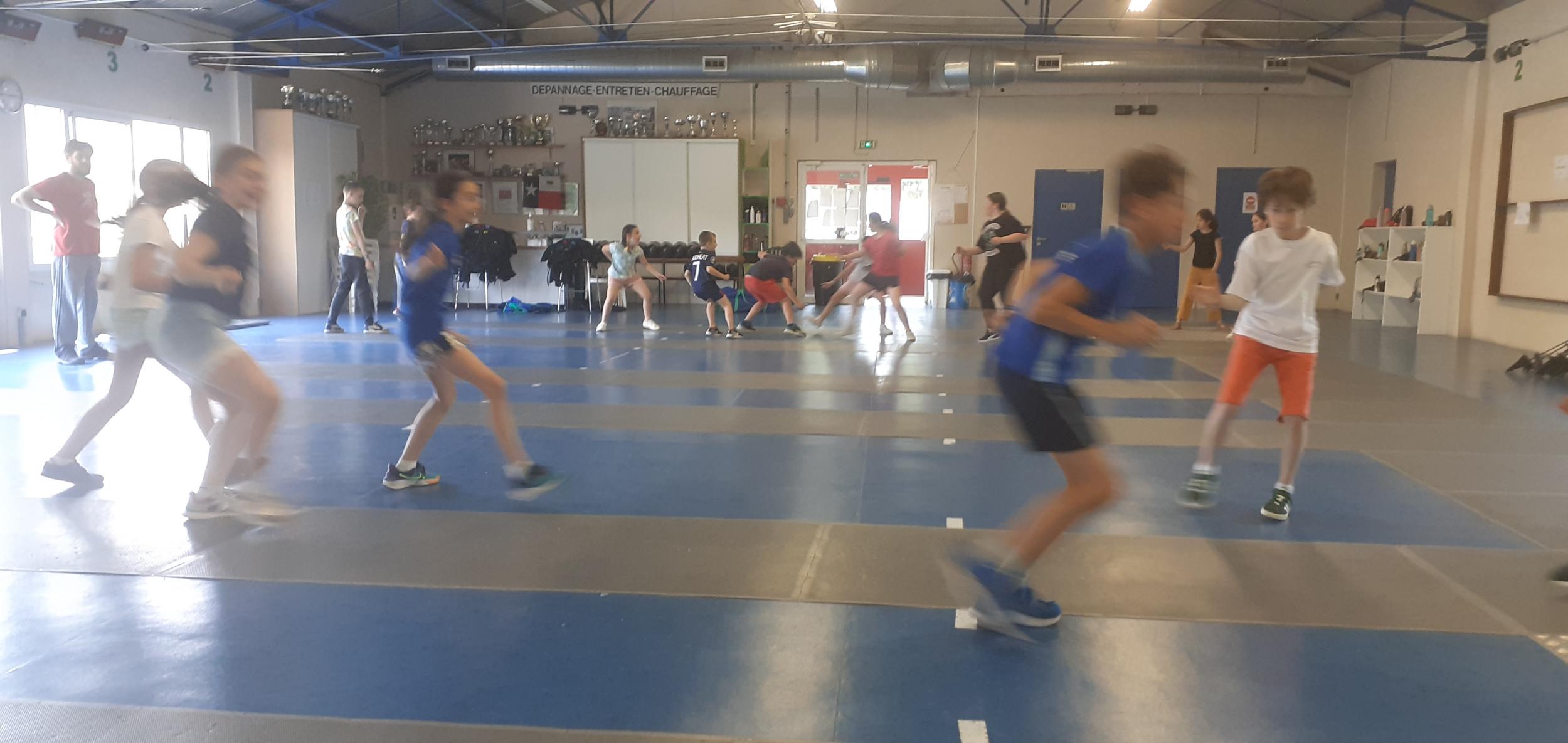 Après des échauffements sous forme de jeux (mobilisant aussi coopération et calcul mental), les élèves travaillent les techniques d'attaque, de parade et de riposte, pour mener de petits duels.