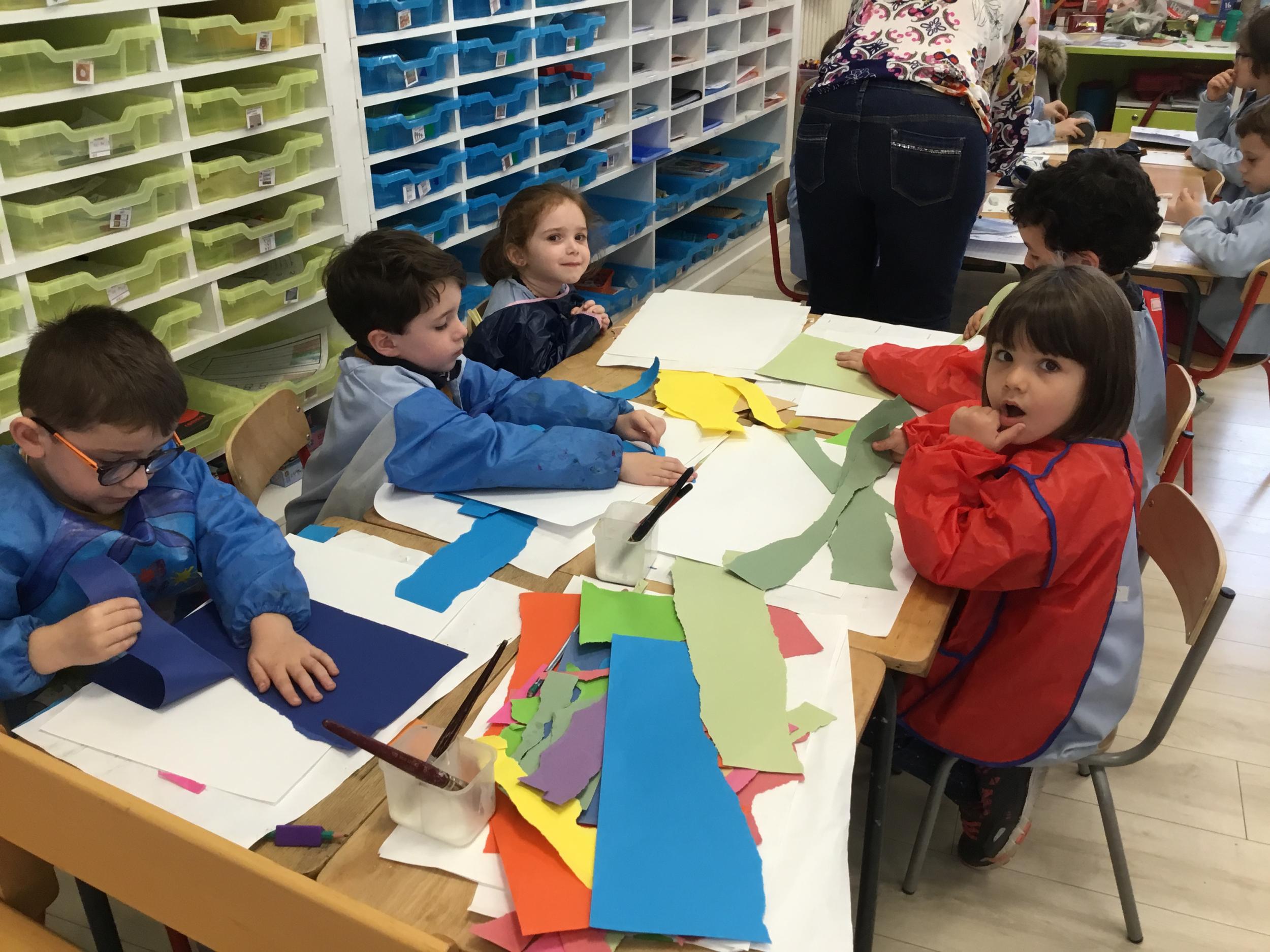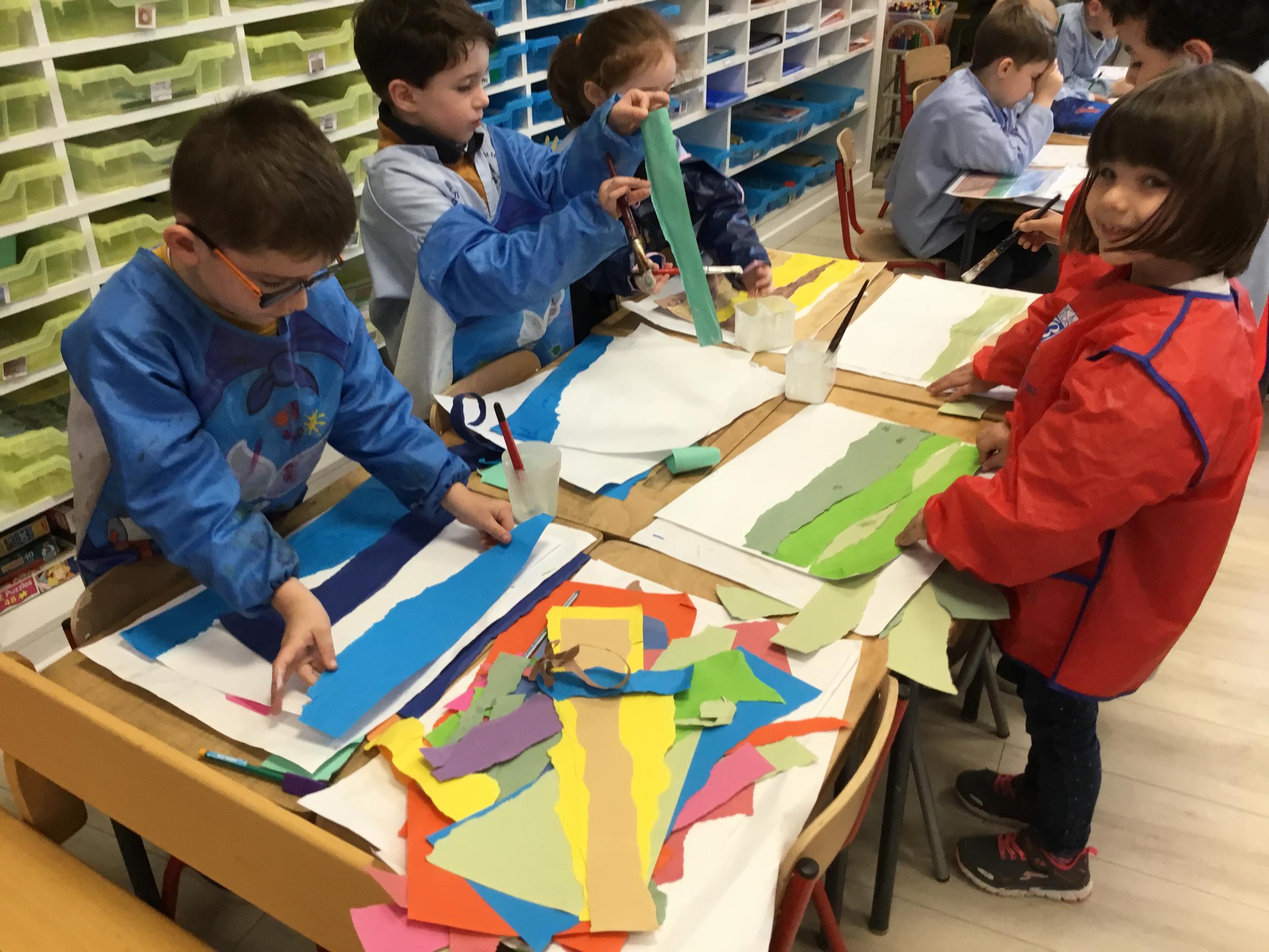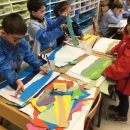 En accord avec l'aliment choisi, les élèves ont déchiré de grandes bandes de papiers colorés pour faire le fond de leur création.