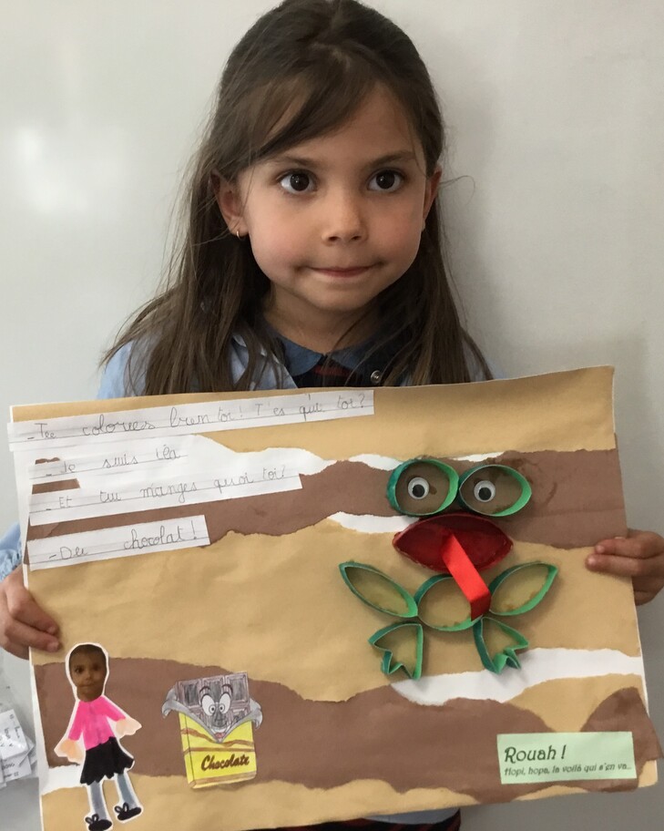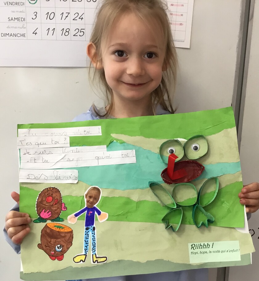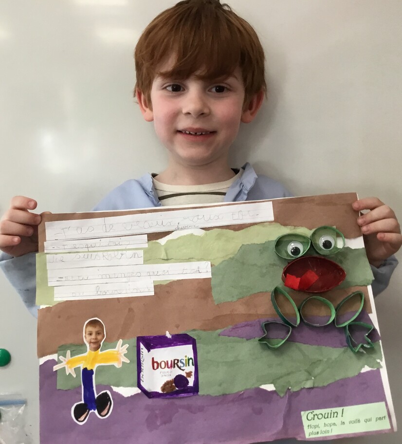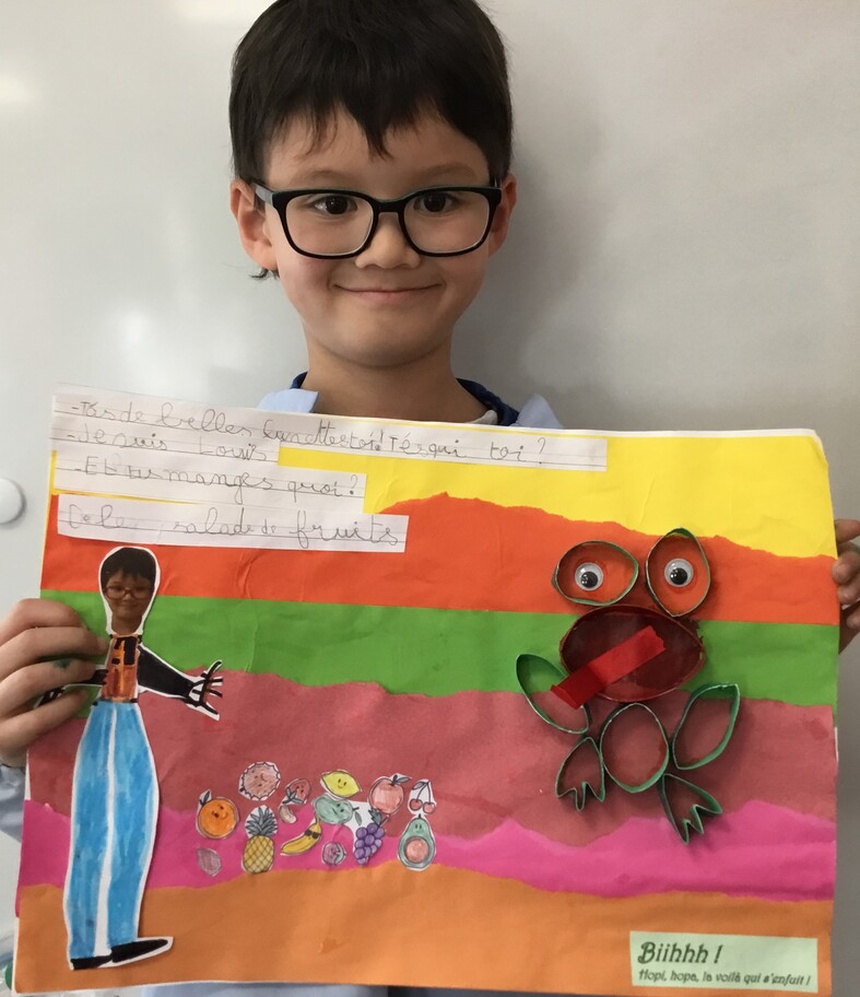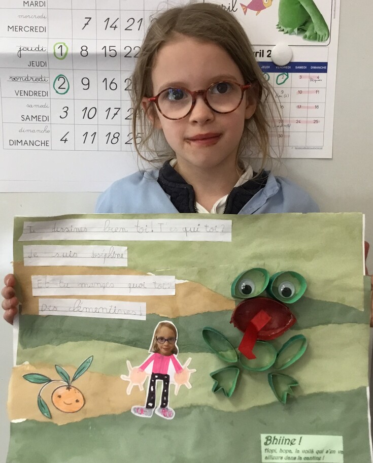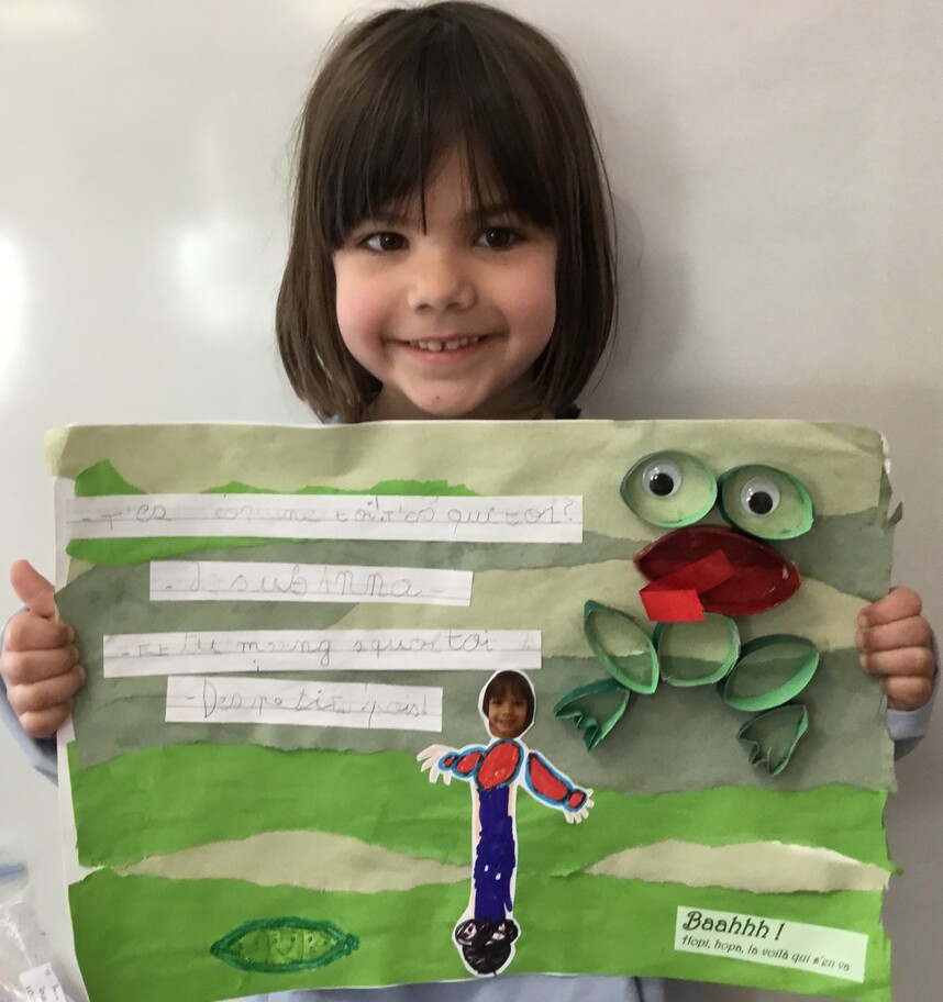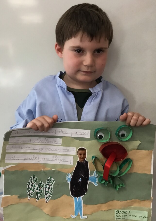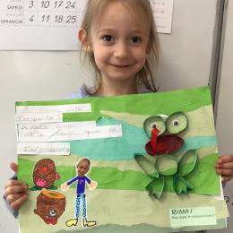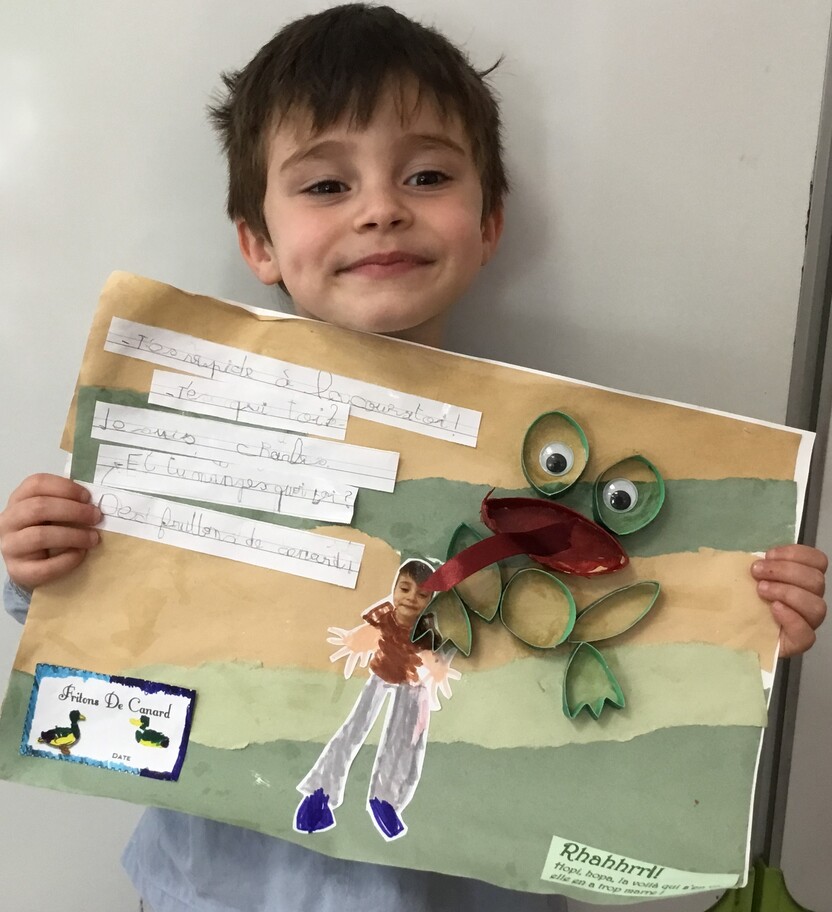 Il y eu un grand travail d'écriture car chacun a recopié le petit dialogue entre soi et la grenouille en écriture cursive! Beaucoup d'efforts pour de beaux résultats, bravo à chacun!