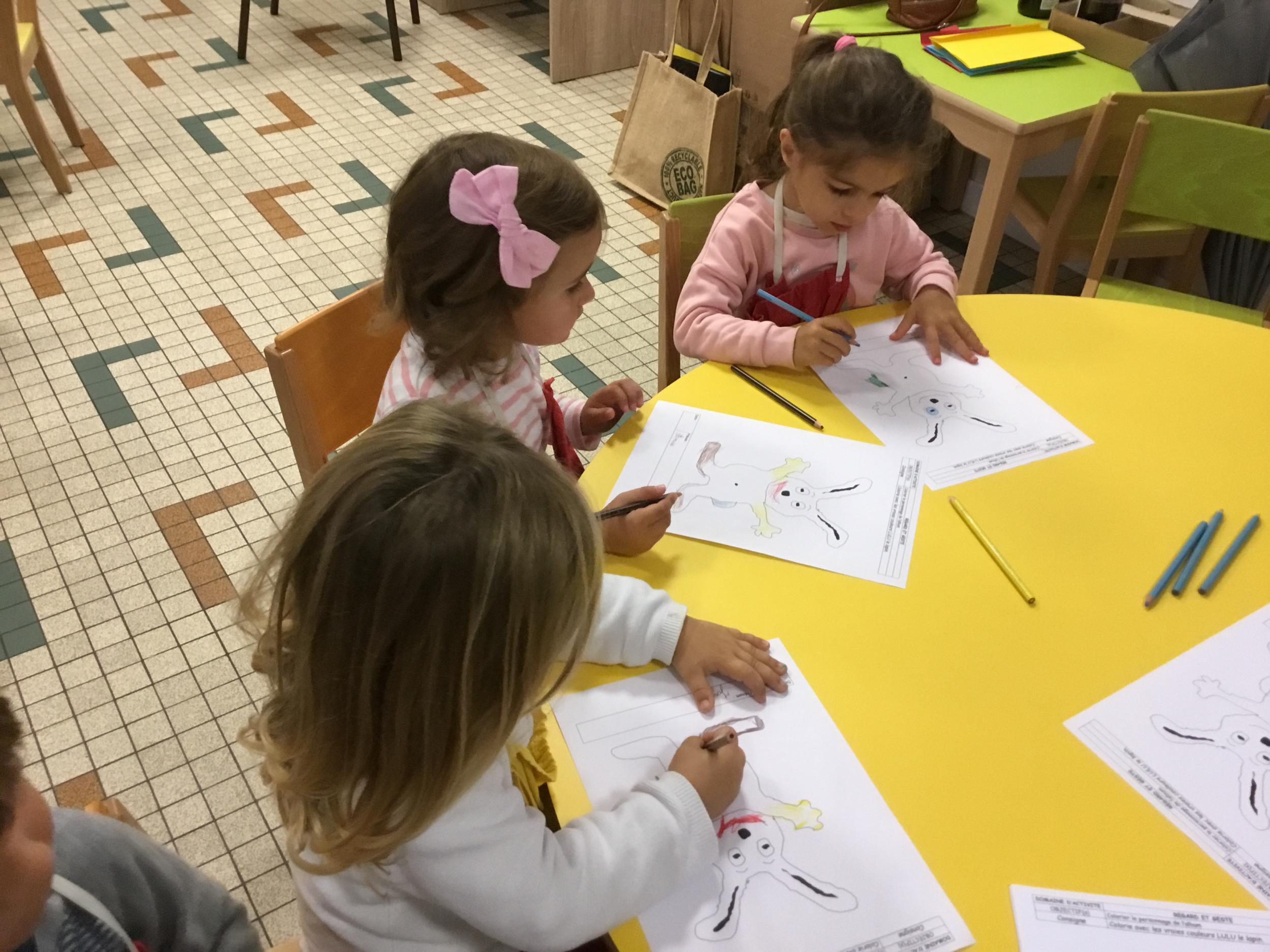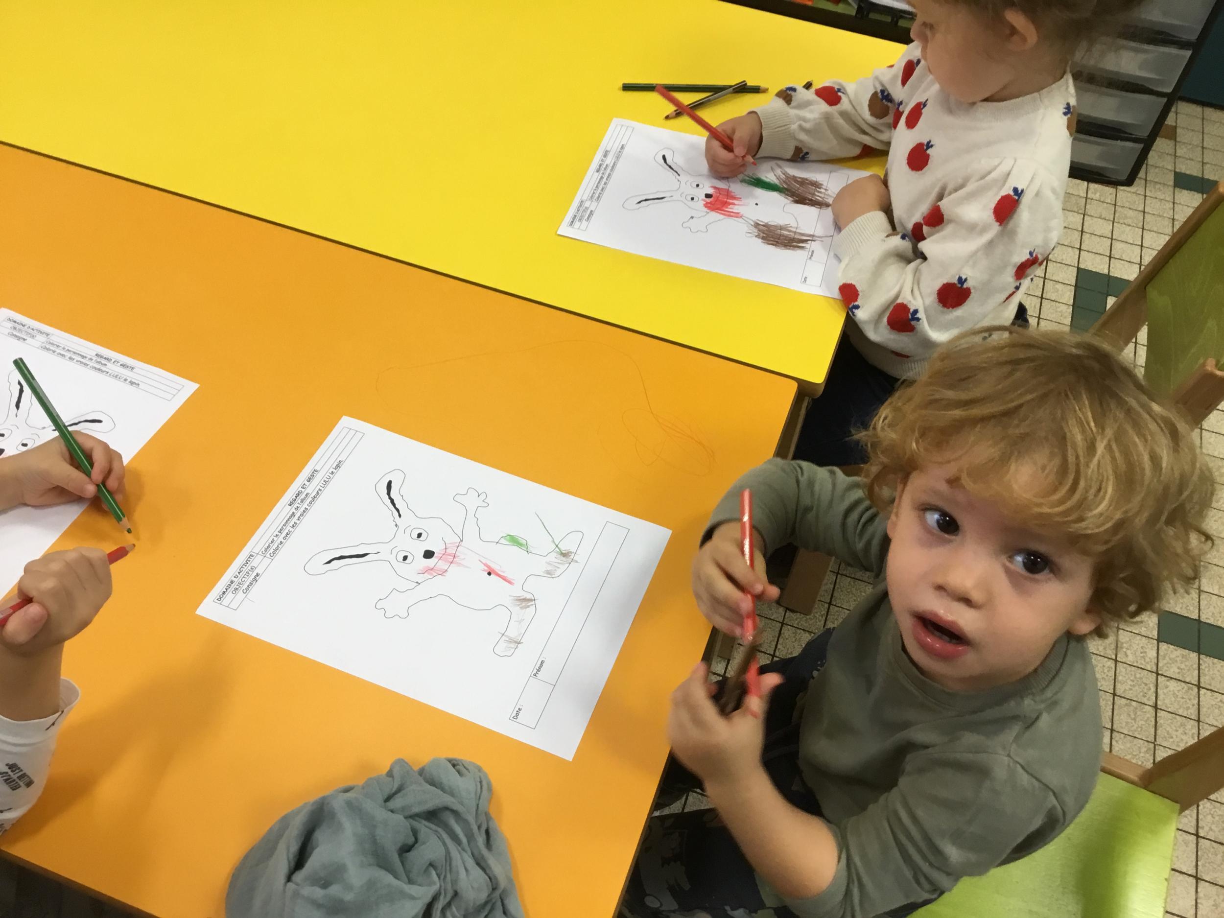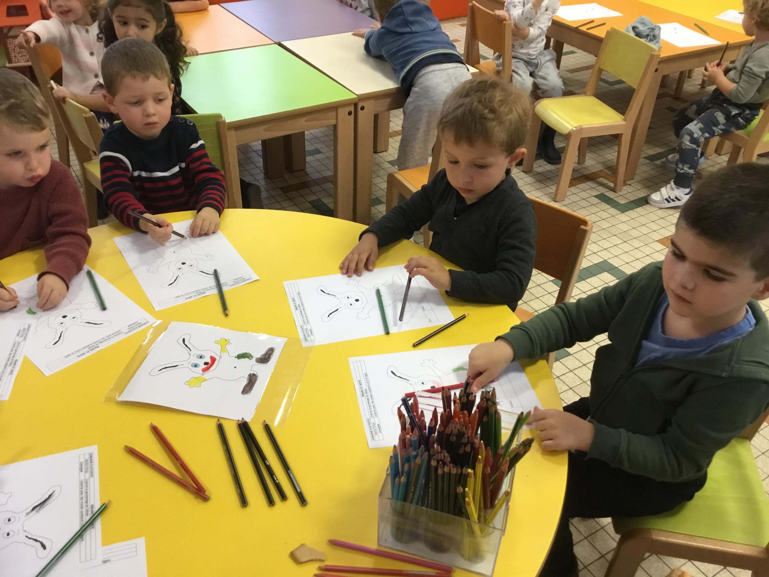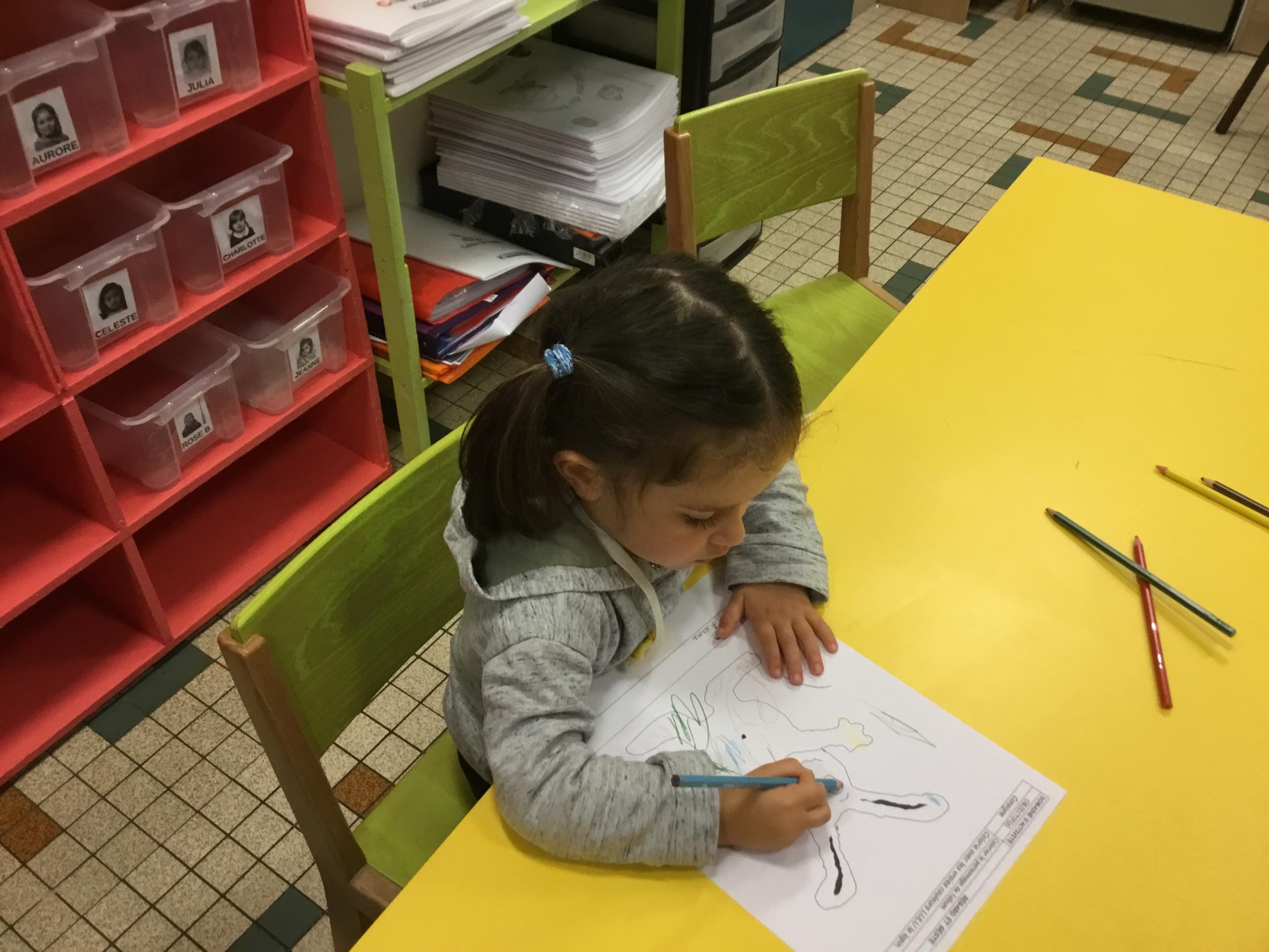 Petite et moyenne section 03/10/2021 Les élèves commencent à travailler sur les arts et la couleur à partir d’un premier album « Toutes les couleurs ». Écouter l’histoire et remettre les images de l’album dans l’ordre. Colorier Lucien en respectant les couleurs de l’histoire Laisser une trace: le bouchon et le bleu Ateliers perles et pâte à modeler