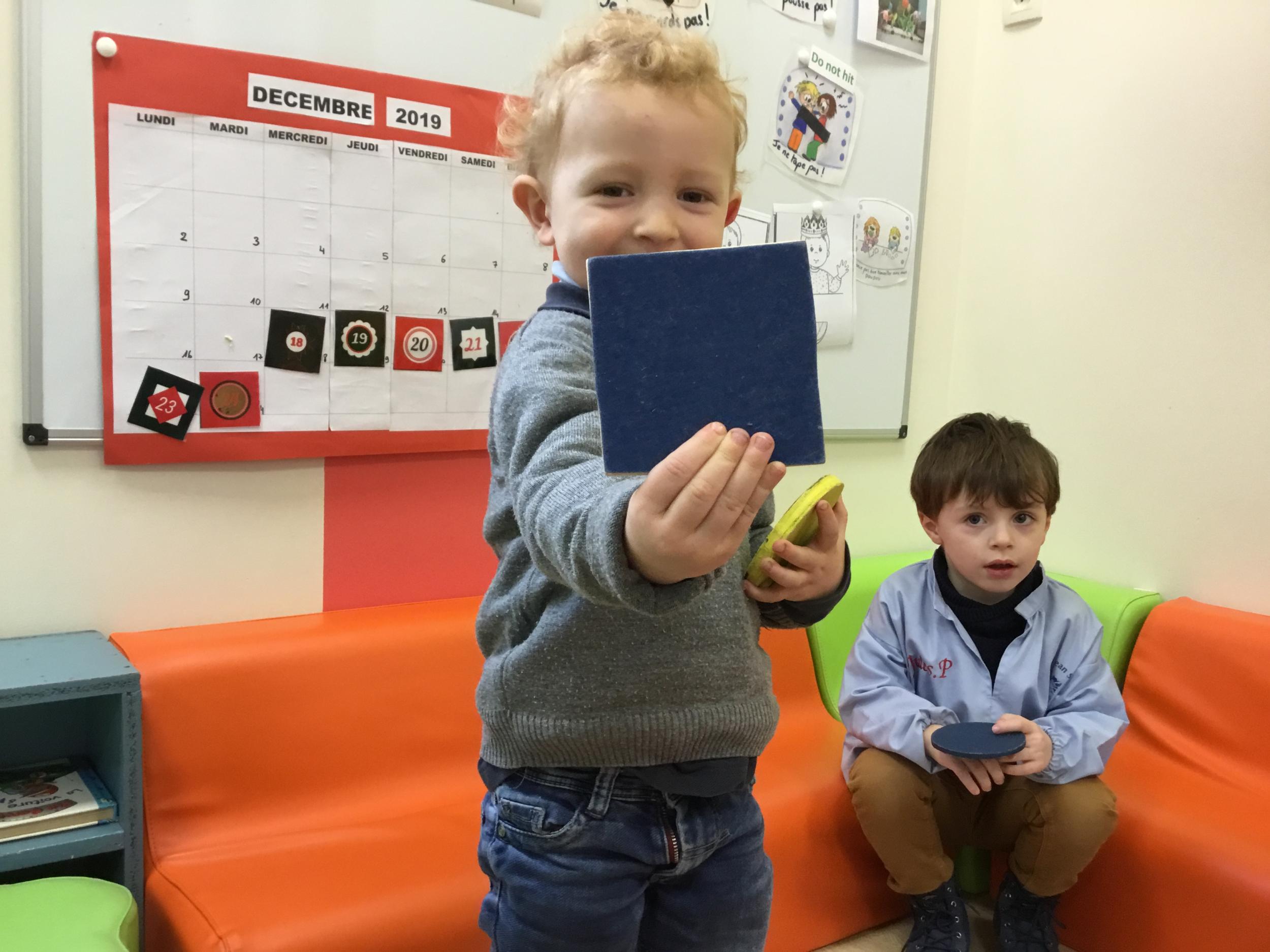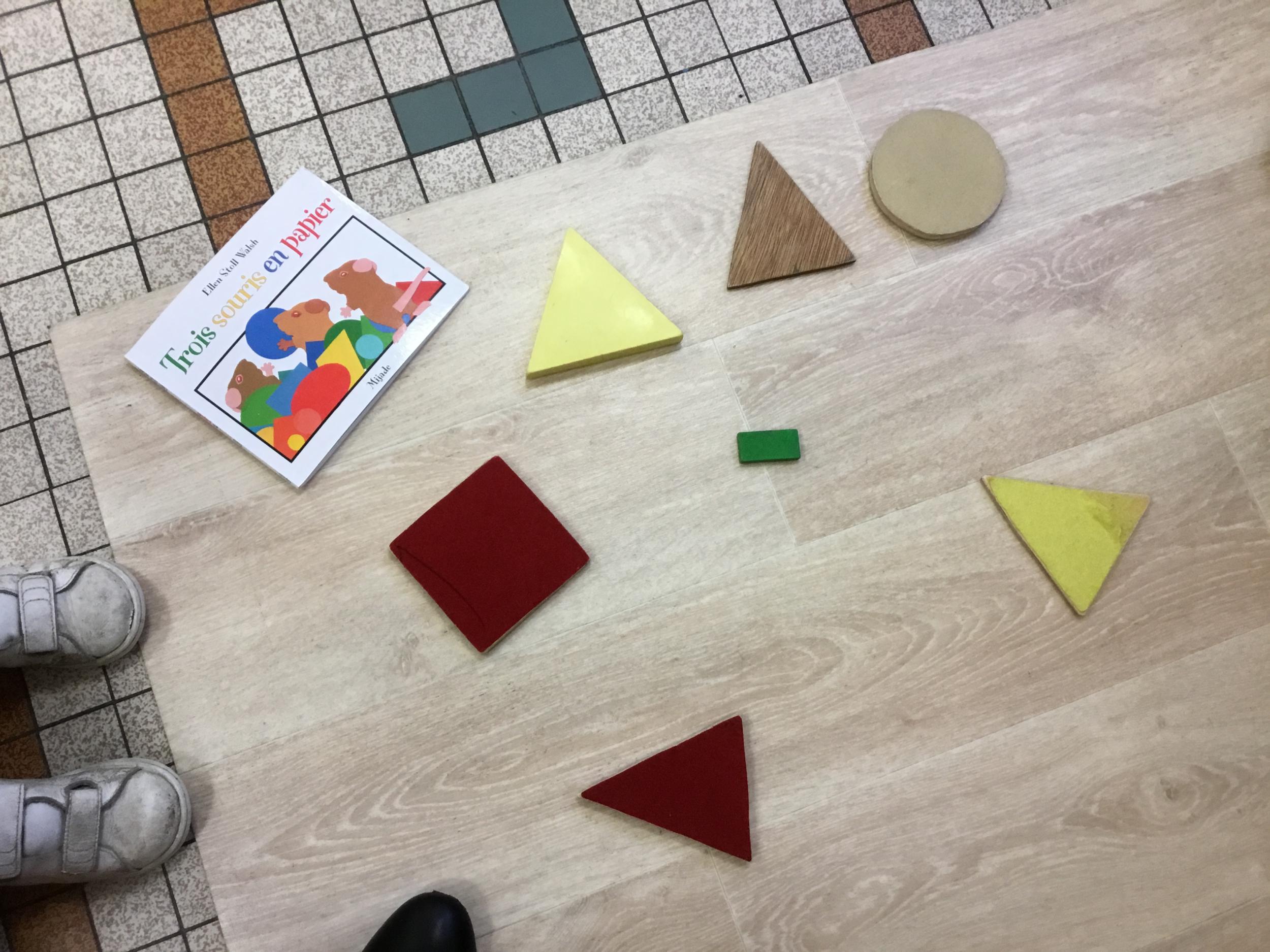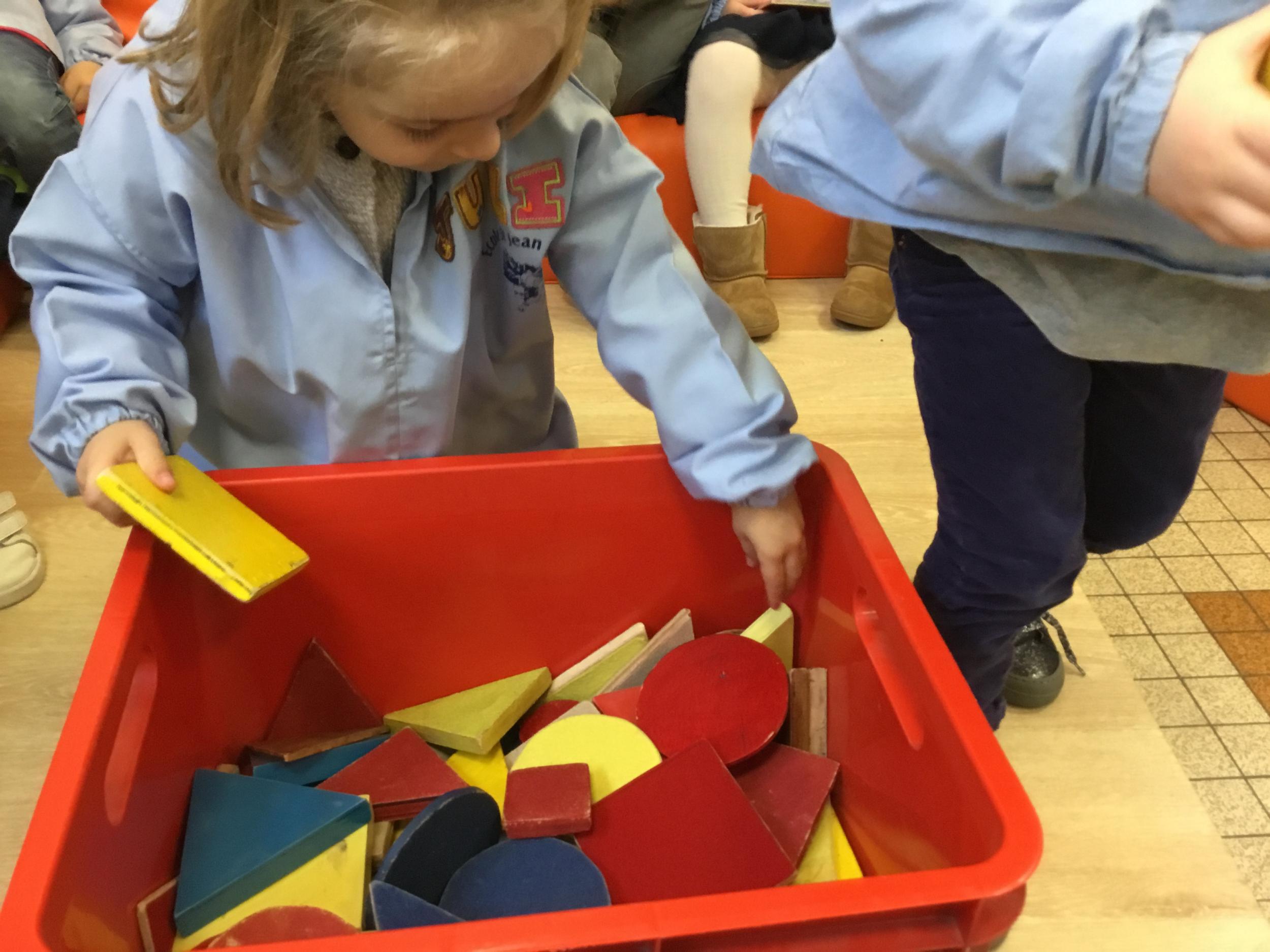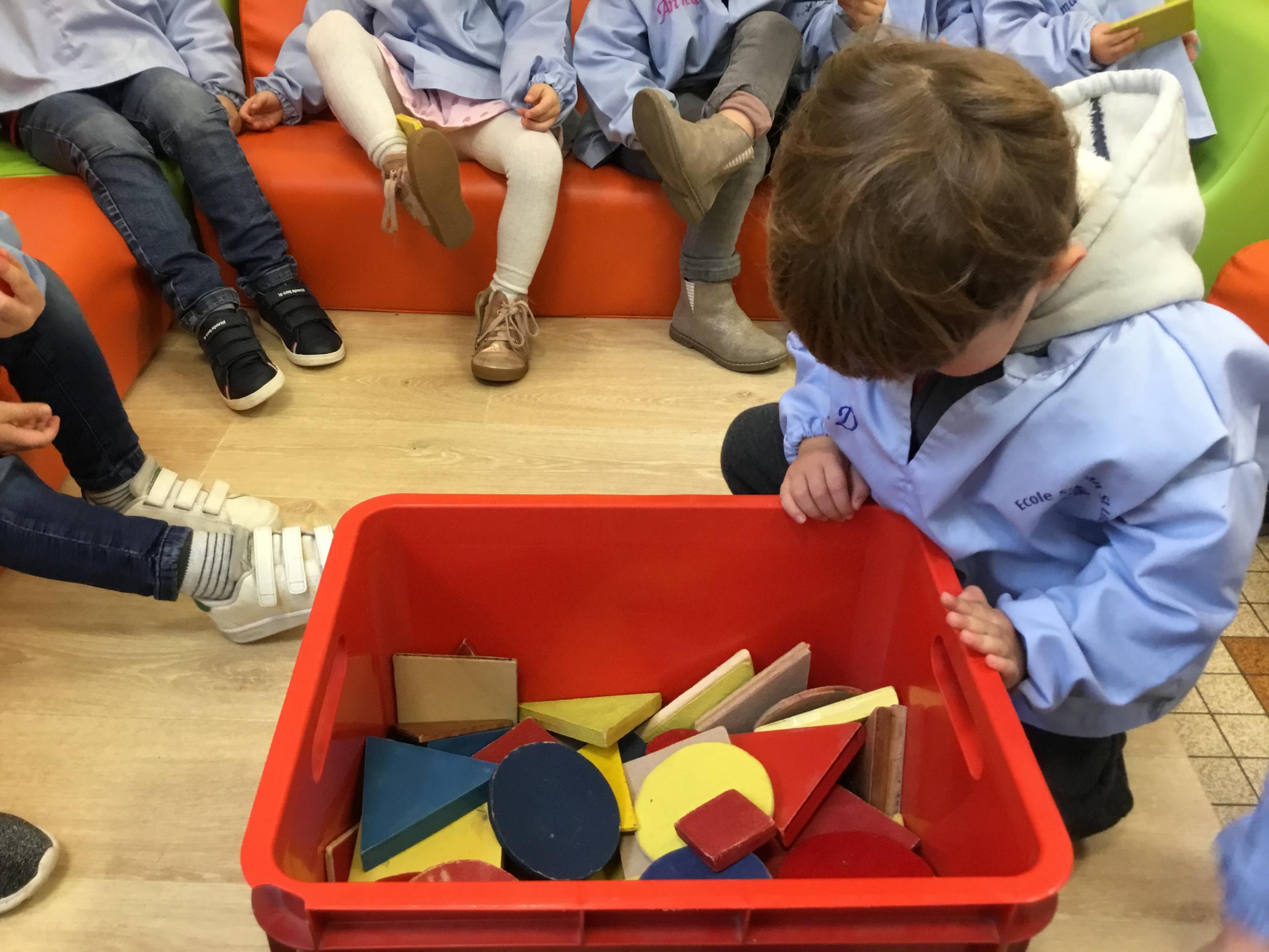 Cette période les élèves travaillent sur le thème des formes géométriques. Il s’agit de les reconnaître et les nommer. Le thème a été abordé de différentes manières.