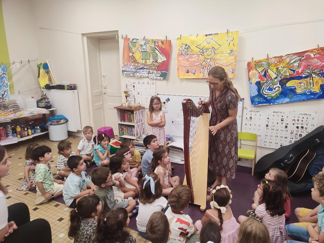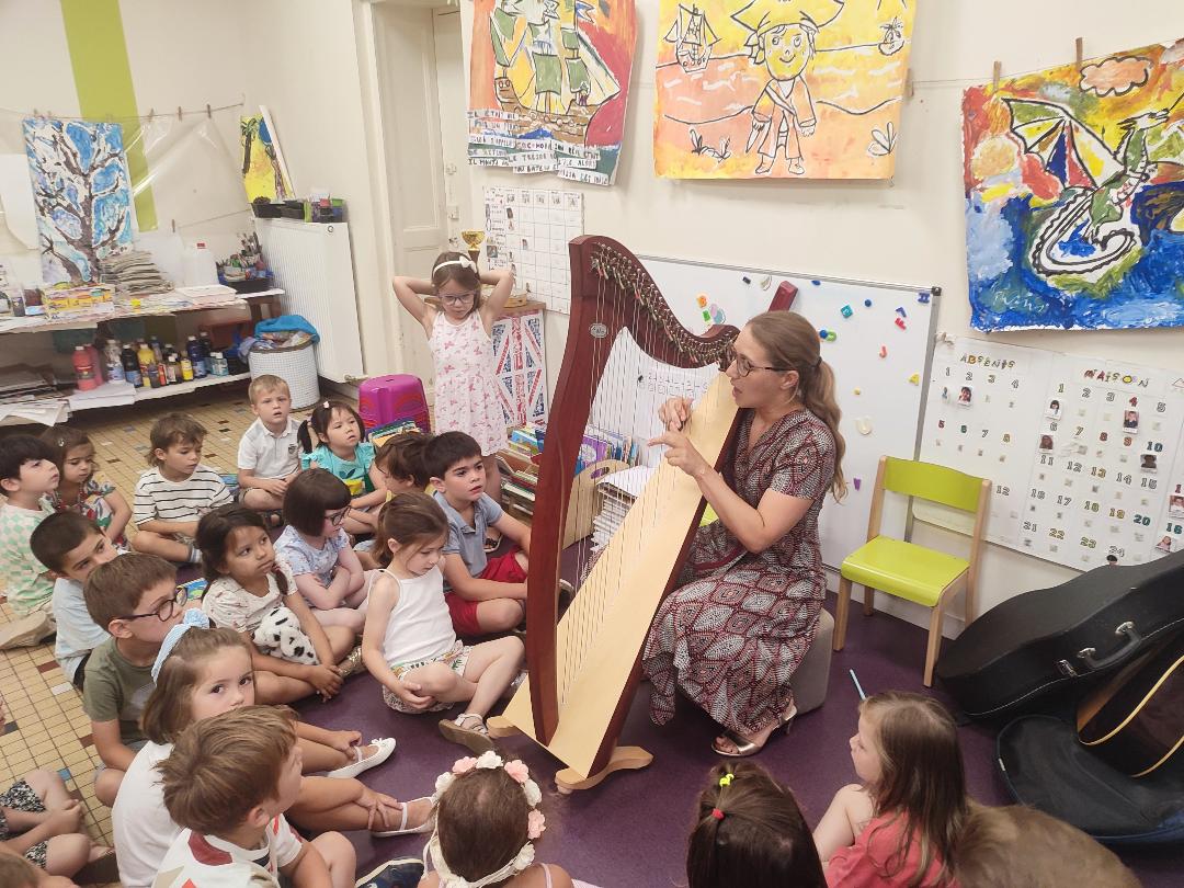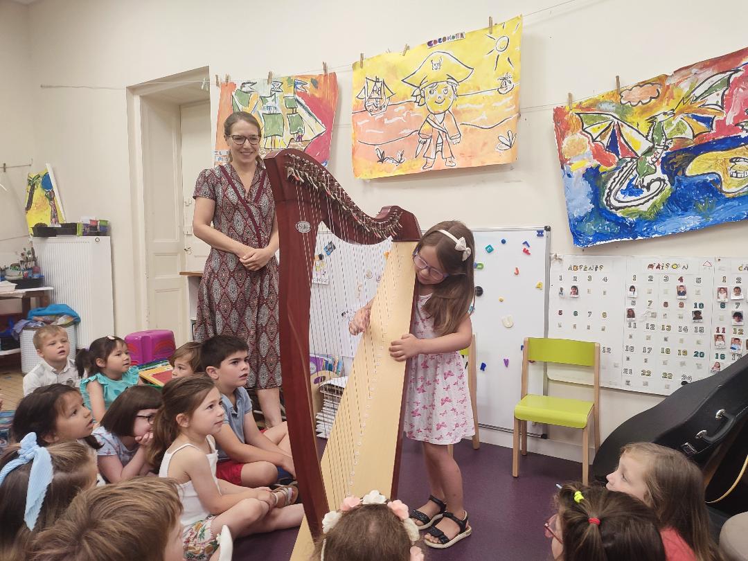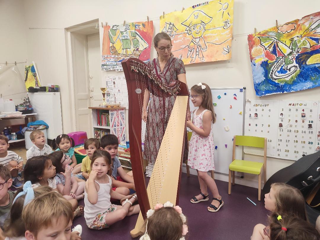 La maman d'Elinore a eu la gentillesse et le courage de venir nous présenter sa harpe celtique. Elle et ses deux filles nous ont fait un concert, c'était magnifique ! Elles chantaient en jouant ! Grand merci à elles !