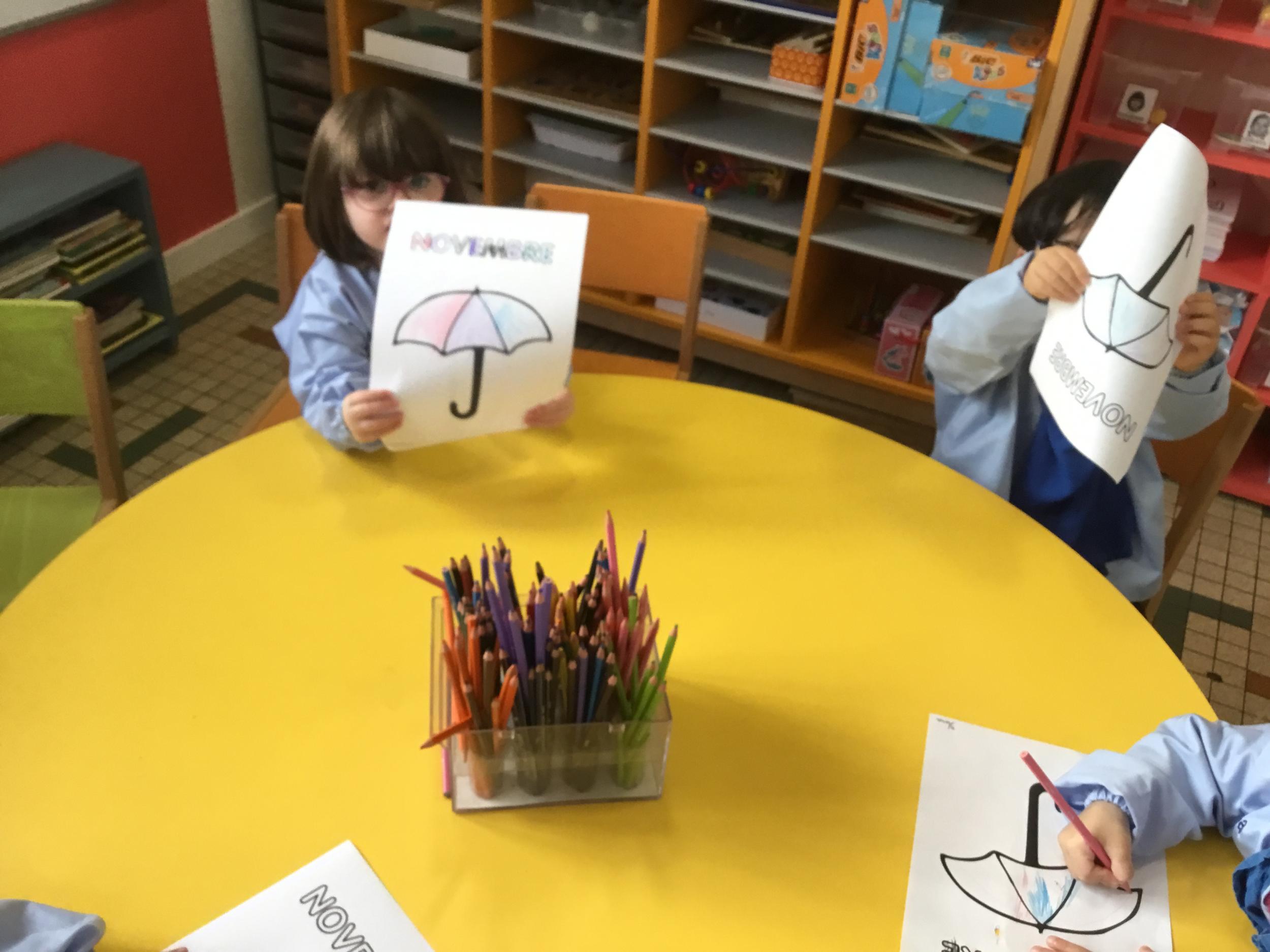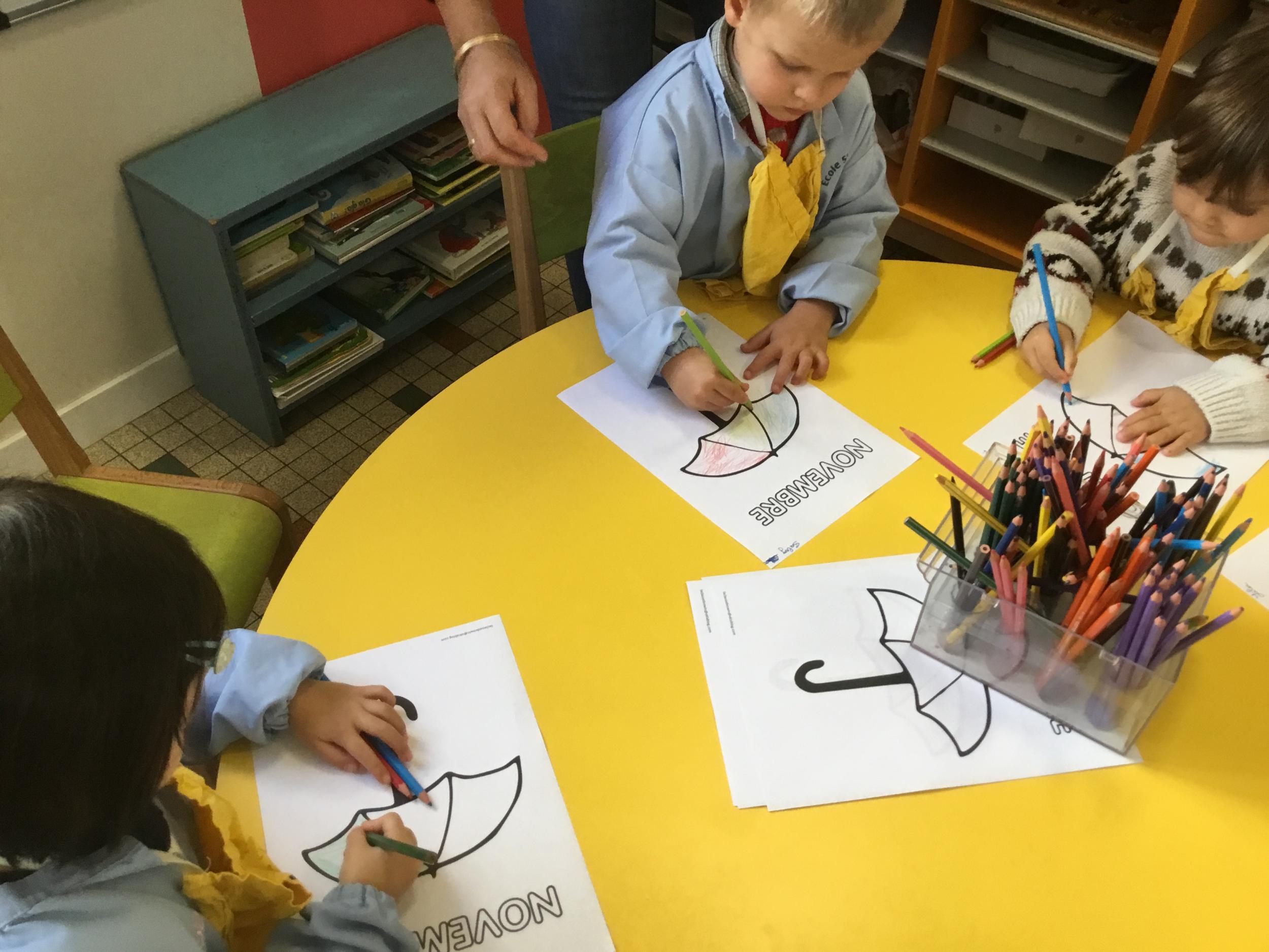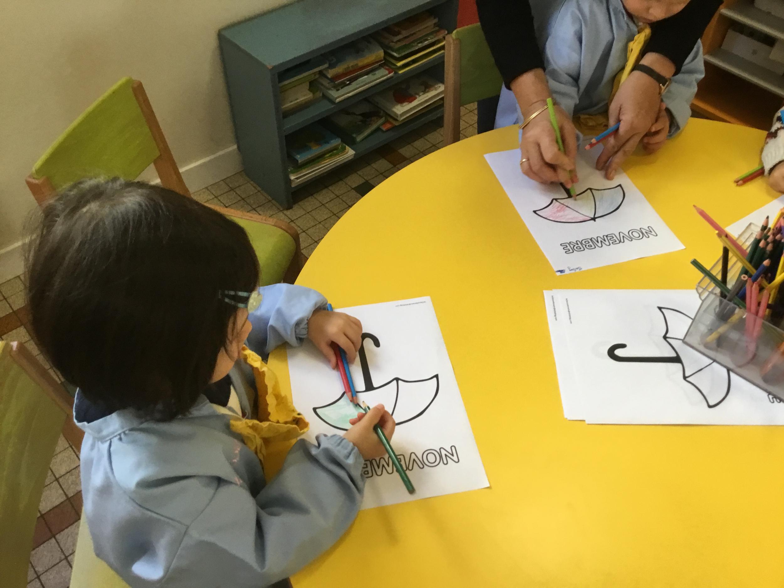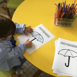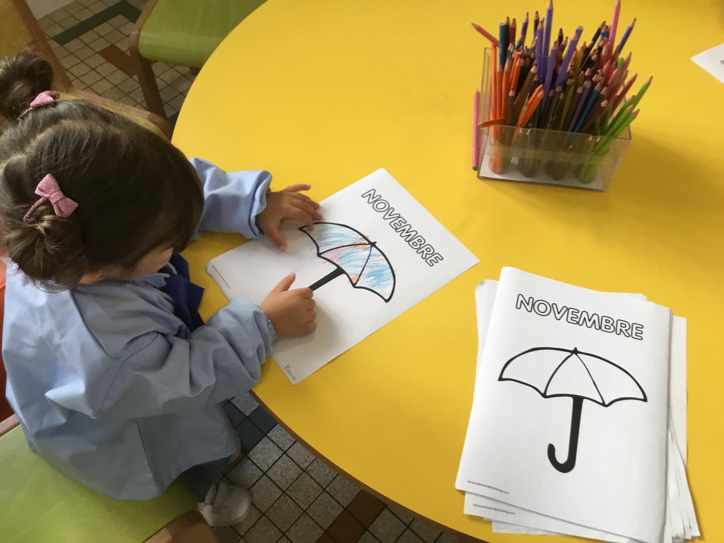 La fiche du mois de novembre: colorier le parapluie de trois couleurs différentes