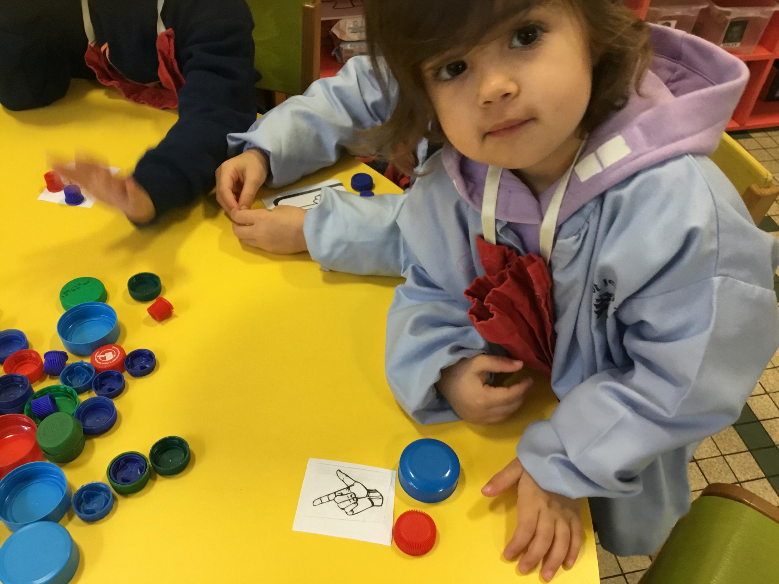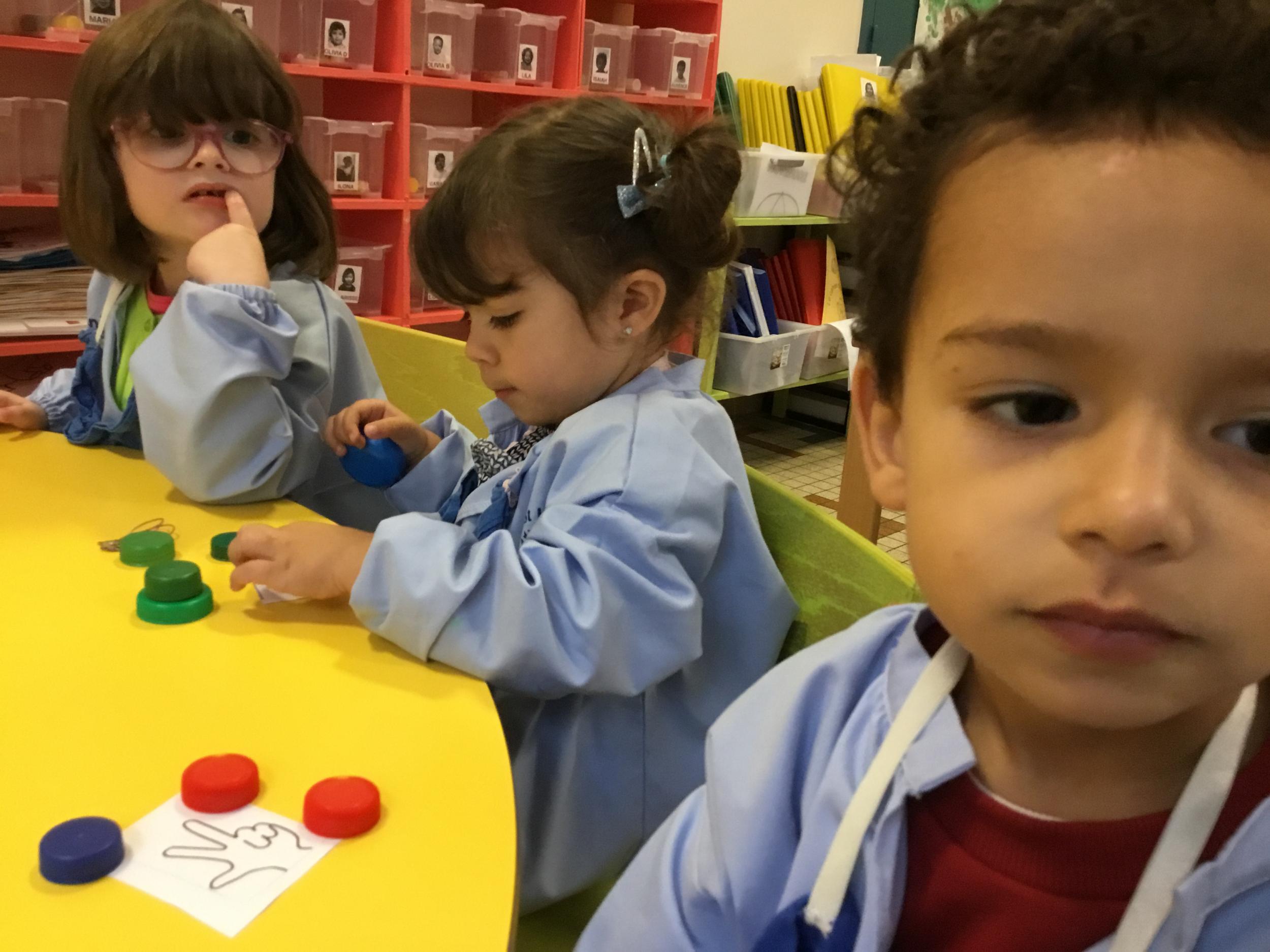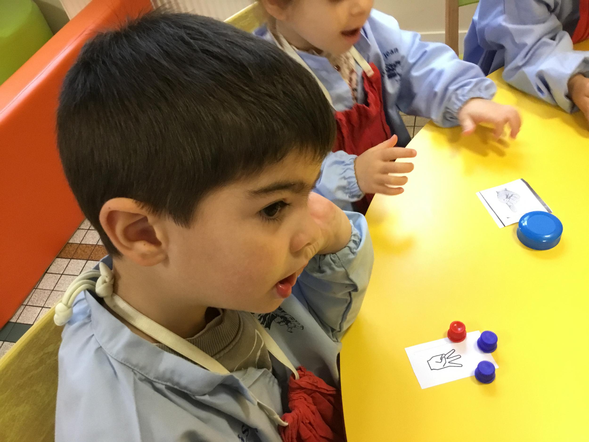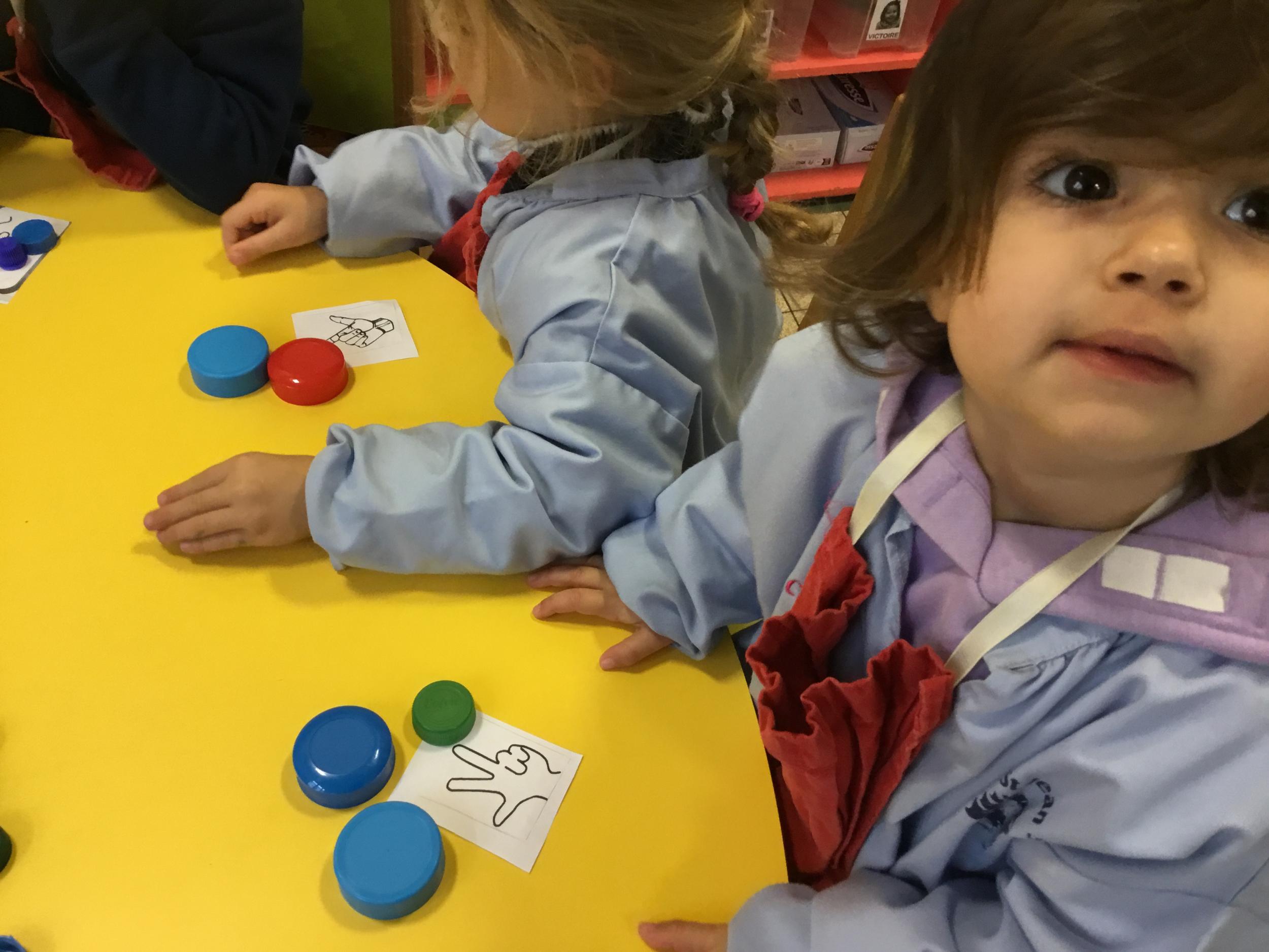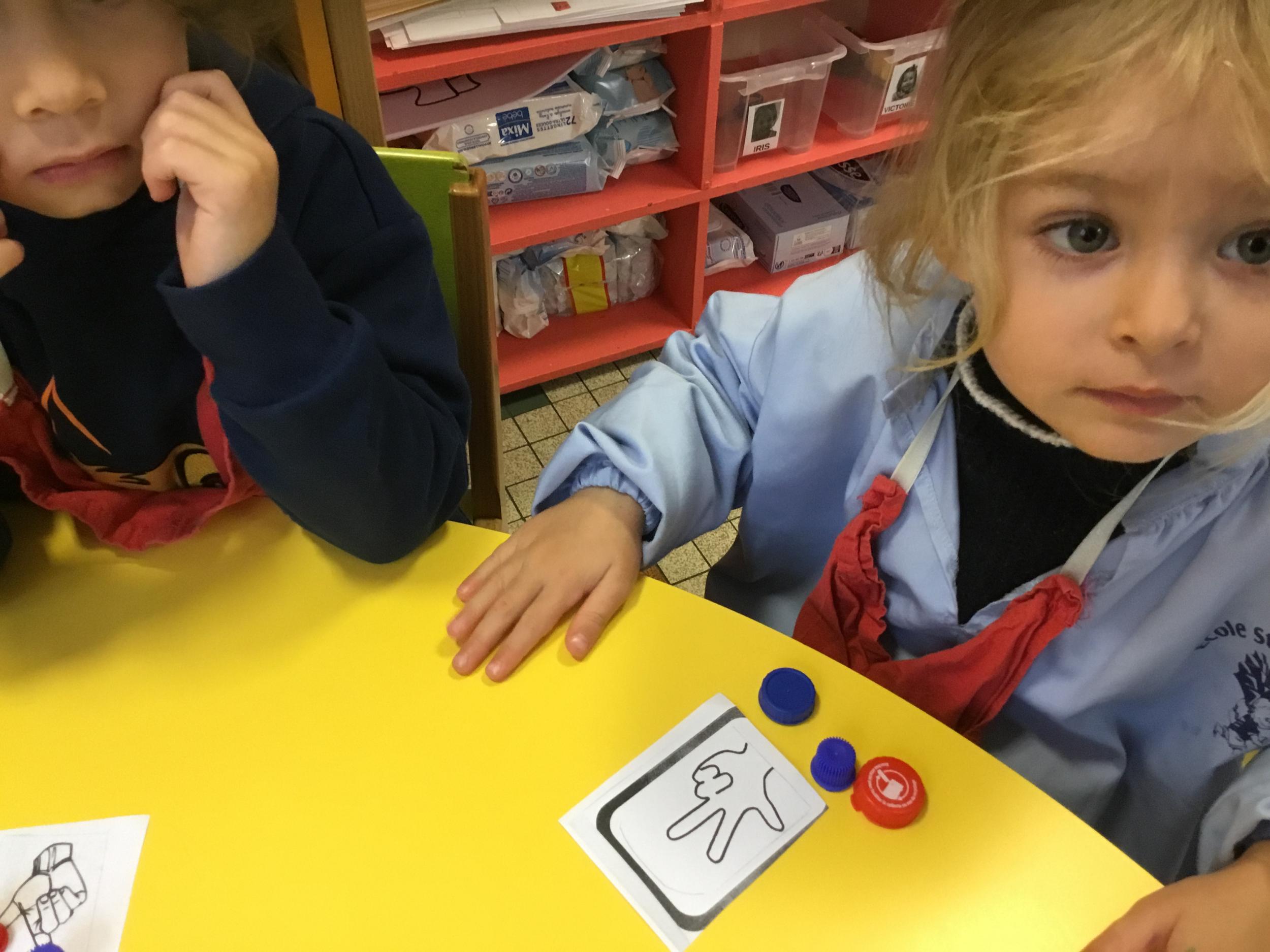 Le lendemain un autre atelier à été proposé toujours pour apprendre à compter. La maîtresse distribuait une carte à chaque enfant sur laquelle était dessinée une collection de doigts. Elle demandait à chaque enfant de choisir « comme ça » de bouchons . Puis dans un deuxième temps, ensemble les enfants vérifiaient que chacun ait pris le bon nombre de bouchons. Enfin chaque enfant devait compter et annonçait le nombre de bouchons correspondant à sa carte.