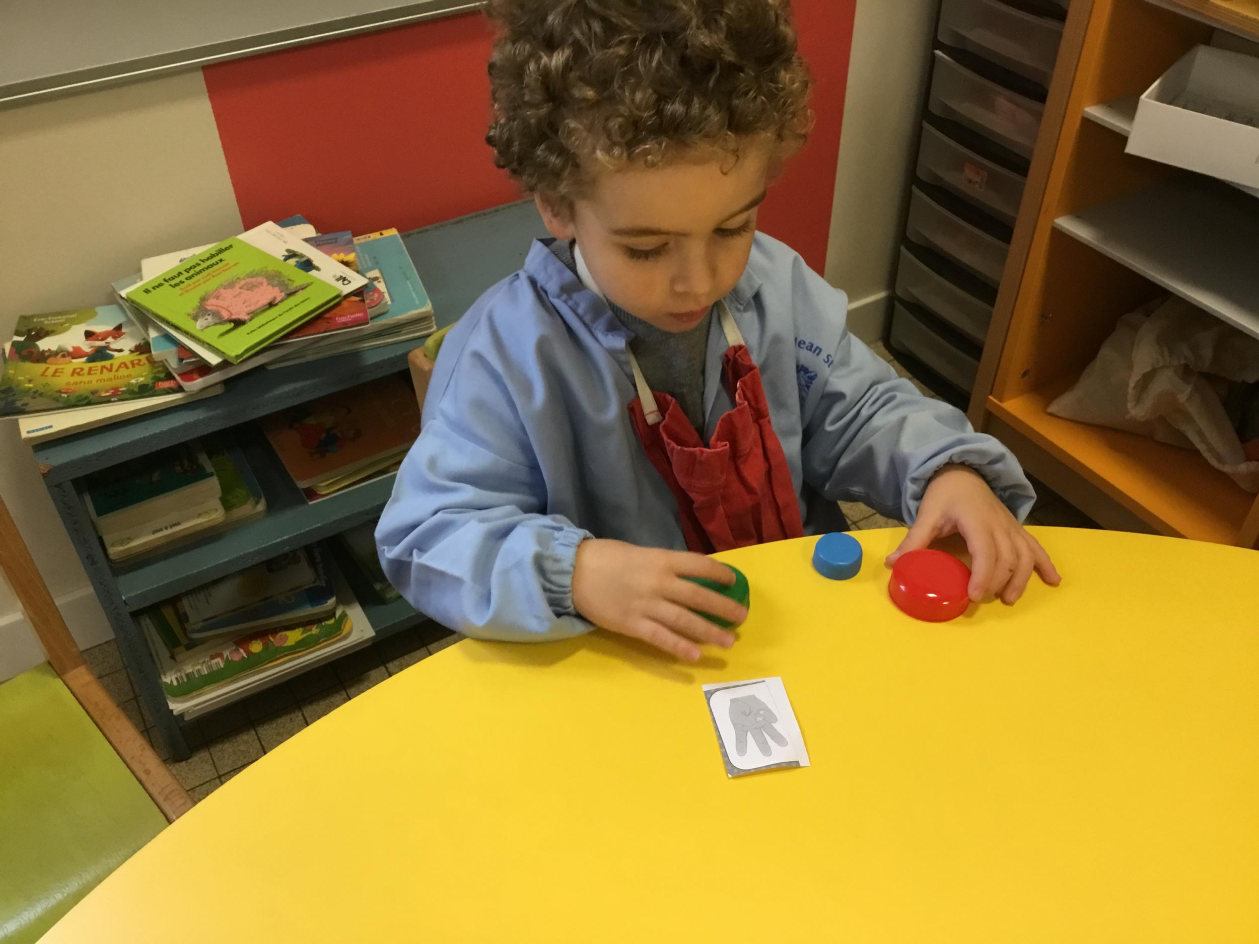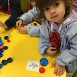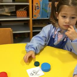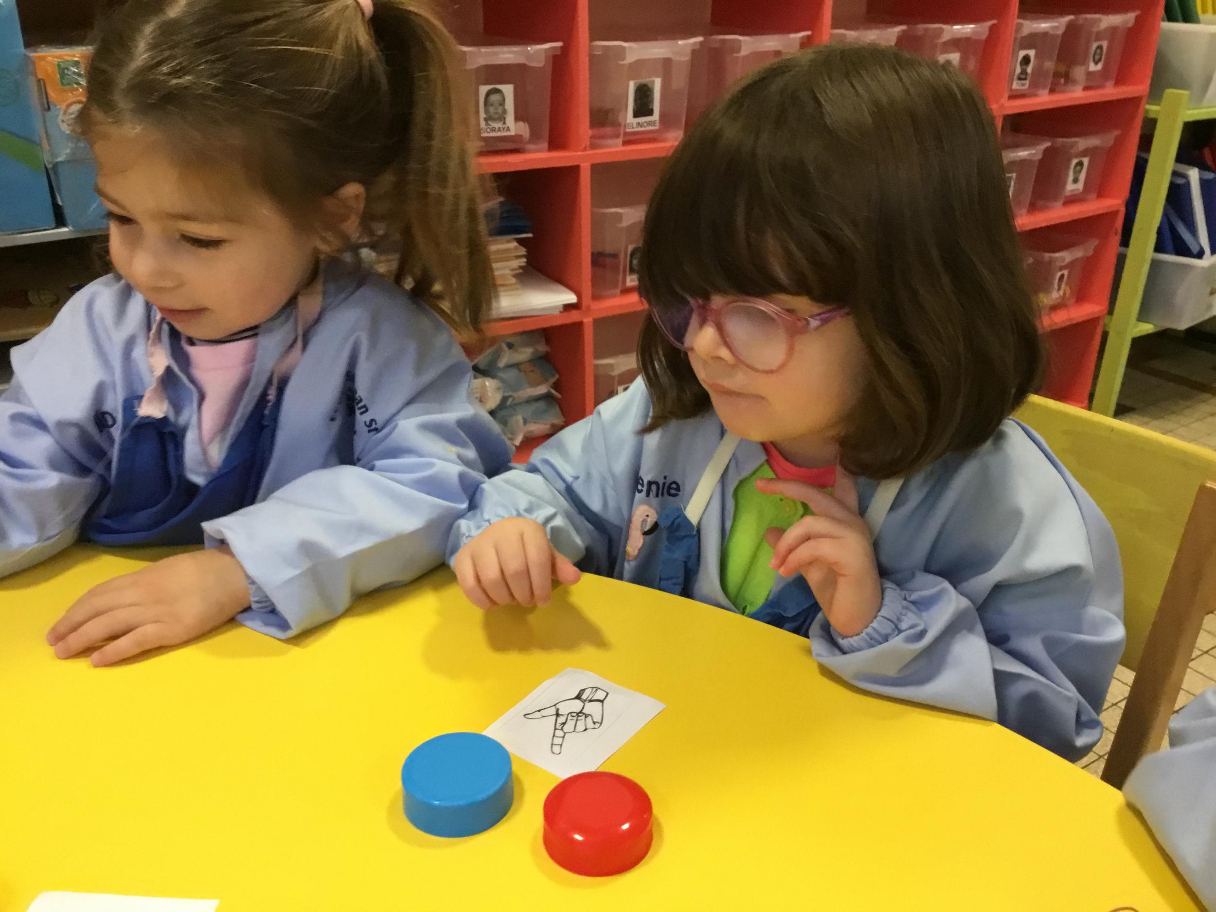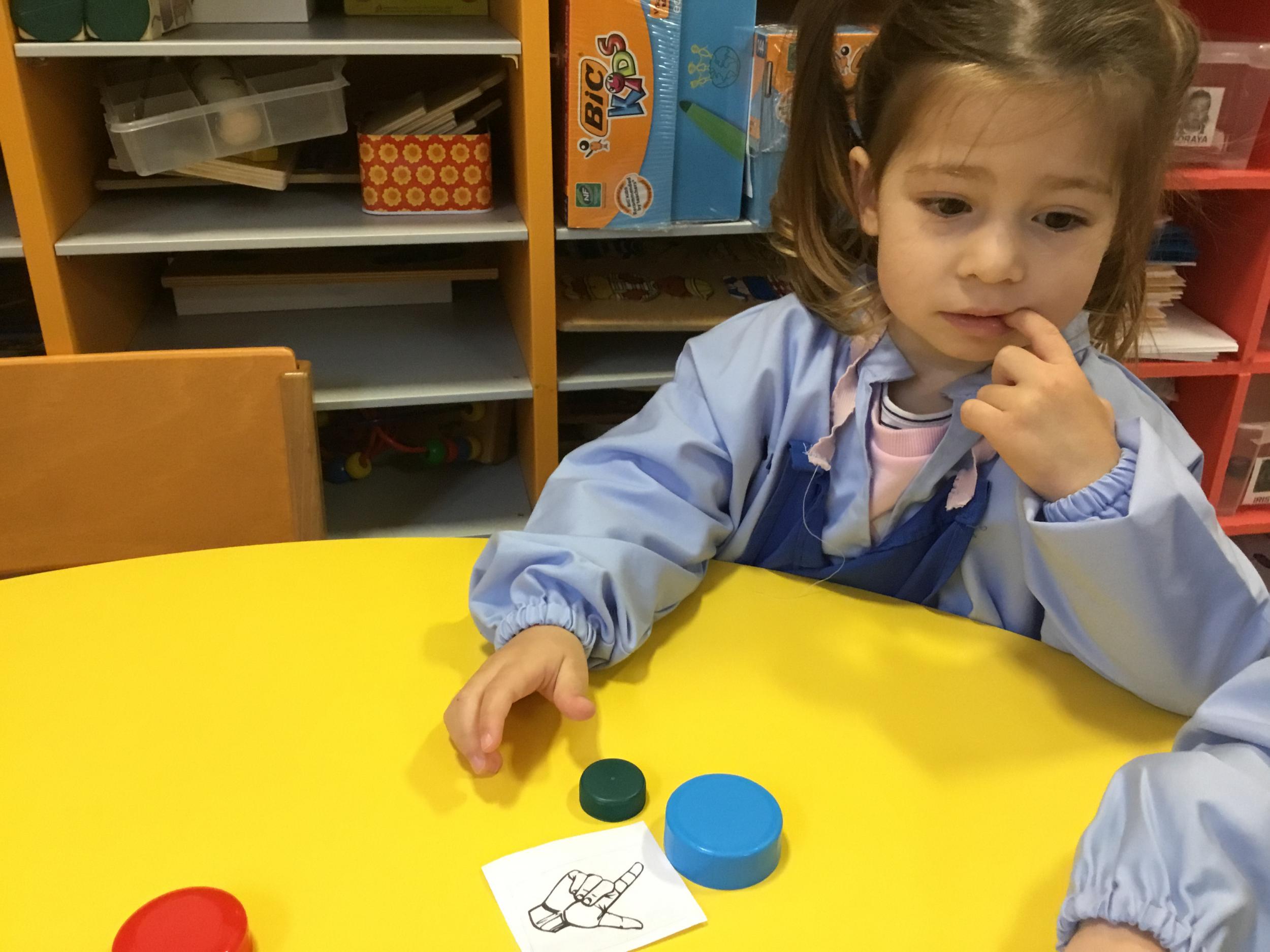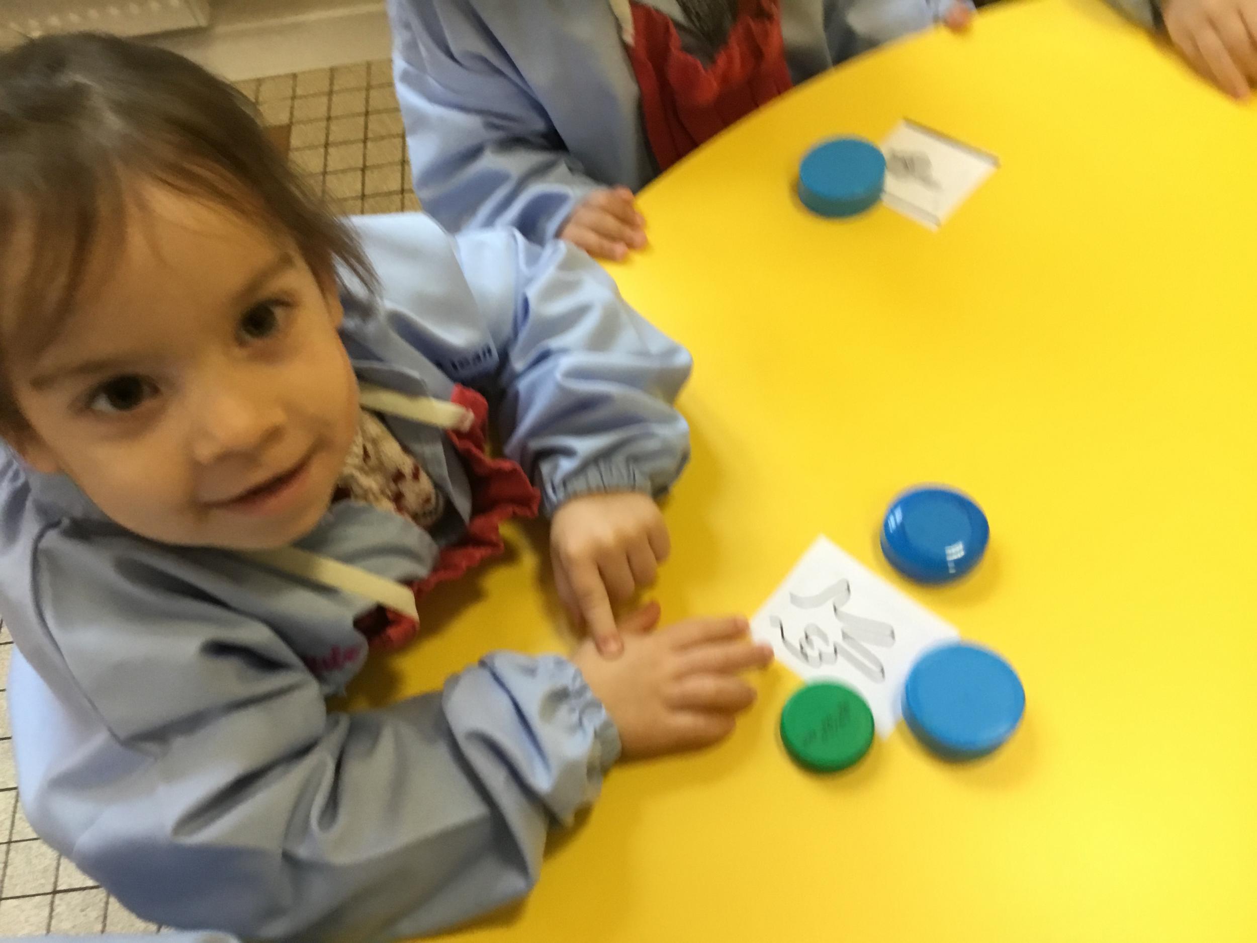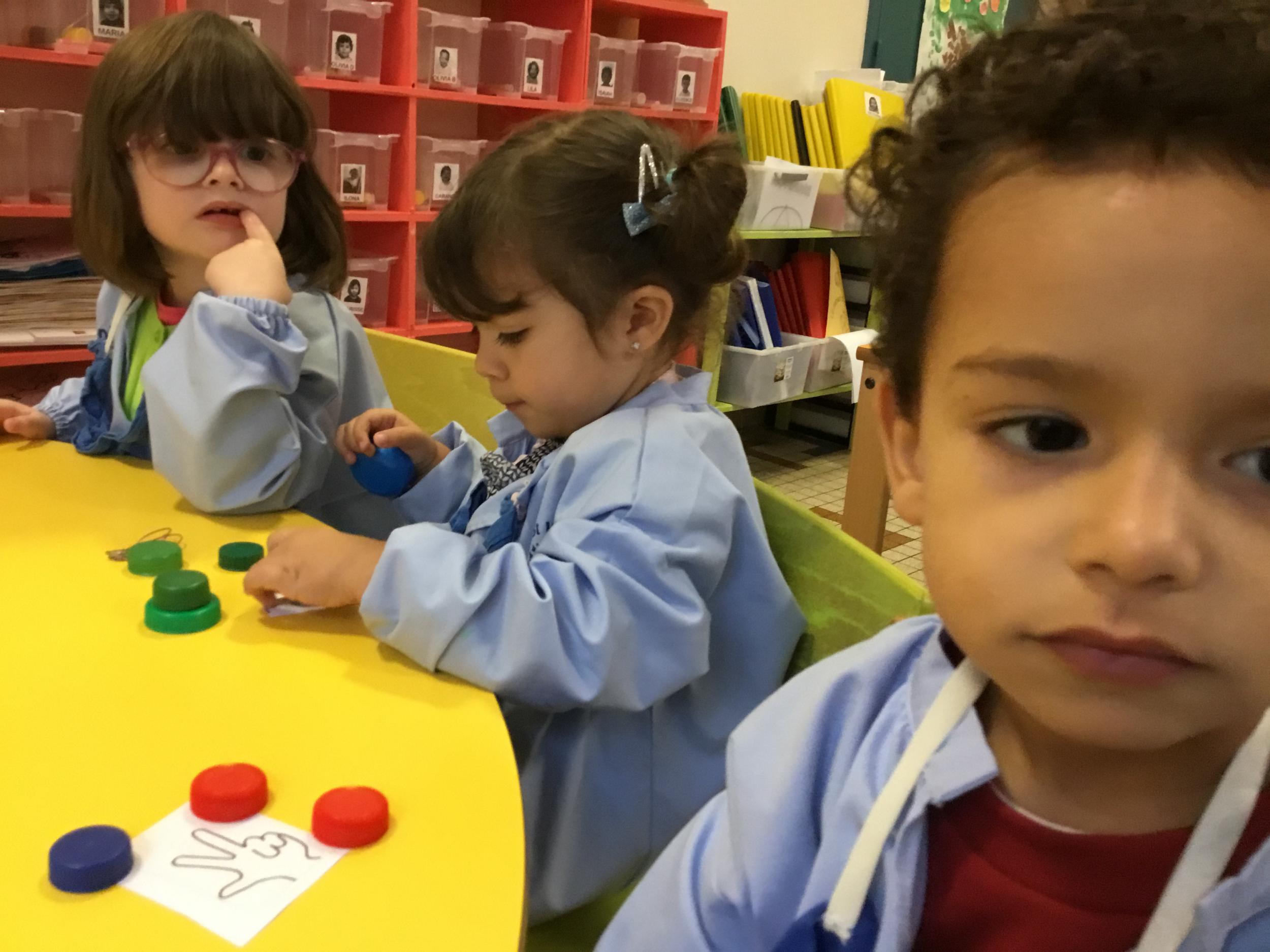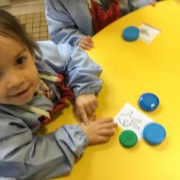 Le lendemain un autre atelier à été proposé toujours pour apprendre à compter. La maîtresse distribuait une carte à chaque enfant sur laquelle était dessinée une collection de doigts. Elle demandait à chaque enfant de choisir « comme ça » de bouchons . Puis dans un deuxième temps, ensemble les enfants vérifiaient que chacun ait pris le bon nombre de bouchons. Enfin chaque enfant devait compter et annonçait le nombre de bouchons correspondant à sa carte.