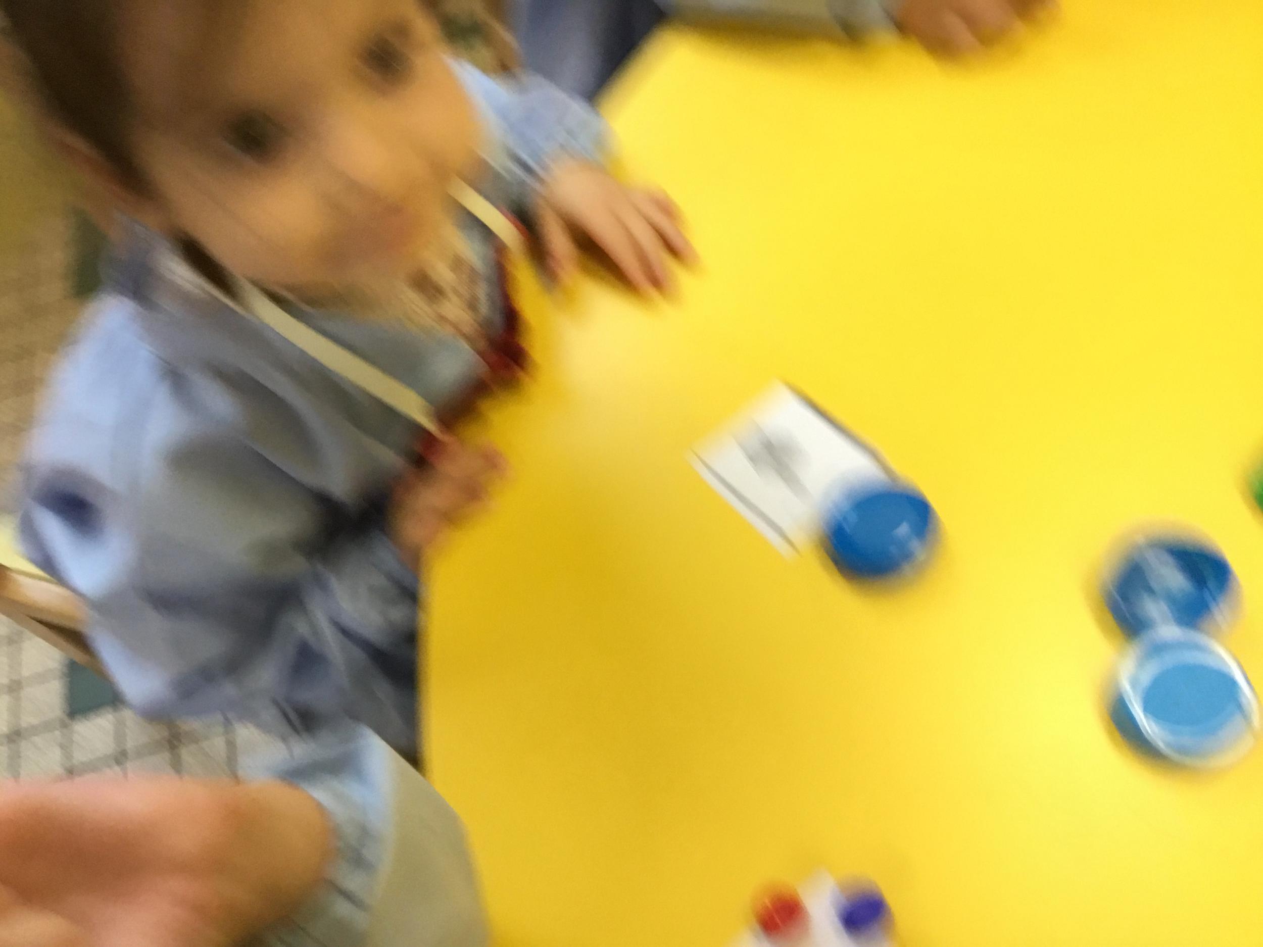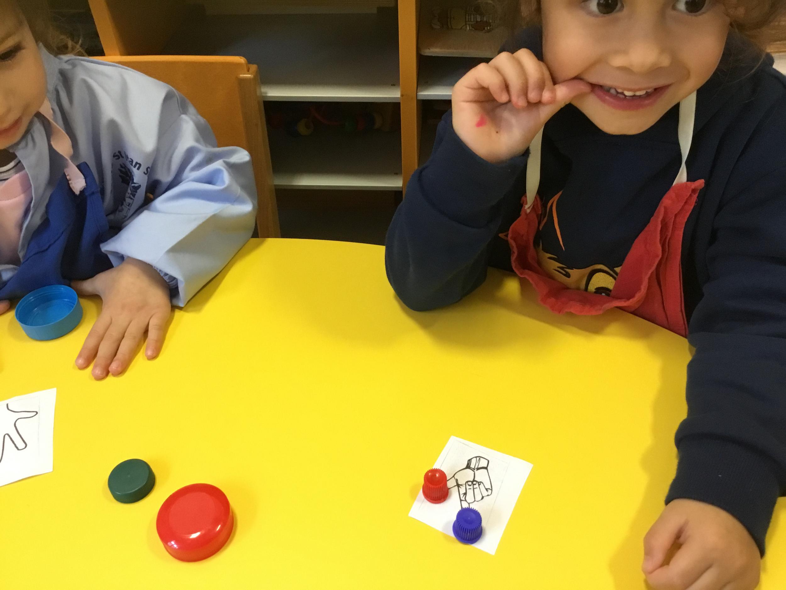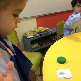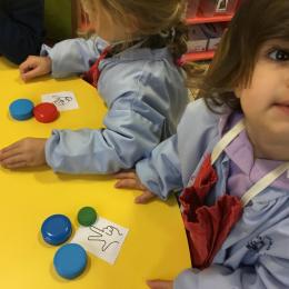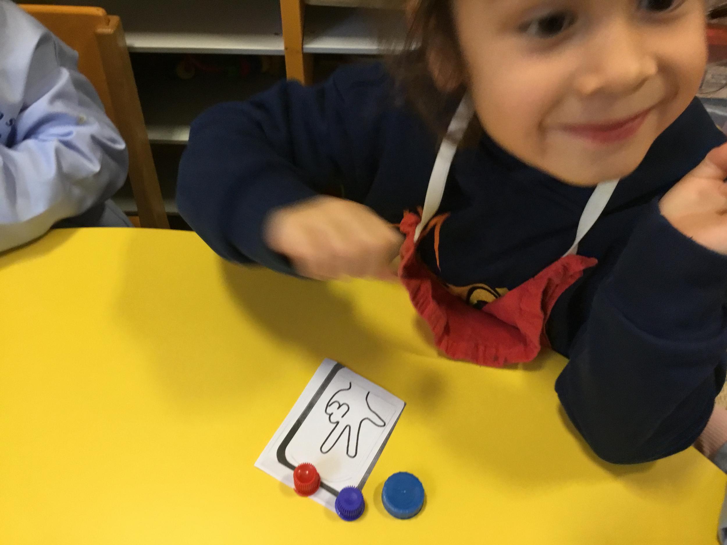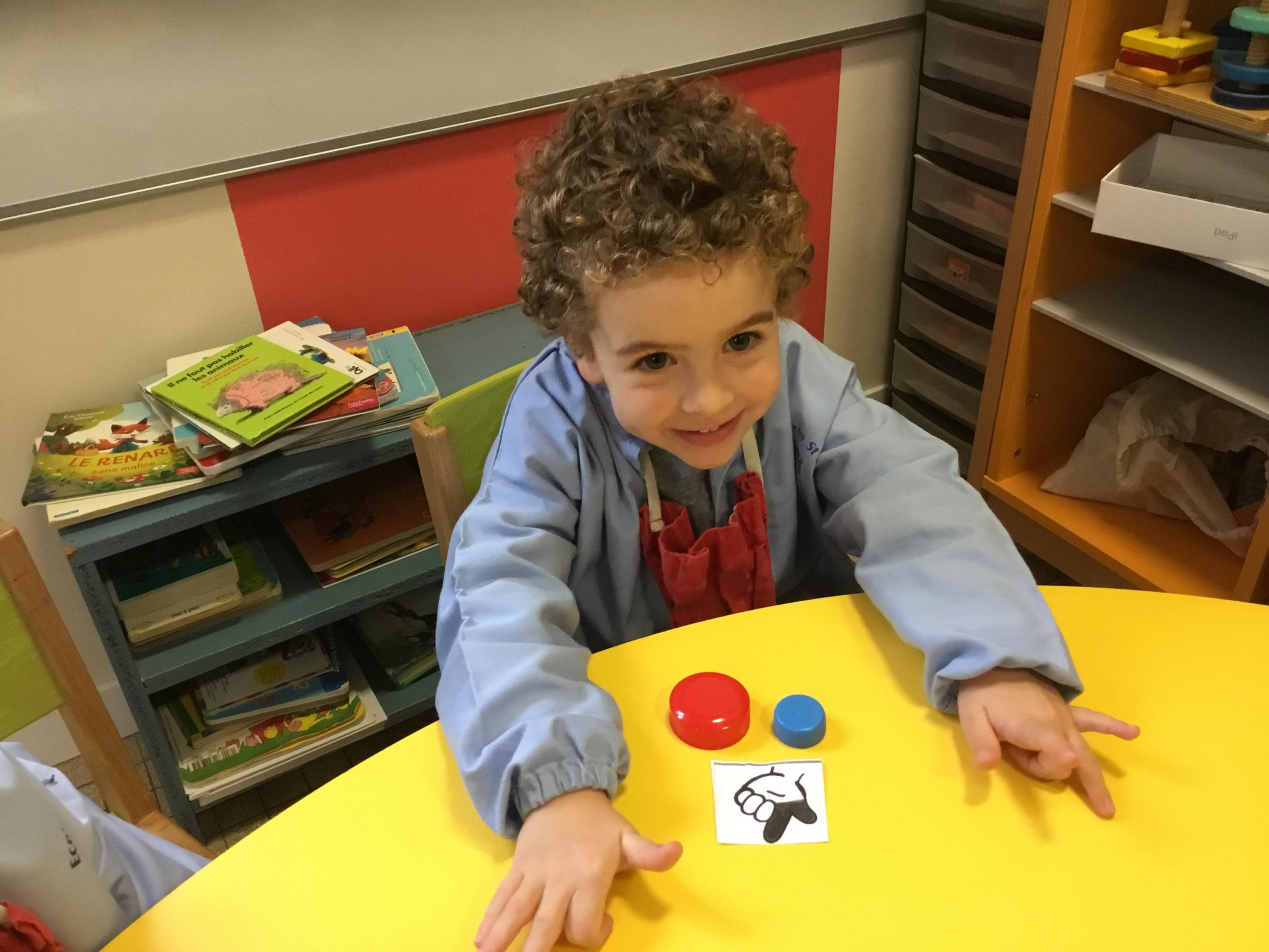 Le lendemain un autre atelier à été proposé toujours pour apprendre à compter. La maîtresse distribuait une carte à chaque enfant sur laquelle était dessinée une collection de doigts. Elle demandait à chaque enfant de choisir « comme ça » de bouchons . Puis dans un deuxième temps, ensemble les enfants vérifiaient que chacun ait pris le bon nombre de bouchons. Enfin chaque enfant devait compter et annonçait le nombre de bouchons correspondant à sa carte.