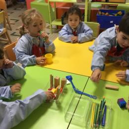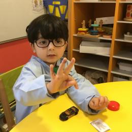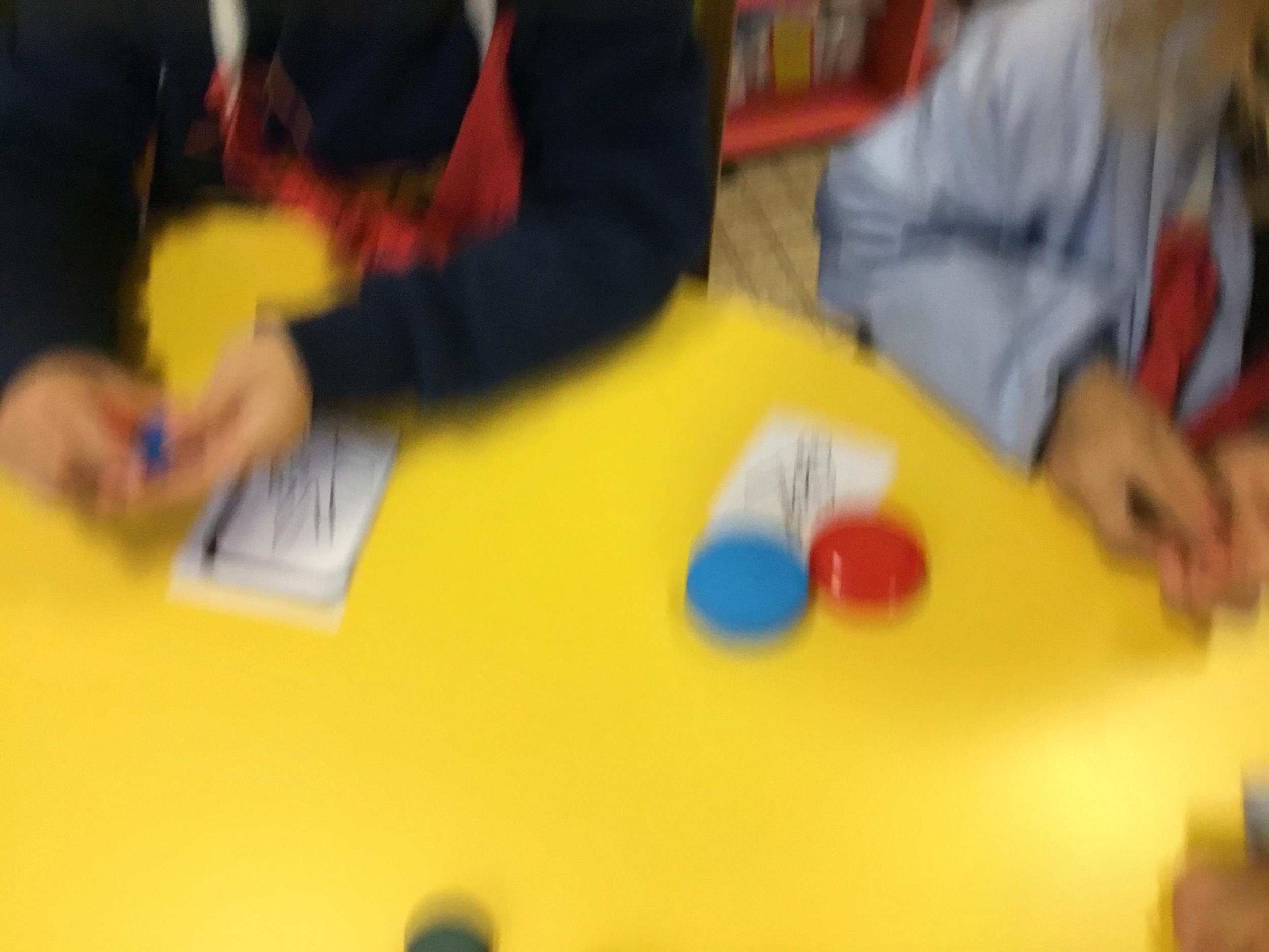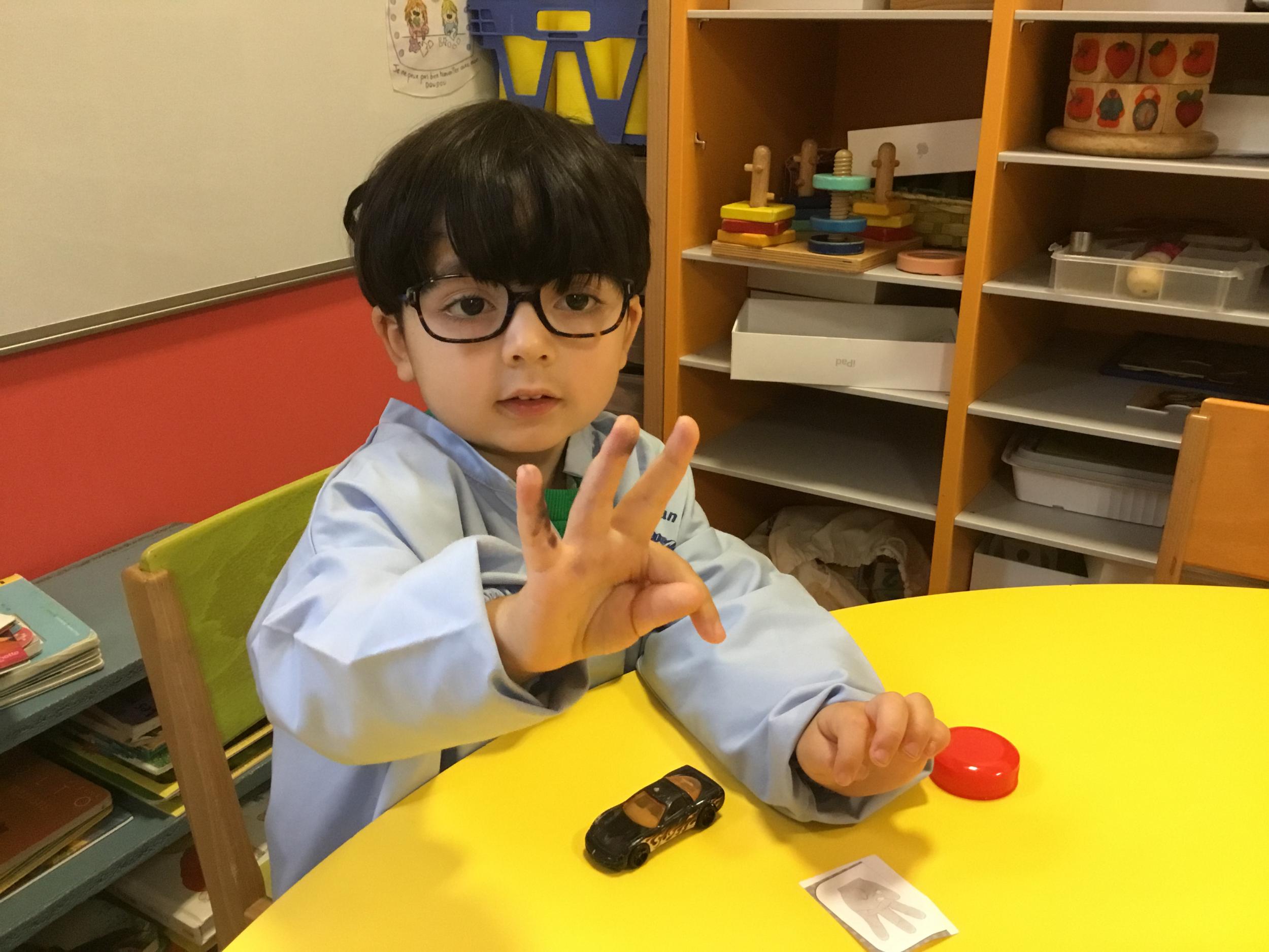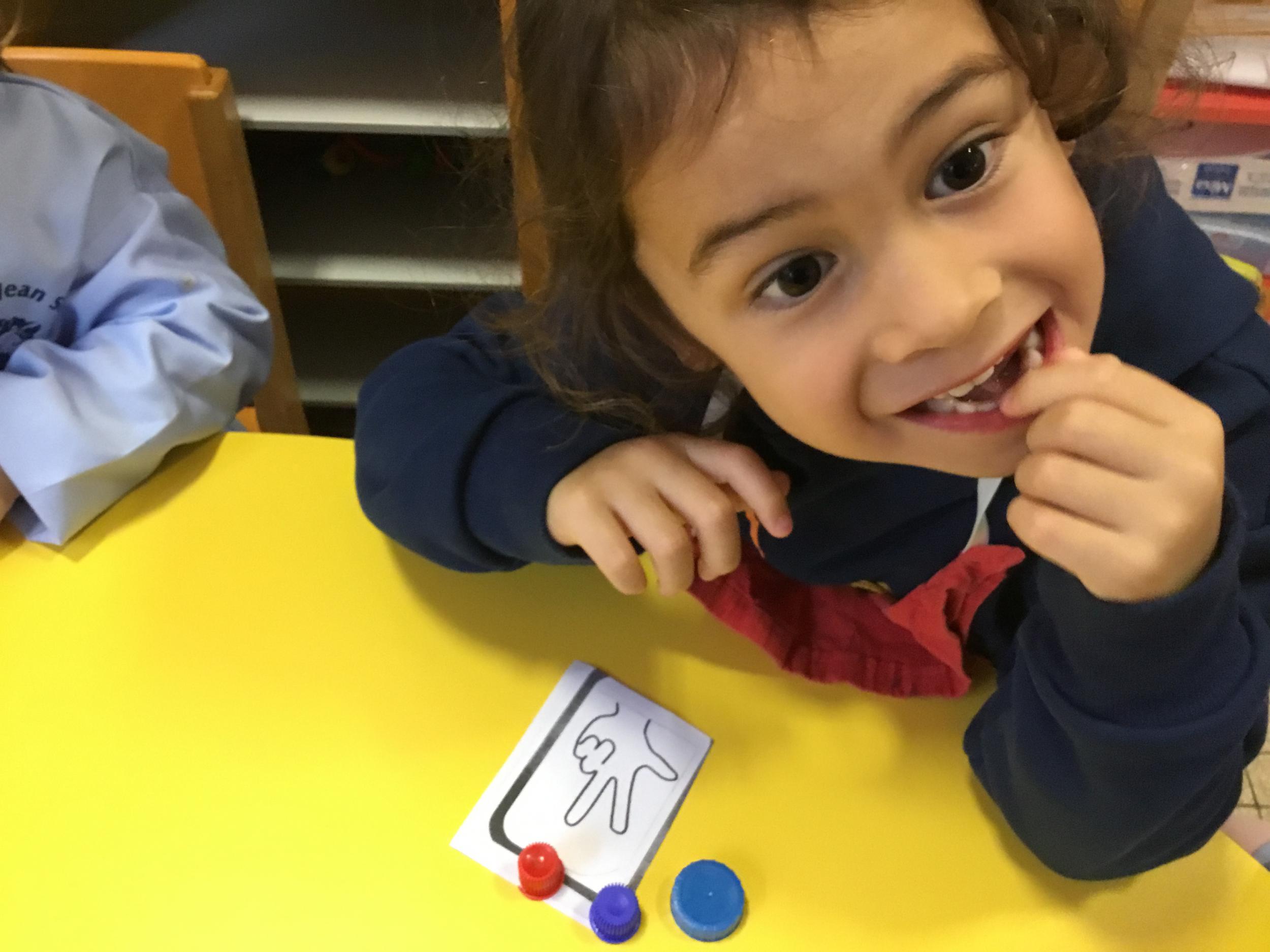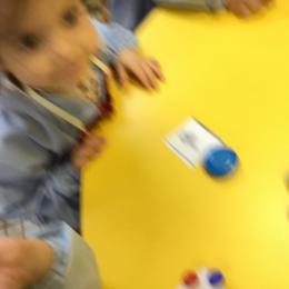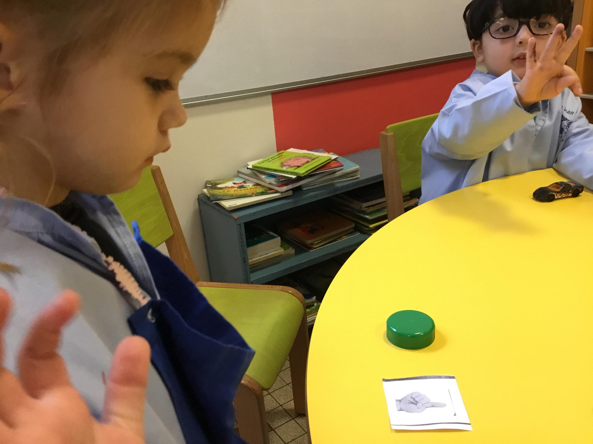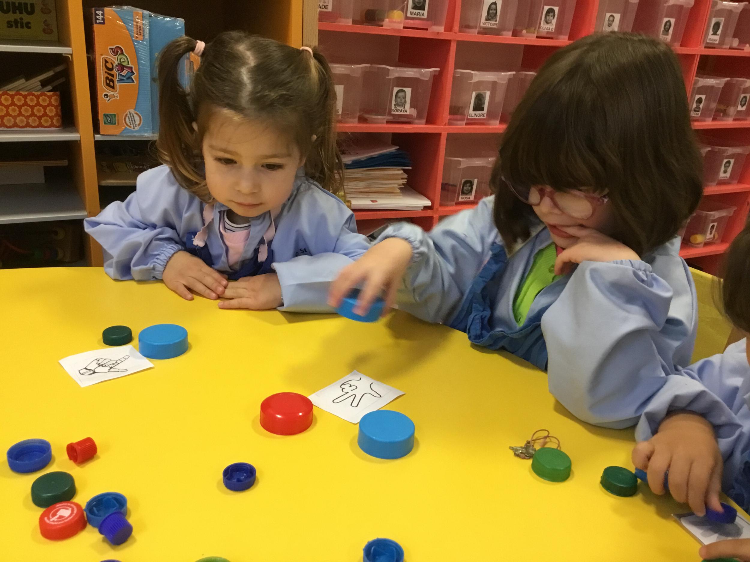 Le lendemain un autre atelier à été proposé toujours pour apprendre à compter. La maîtresse distribuait une carte à chaque enfant sur laquelle était dessinée une collection de doigts. Elle demandait à chaque enfant de choisir « comme ça » de bouchons . Puis dans un deuxième temps, ensemble les enfants vérifiaient que chacun ait pris le bon nombre de bouchons. Enfin chaque enfant devait compter et annonçait le nombre de bouchons correspondant à sa carte.