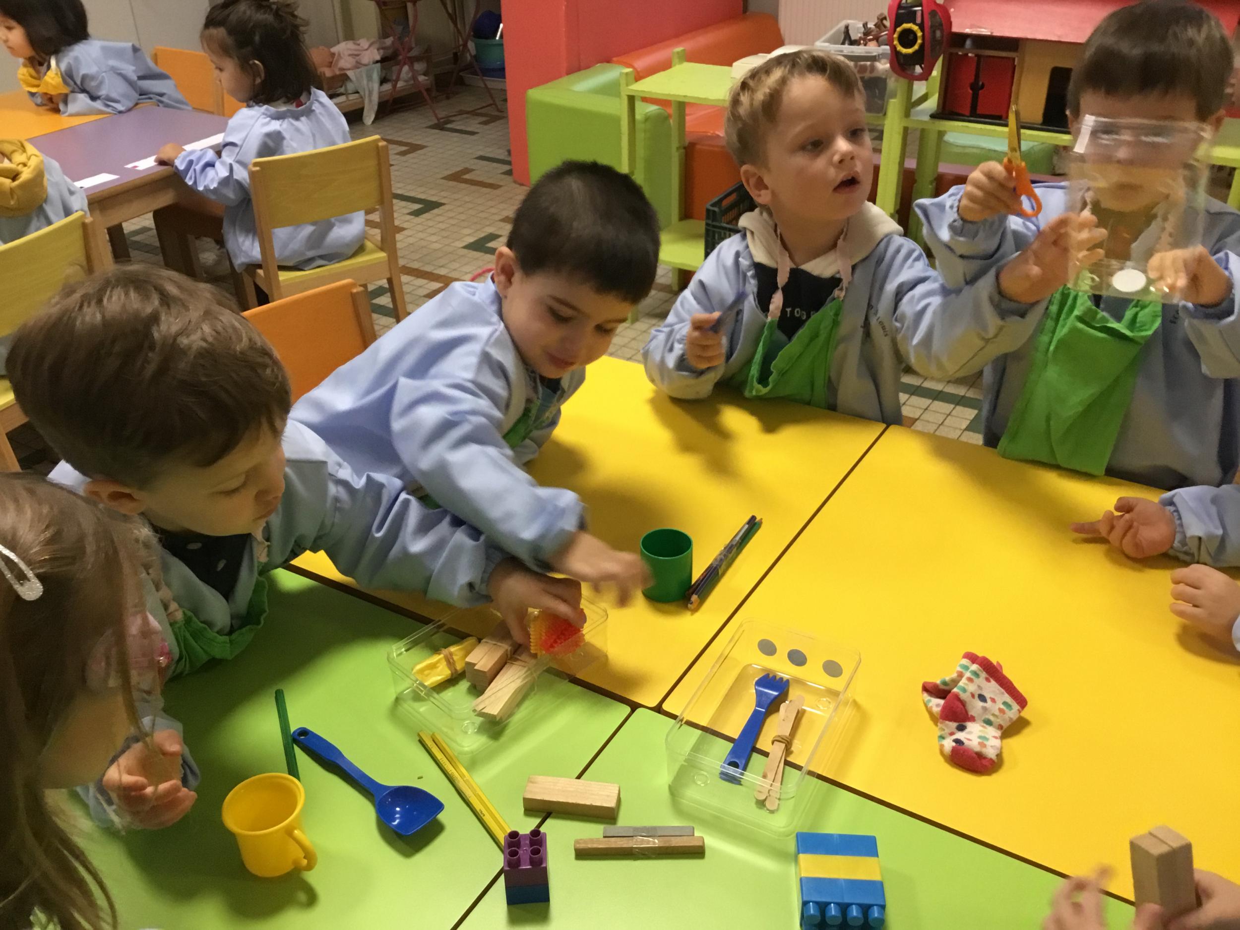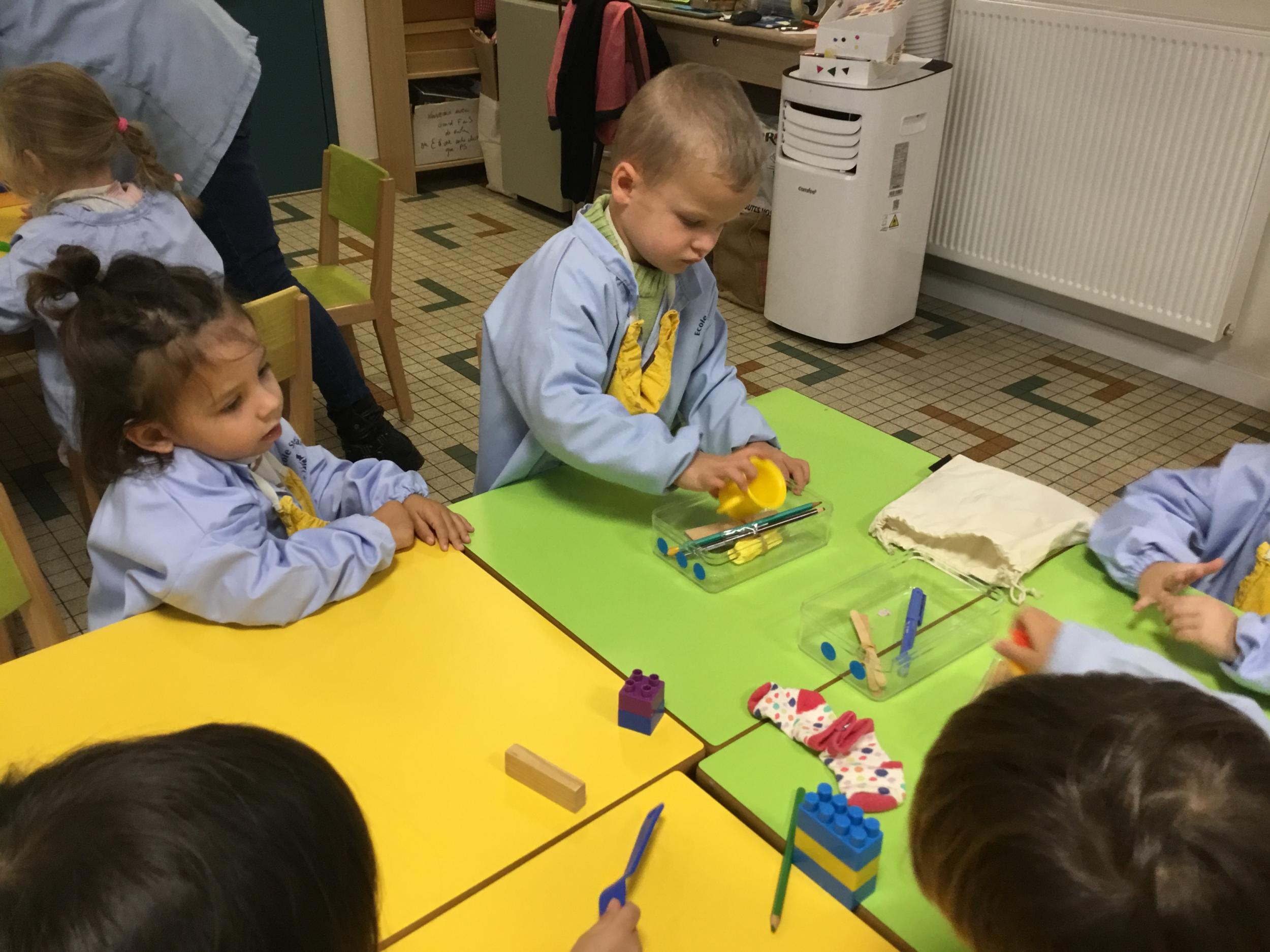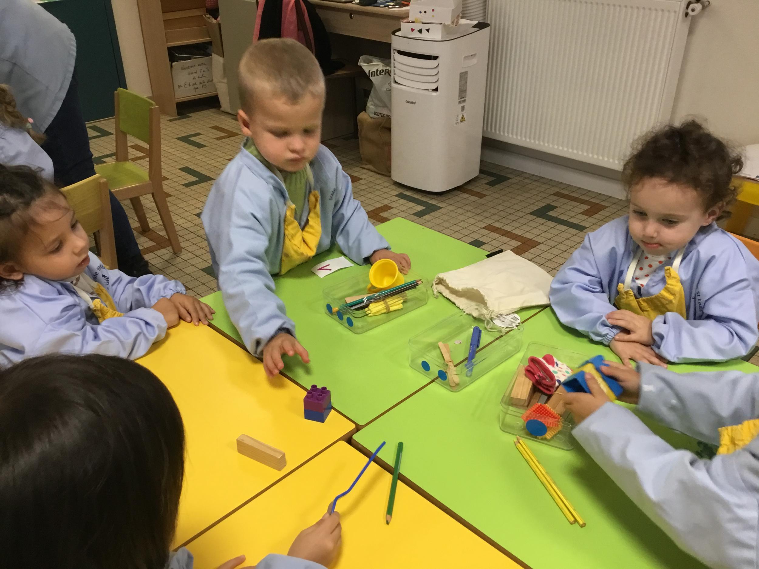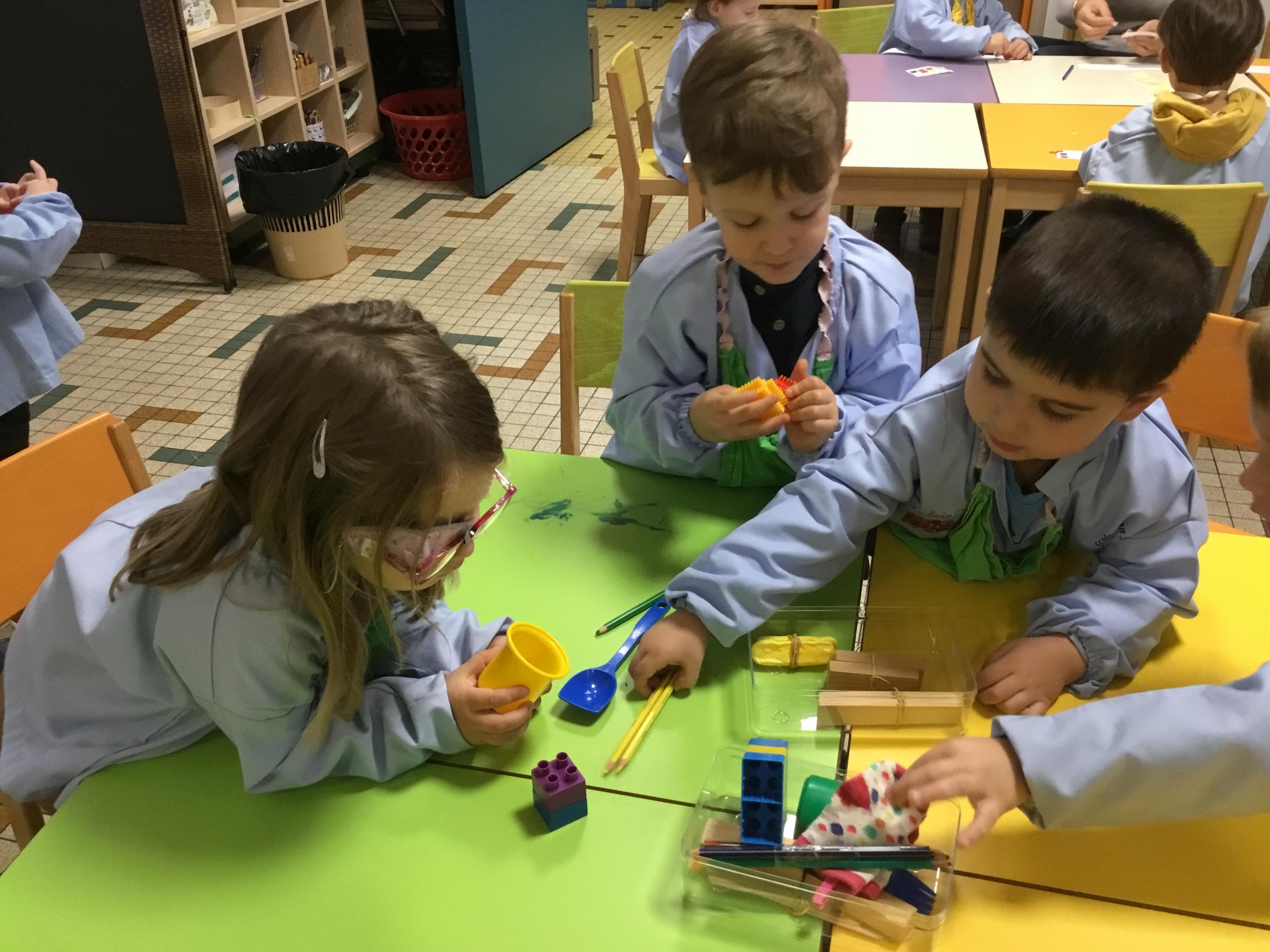 La maîtresse a proposé un atelier pour résoudre un problème, catégoriser et apprendre à compter. Elle a posé sur la table divers objets et 3 boîtes. Puis elle a demandé aux enfants de ranger tous les objets dans les 3 boîtes en trouvant un critère de rangement . Elle a rappelé que tous les objets doivent trouver une place .