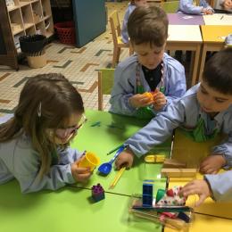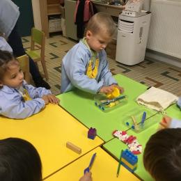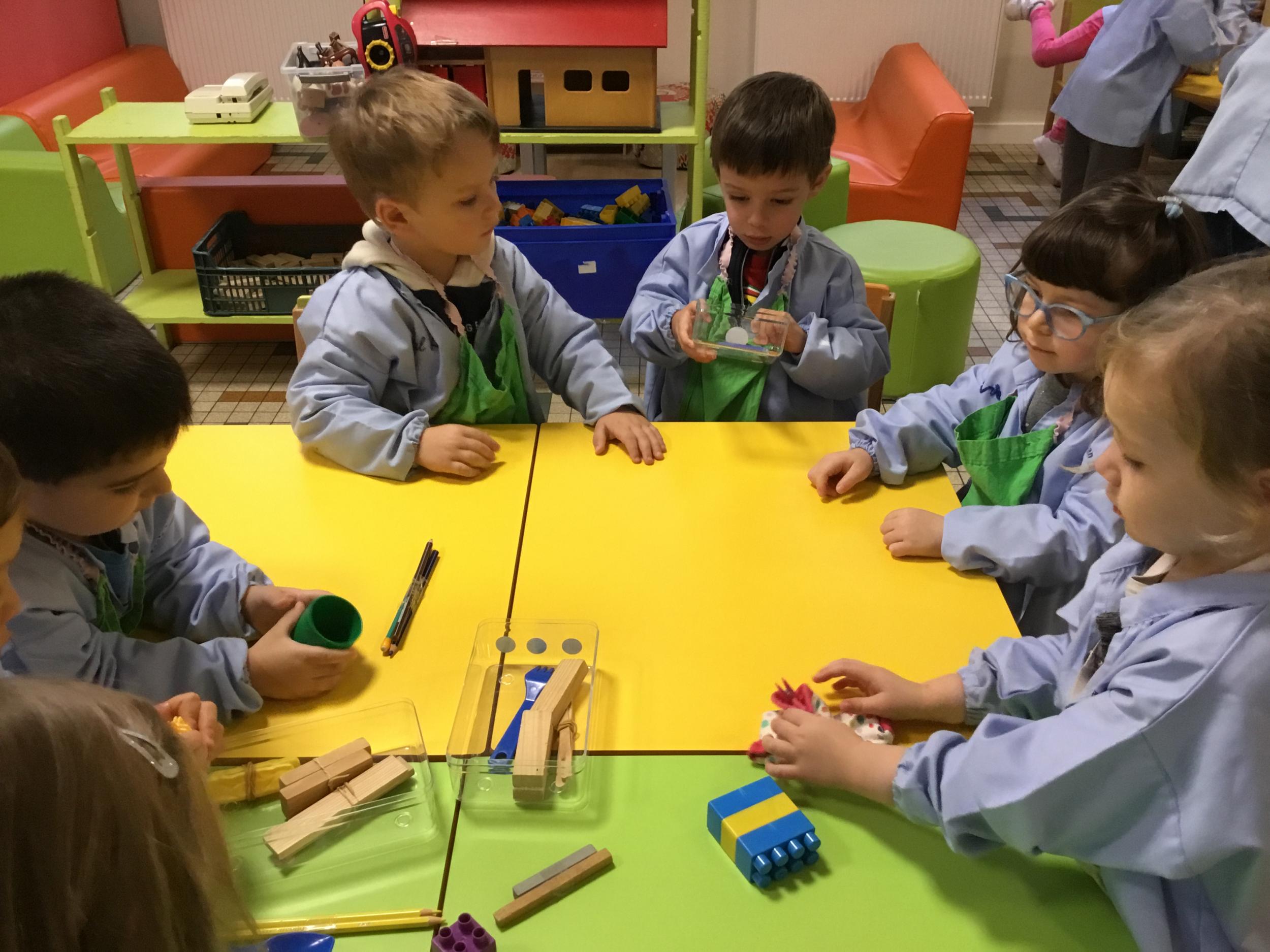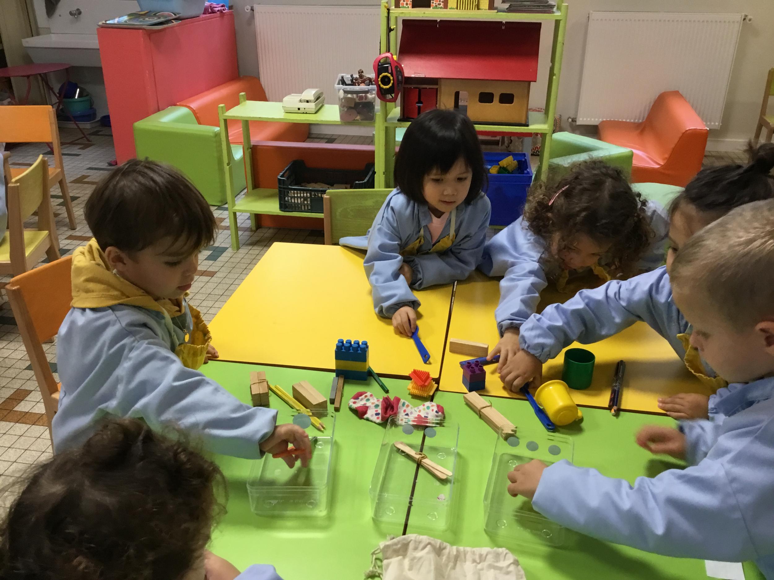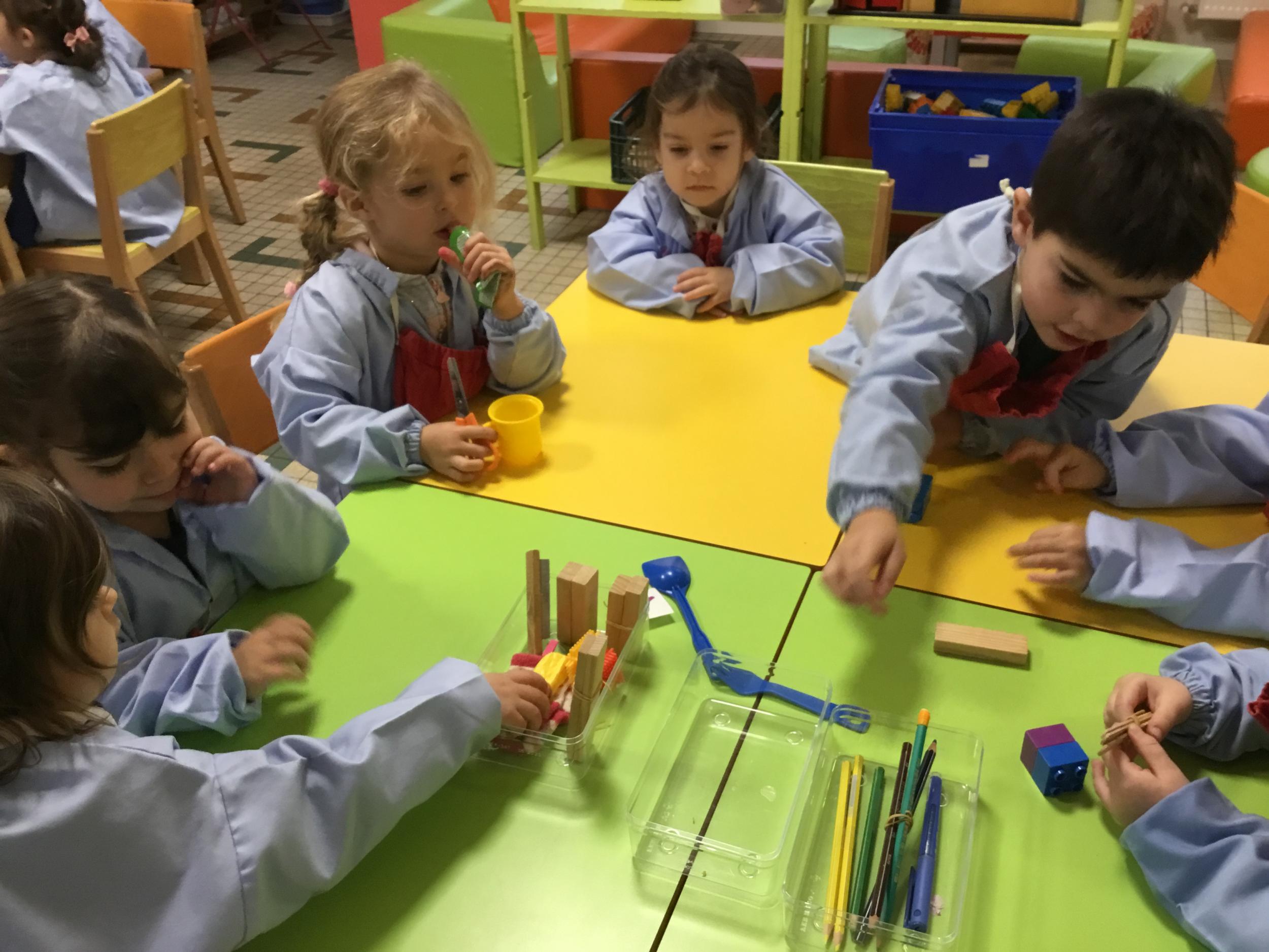 La maîtresse a proposé un atelier pour résoudre un problème, catégoriser et apprendre à compter. Elle a posé sur la table divers objets et 3 boîtes. Puis elle a demandé aux enfants de ranger tous les objets dans les 3 boîtes en trouvant un critère de rangement . Elle a rappelé que tous les objets doivent trouver une place .