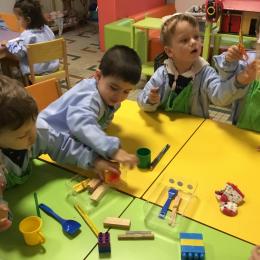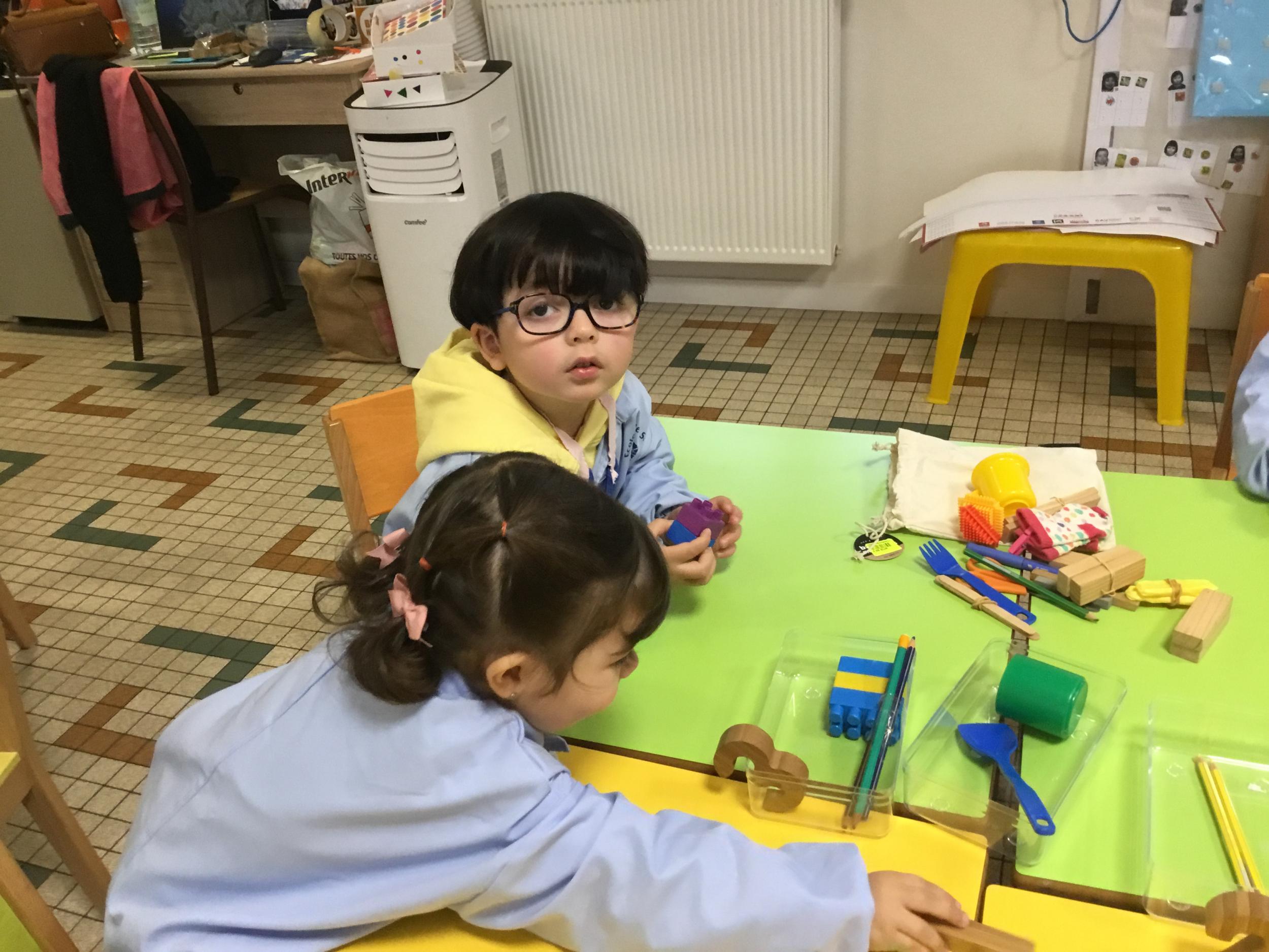 Les élèves ont fait des propositions : par exemple tous les objets en bois ensemble, tous les objets de la dînette ensemble ensemble, tous les outils de l’école ensemble … mais ici il restait toujours un objet qui ne trouvait pas sa place : ici les chaussettes 😩