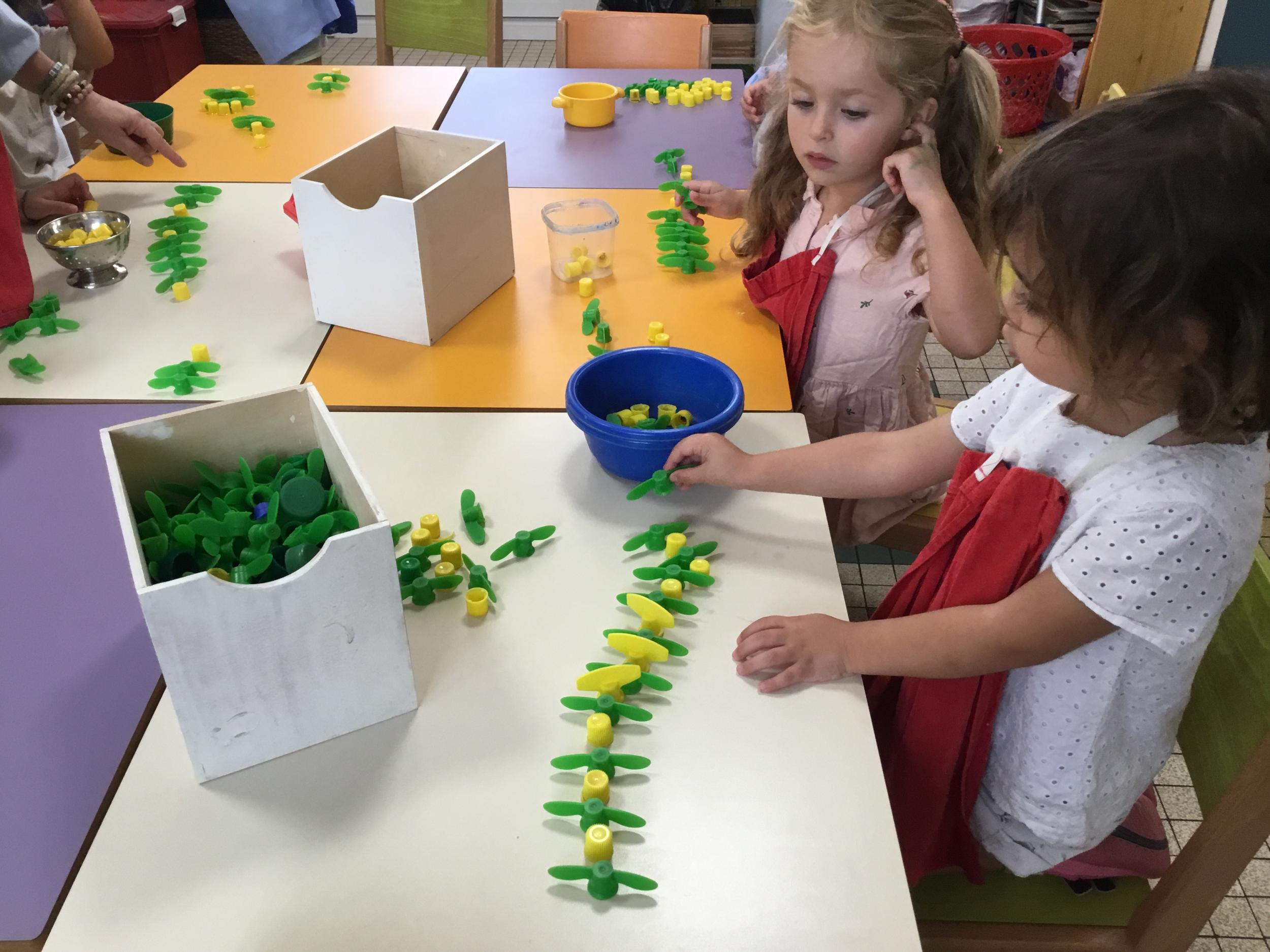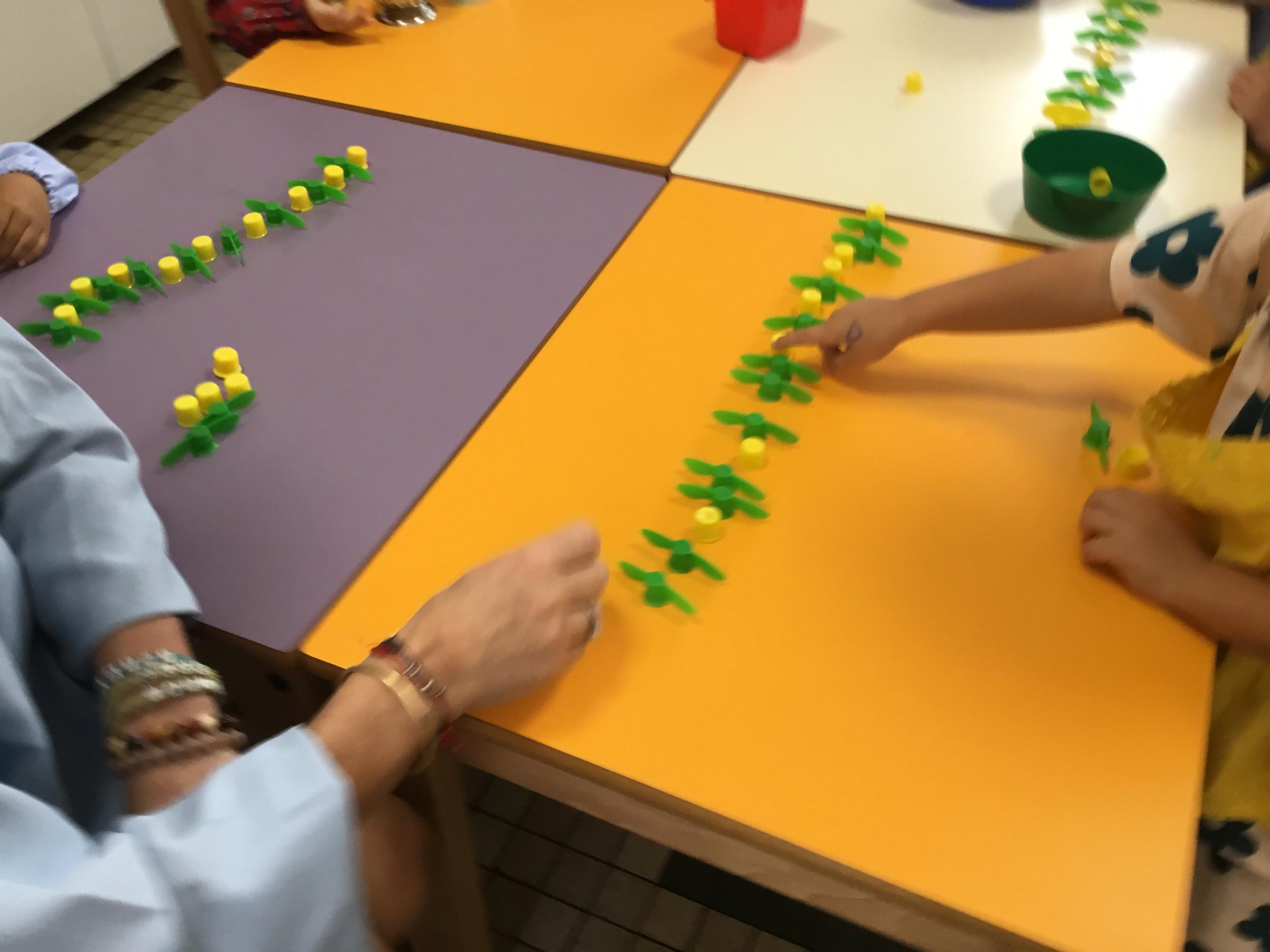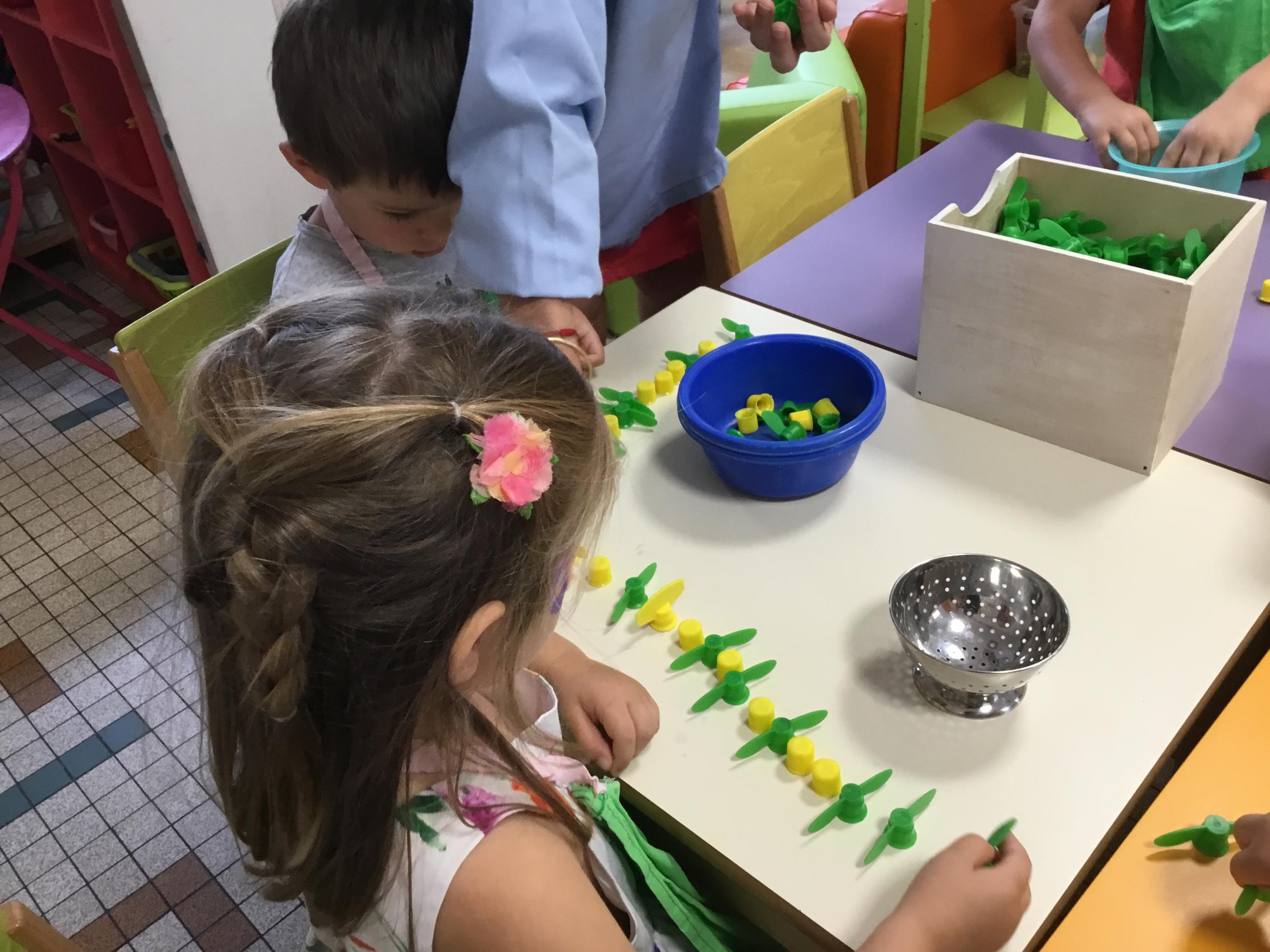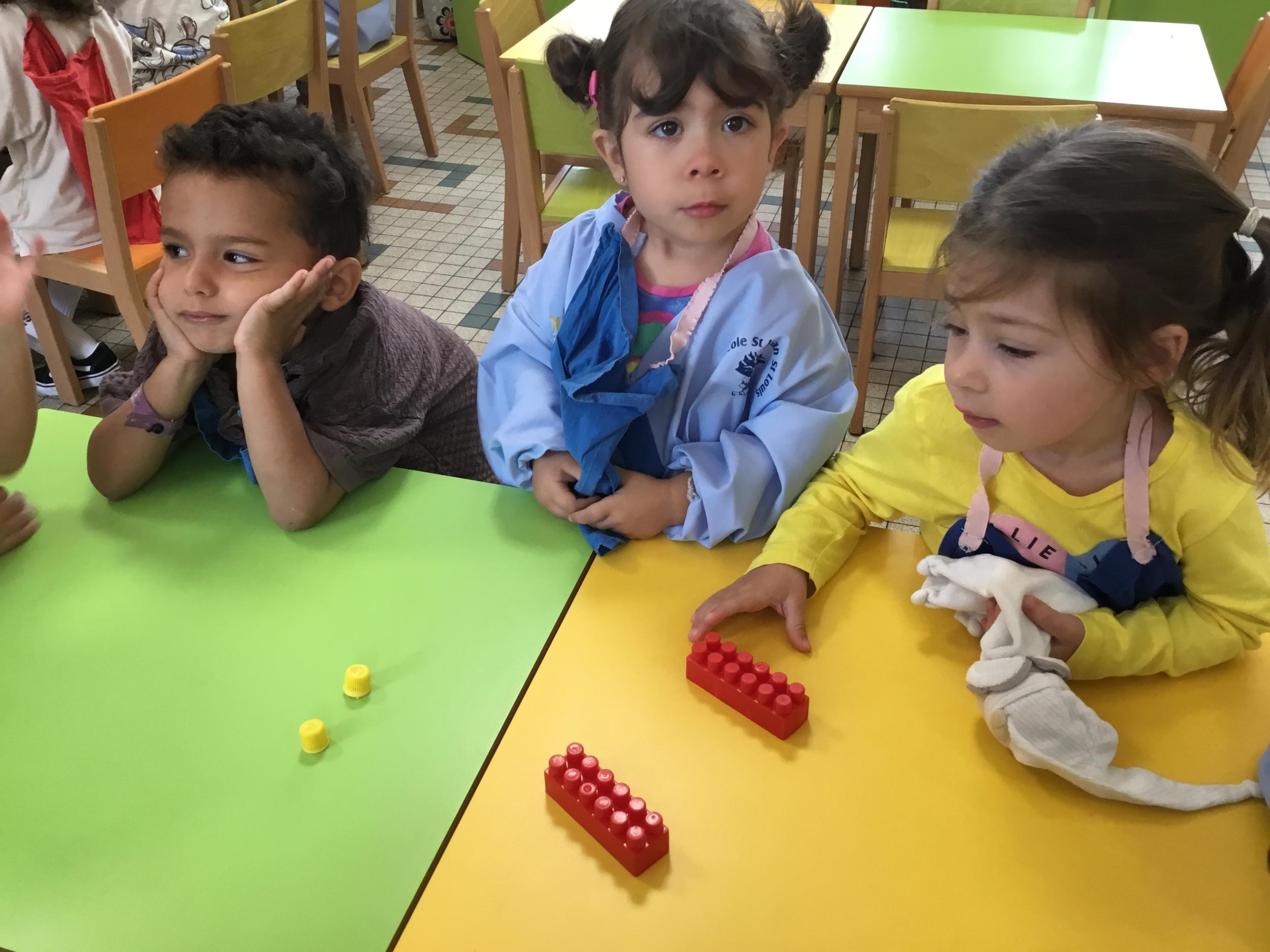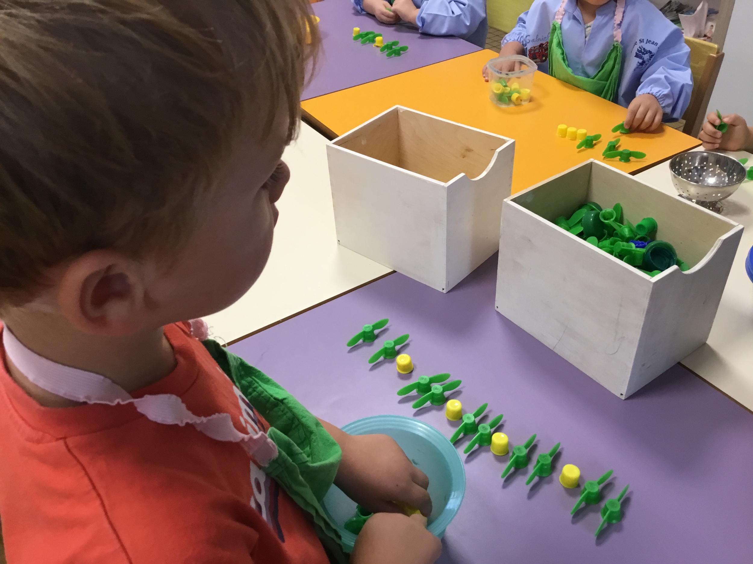 Ils ont préféré les ateliers plus ludiques : trier les legos en fonction de la couleur et nommer les couleurs en anglais , jouer au facteur n’est pas passé pour apprendre les jours de la semaine, ou continuer un algorithme avec des bouchons ( chaque enfant avait devant lui une série plus ou moins complexe à continuer en fonction de leur habileté)