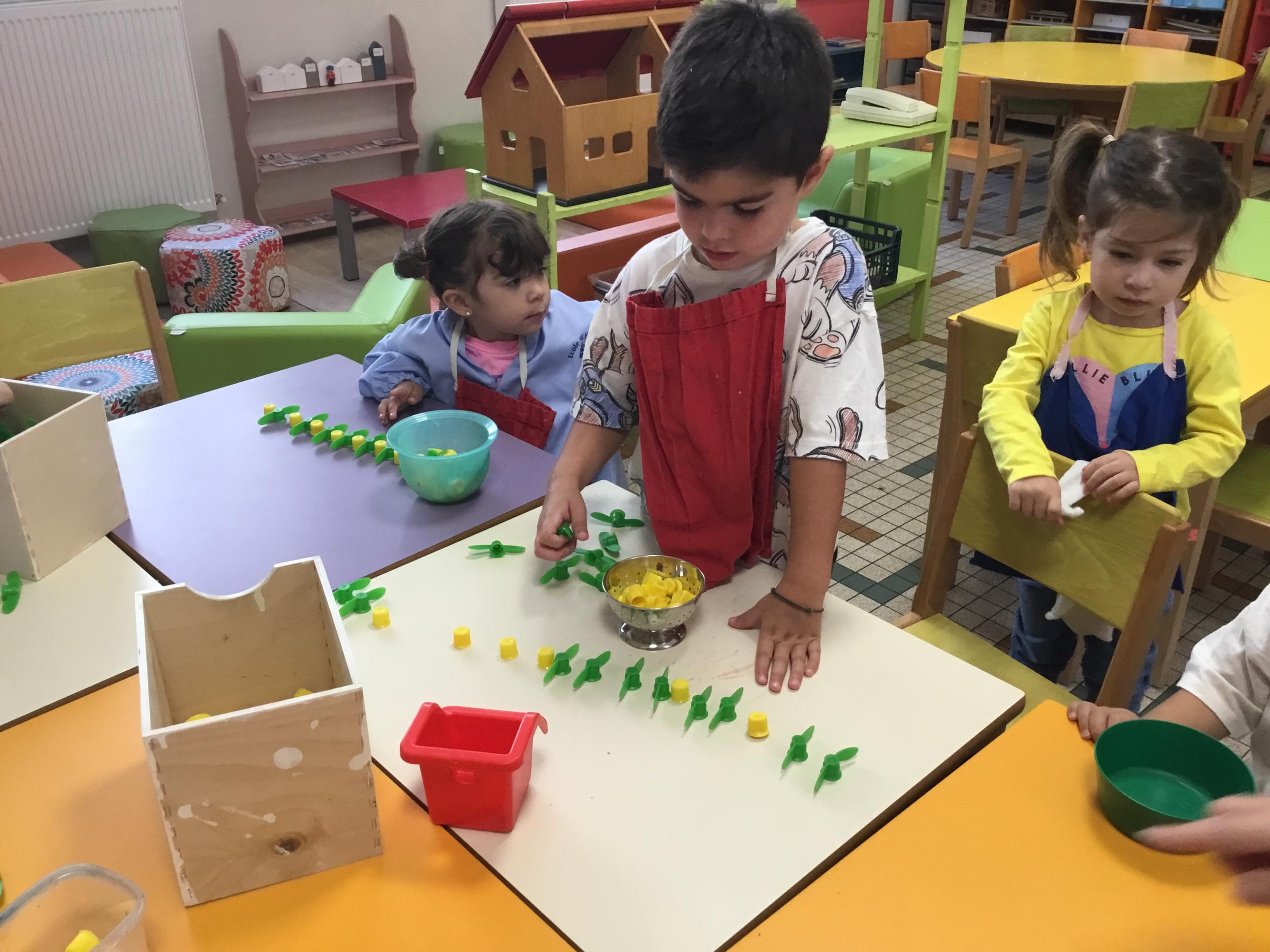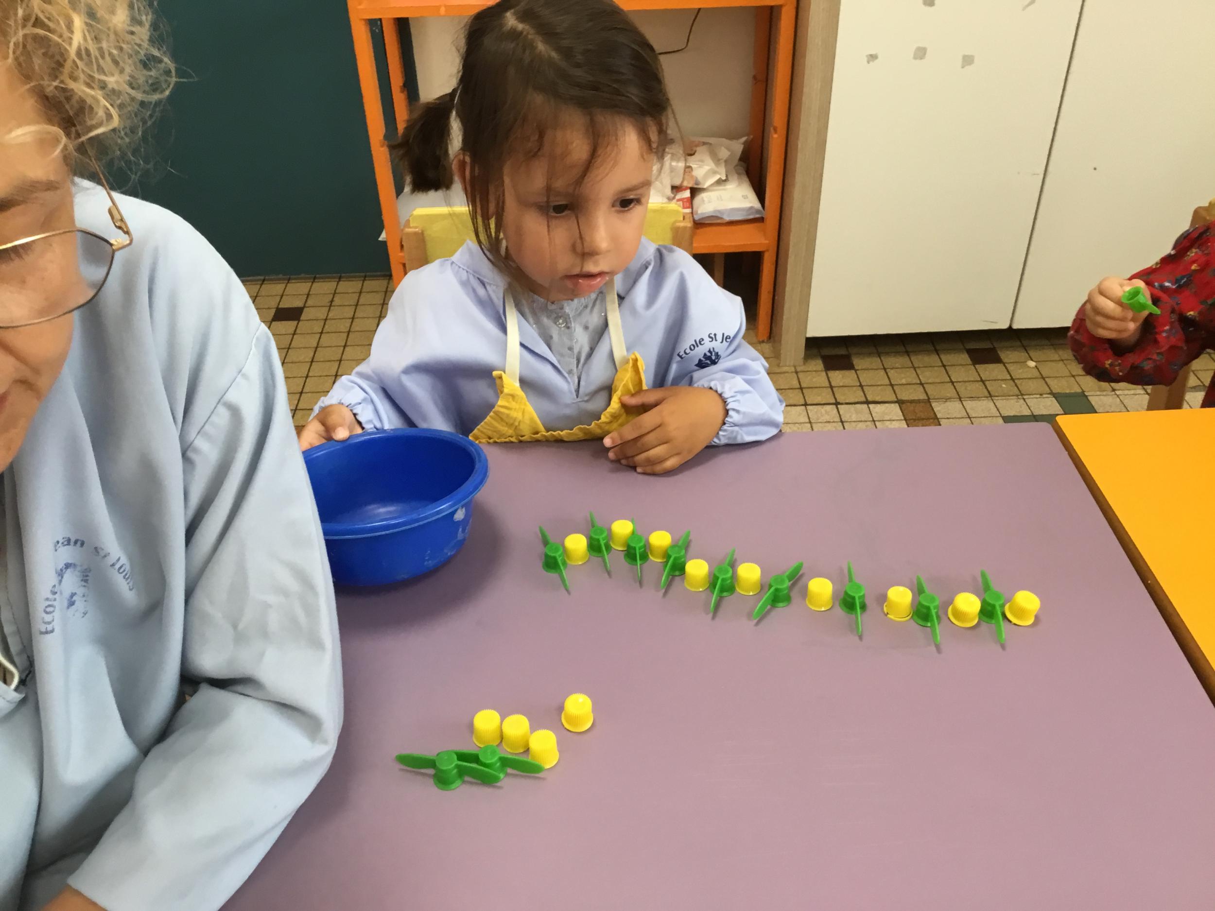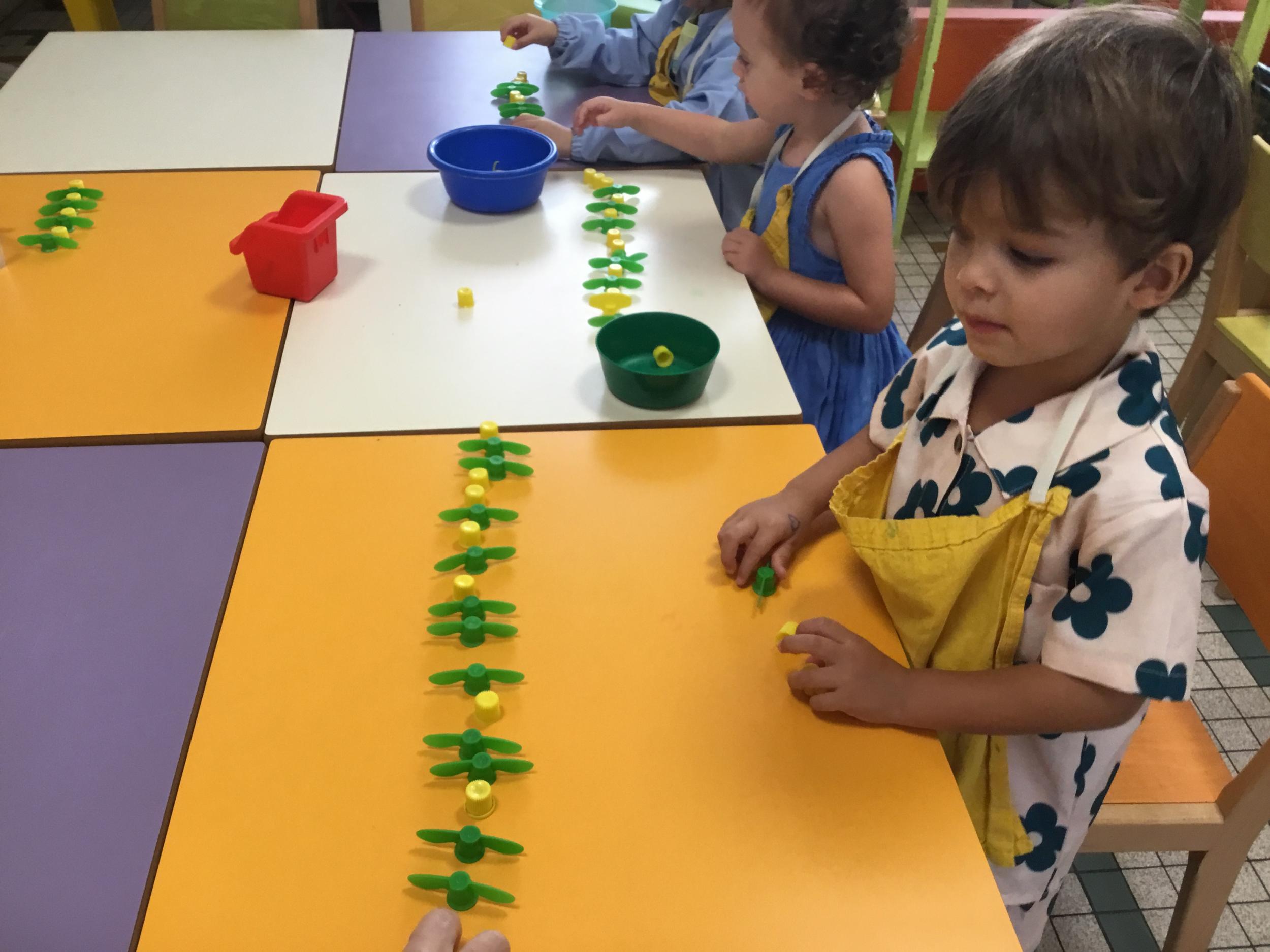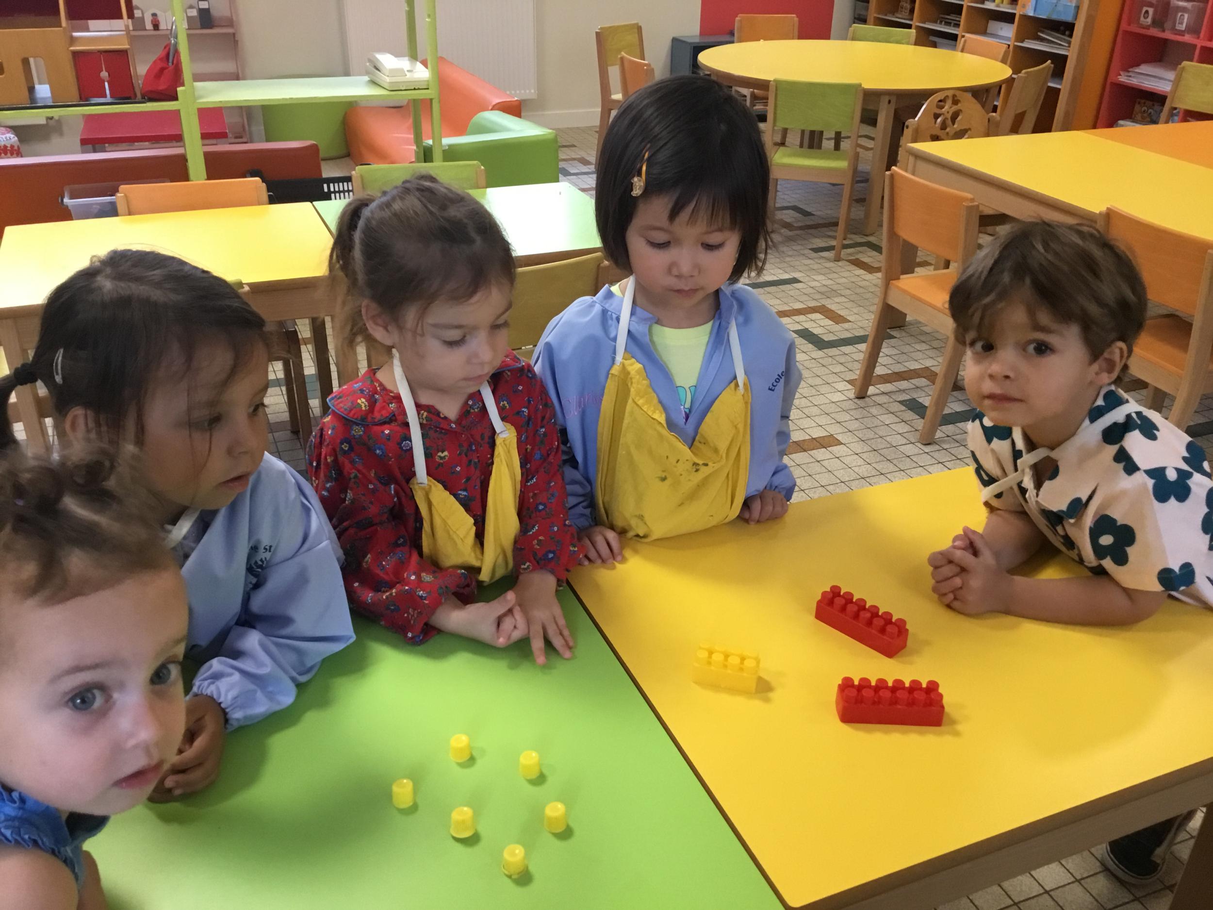 Ils ont préféré les ateliers plus ludiques : trier les legos en fonction de la couleur et nommer les couleurs en anglais , jouer au facteur n’est pas passé pour apprendre les jours de la semaine, ou continuer un algorithme avec des bouchons ( chaque enfant avait devant lui une série plus ou moins complexe à continuer en fonction de leur habileté)