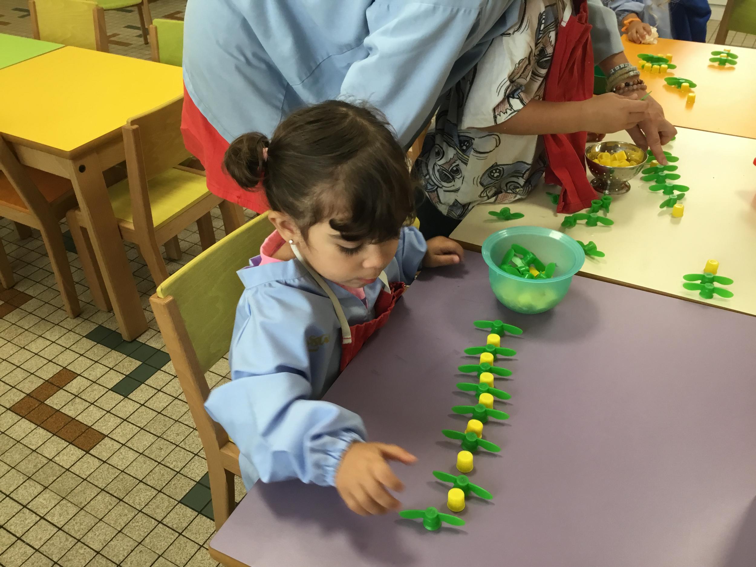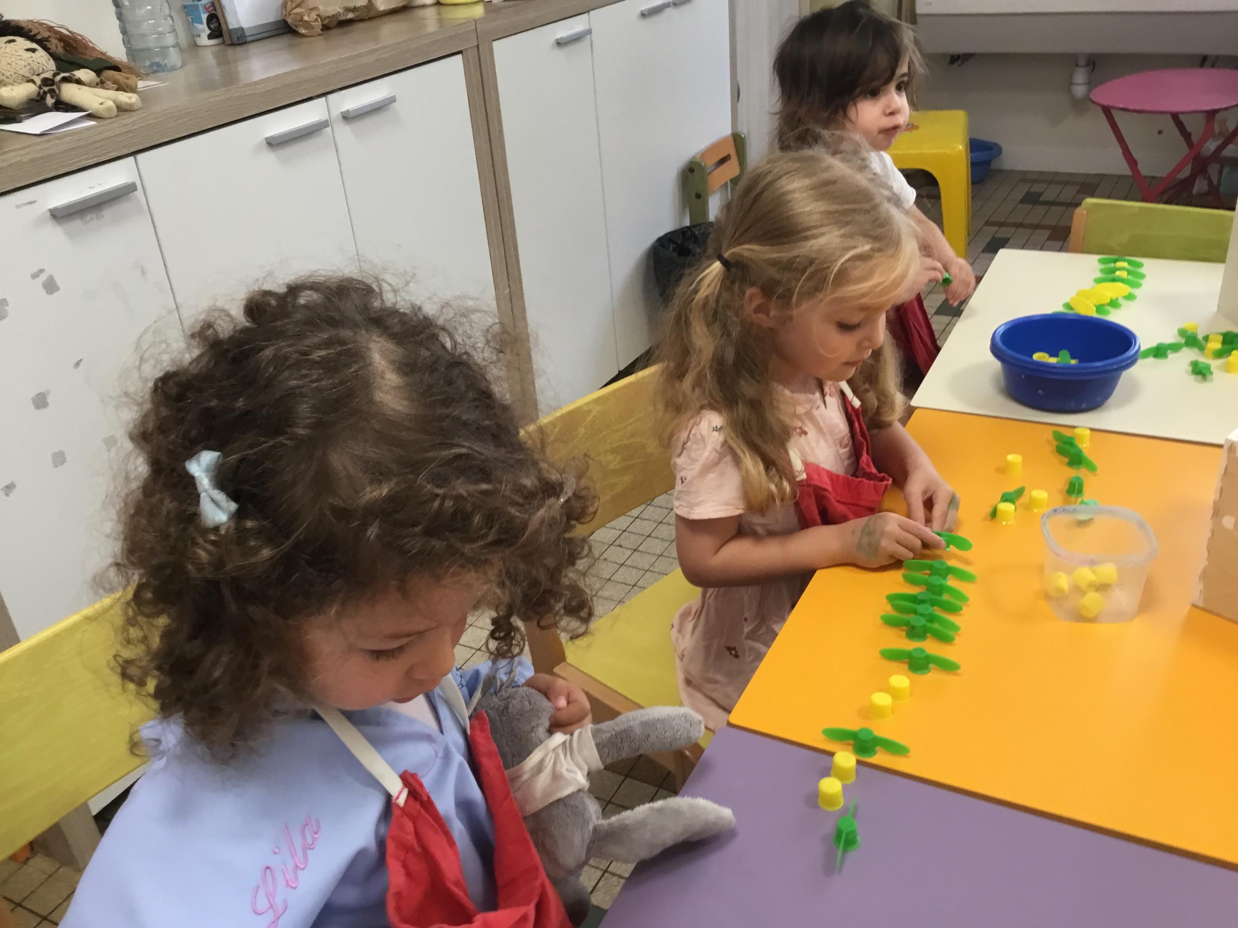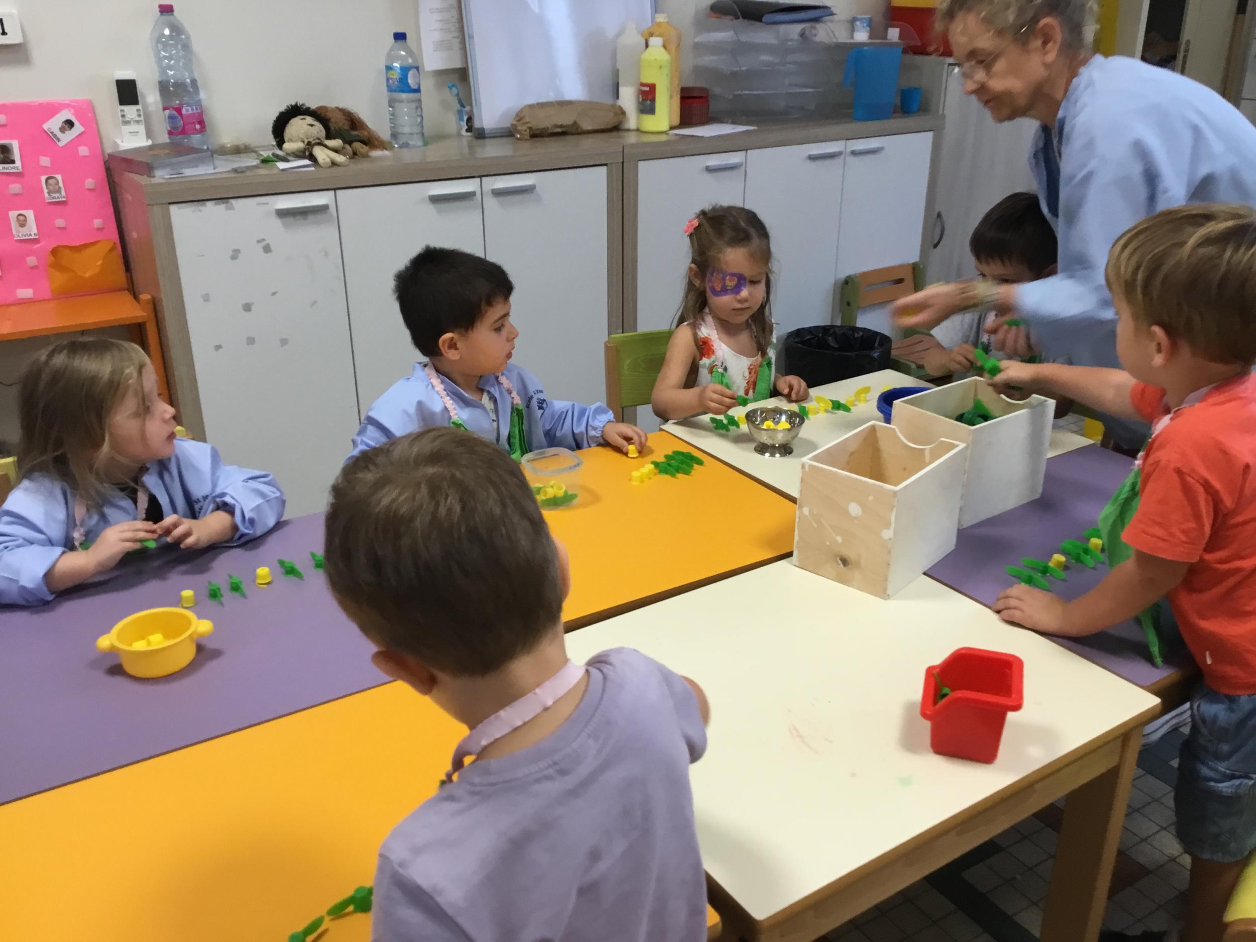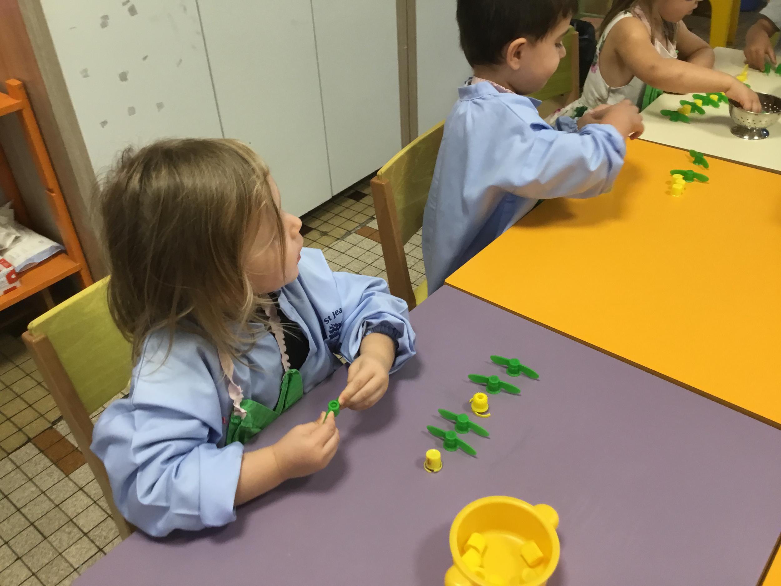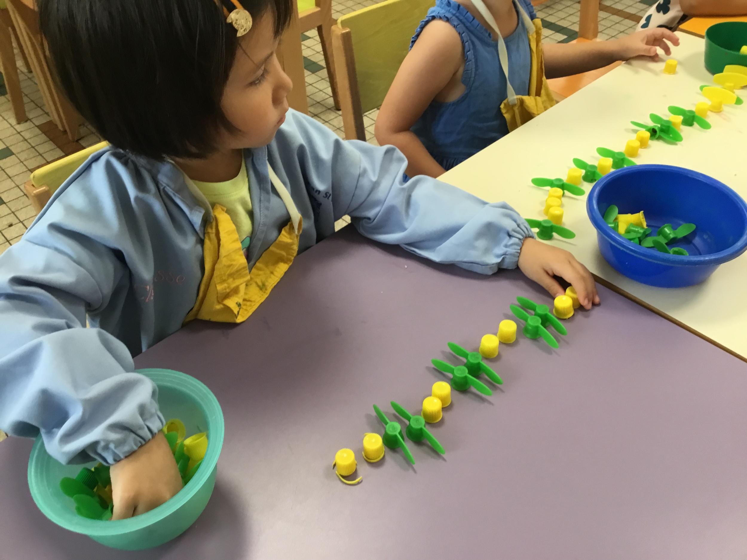 Ils ont préféré les ateliers plus ludiques : trier les legos en fonction de la couleur et nommer les couleurs en anglais , jouer au facteur n’est pas passé pour apprendre les jours de la semaine, ou continuer un algorithme avec des bouchons ( chaque enfant avait devant lui une série plus ou moins complexe à continuer en fonction de leur habileté)