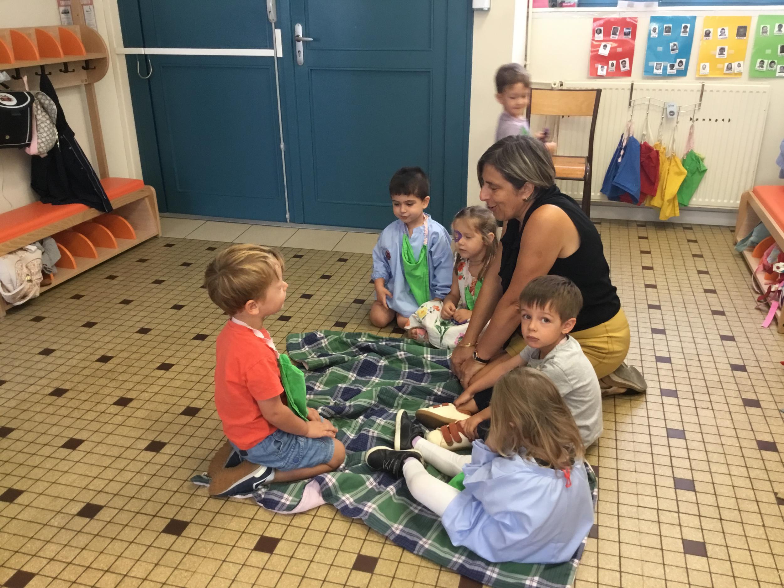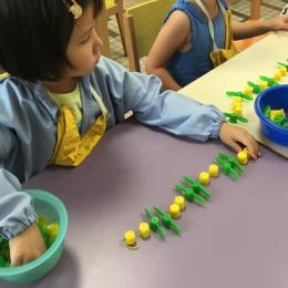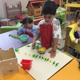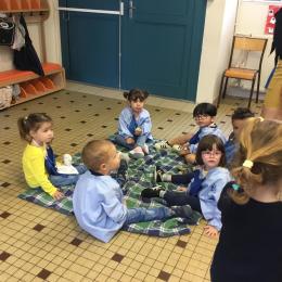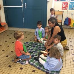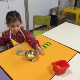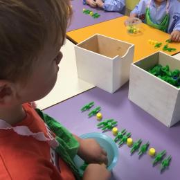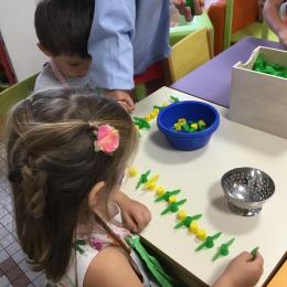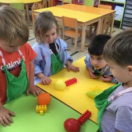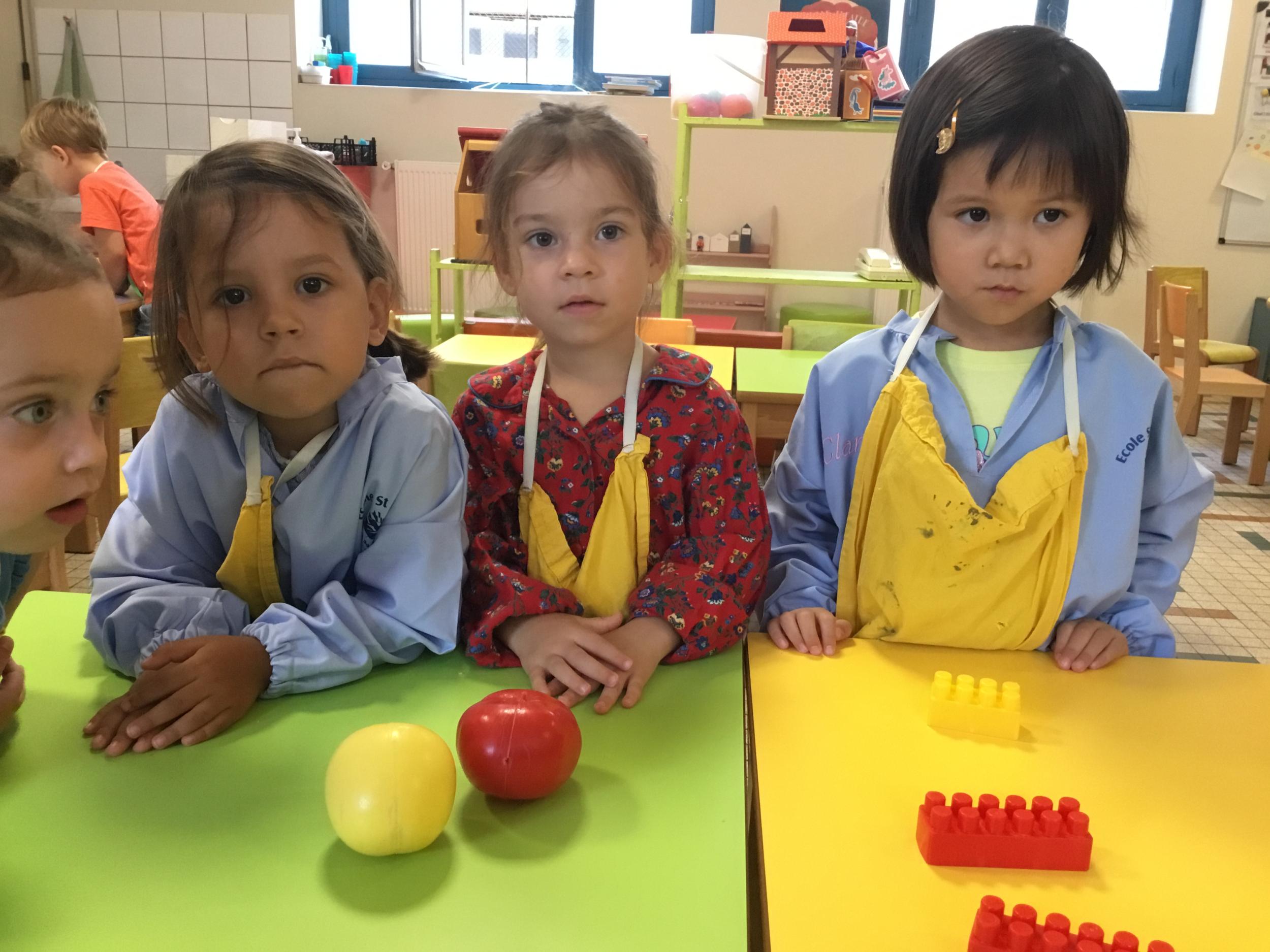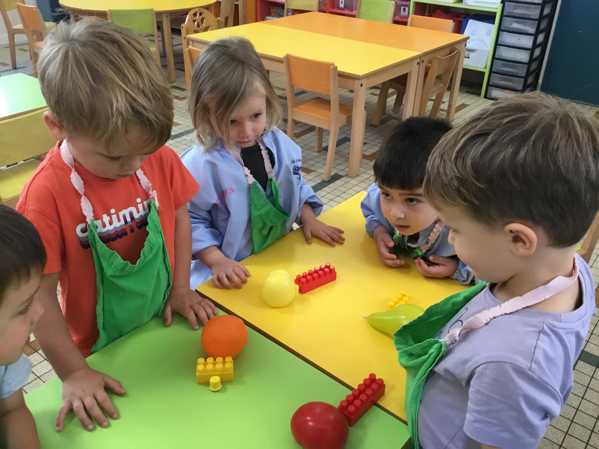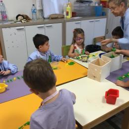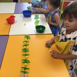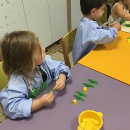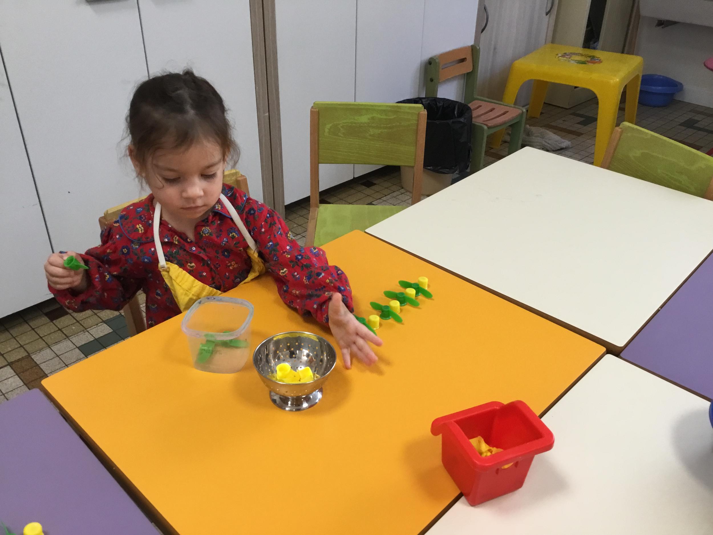 Ils ont préféré les ateliers plus ludiques : trier les legos en fonction de la couleur et nommer les couleurs en anglais , jouer au facteur n’est pas passé pour apprendre les jours de la semaine, ou continuer un algorithme avec des bouchons ( chaque enfant avait devant lui une série plus ou moins complexe à continuer en fonction de leur habileté)