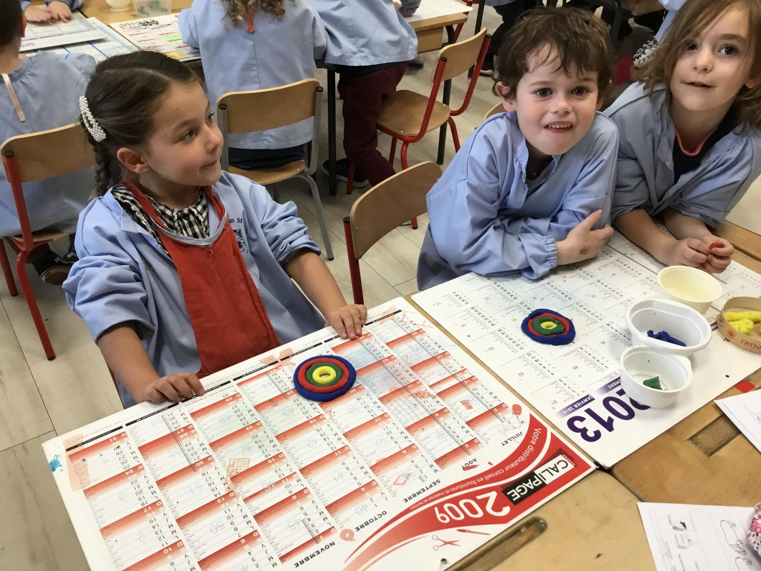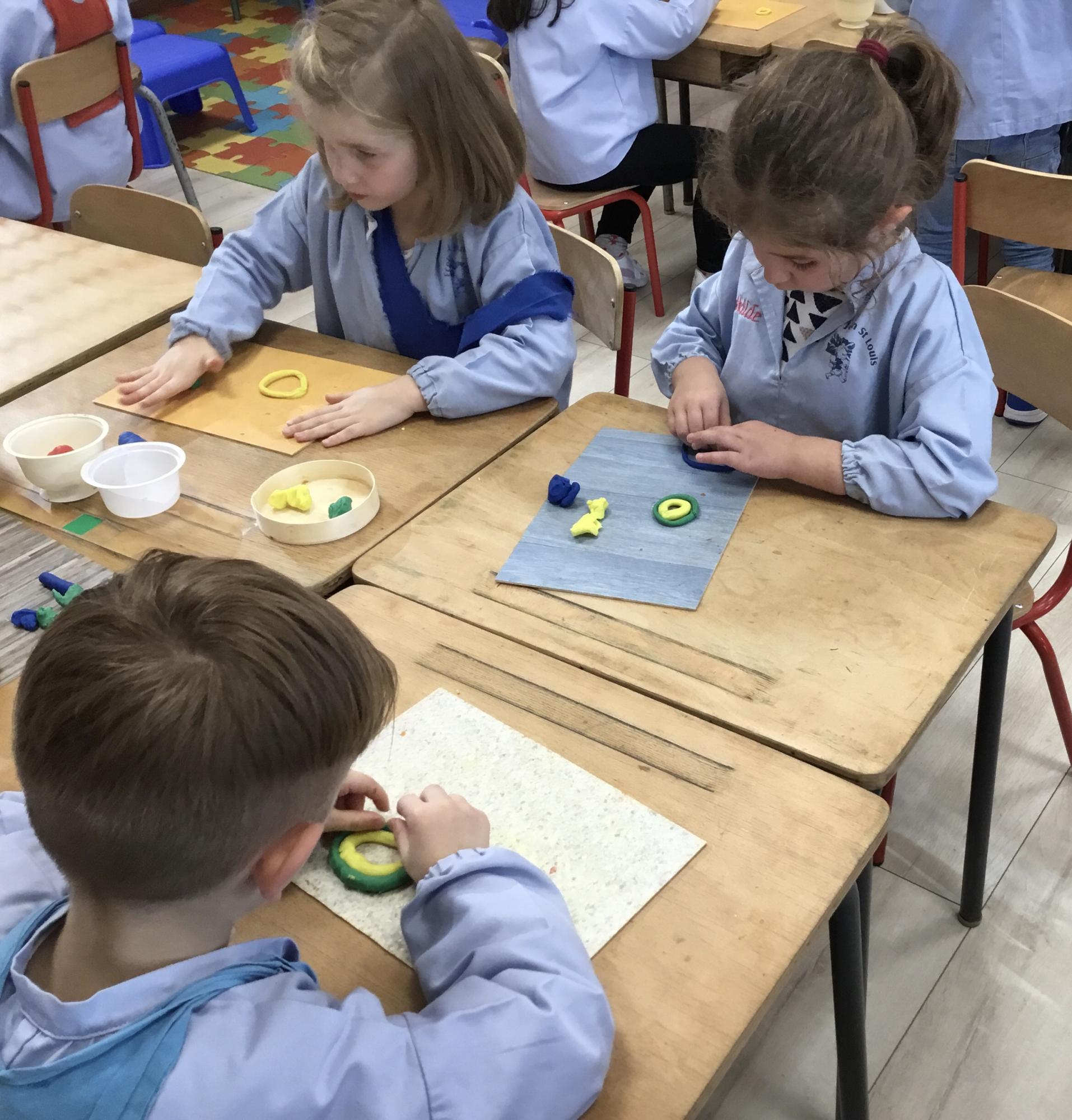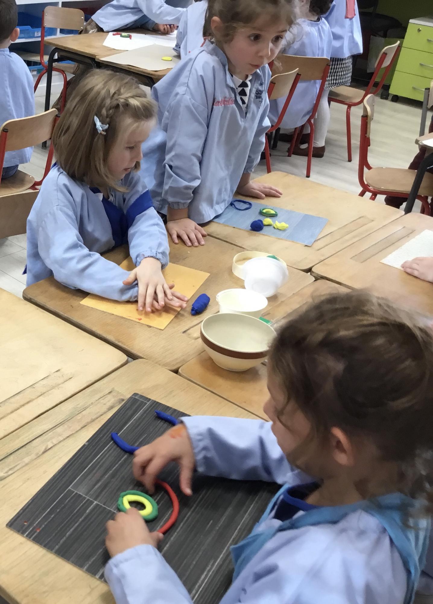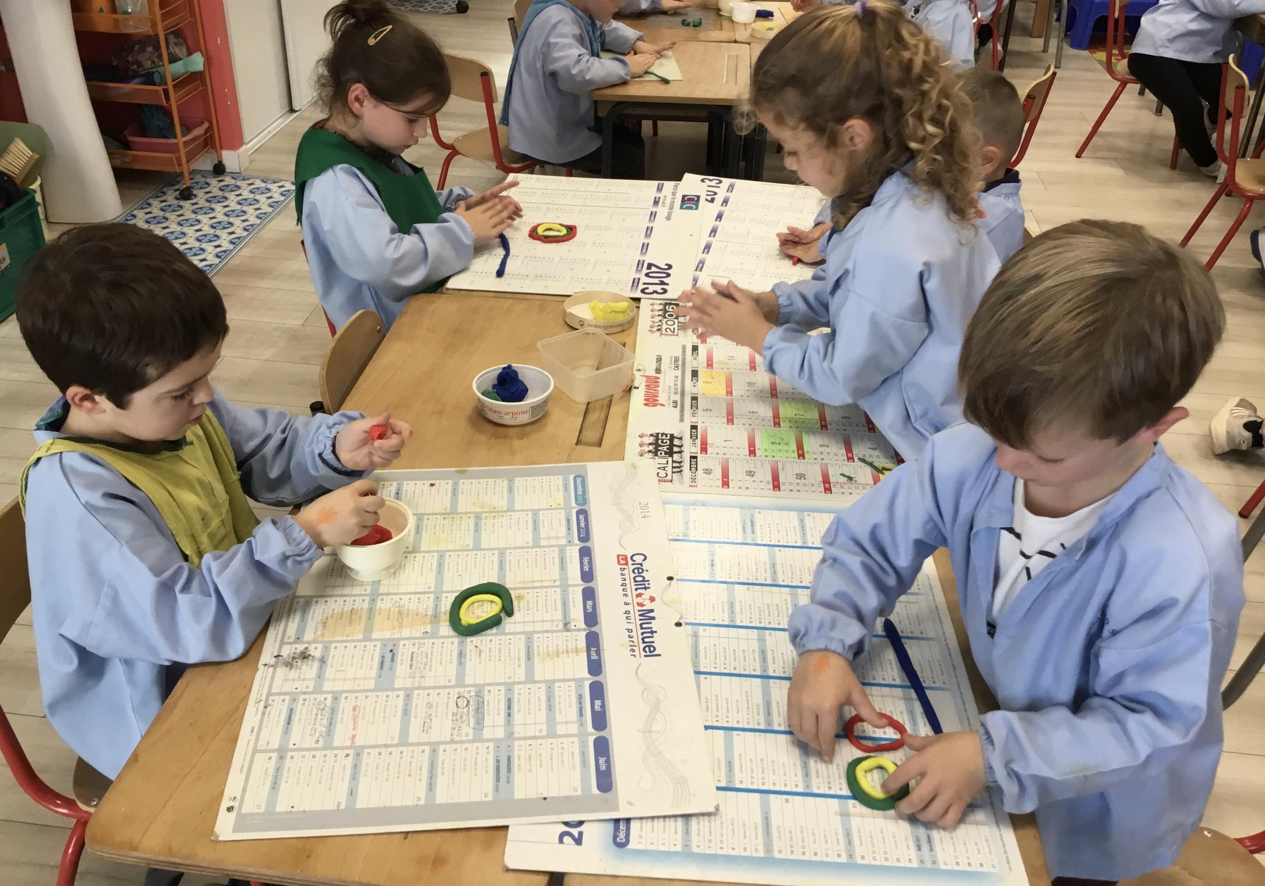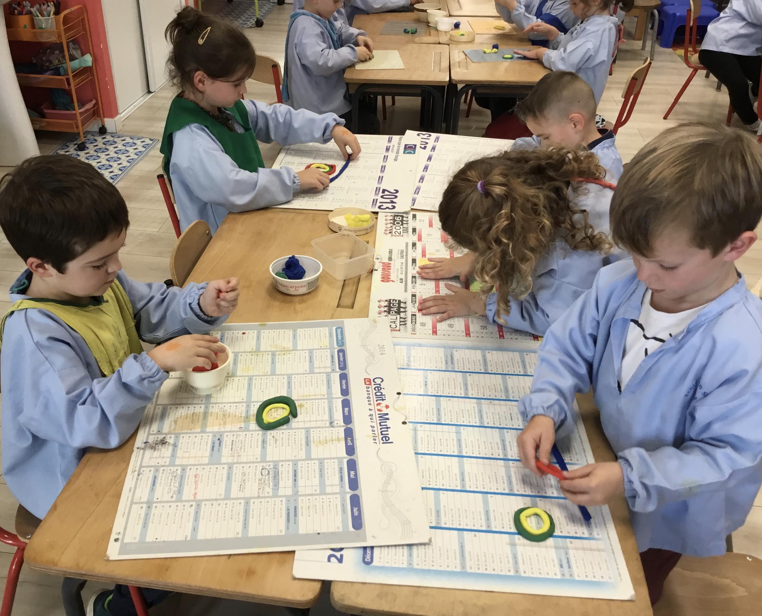 Après l’apprentissage d’une comptine, « des ronds bien rangés »,les élèves ont représenté avec de la pâte à modeler ce qu’ils ont appris.