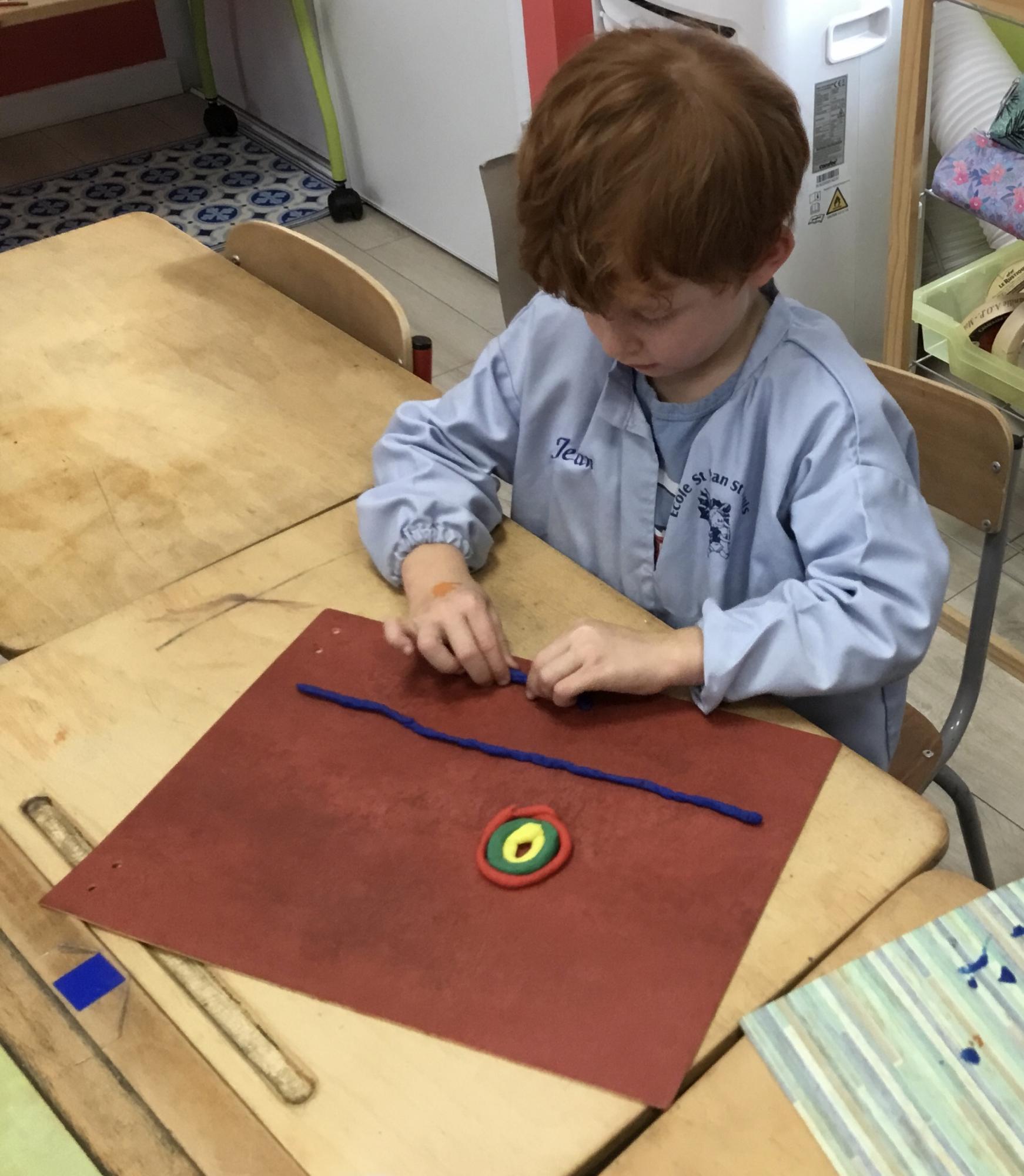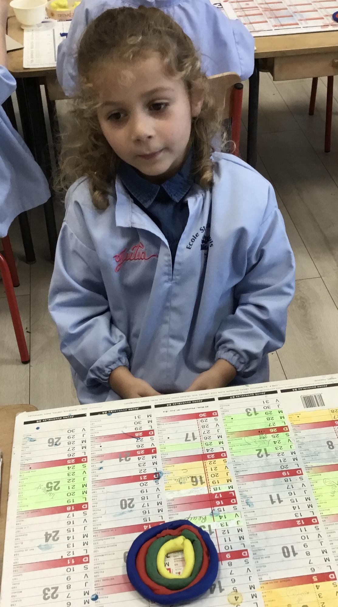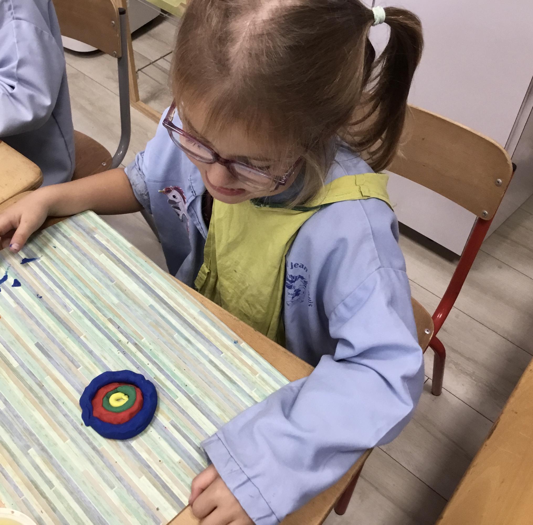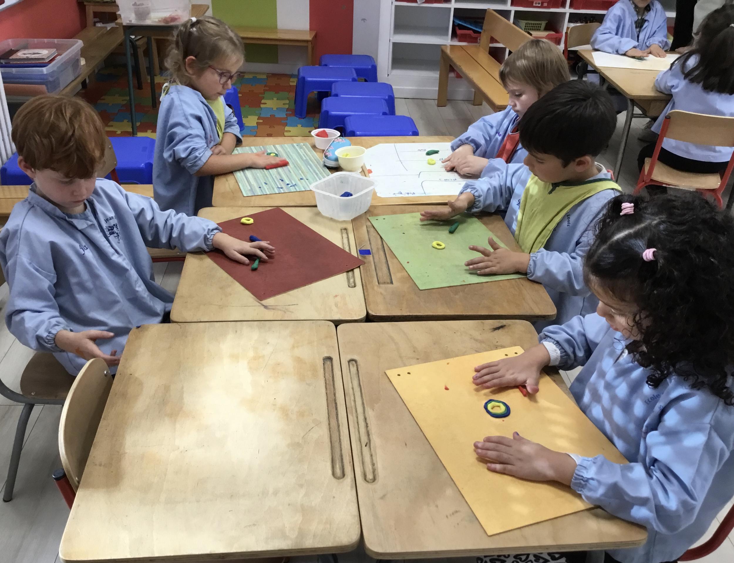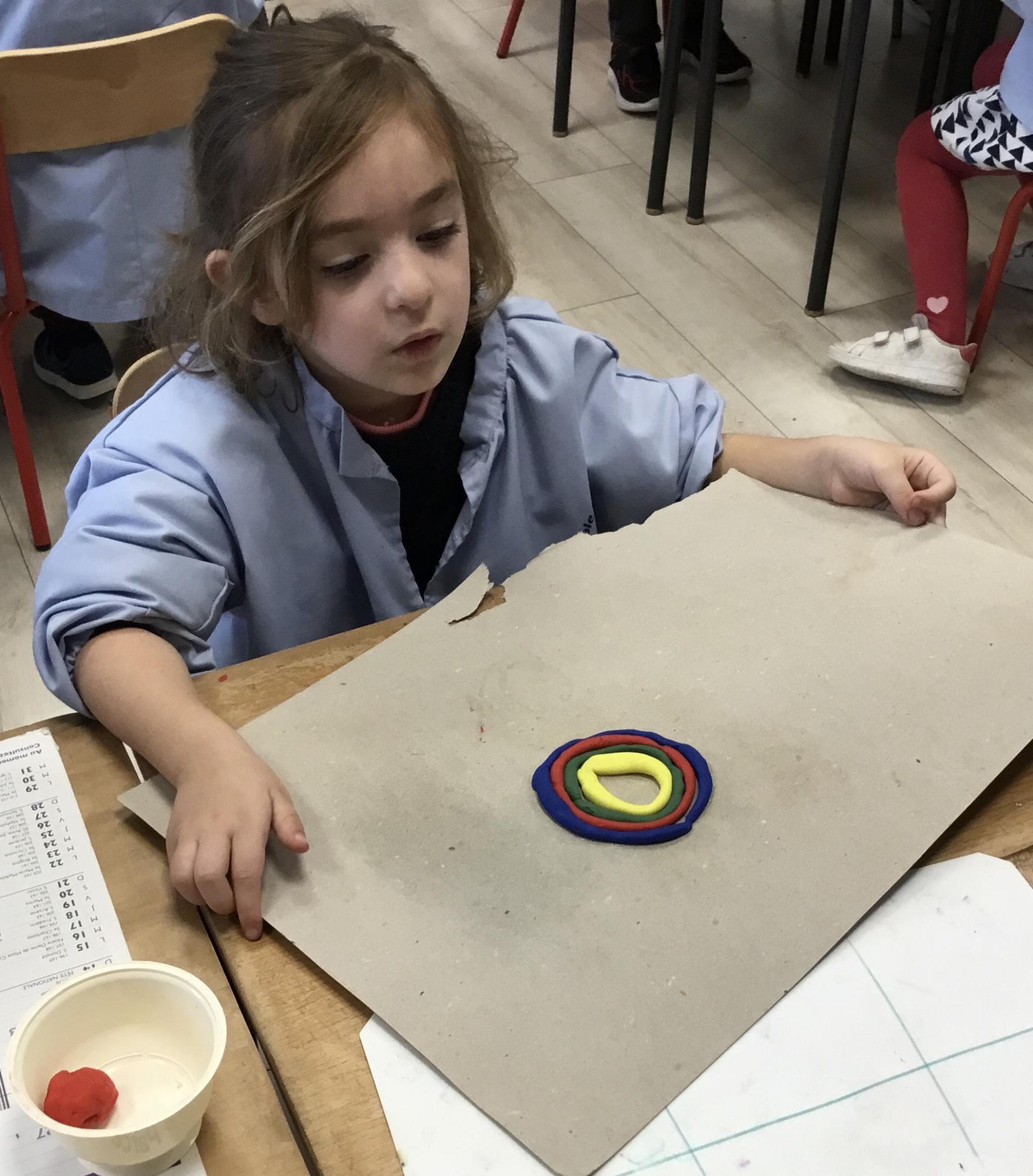 Après l’apprentissage d’une comptine, « des ronds bien rangés »,les élèves ont représenté avec de la pâte à modeler ce qu’ils ont appris.