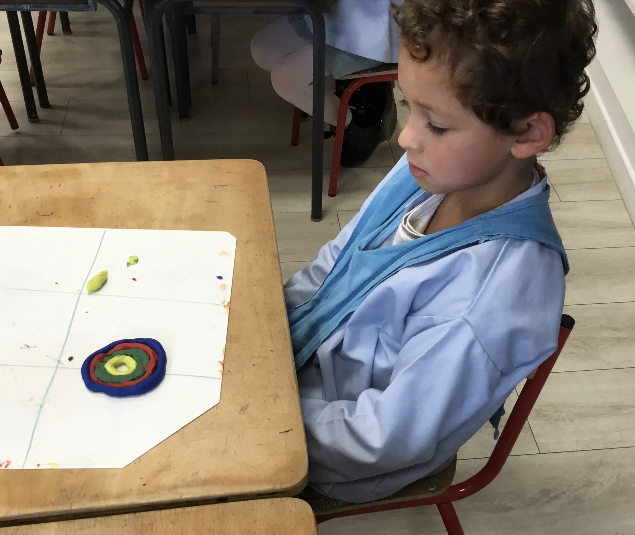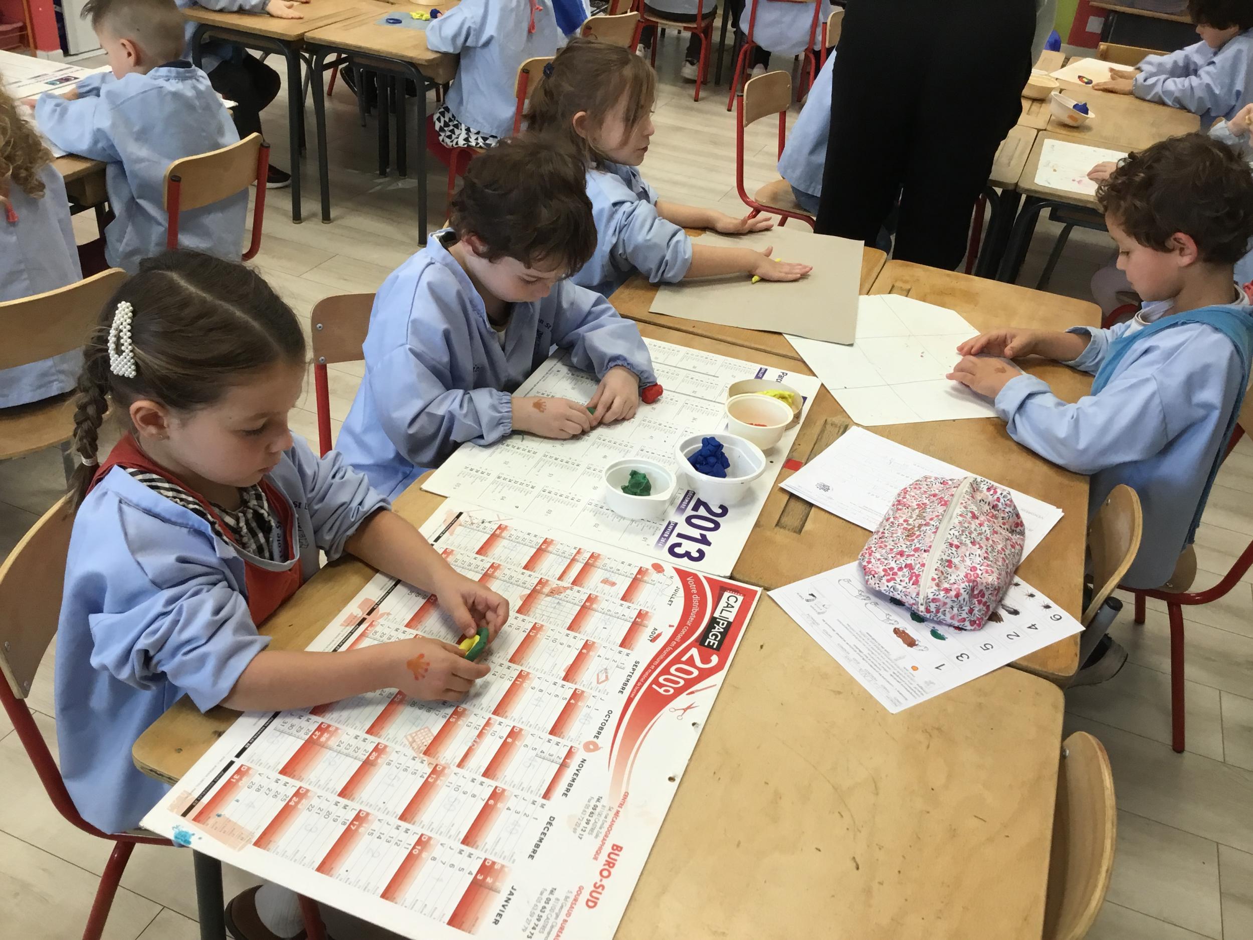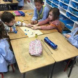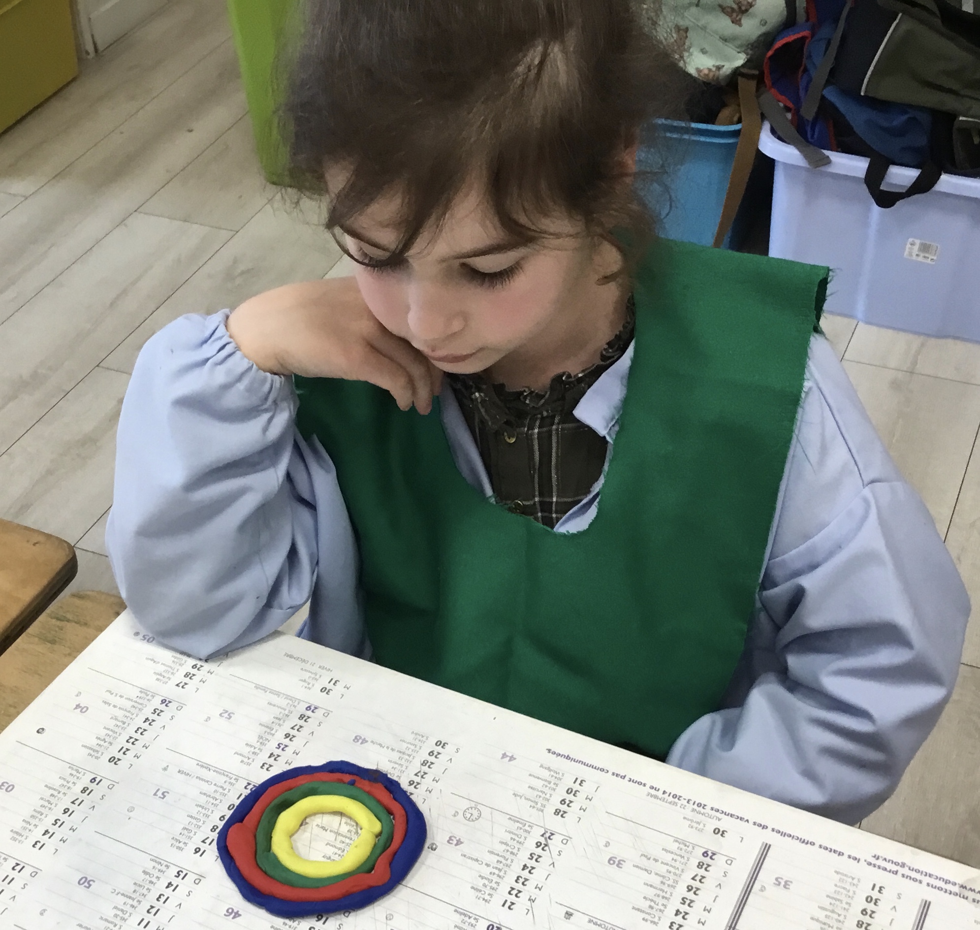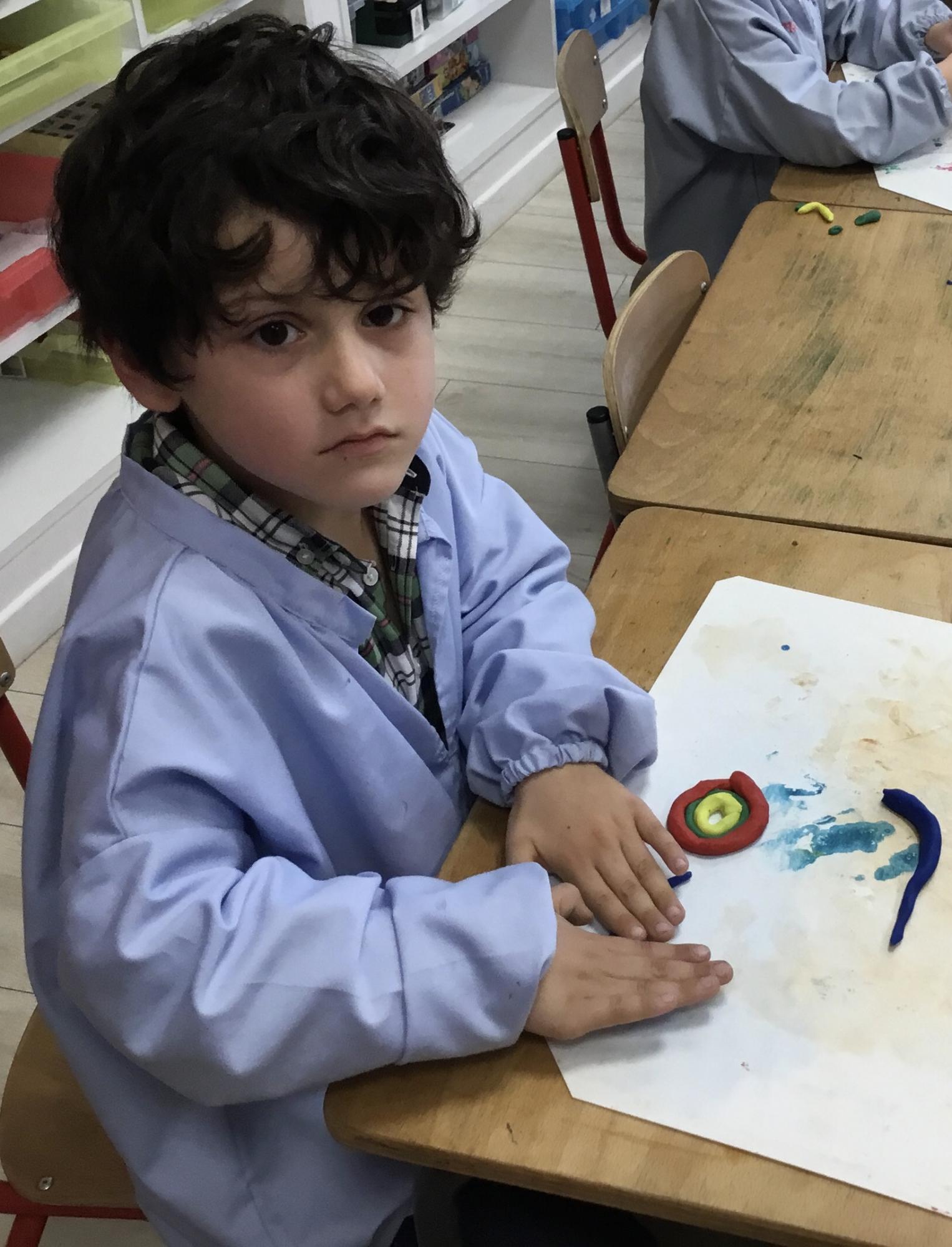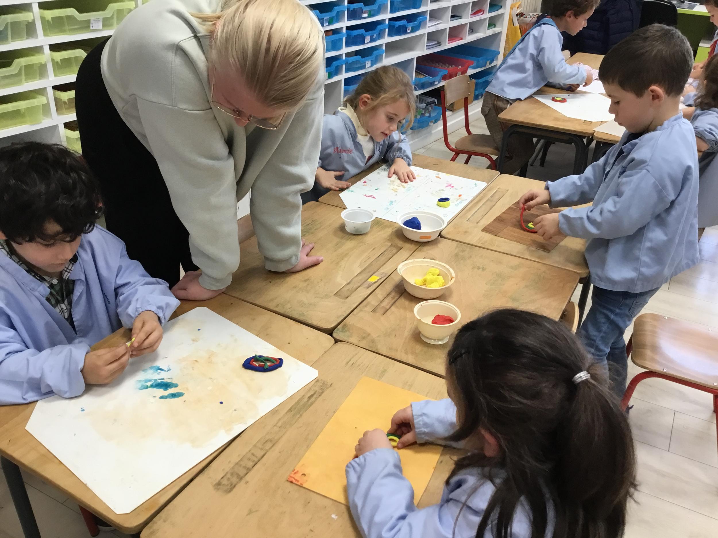 Après l’apprentissage d’une comptine, « des ronds bien rangés »,les élèves ont représenté avec de la pâte à modeler ce qu’ils ont appris.