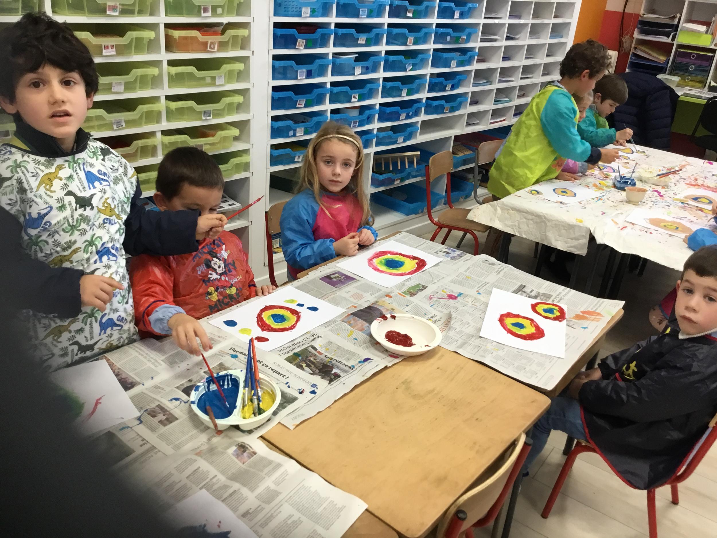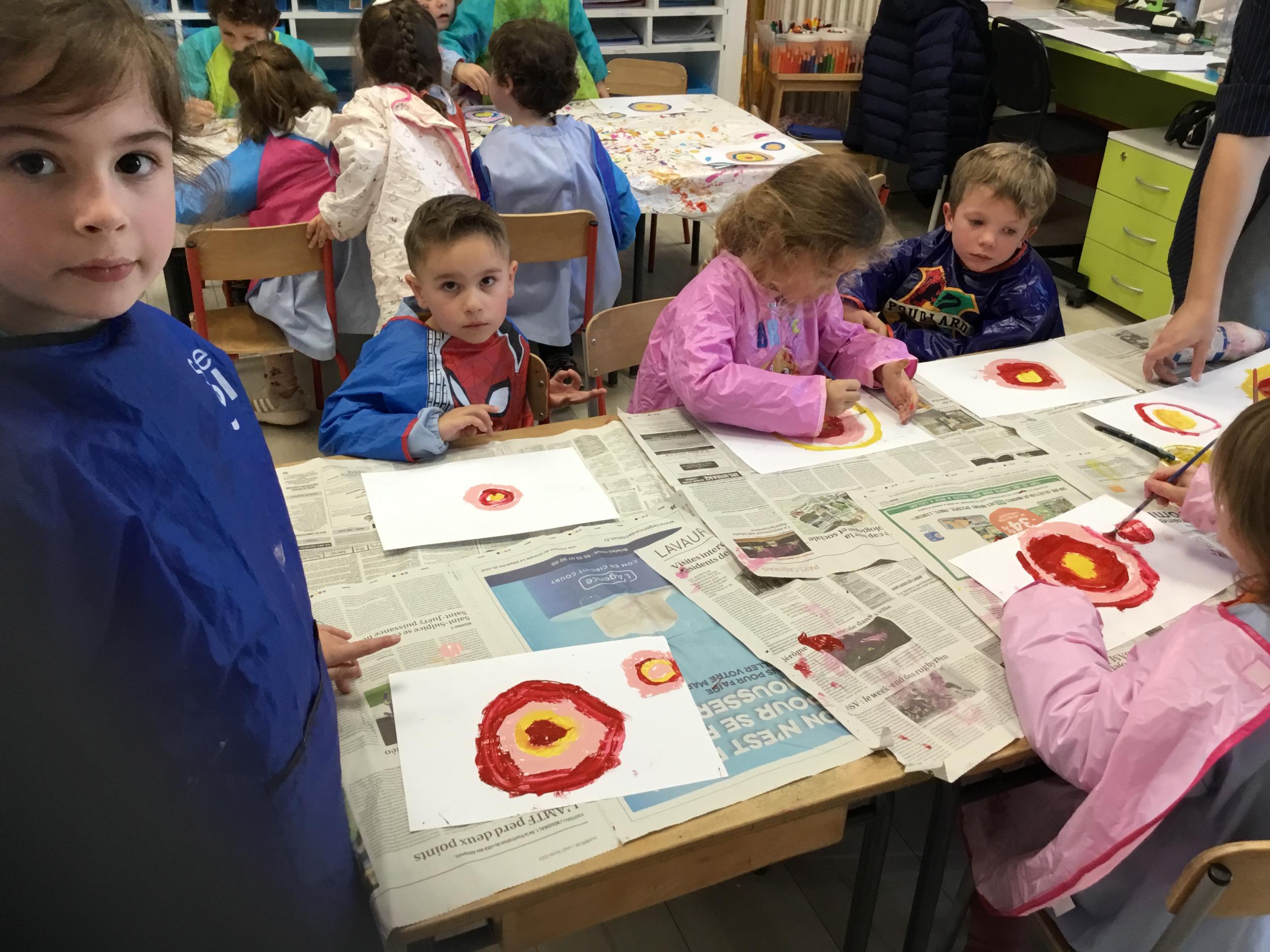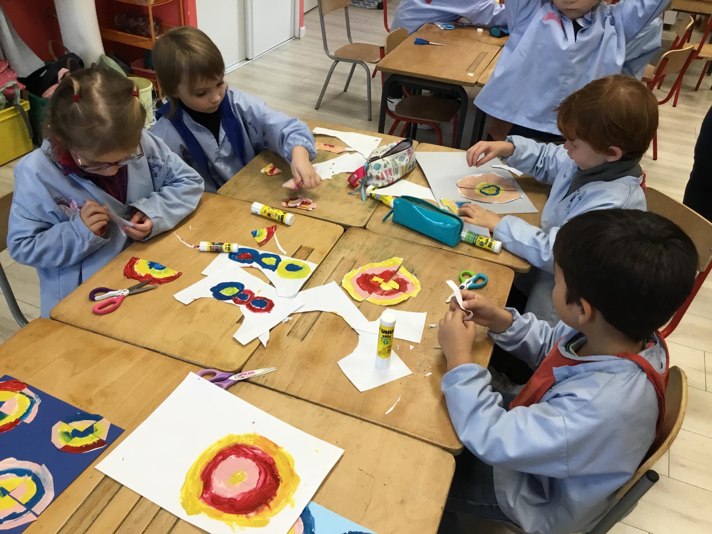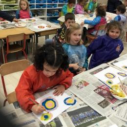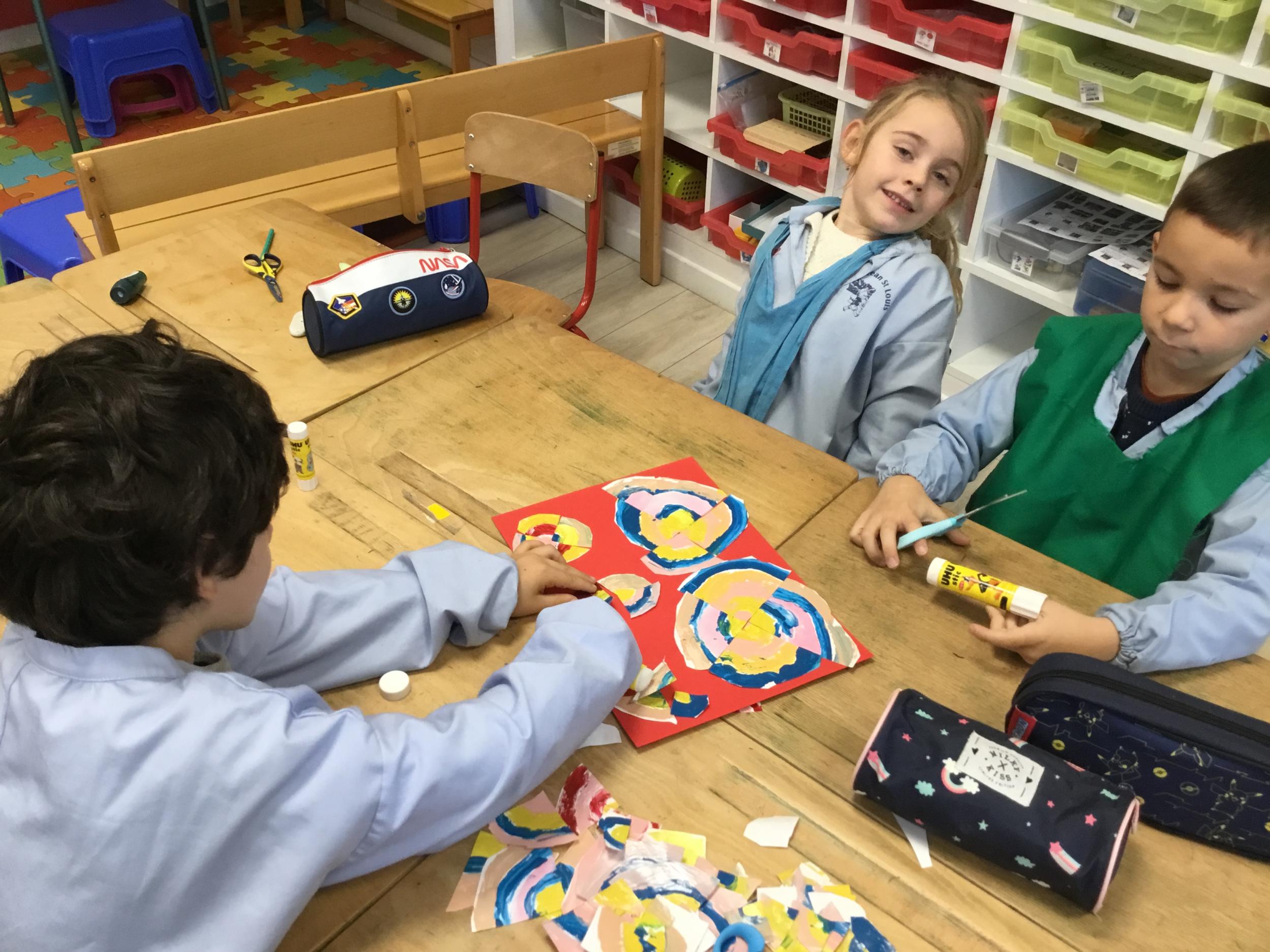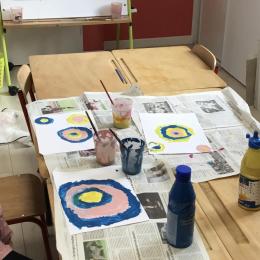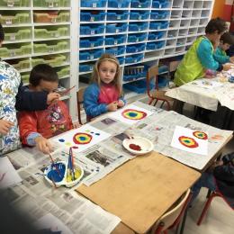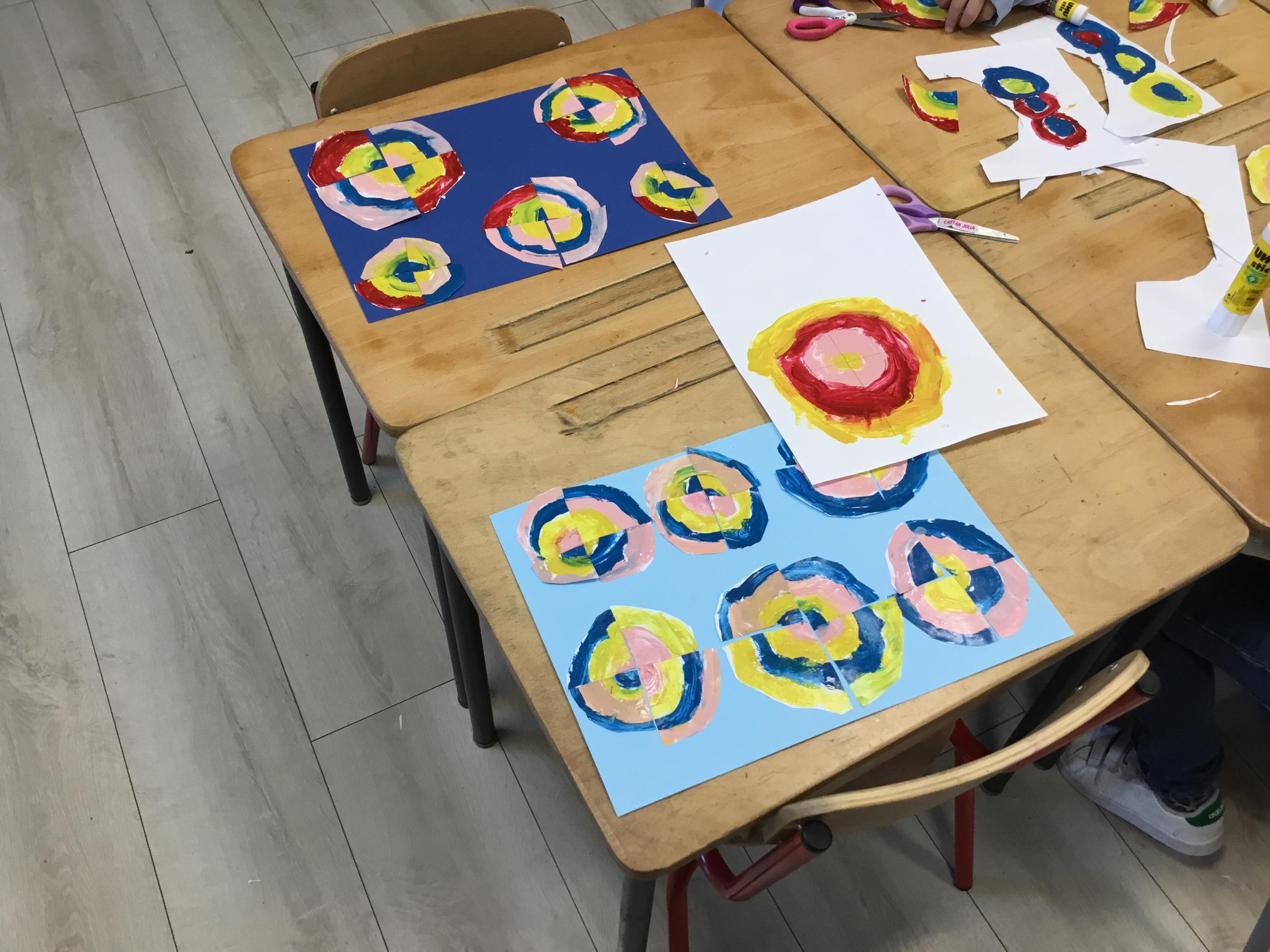 Ils ont ensuite découvert les œuvres de Robert Delaunay, ils ont peint en faisant des ronds avec différentes couleurs, du plus petit au plus grand.Ces ronds ont ensuite été découpés en quatre et assemblés par groupe, à la manière de Robert Delaunay.