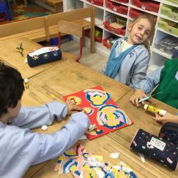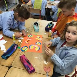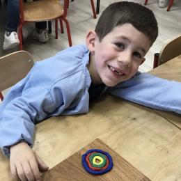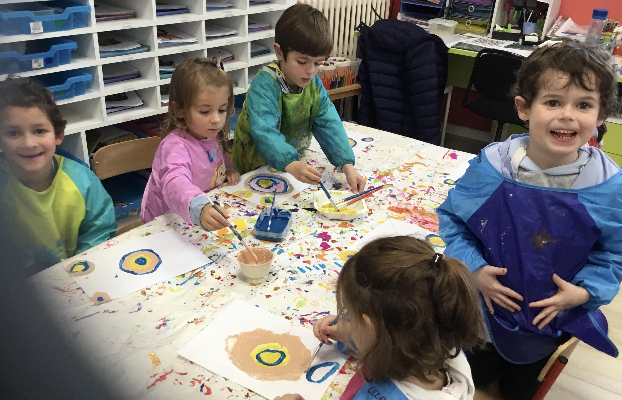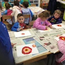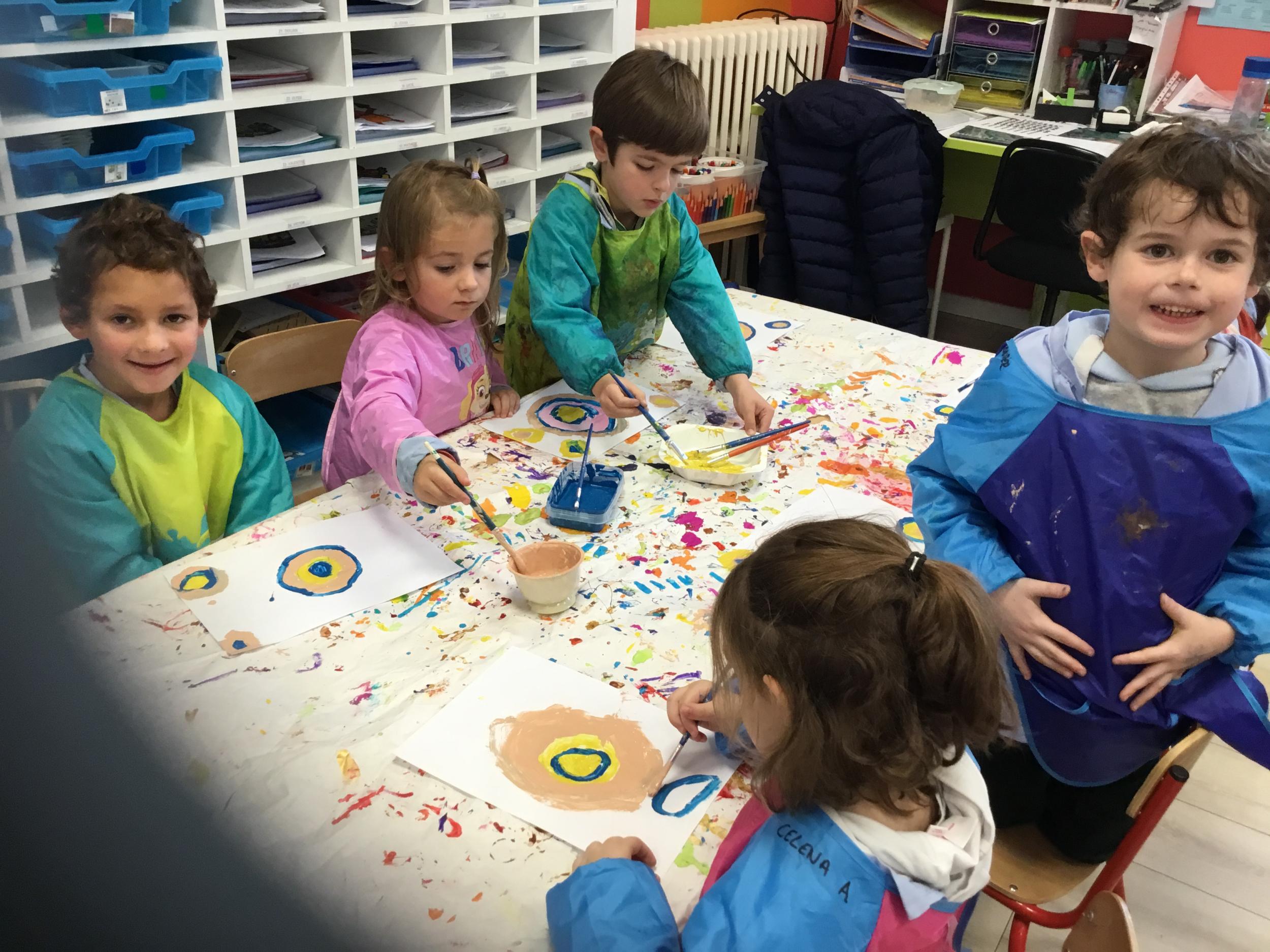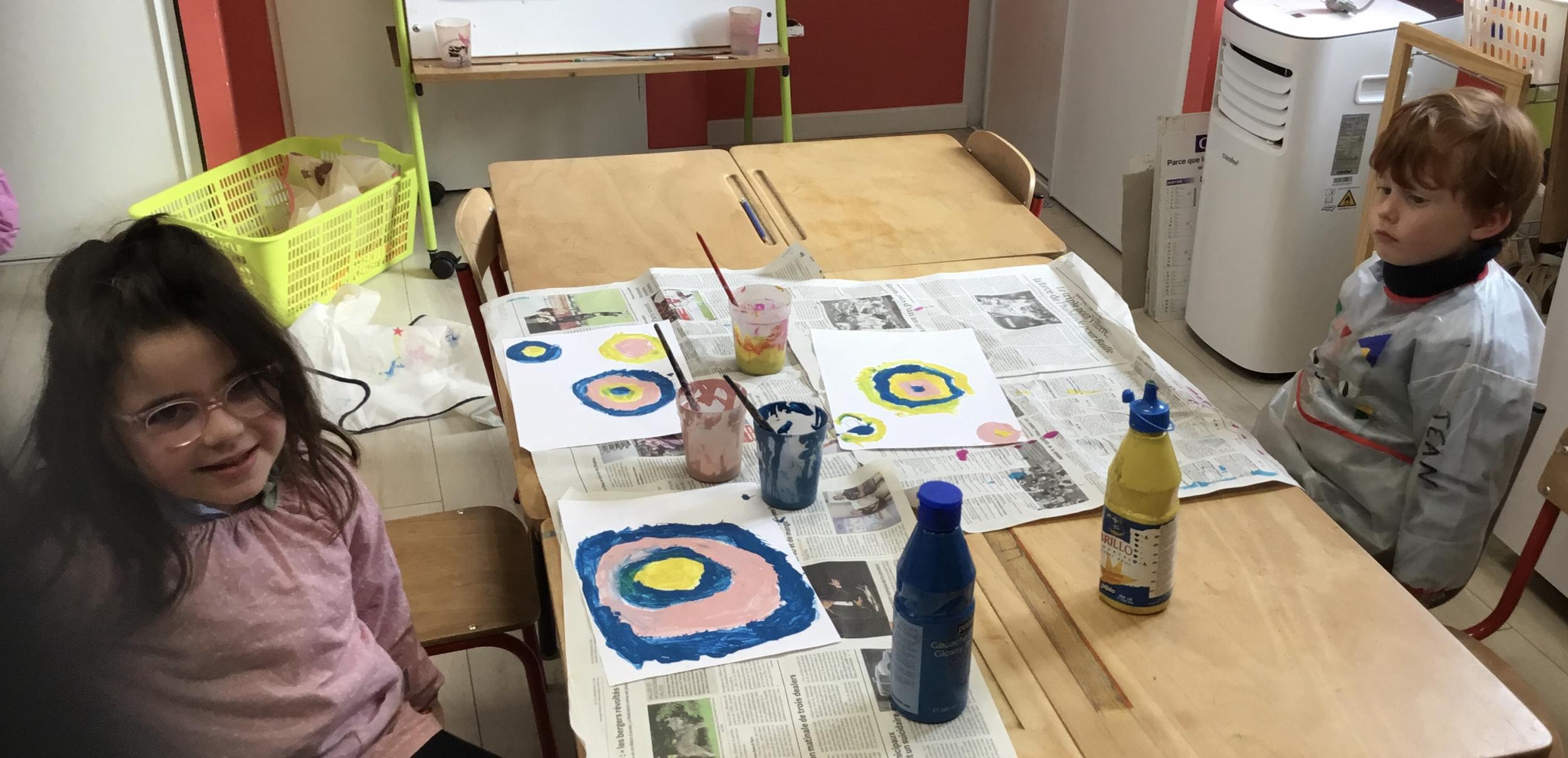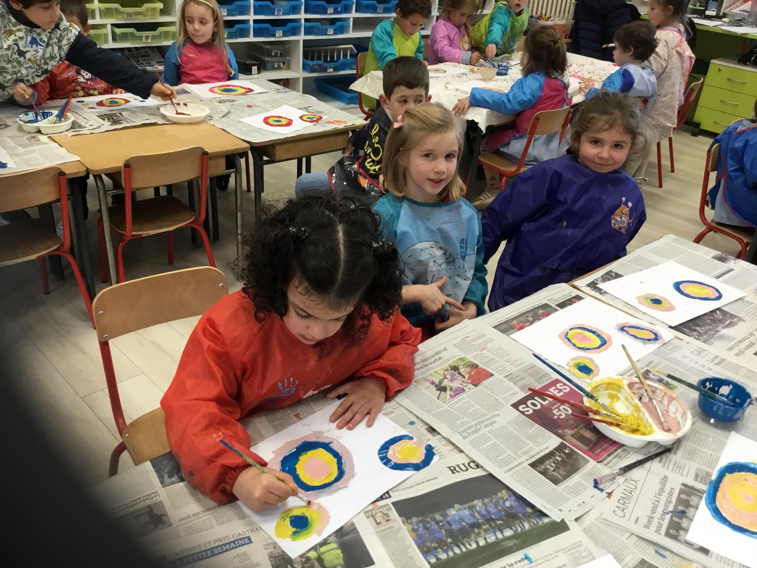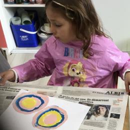 Ils ont ensuite découvert les œuvres de Robert Delaunay, ils ont peint en faisant des ronds avec différentes couleurs, du plus petit au plus grand.Ces ronds ont ensuite été découpés en quatre et assemblés par groupe, à la manière de Robert Delaunay.