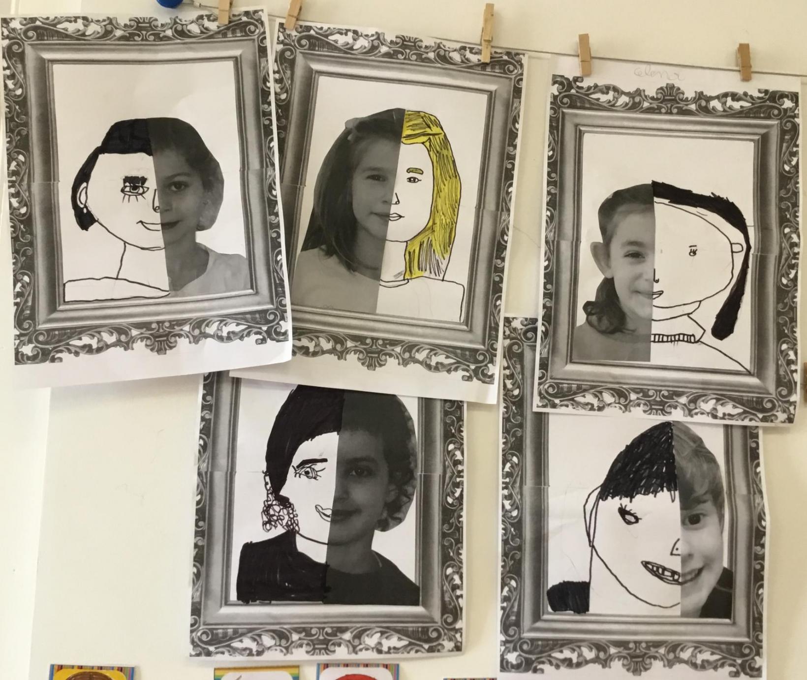 Après avoir collé leur demi-visage sur une feuille représentant un cadre de tableau,ils ont dessiné la seconde partie de leur visage. Après quelques corrections, ils ont repassé au feutre noir et colorié les parties les plus sombres.