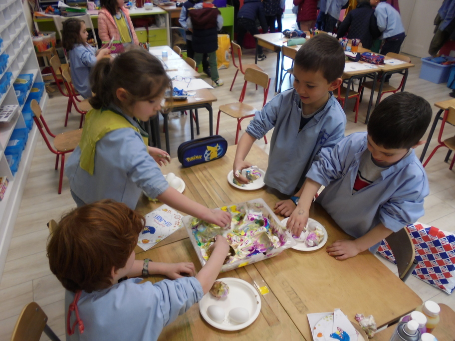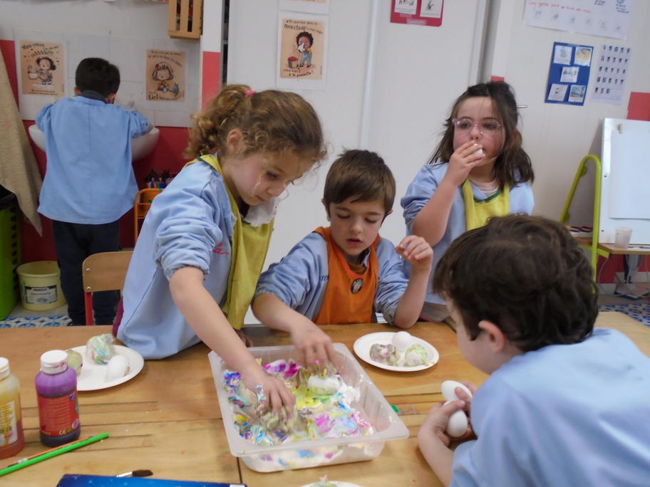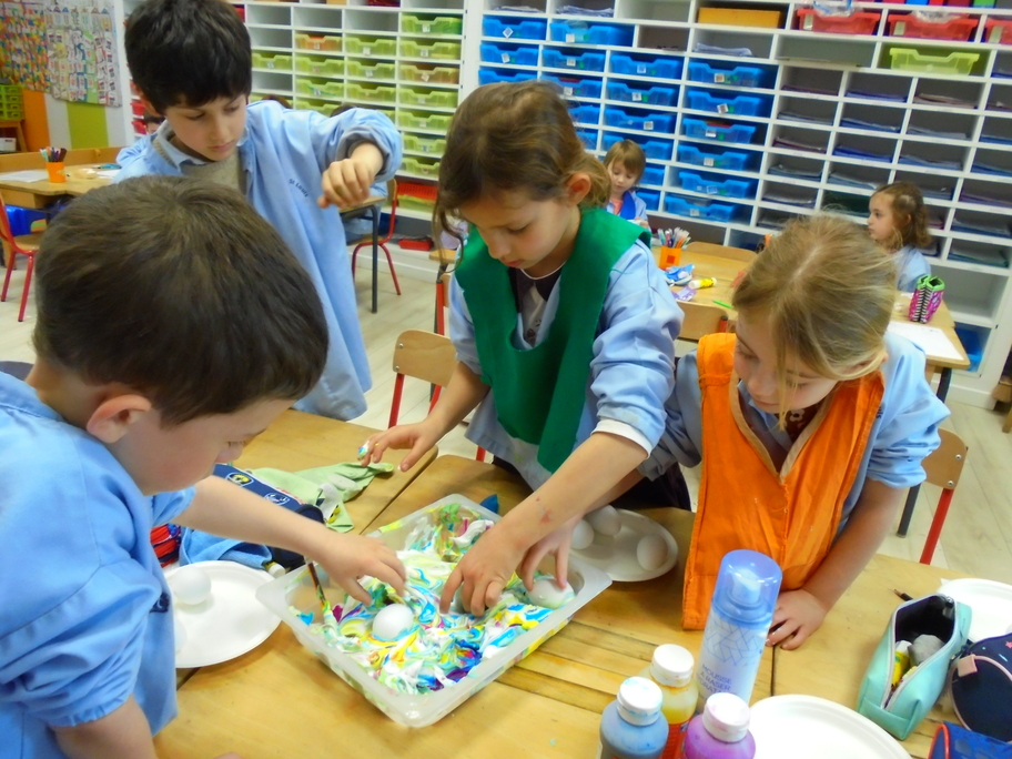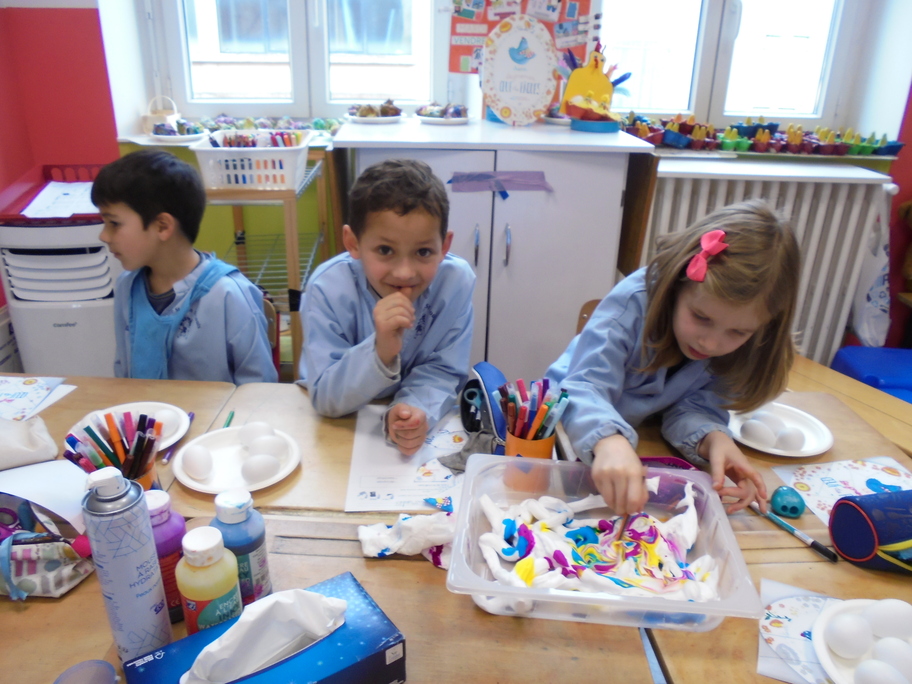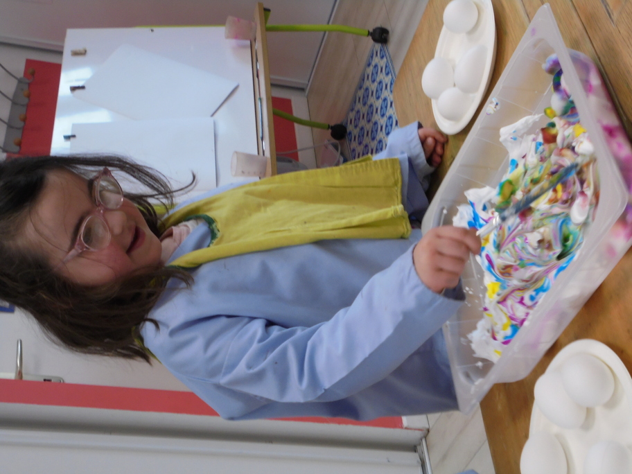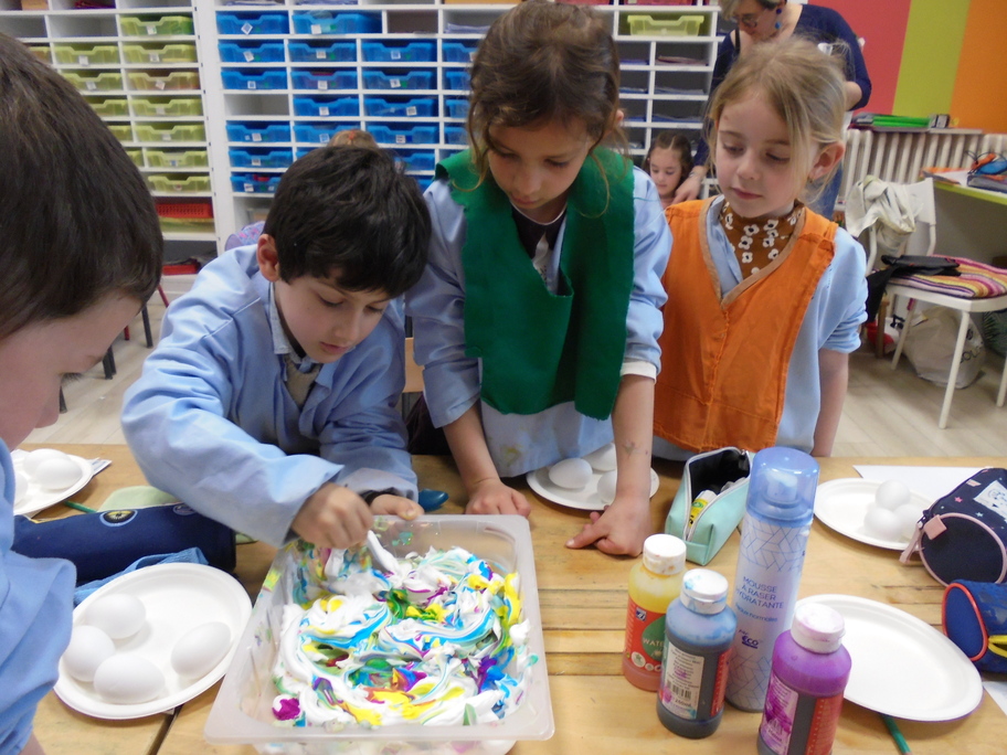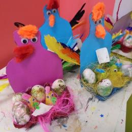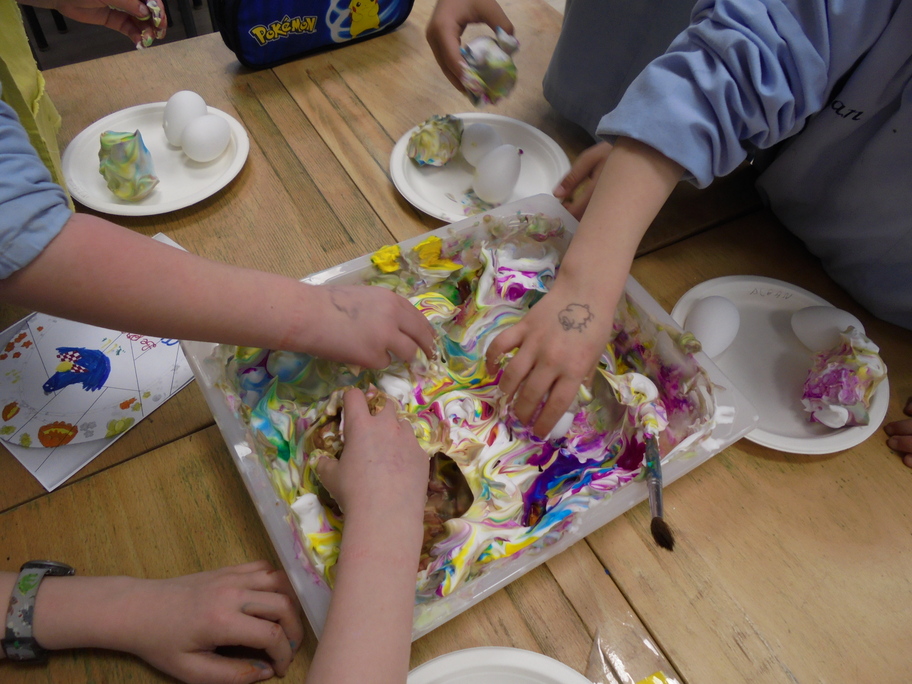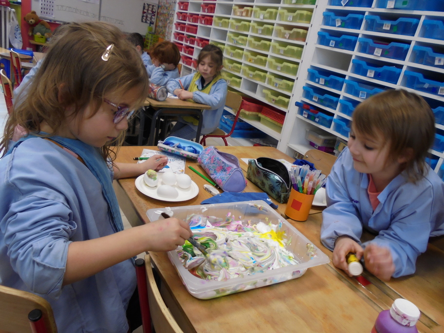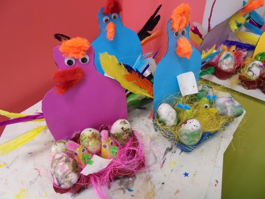 Les élèves ont peint leurs oeufs en les roulant dans de la mousse à raser colorée à l'encre. Ils ont peint puis décoré leur boîte à oeufs. Ensuite, à l'aide d'un gabarit, ils ont dessiné leur poule sur une cartoline, l'ont découpée et décorée.