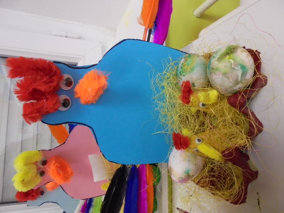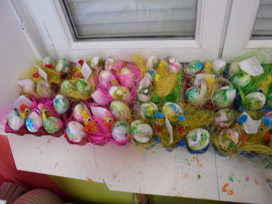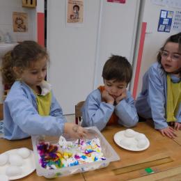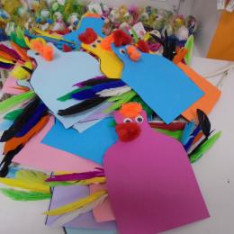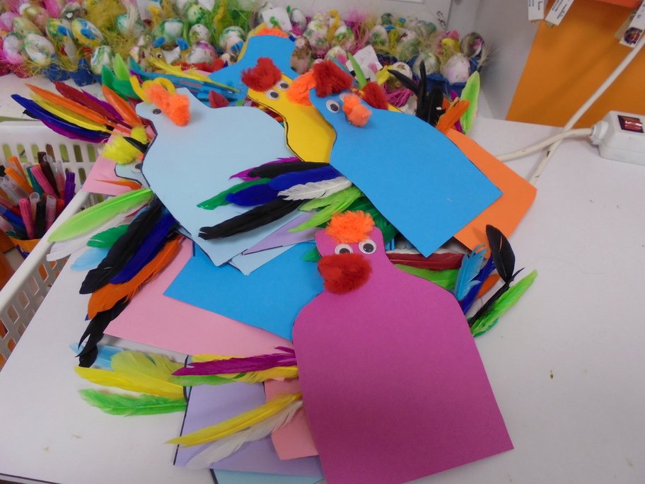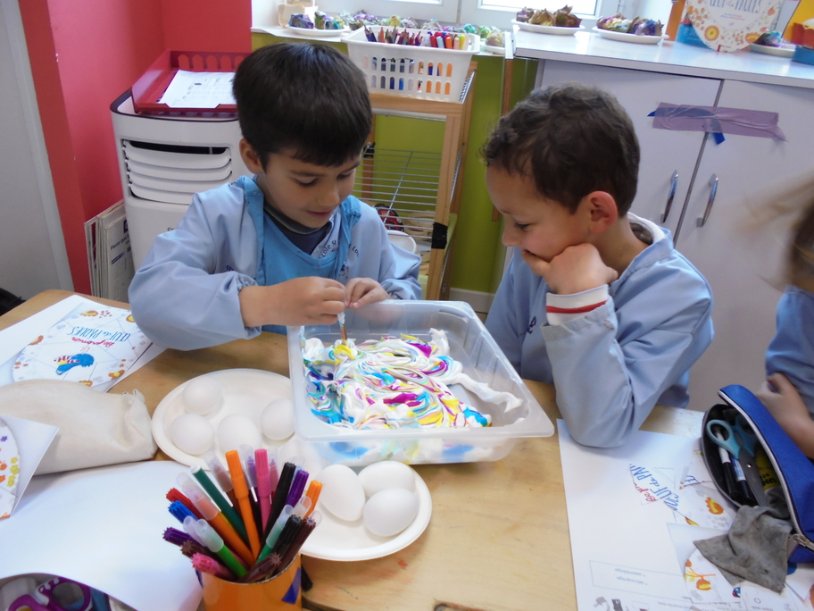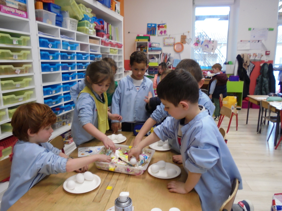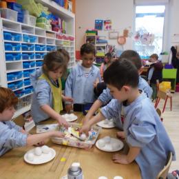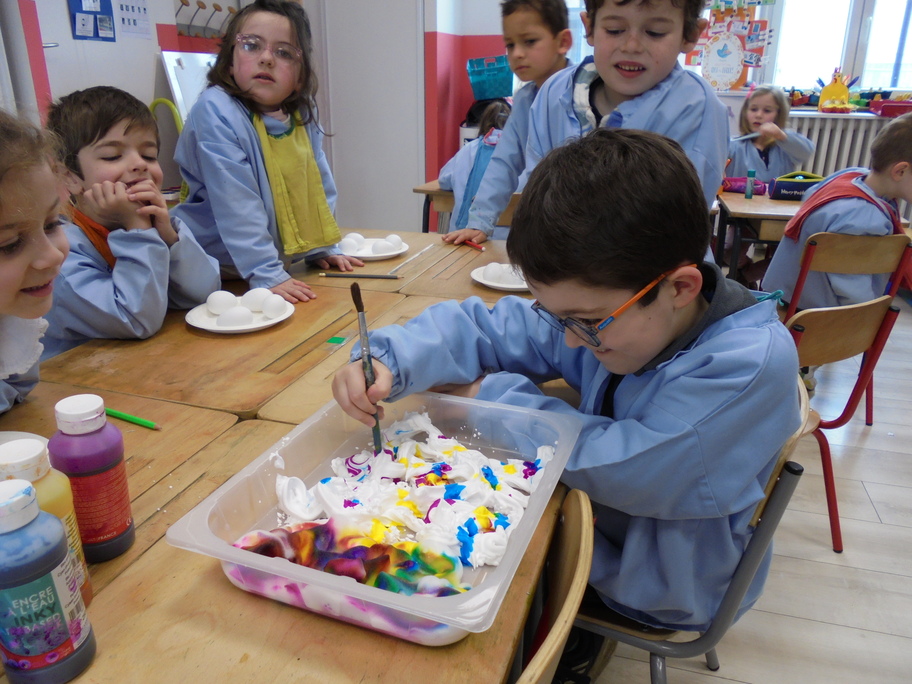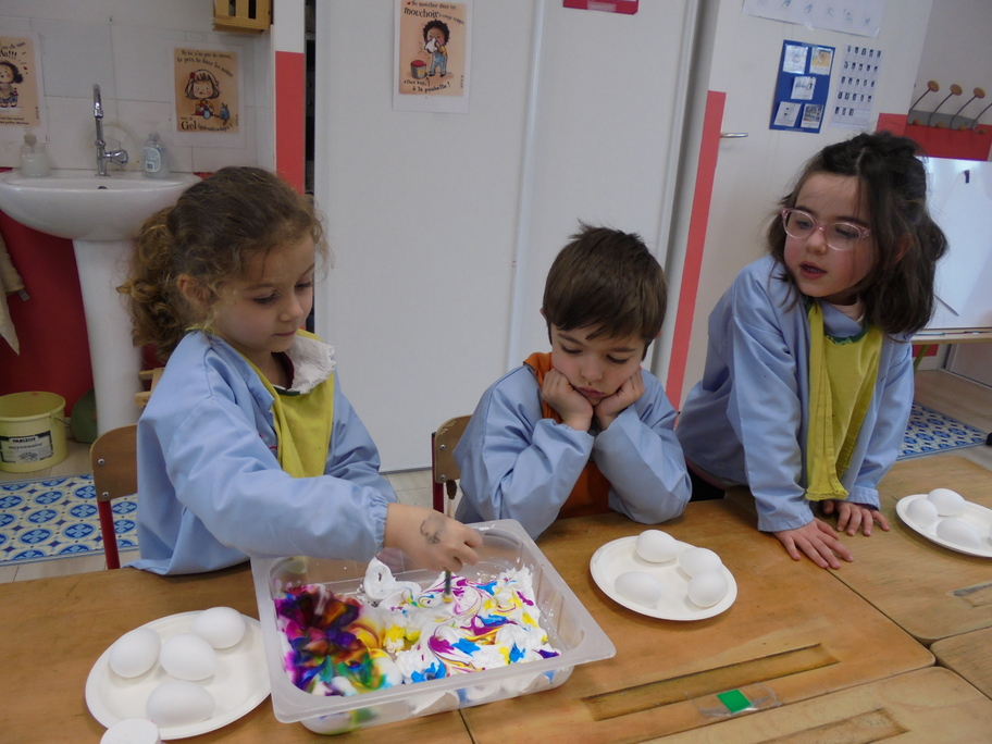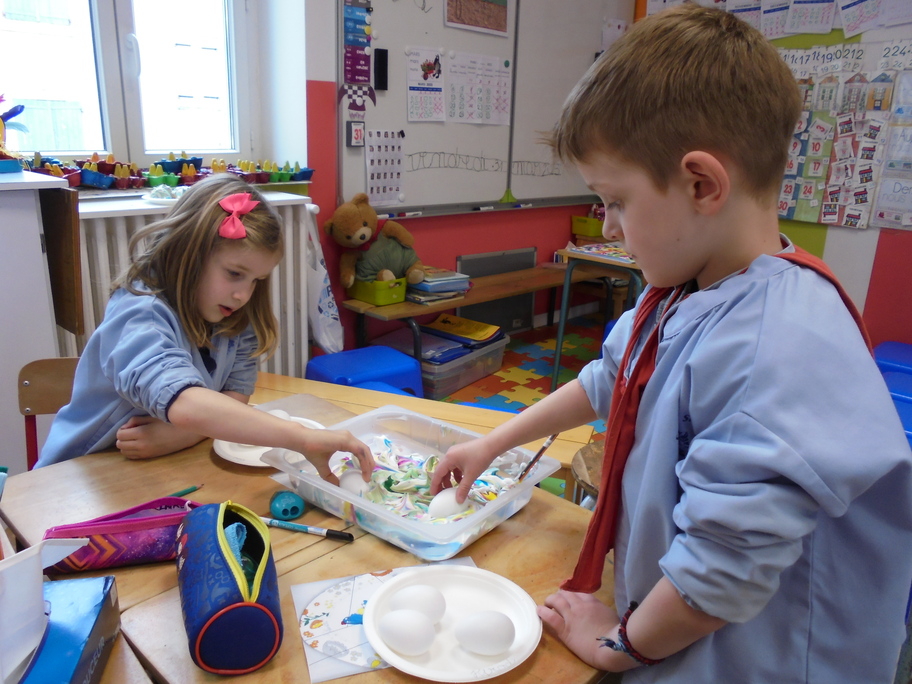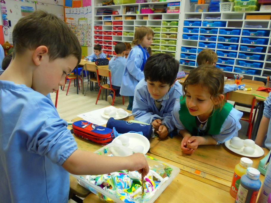 Les élèves ont peint leurs oeufs en les roulant dans de la mousse à raser colorée à l'encre. Ils ont peint puis décoré leur boîte à oeufs. Ensuite, à l'aide d'un gabarit, ils ont dessiné leur poule sur une cartoline, l'ont découpée et décorée.