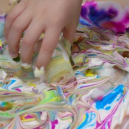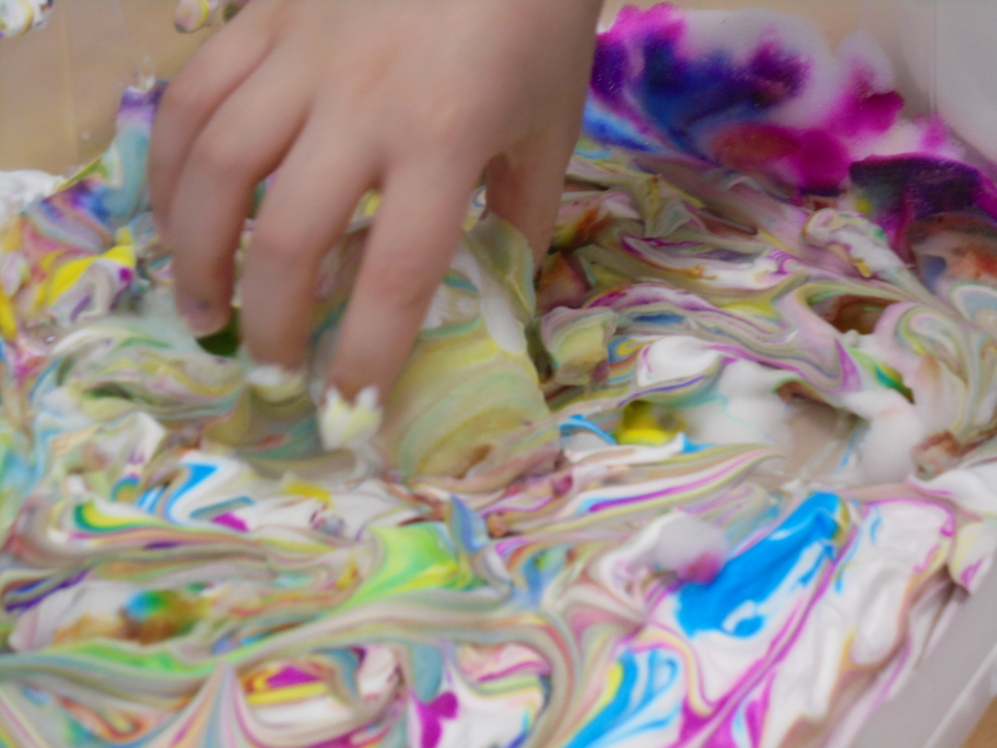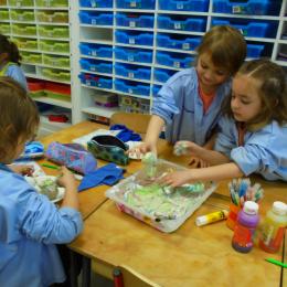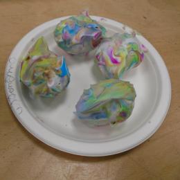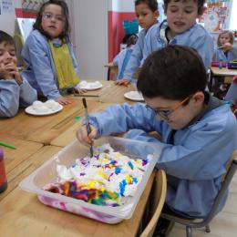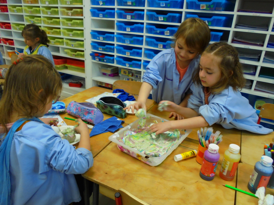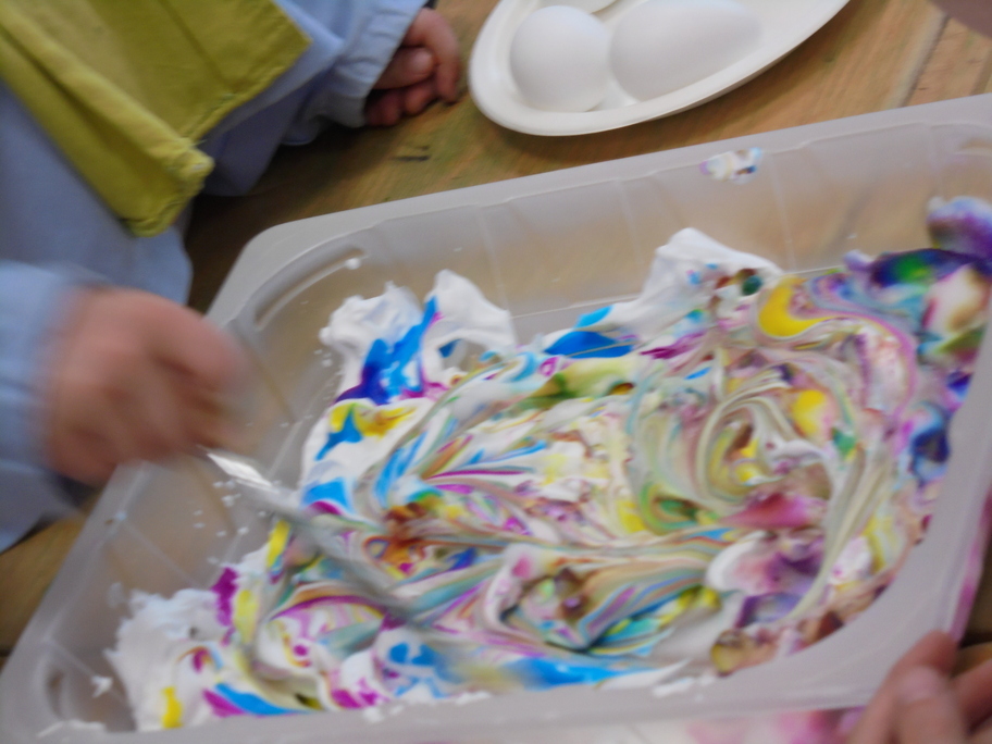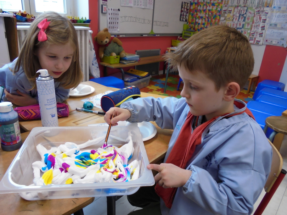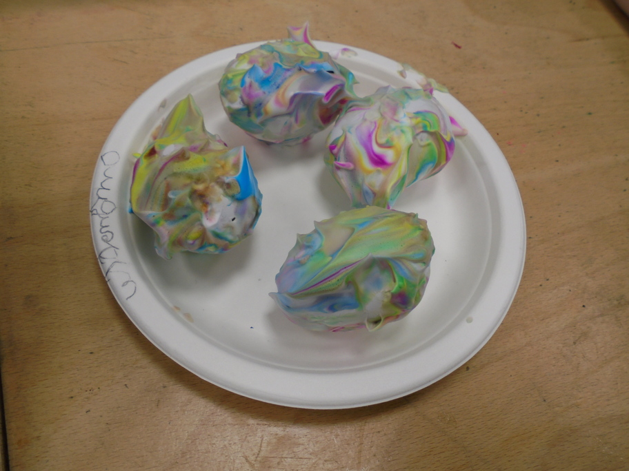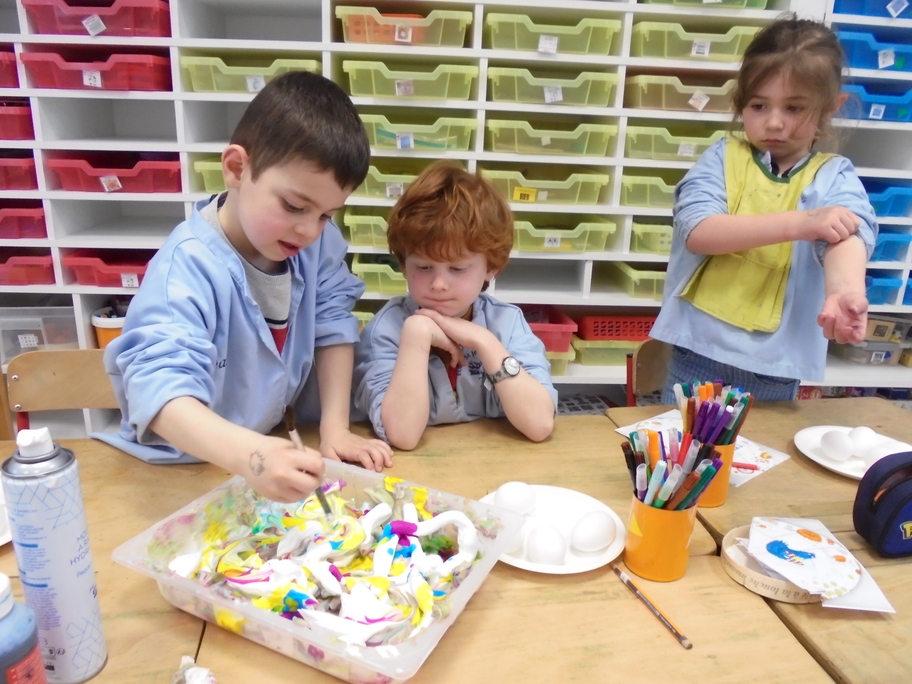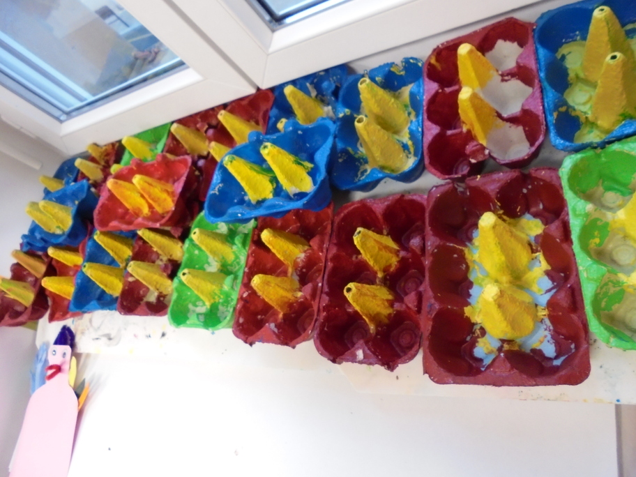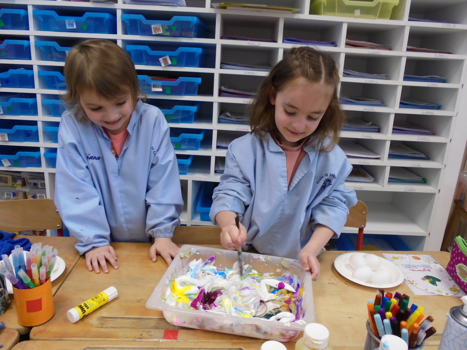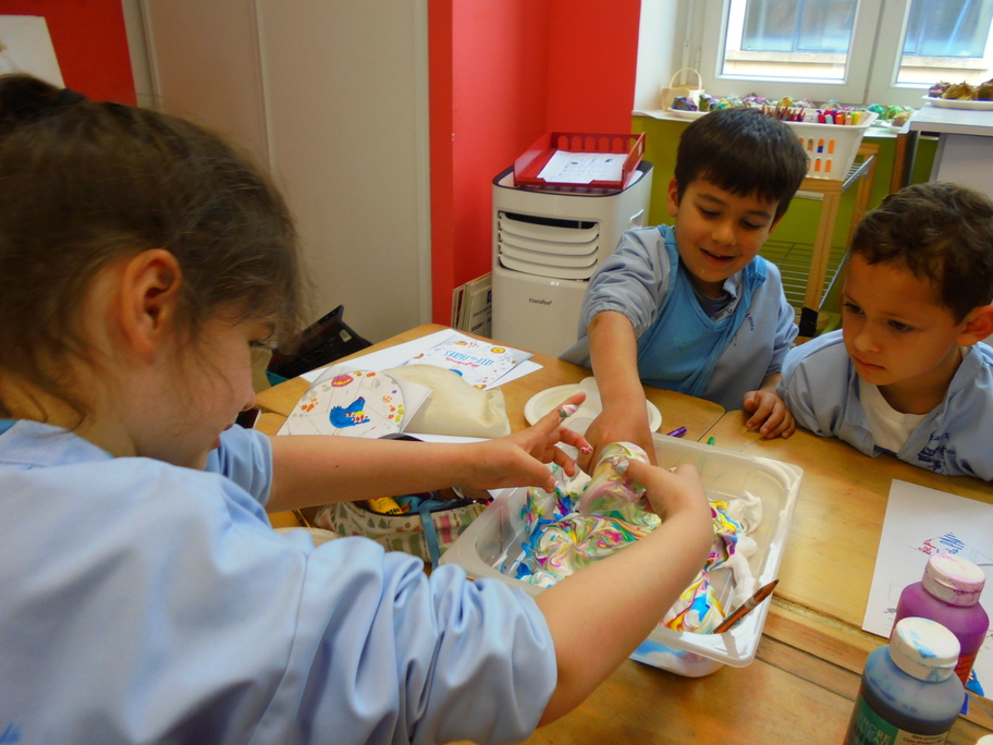 Les élèves ont peint leurs oeufs en les roulant dans de la mousse à raser colorée à l'encre. Ils ont peint puis décoré leur boîte à oeufs. Ensuite, à l'aide d'un gabarit, ils ont dessiné leur poule sur une cartoline, l'ont découpée et décorée.