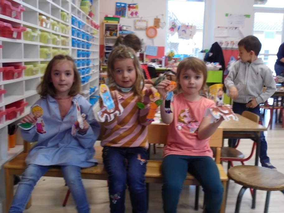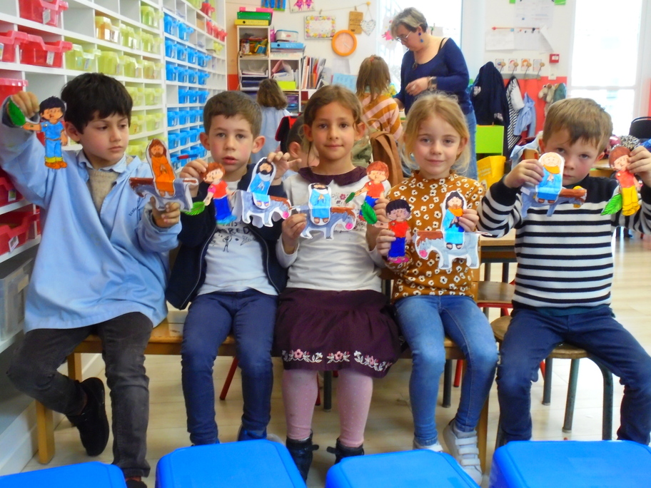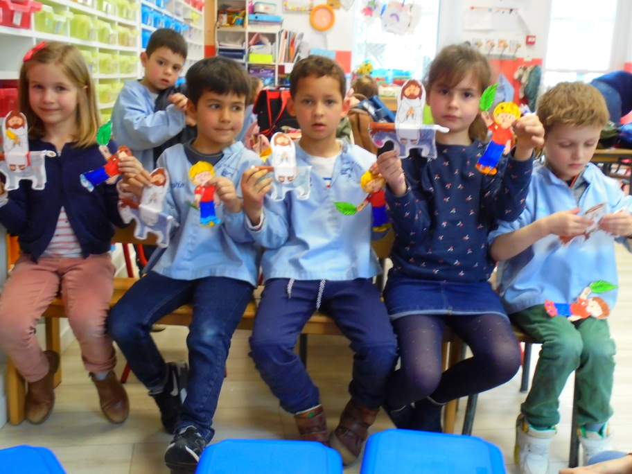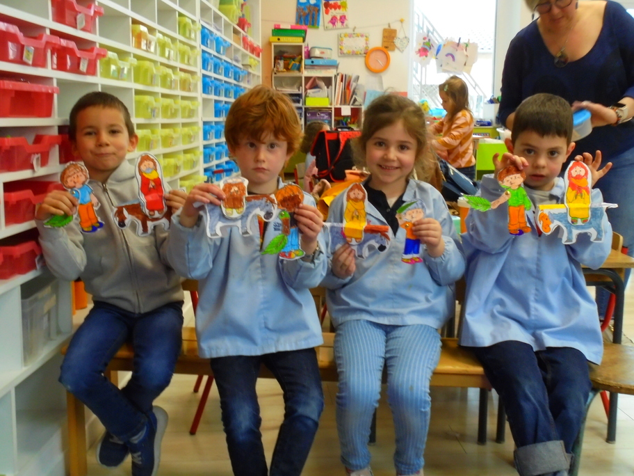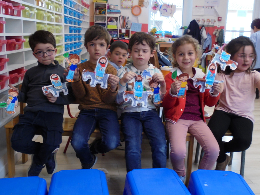 Après avoir expliqué ces évènements par les diverses lectures, les élèves ont pu se fabriquer un petit personnage agitant son rameau lors du passage de Jésus sur son âne.