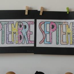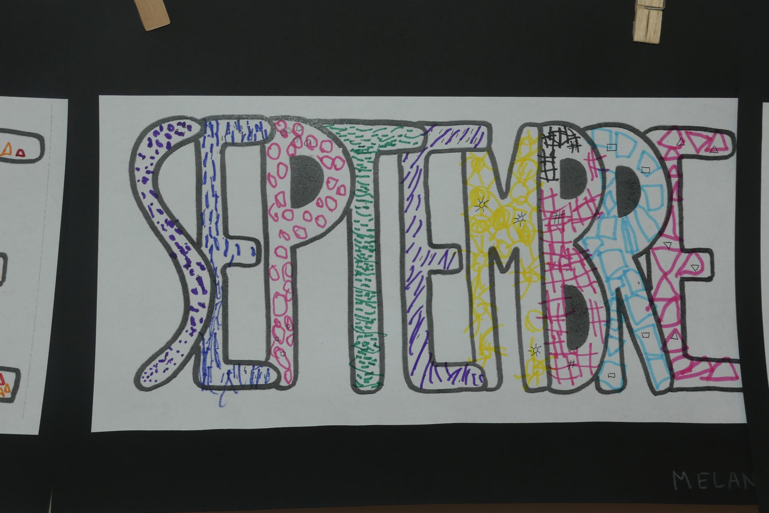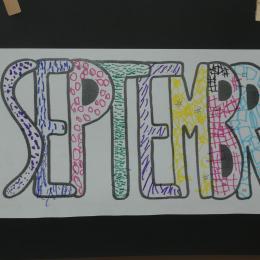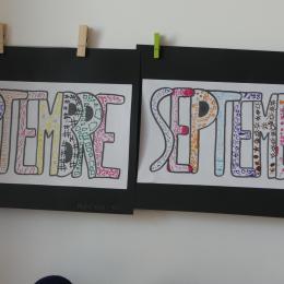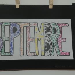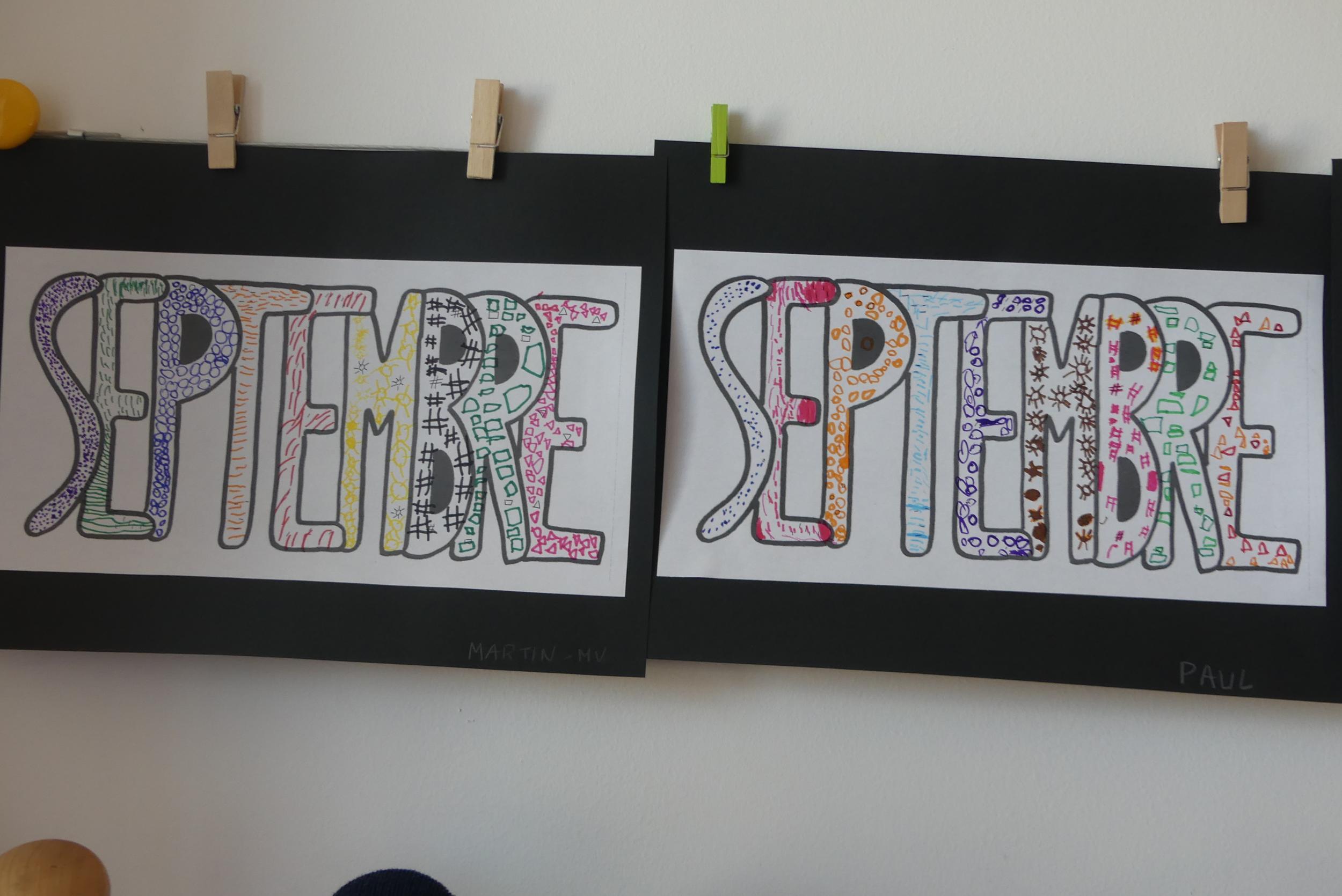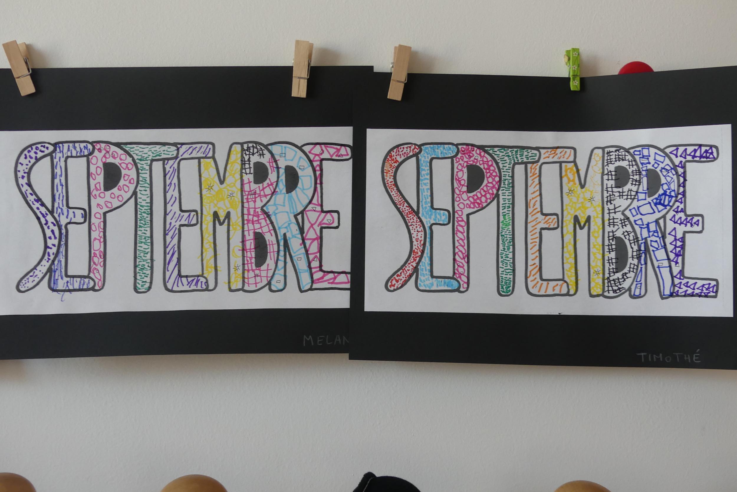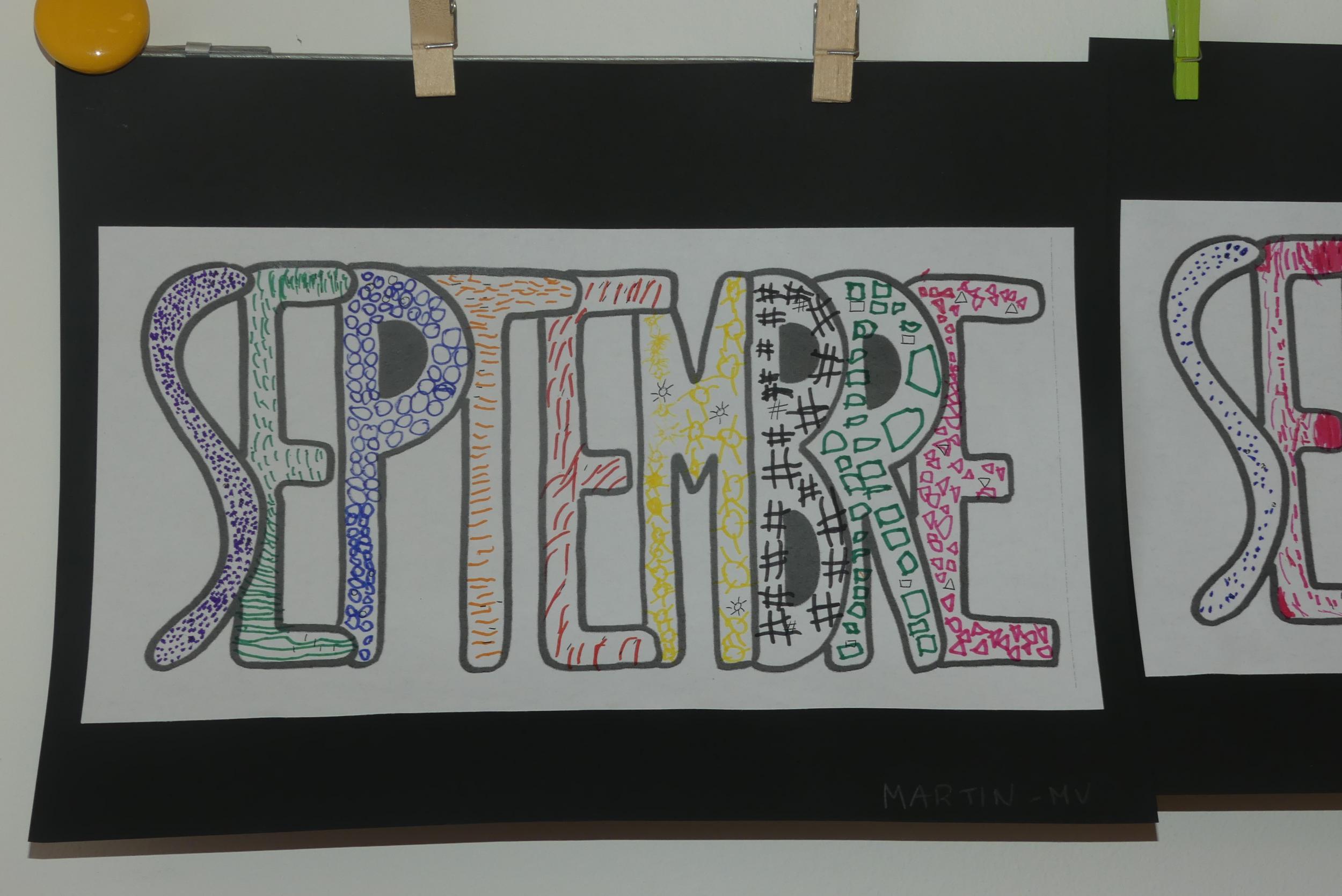 Il est important que les apprentissages aient du sens pour les élèves. en graphisme, après quelques entrainements, les élèves ont décoré les lettres évidées du mot "septembre" avec des graphismes divers pour lier l'acte graphique et l'habileté à une production plastique mise en valeur par un collage sur fond noir.