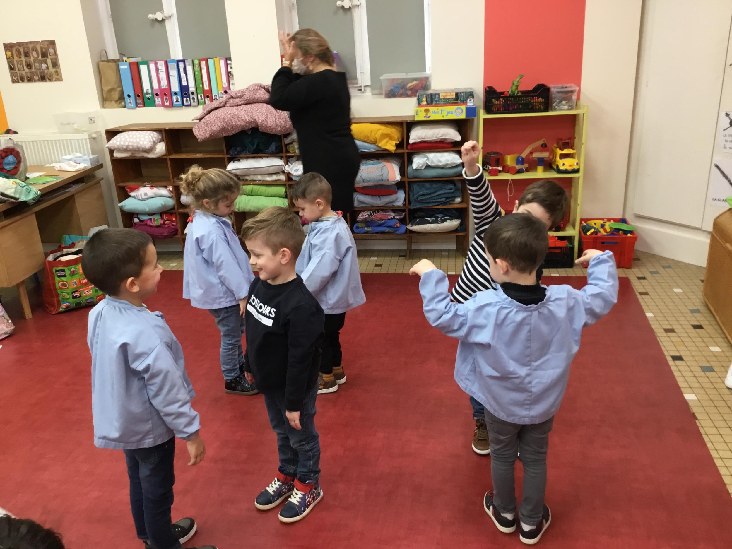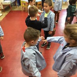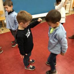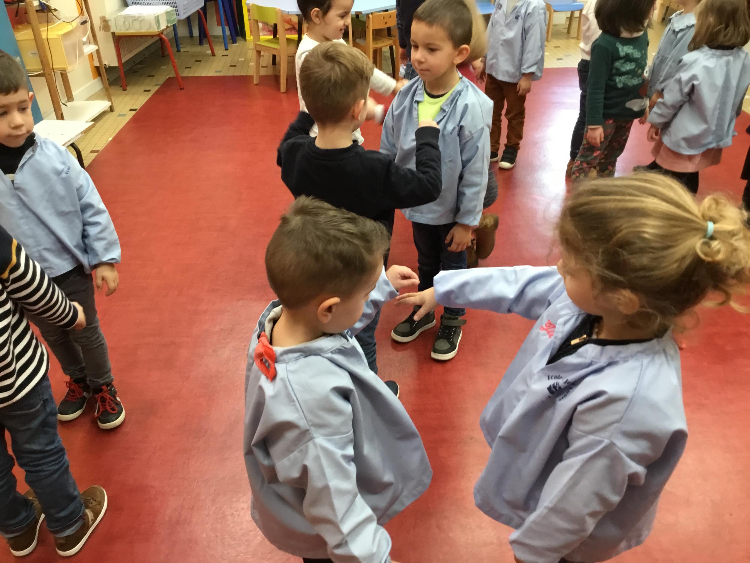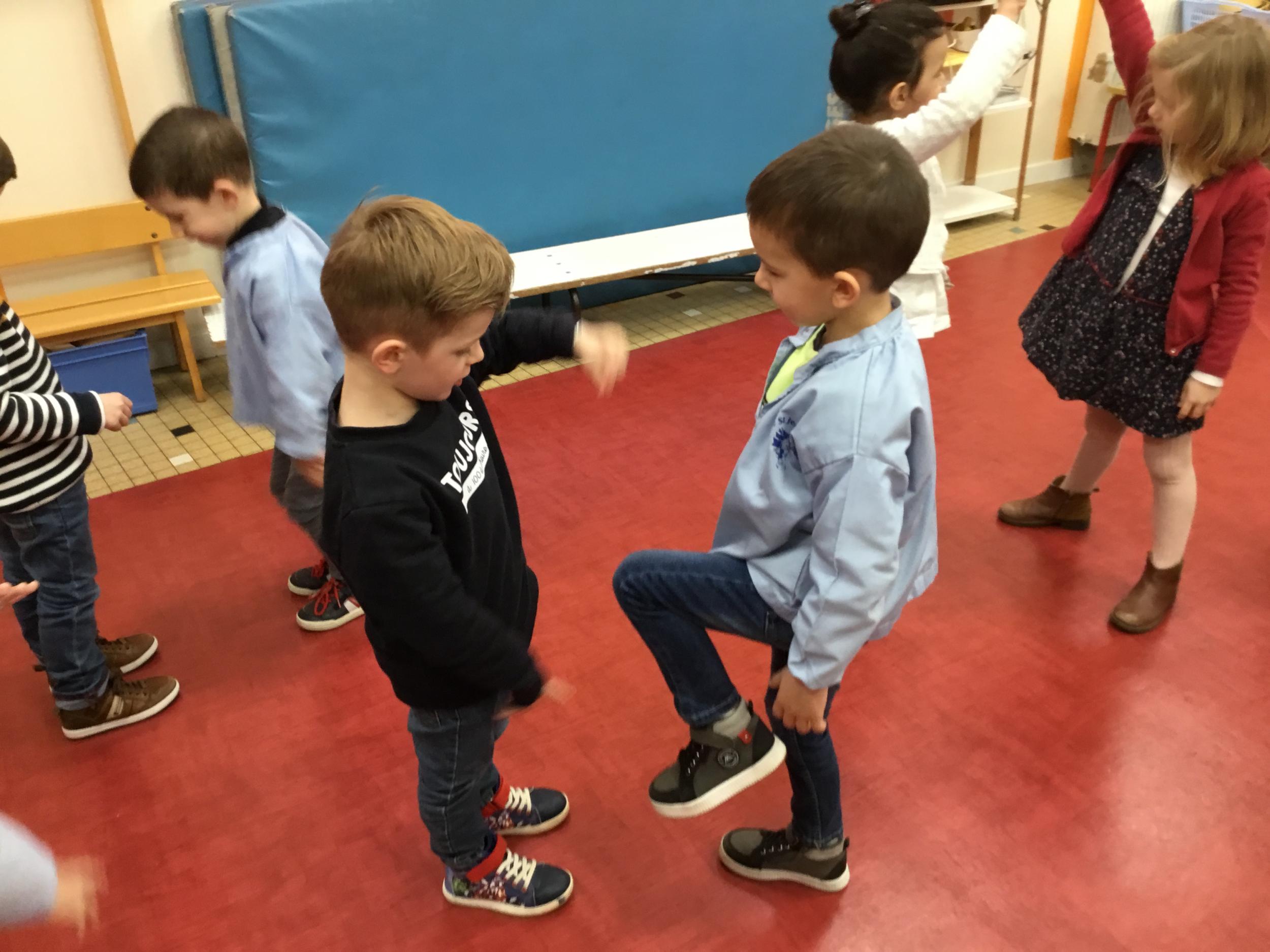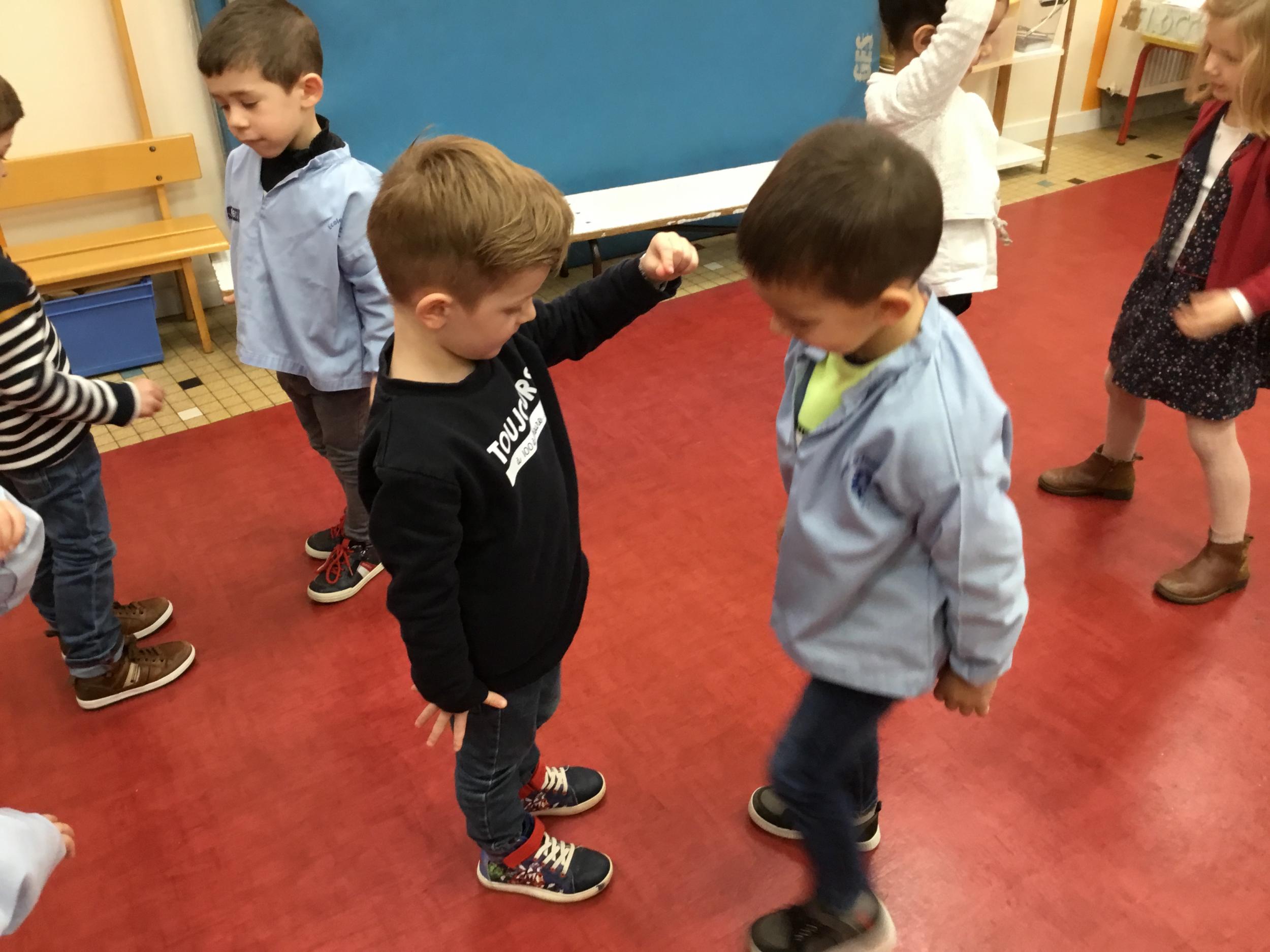 Les enfants jouent au jeu du marionnettiste. Ils se mettent en binôme, l’un fait le rôle de la marionnette et l’autre du marionnettiste. On imagine des ficelles accrochées aux poignets et aux pieds des élèves dans le rôle de la marionnette . Ils se laissent guider par le marionnettiste qui leur fait lever les bras ou les pieds en tirant sur la ficelle.Ce jeu oblige les enfants à prendre en compte l’autre . Il permet une relation attentive entre les enfants. Puis on permute et on change les rôles.