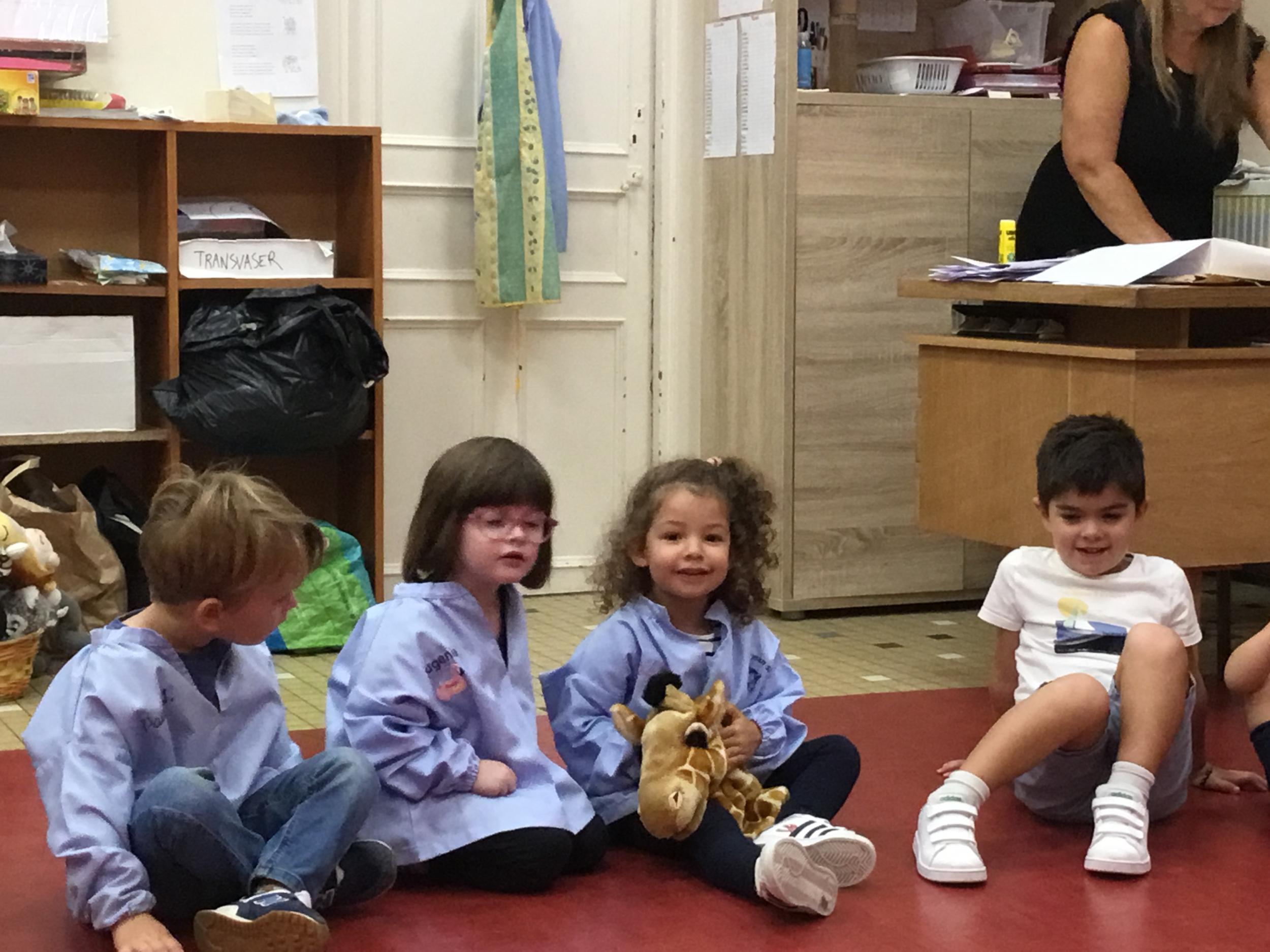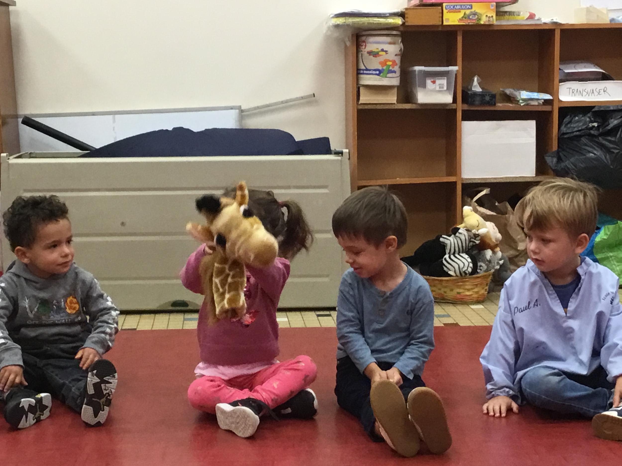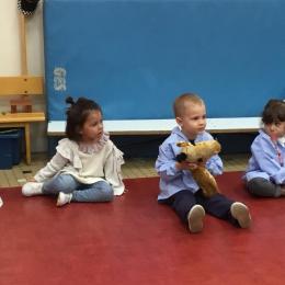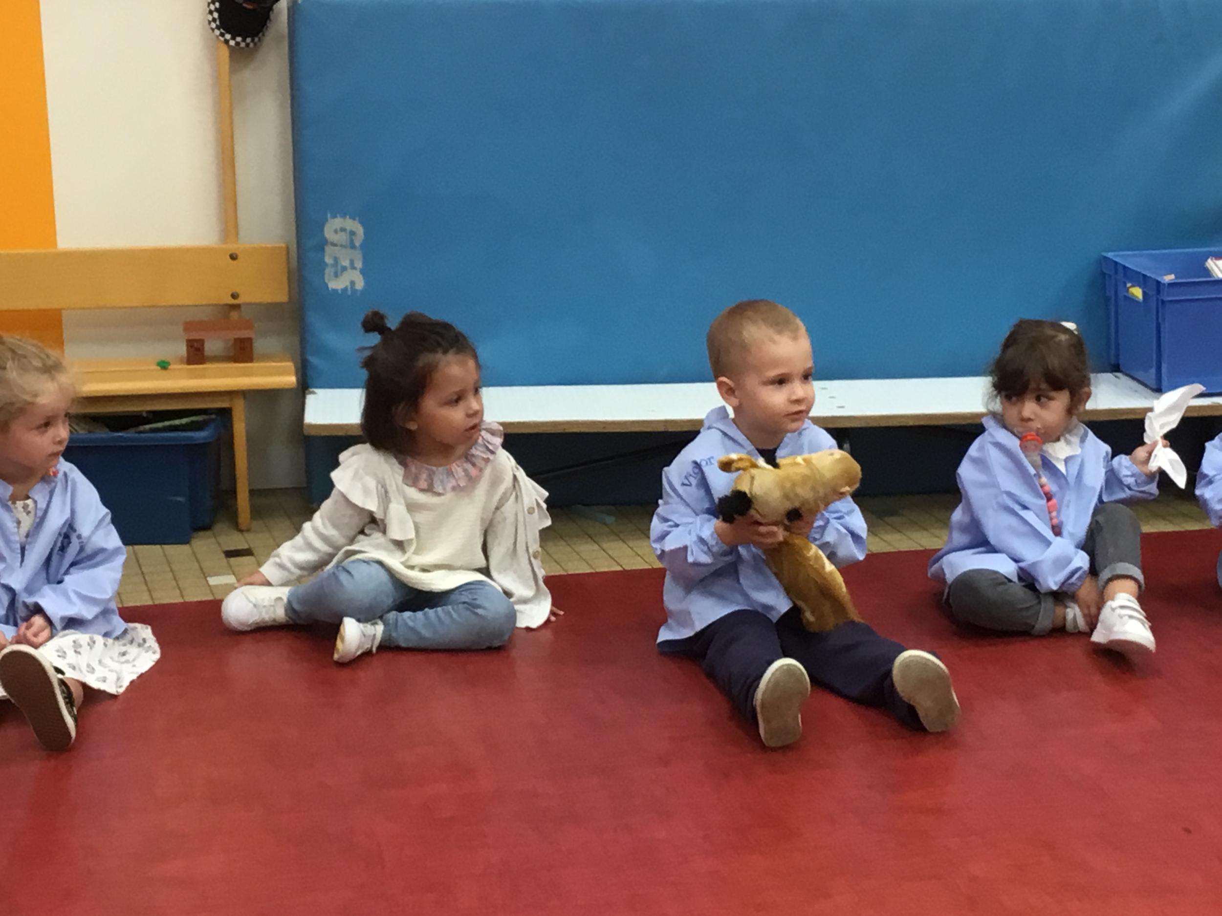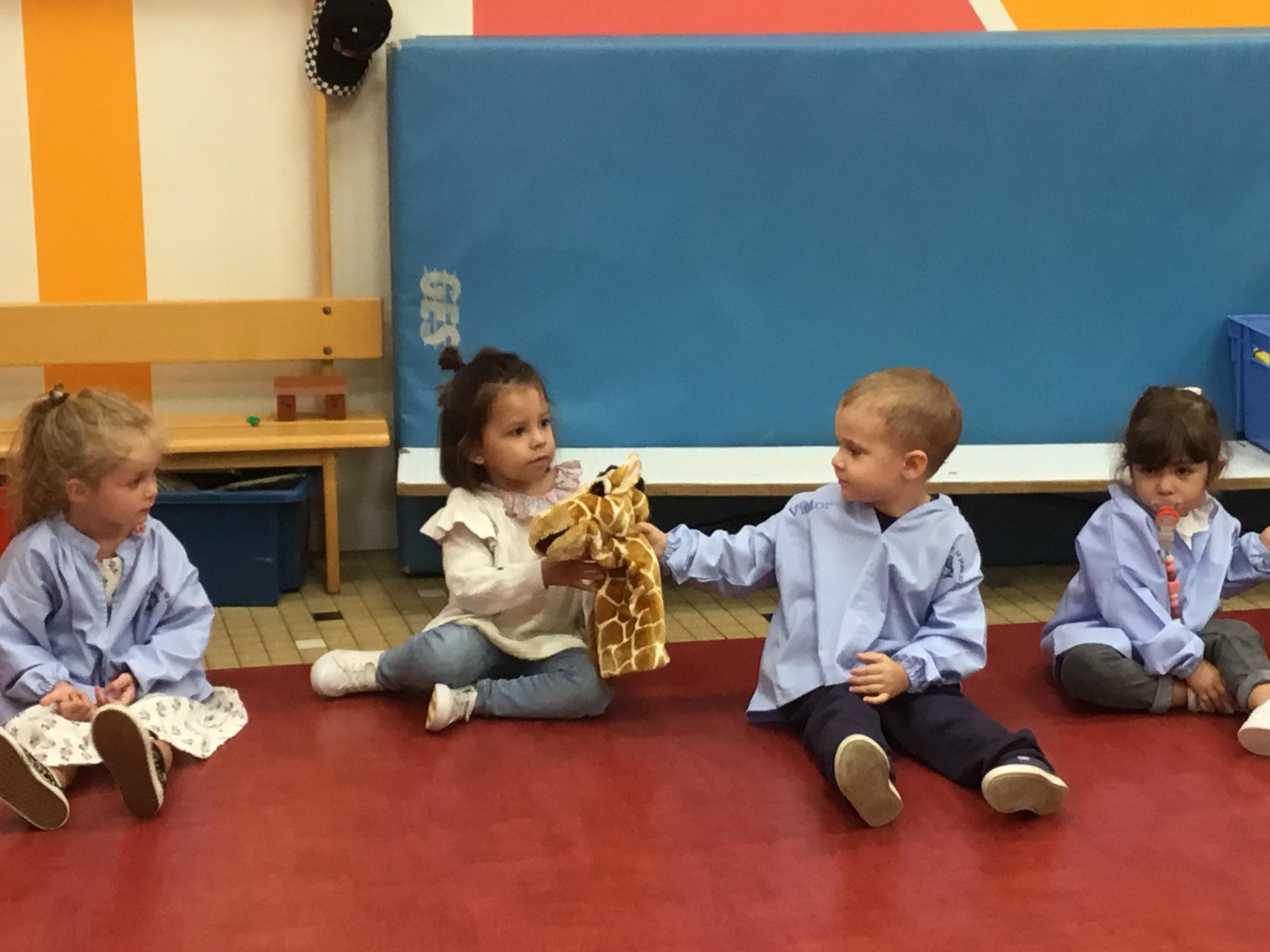 Chaque enfant a pris Gigi dans ses bras pour lui dire son prénom, puis Gigi est passée de bras en bras , en étant bien attentif à regarder son voisin en lui donnant la peluche.