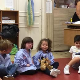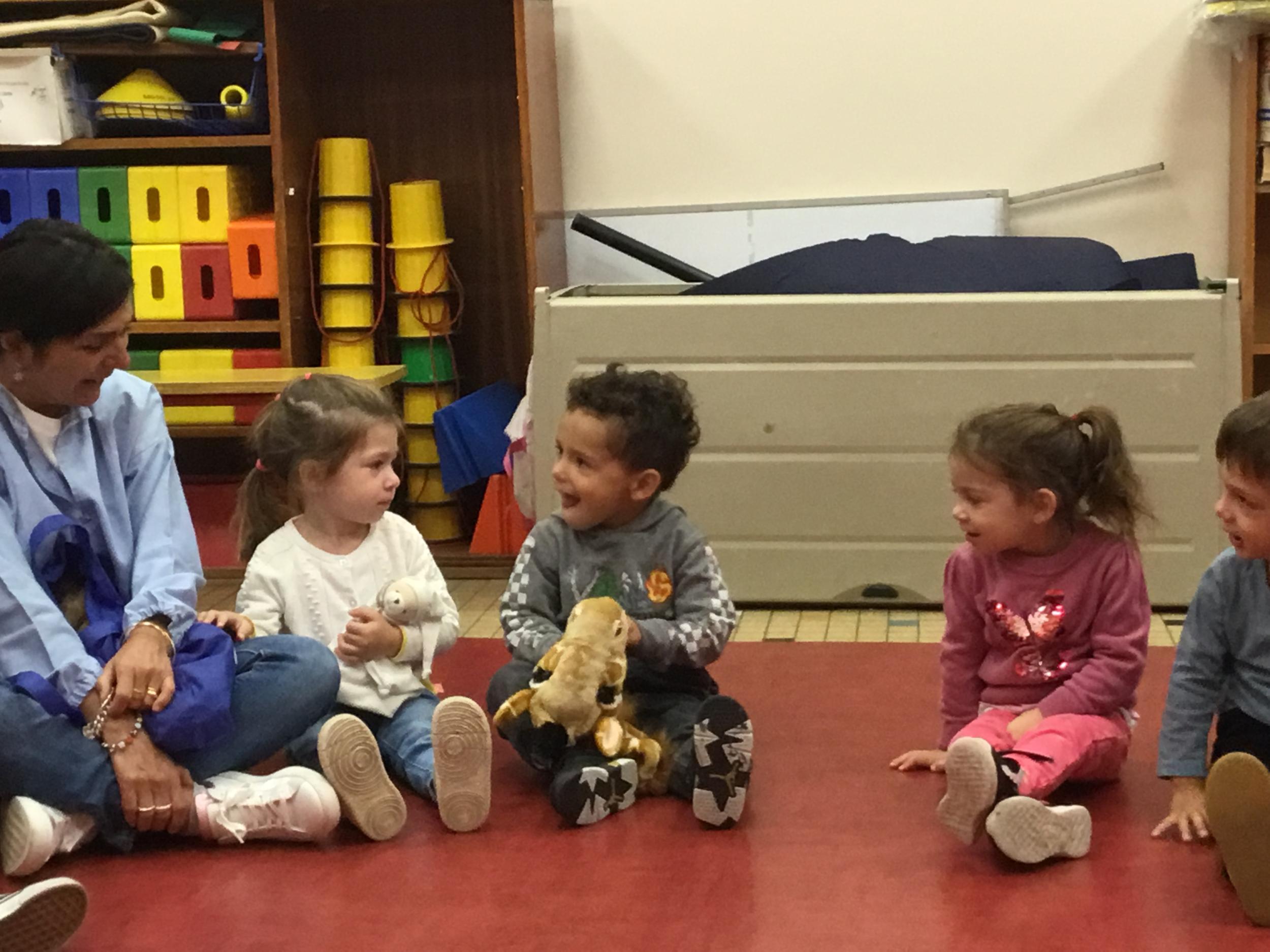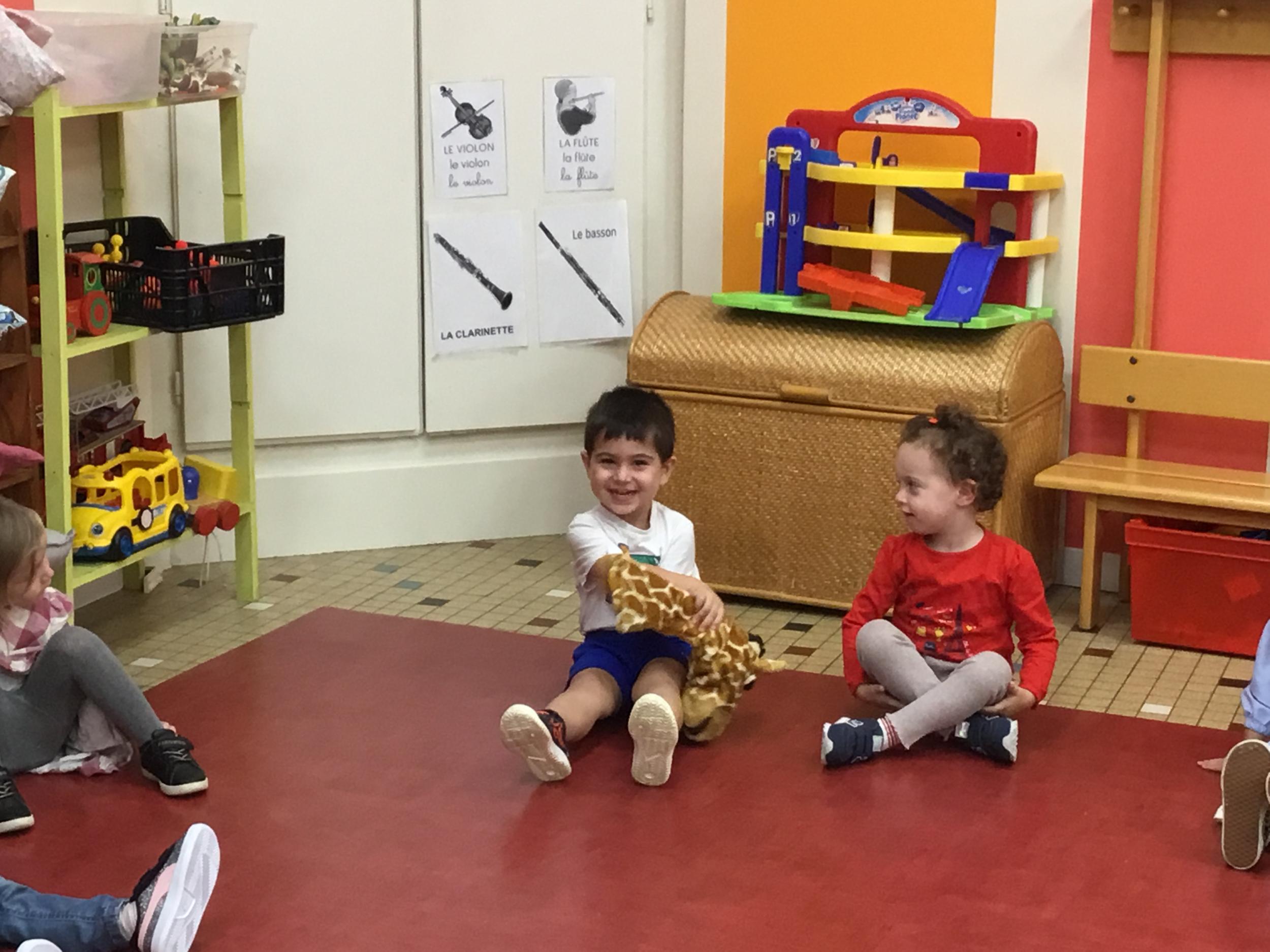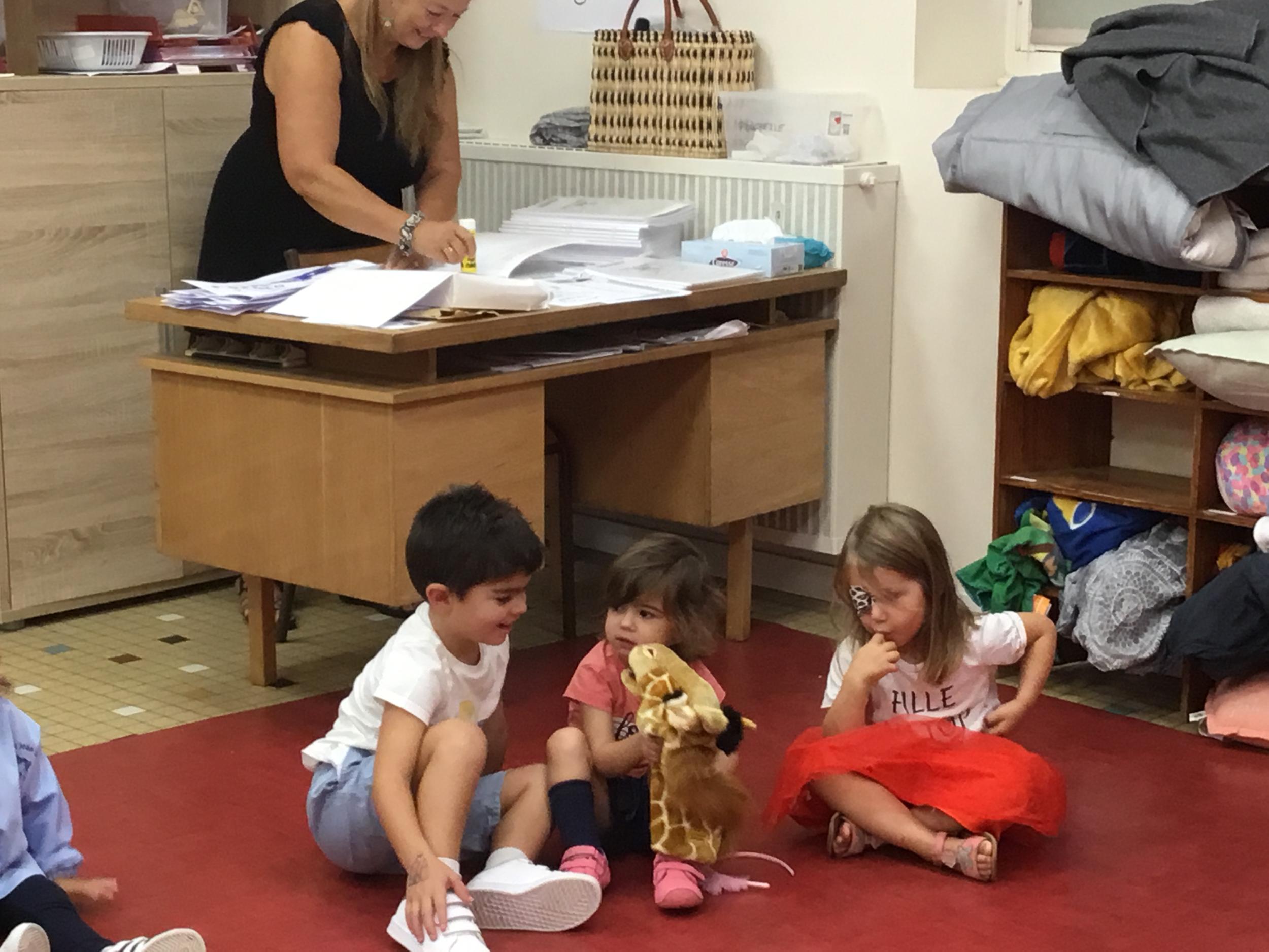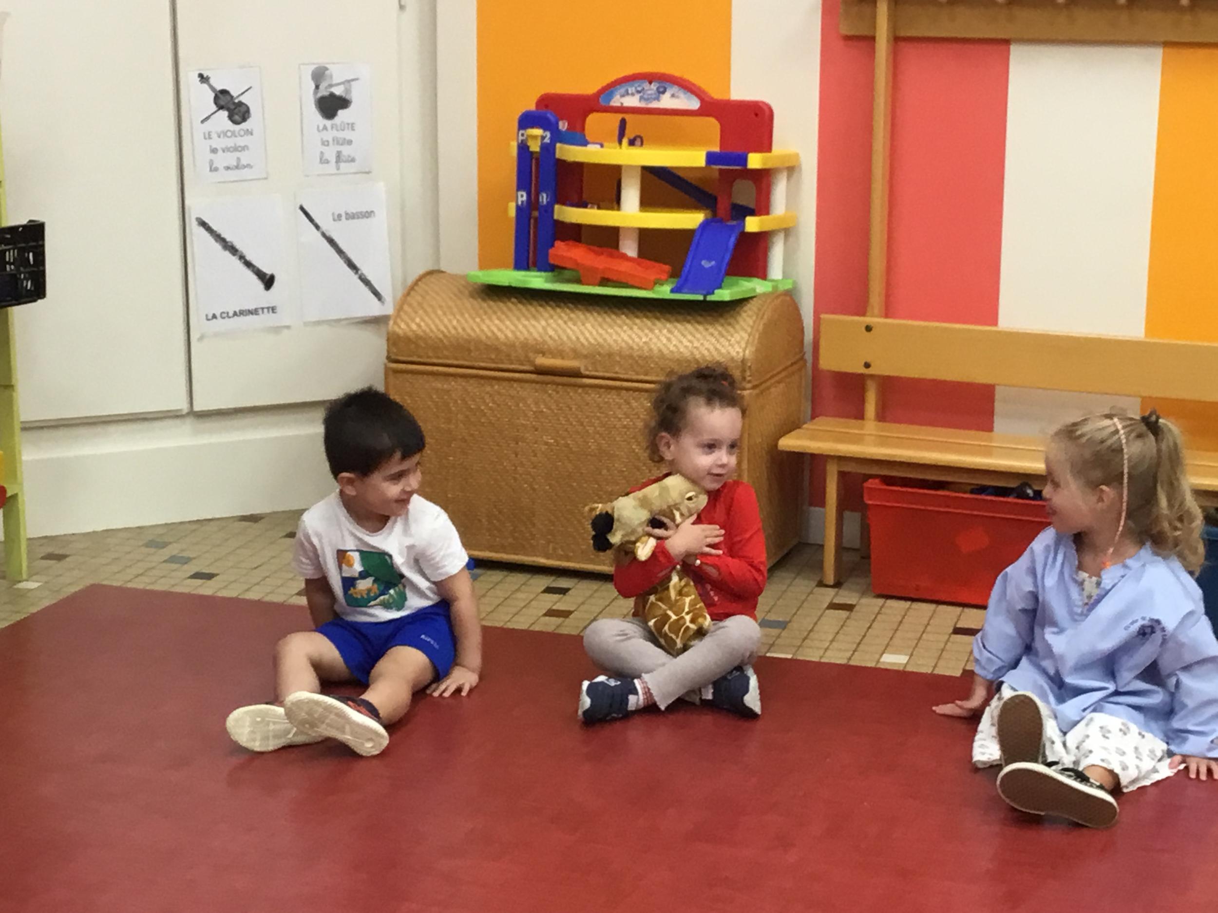 Chaque enfant a pris Gigi dans ses bras pour lui dire son prénom, puis Gigi est passée de bras en bras , en étant bien attentif à regarder son voisin en lui donnant la peluche.