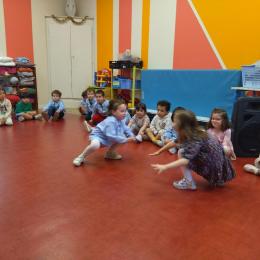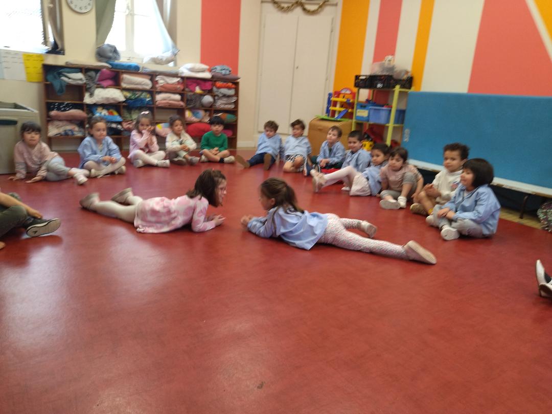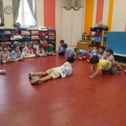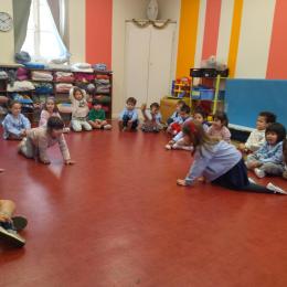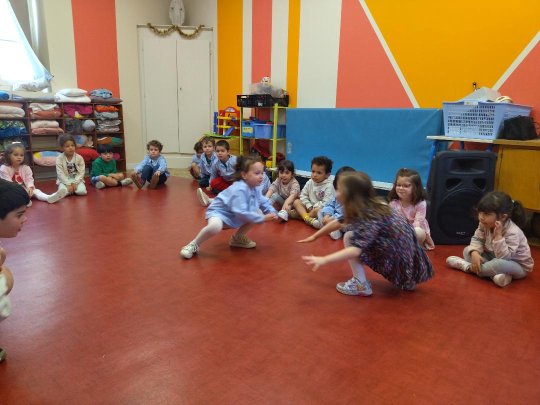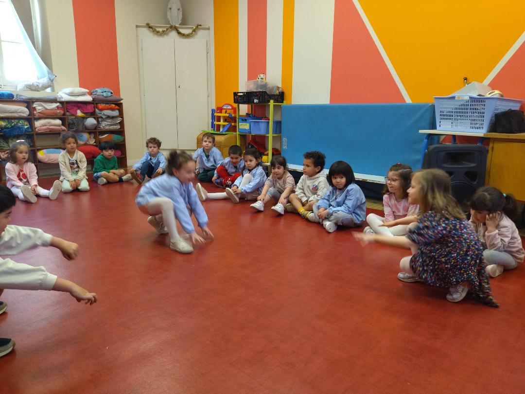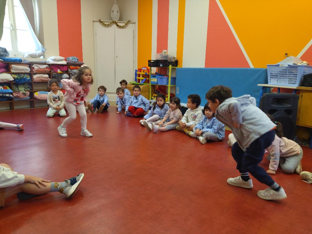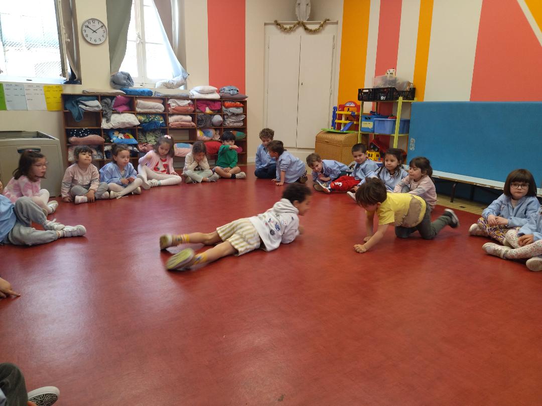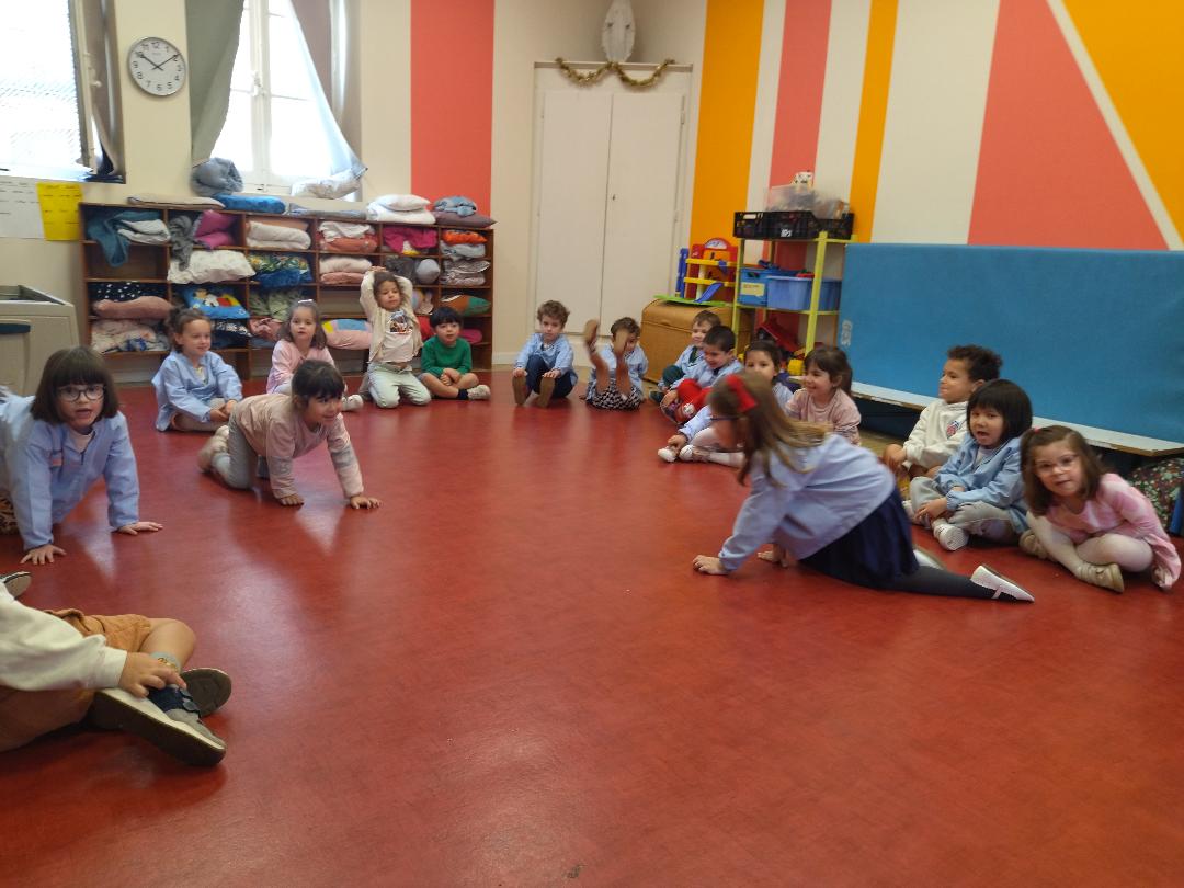 10/04/2025 En groupe classe , en cercle , les enfants devaient changer de place en se croisant et en imitant un animal sans oublier de se dire bonjour.
