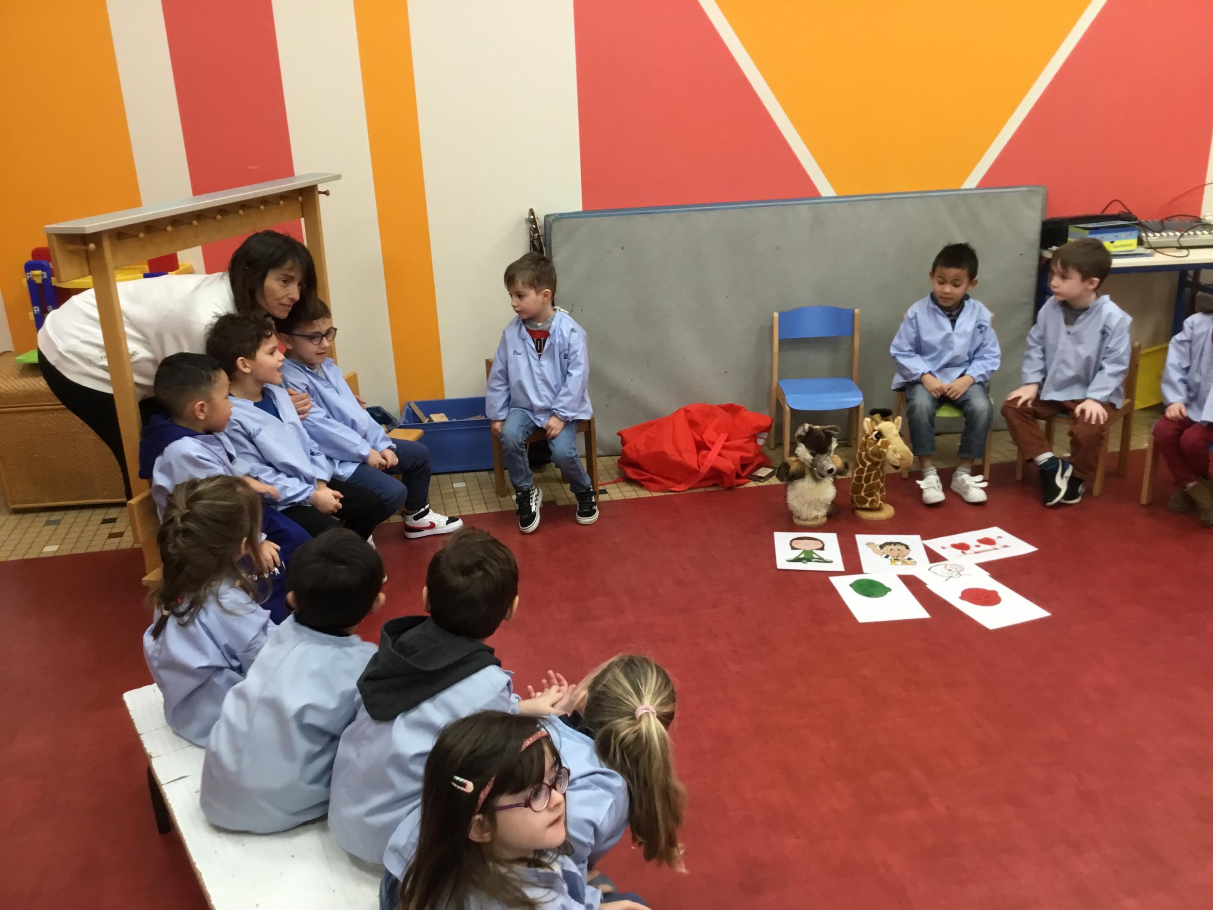 Petite et moyenne section 27/01/2024 Stéphanie a appris aux élèves à énoncer oralement un message clair en cas de conflit entre élèves par l’intermédiaire de Gigi et Loulou les marionnettes .