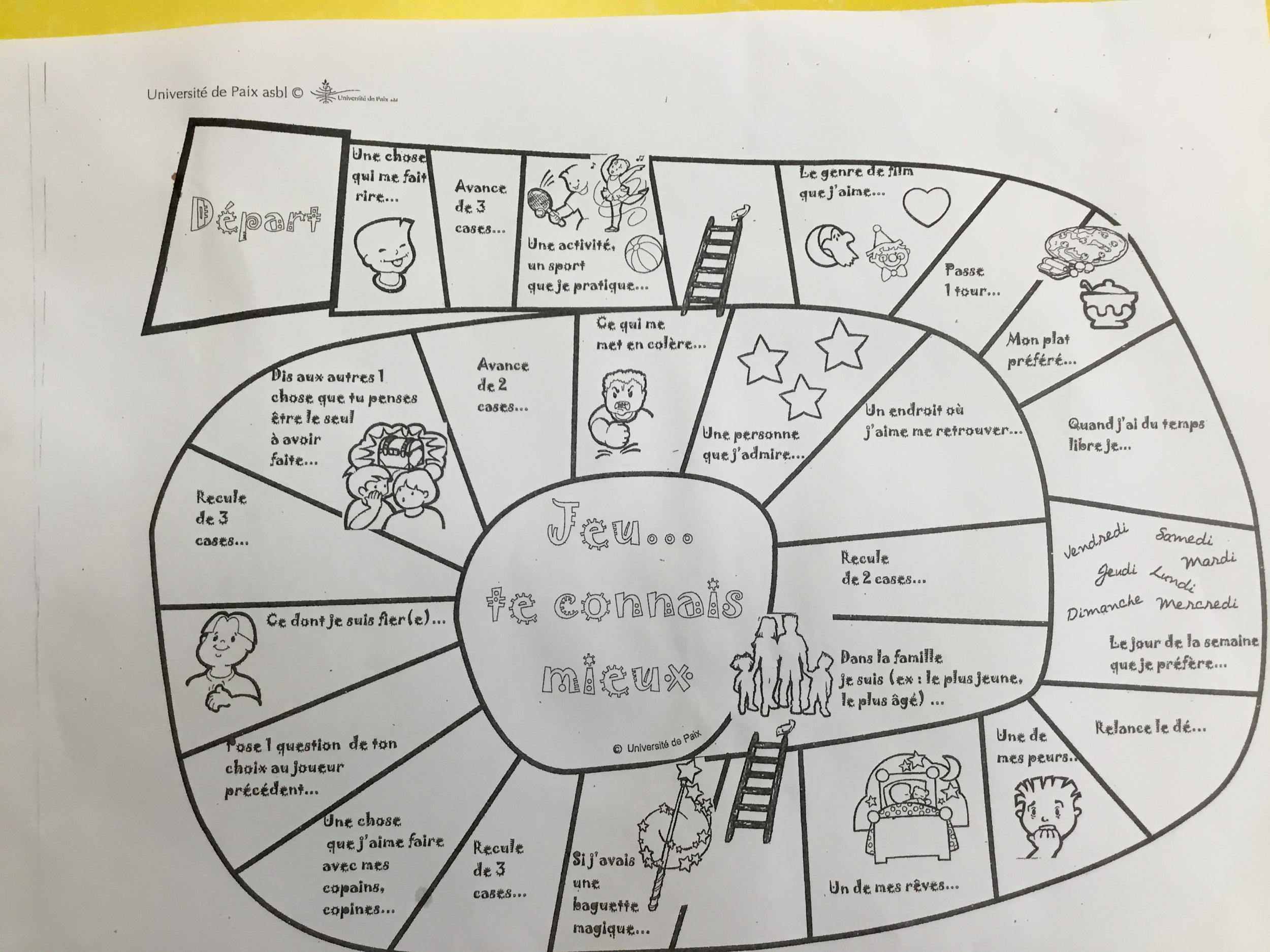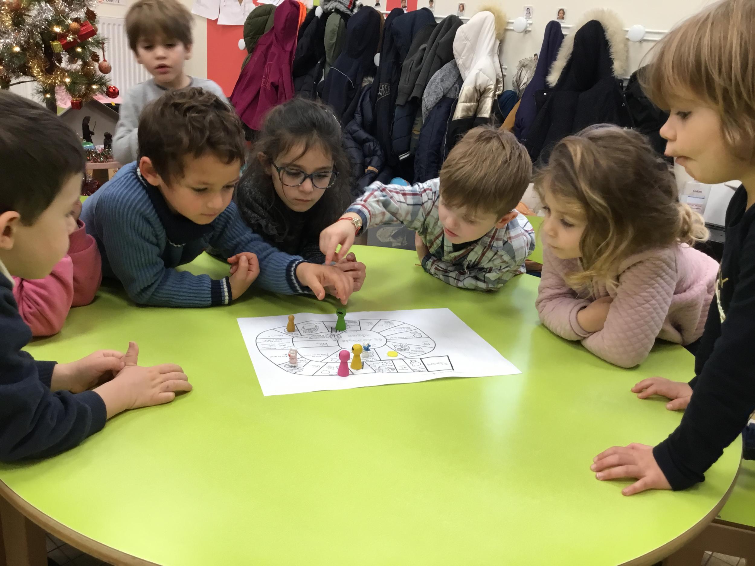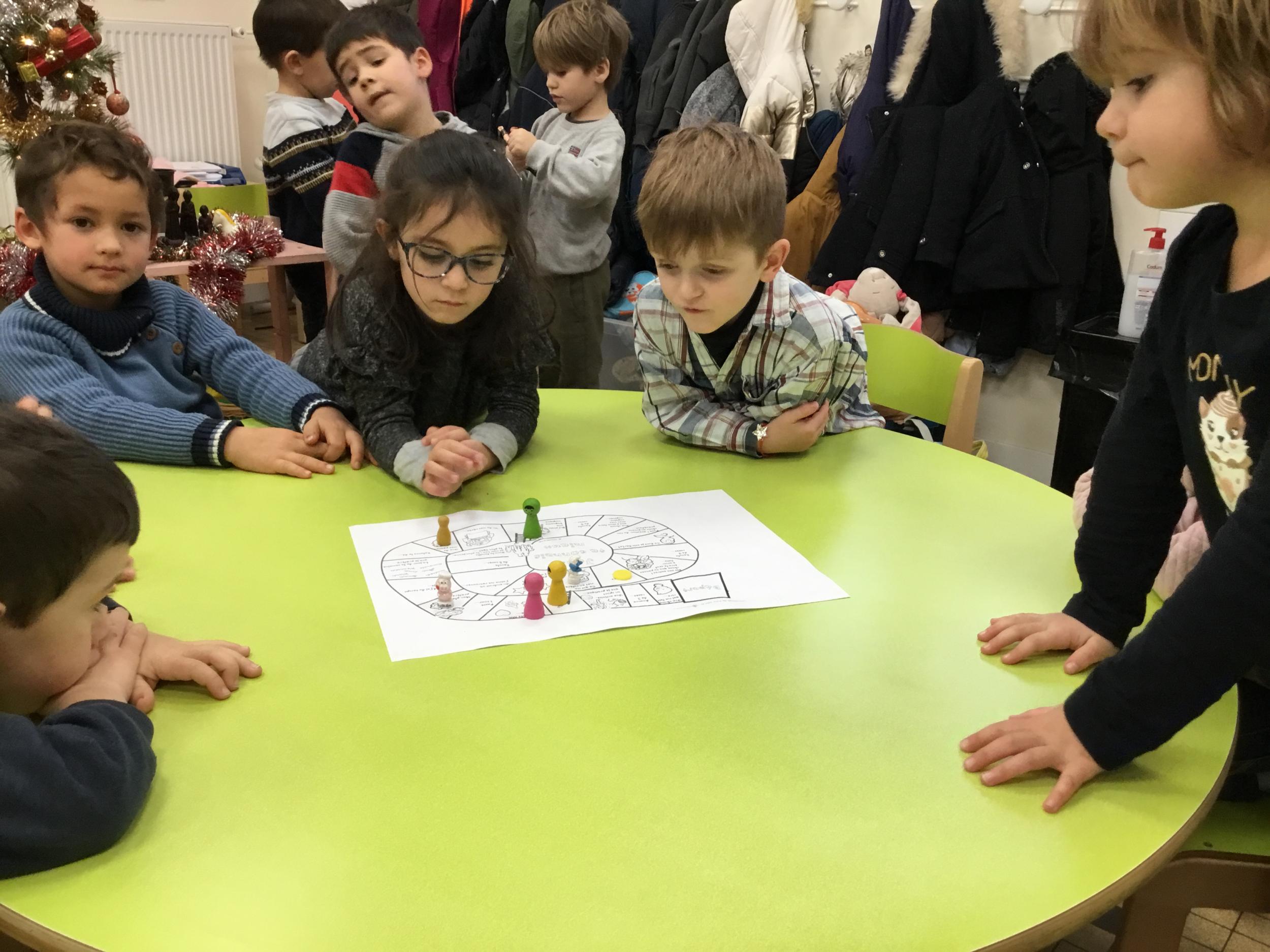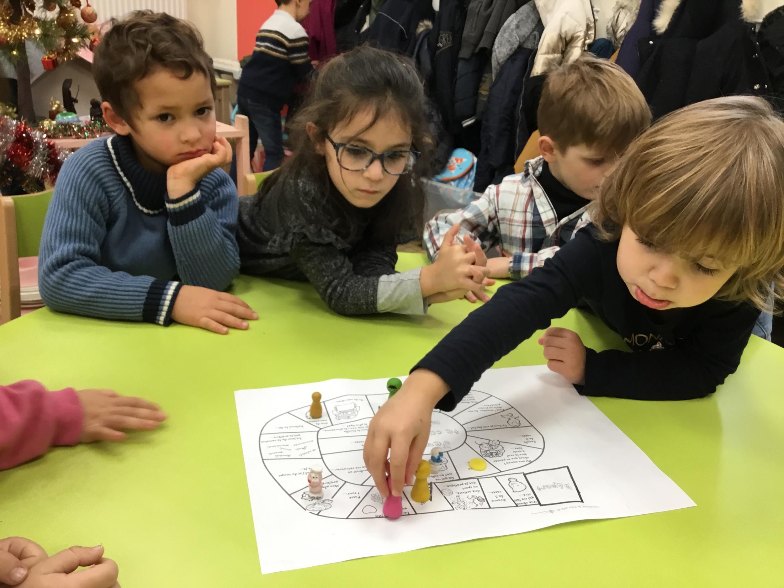 Vendredi 10 Décembre et aussi durant le premier semestre nous avons fait des jeux d’éducation à la relation . Nous jouons au jeu du marché, il s’agit d’un jeu d’ouverture à l’autre, d’ecoute, de decentration de mémoire et de concentration. Les enfants sont très attentifs et aiment beaucoup ce jeu.Aussi nous jouons à un jeu de l’oie pour apprendre à s’exprimer oralement sur ses goûts et ses émotions. Il nous permet de mieux connaître l’autre et de s’y intéressé.
