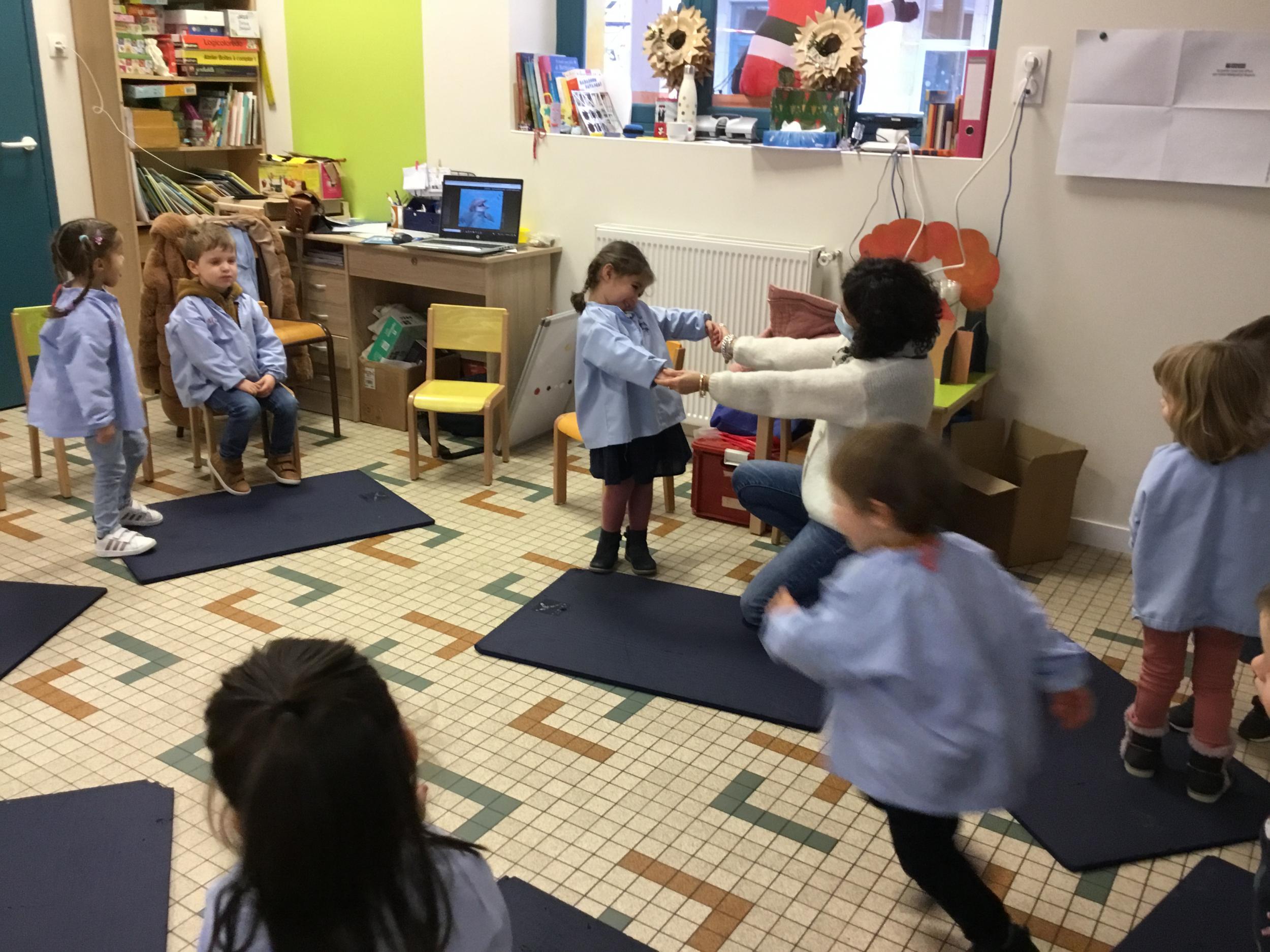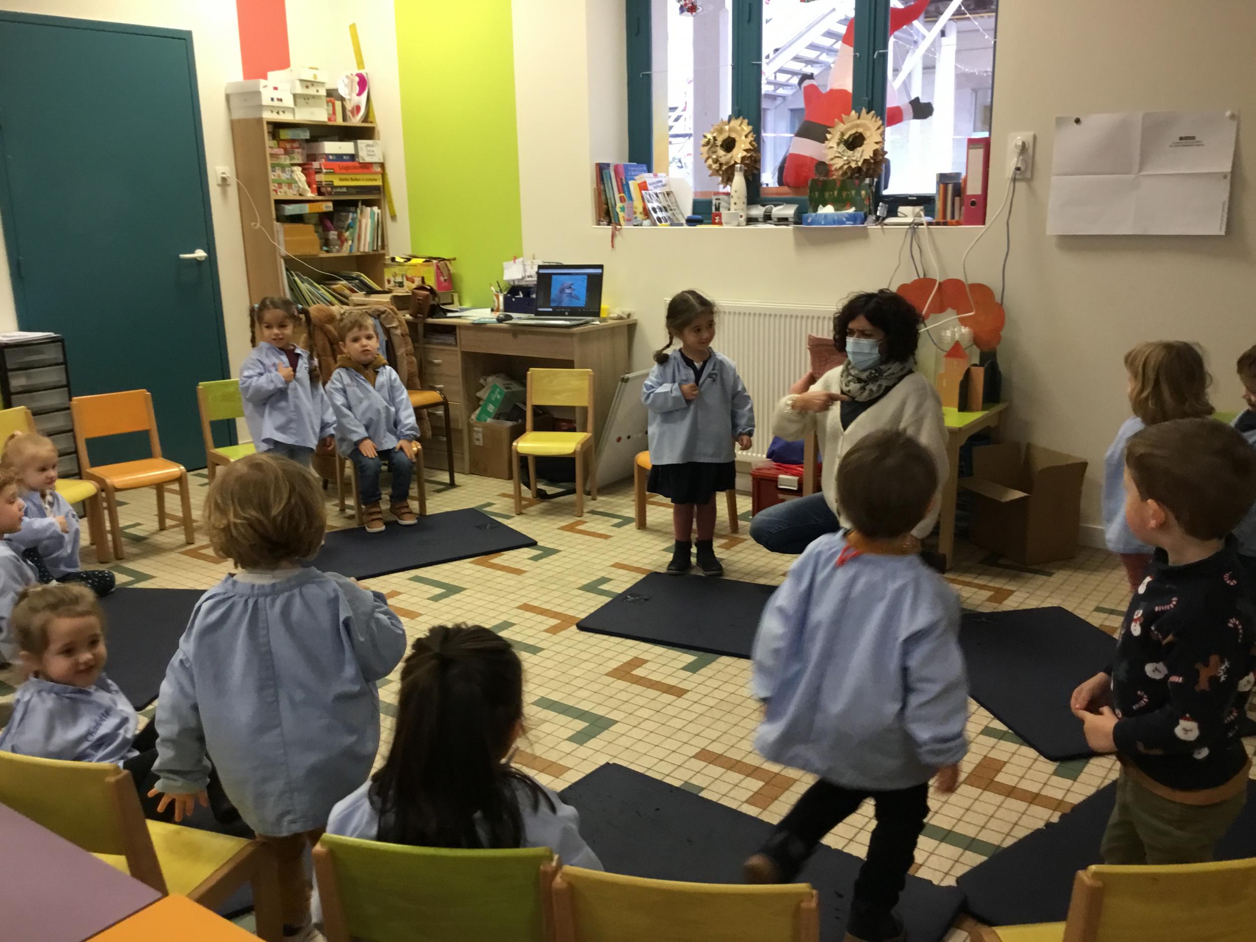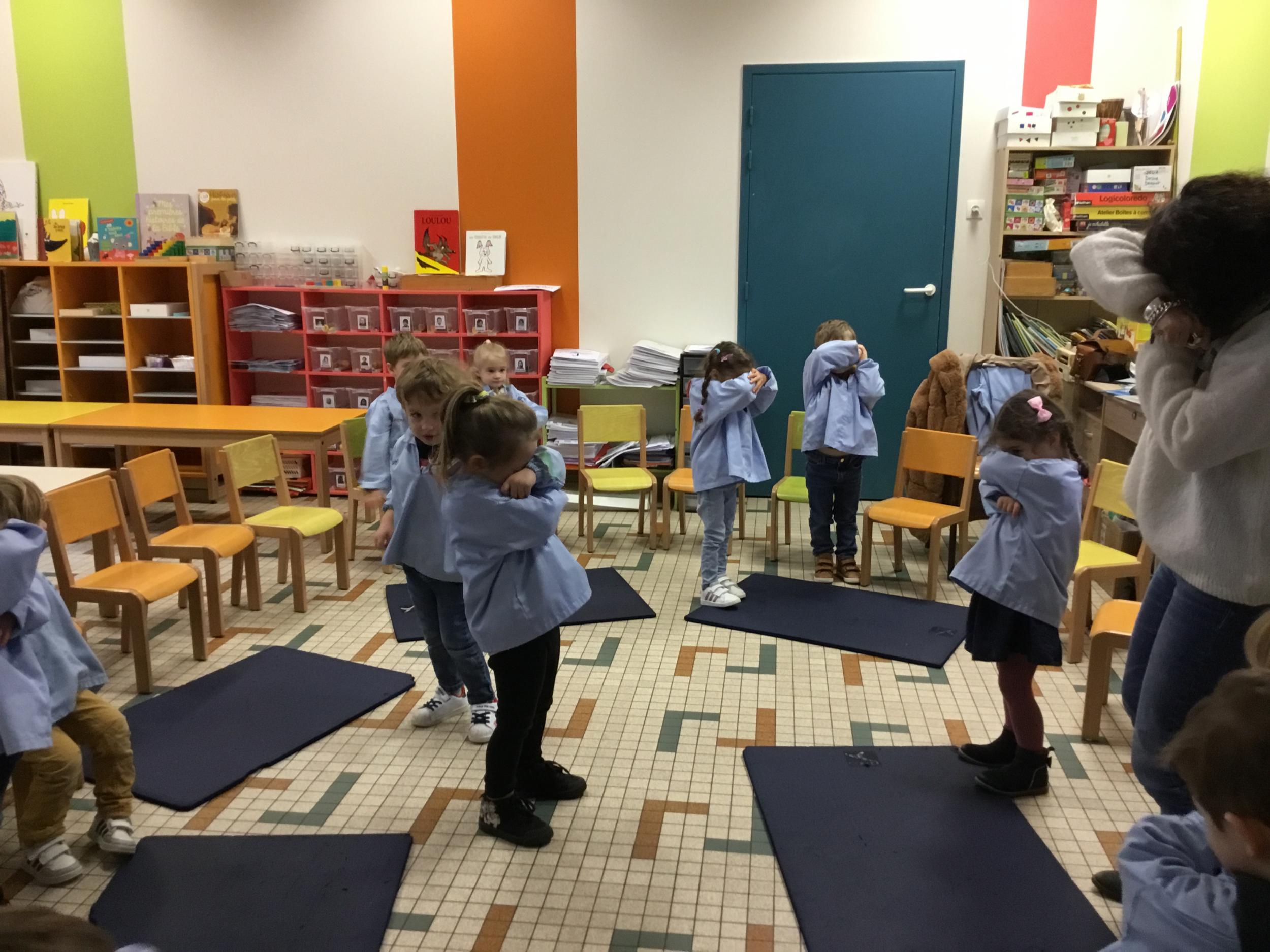 Les élèves imitent chacun de ces animaux . Puis la maîtresse joue un animal et les élèves doivent deviner de quelle attitude il s’agit .
