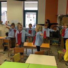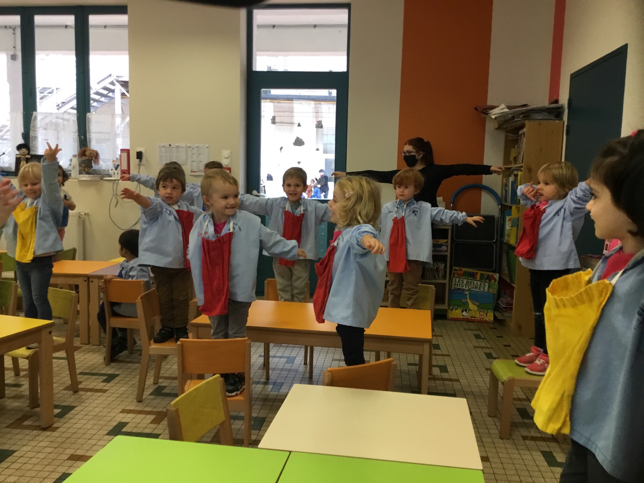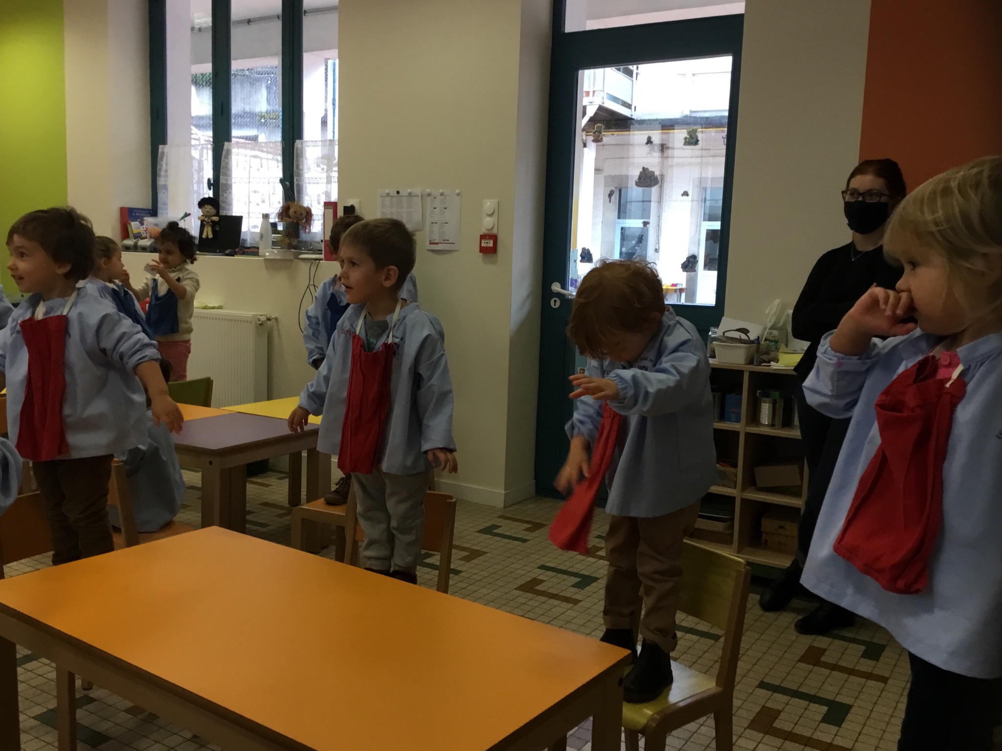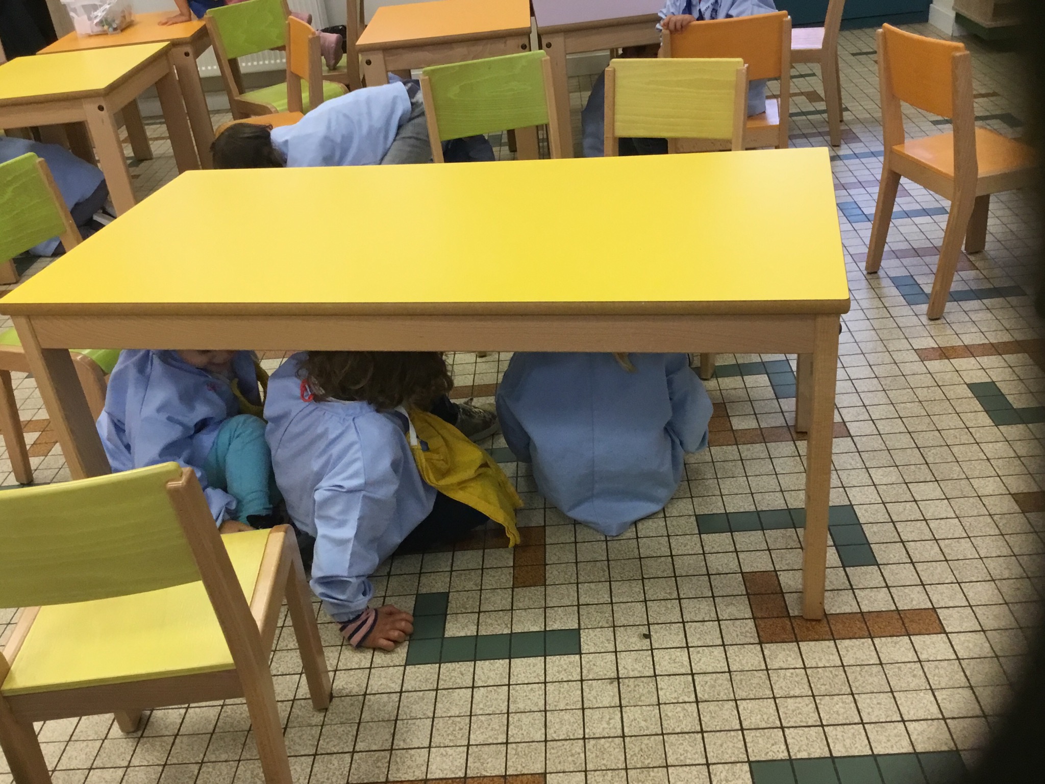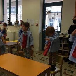 Petite et moyenne section 25/09/2020 Les enfants ont aimé se cacher sous les tables, monter sur la chaise, mettre les mains sur ou au dessus de la tête.... se placer devant ou derrière la chaise.....