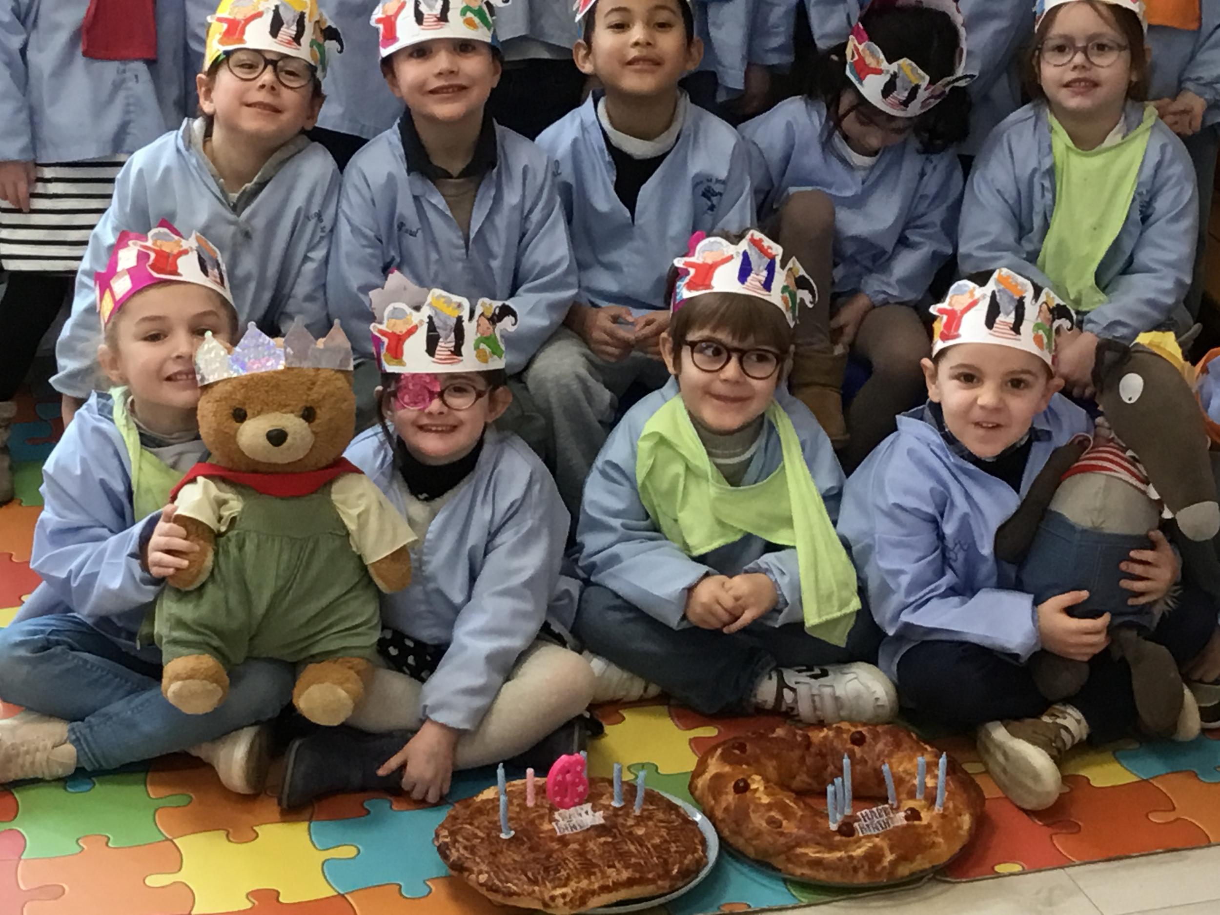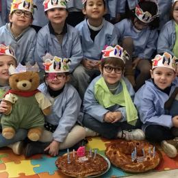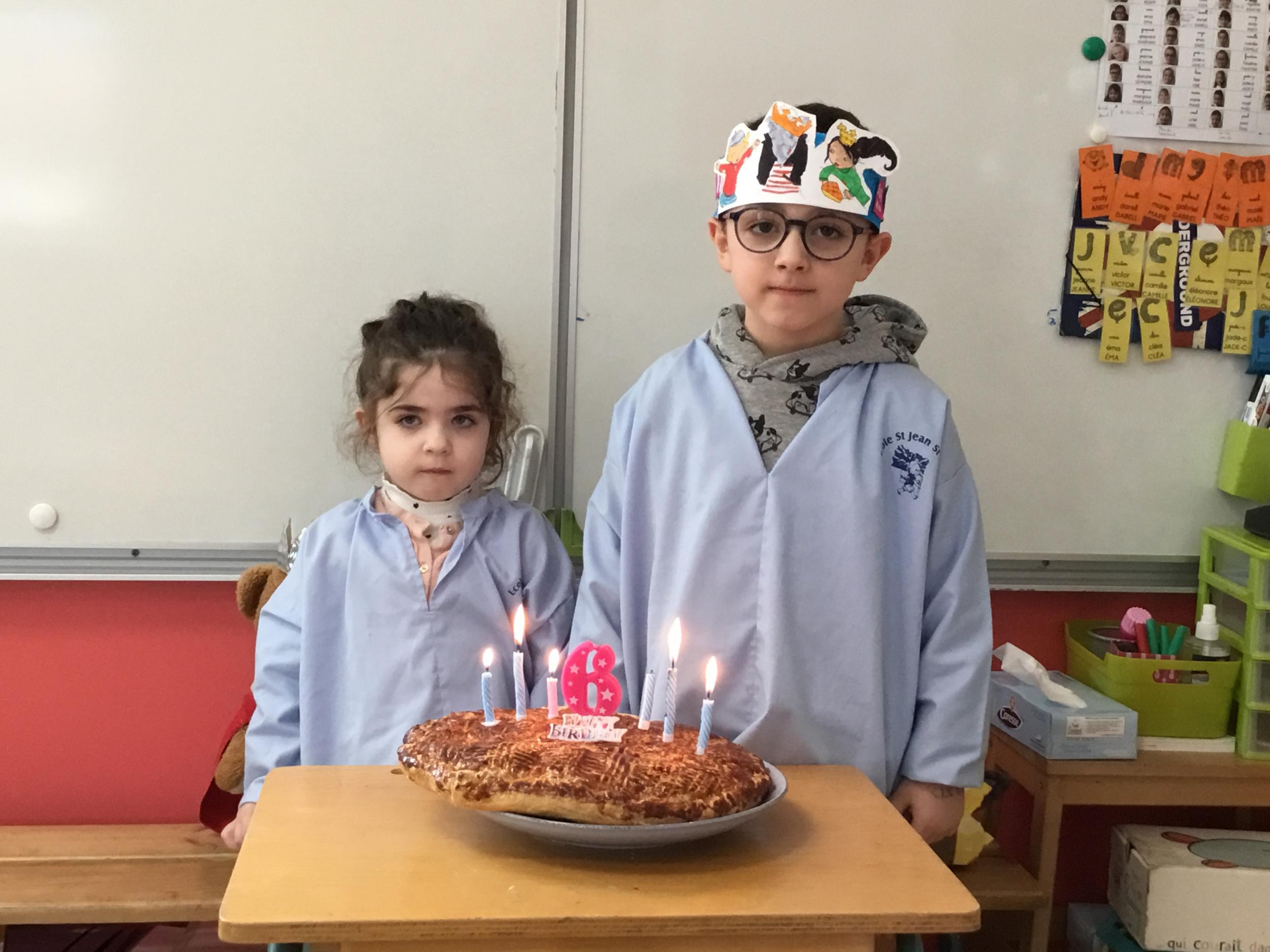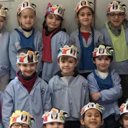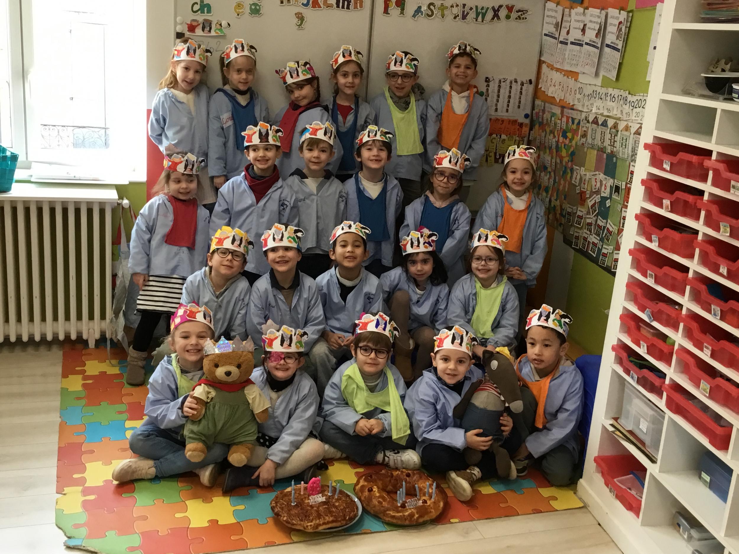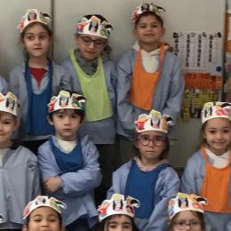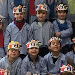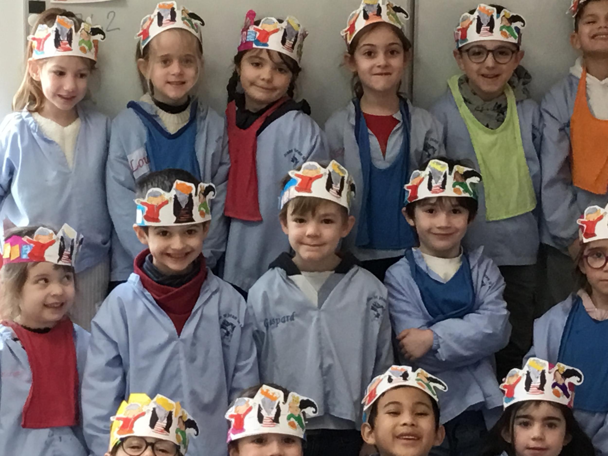 Nous avons travaillé sur un album de galette "la galette du roi loup". Les élèves ont inventé et dessiné plusieurs fins de cette histoire. Ils ont aussi réalisé une couronne en utilisant diverses techniques : choisir un gabarit de couronne, tracer les contours et la découper précisément. La peindre à l'encre et au gros sel : en l'enlevant après séchage, le sel a laissé divers motifs.