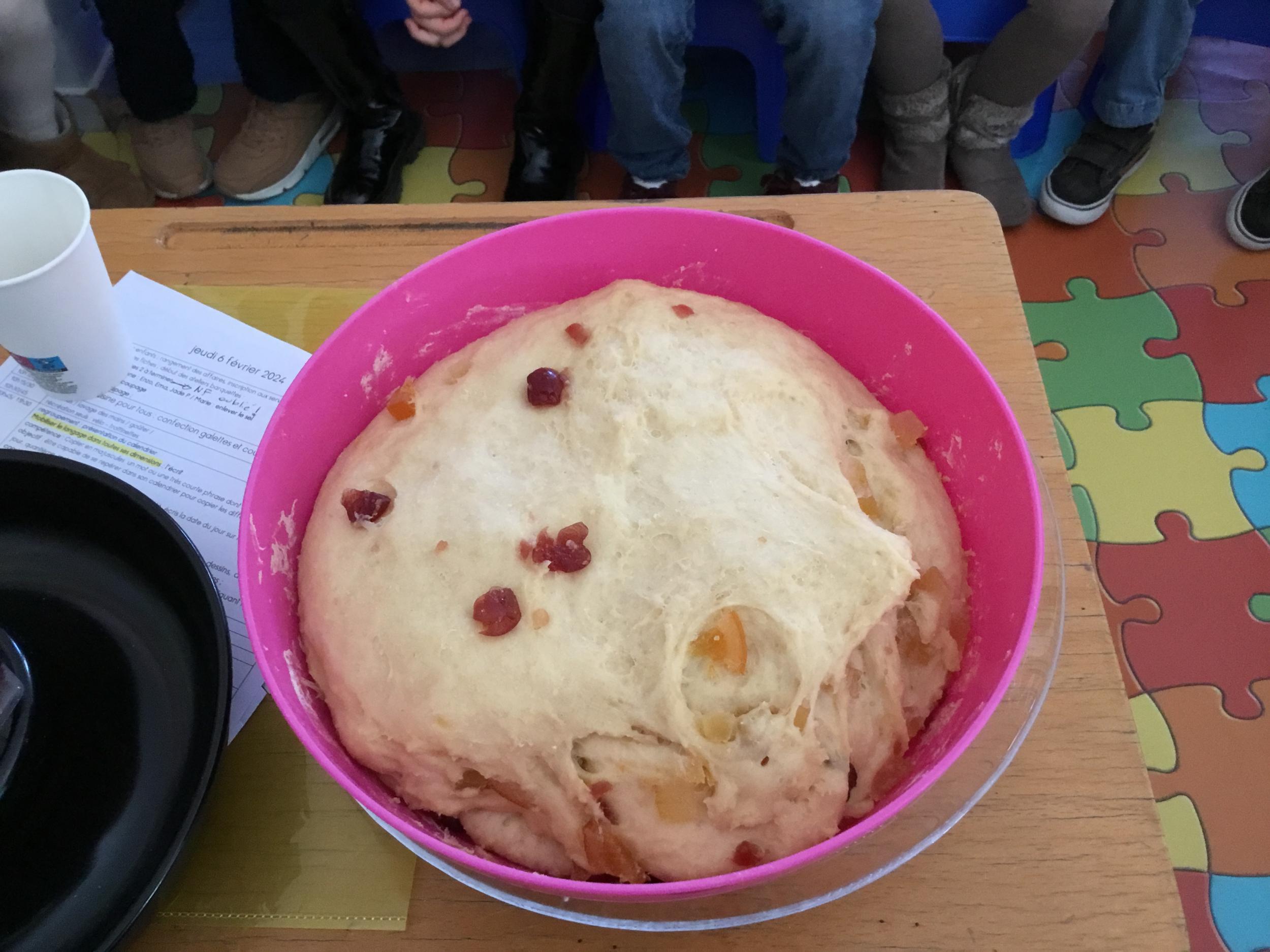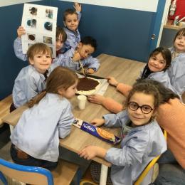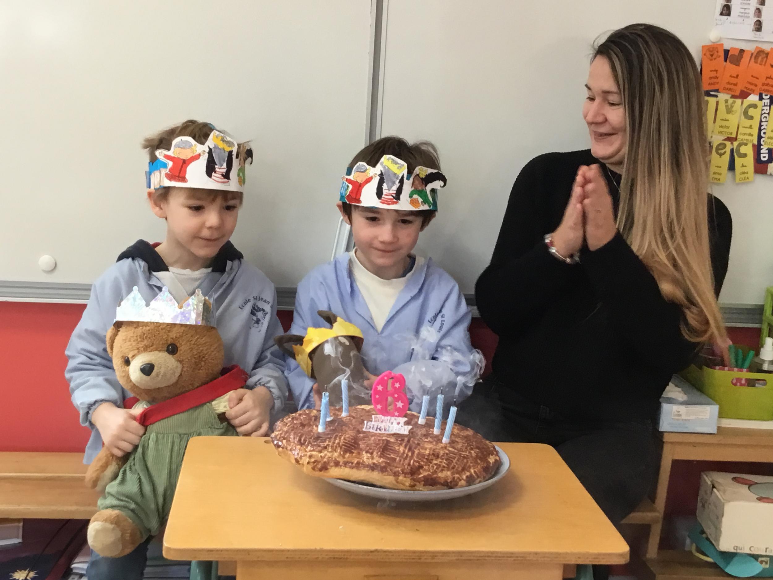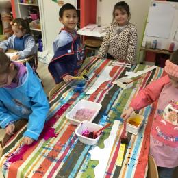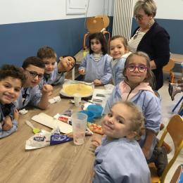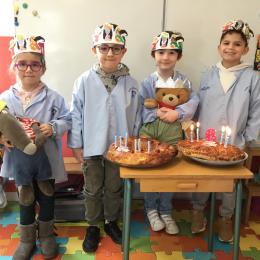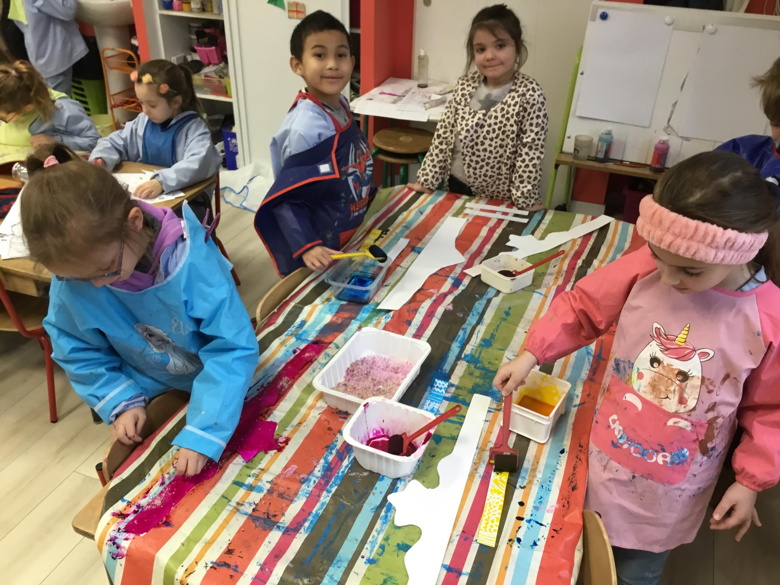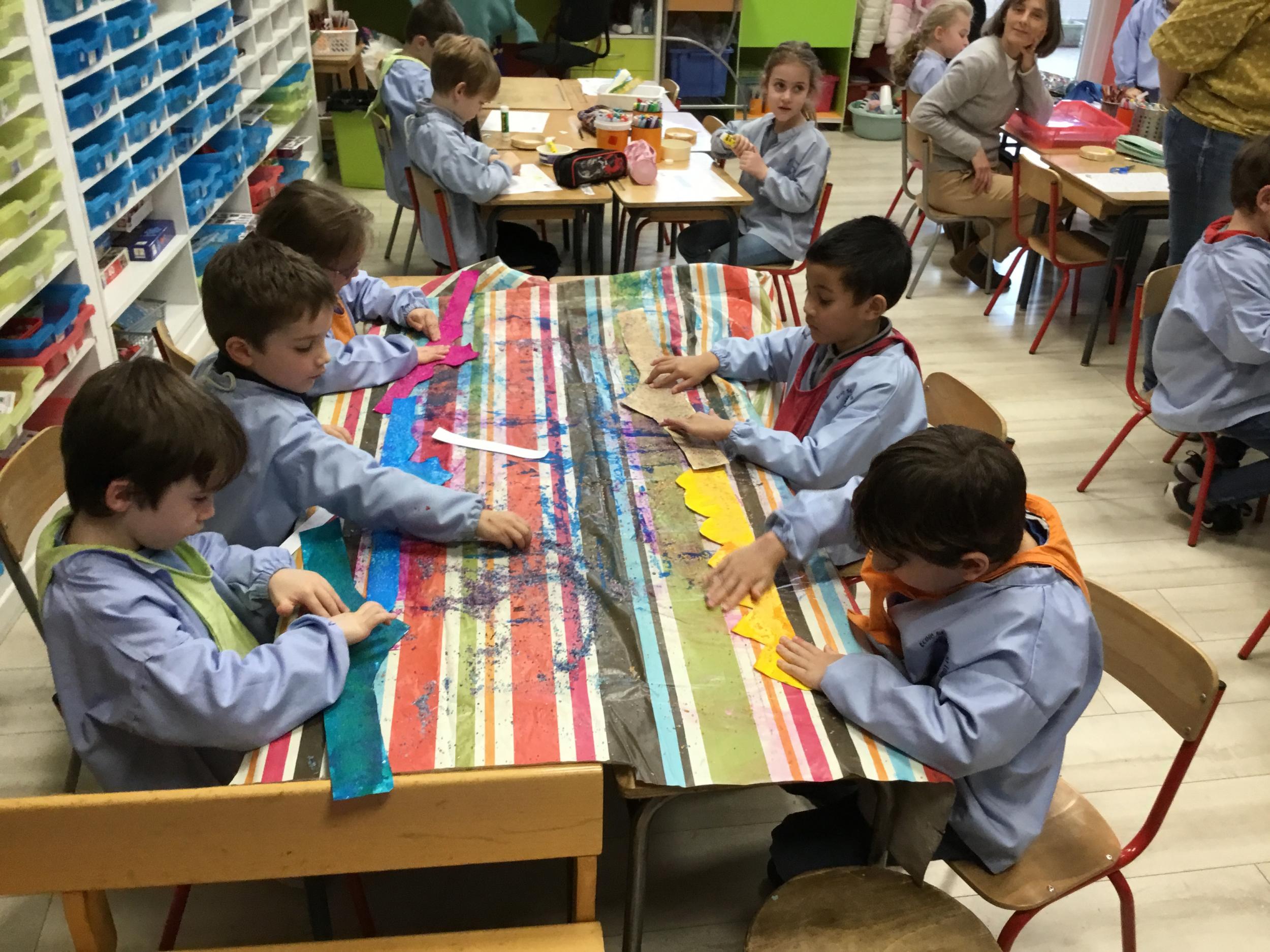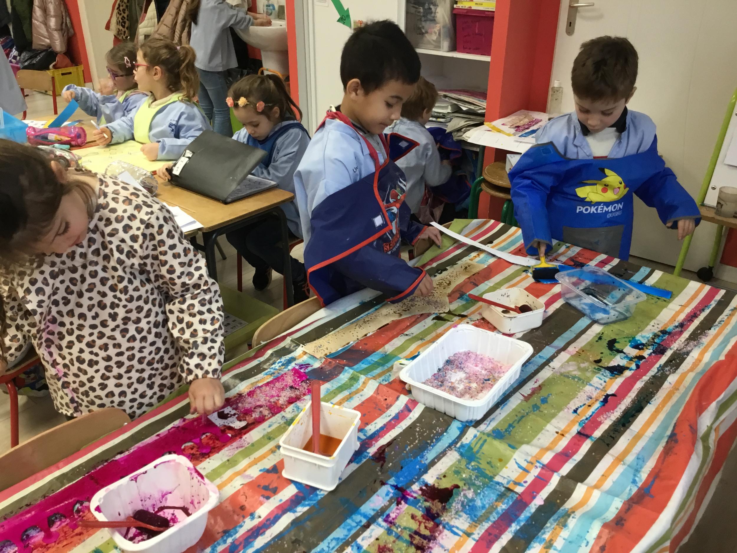 Nous avons travaillé sur un album de galette "la galette du roi loup". Les élèves ont inventé et dessiné plusieurs fins de cette histoire. Ils ont aussi réalisé une couronne en utilisant diverses techniques : choisir un gabarit de couronne, tracer les contours et la découper précisément. La peindre à l'encre et au gros sel : en l'enlevant après séchage, le sel a laissé divers motifs.